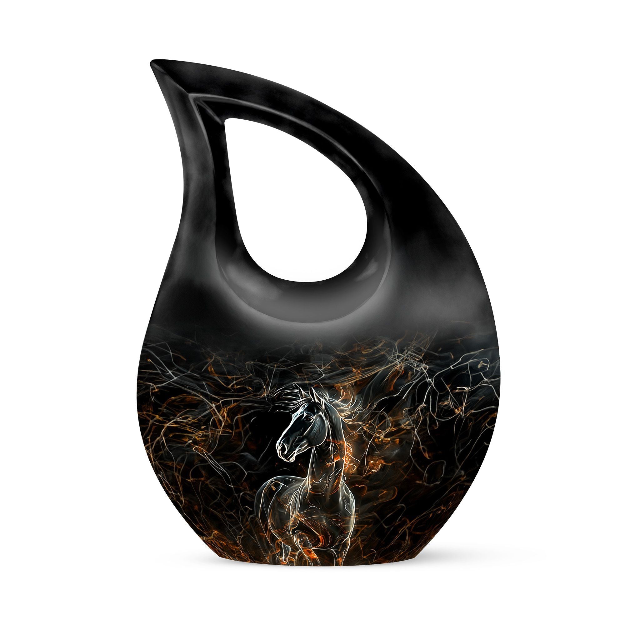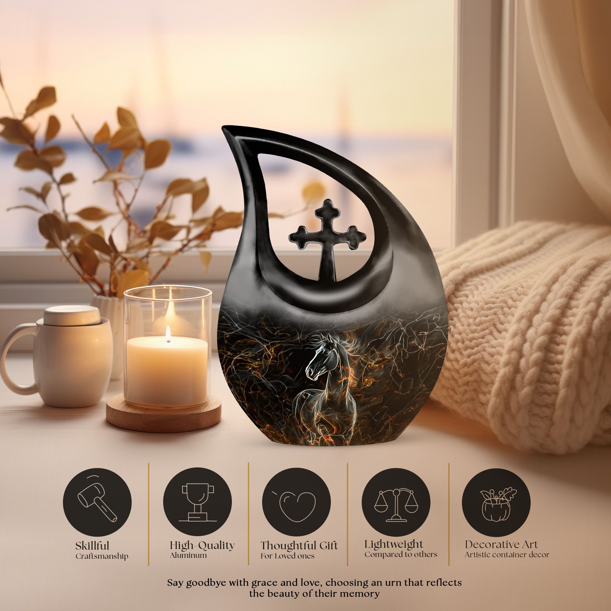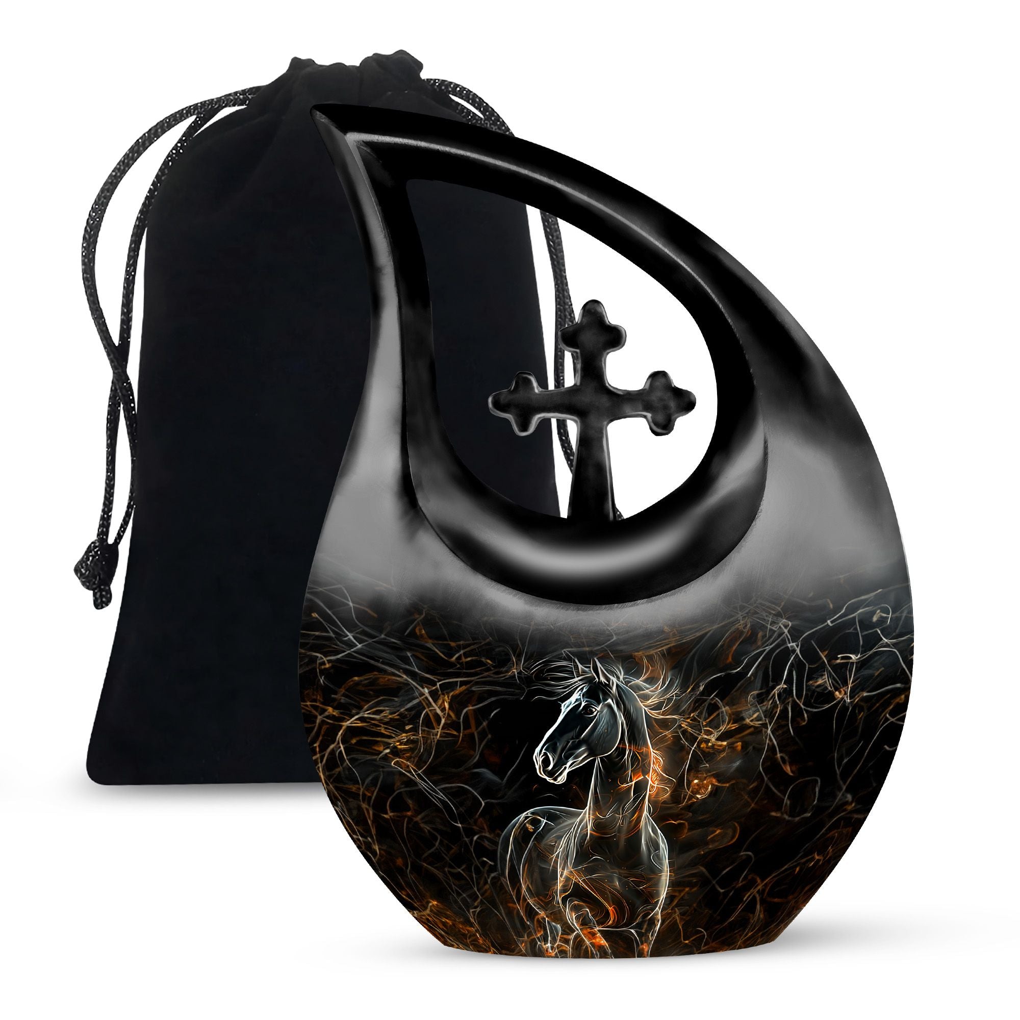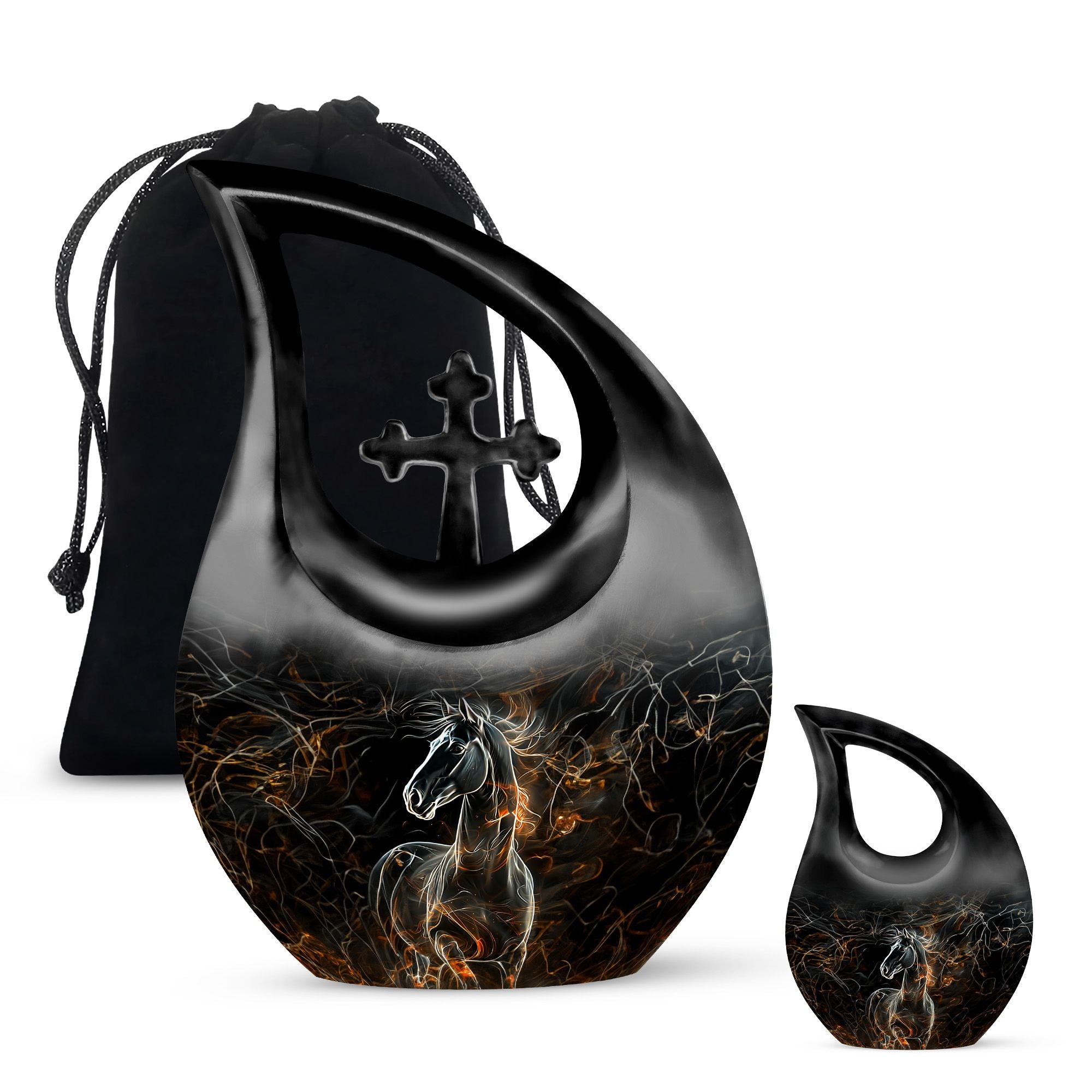 Honor your loved one's memory with this beautifully crafted, 10 Inch Horse Urn. Skillfully designed in a Cross Drop theme, the urn delivers a unique and lasting tribute. Crafted from high-quality aluminium, the urn weights 3.3 pounds and stands at an impressive height of 10 inches, it has the capacity to hold up to 200 cubic inches of ashes, suitable for an array of large urns requirements. The product comes with a velvet pouch for the containment of ashes, preserving the dignity of your departed in a fitting and respectful manner. Offering a meaningful continuation of the bond you shared, our urns can be personalized with engraved names, creating a truly custom monument for your loved one. Often found among customized urns for ashes for adults, unique urns for dad, and cremation monuments, this Horse Urn stands apart with its sophistication and elegance. Invest in a substantive, respectful token of remembrance for your dearly departed.