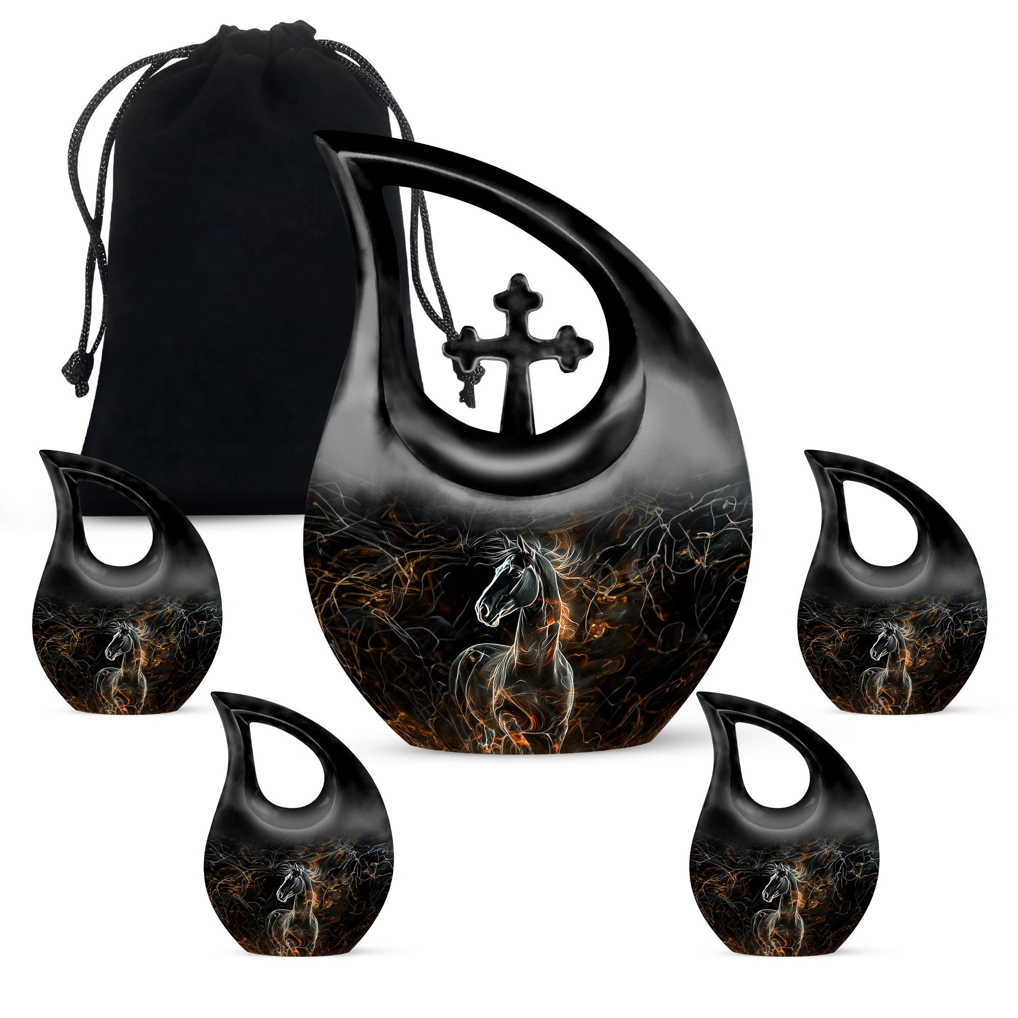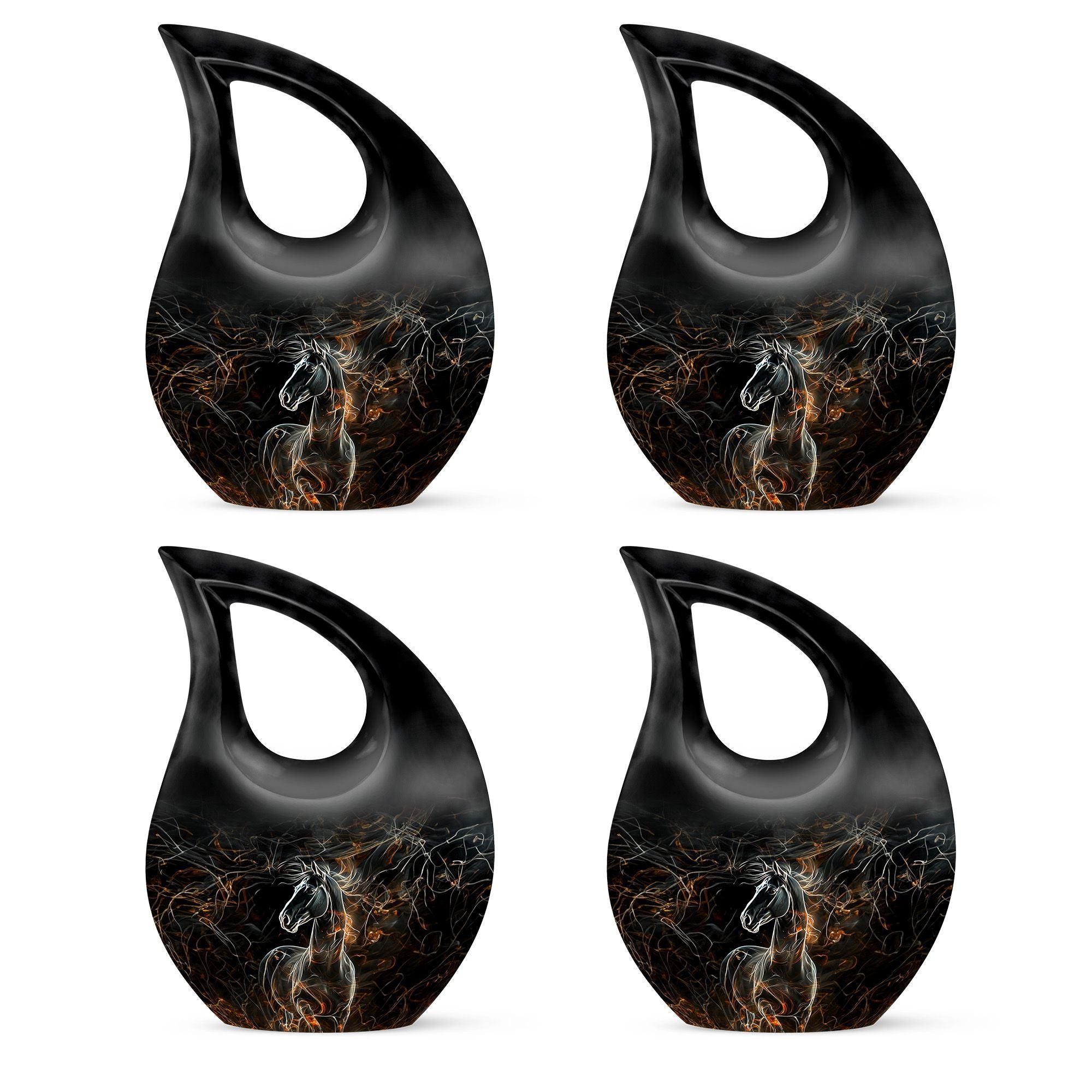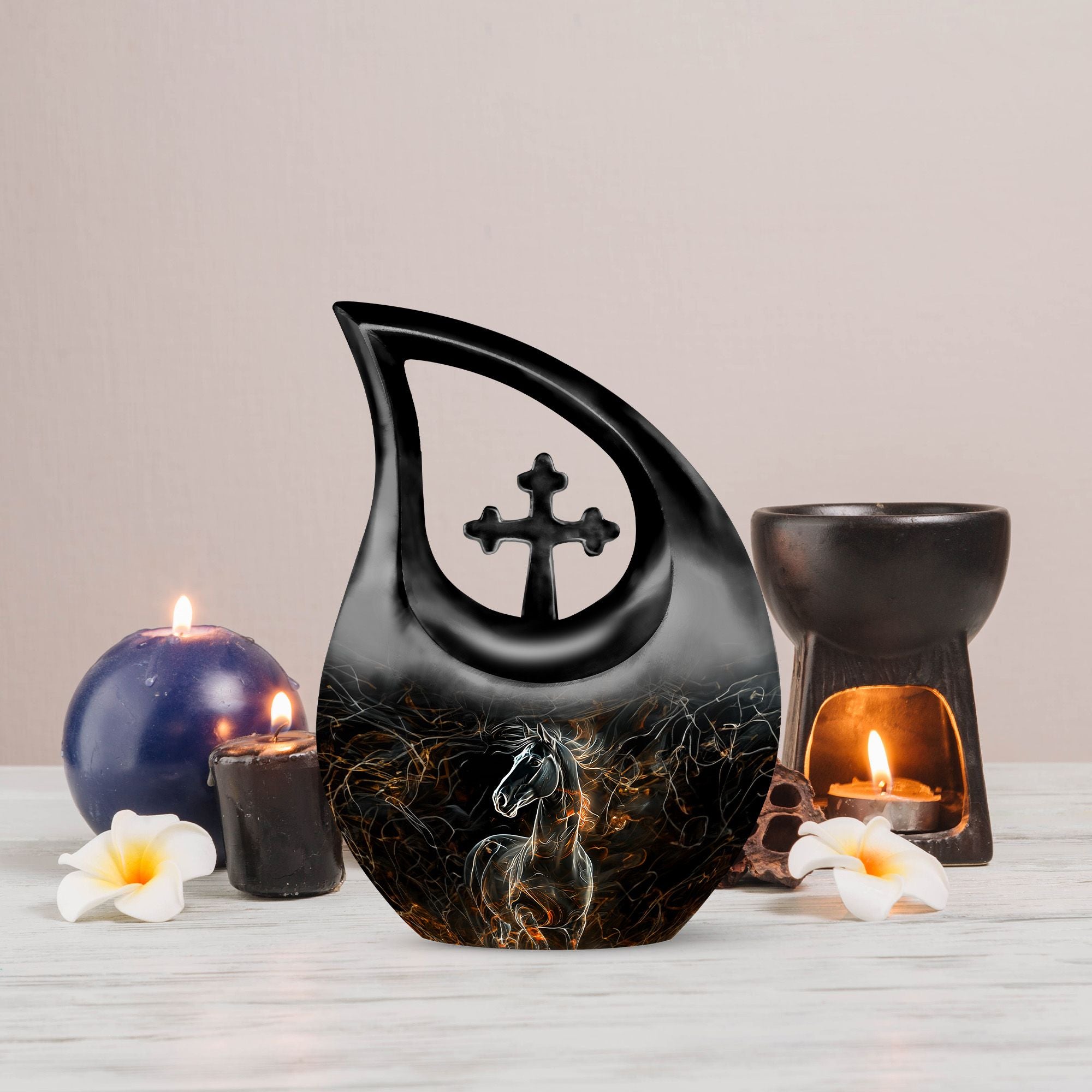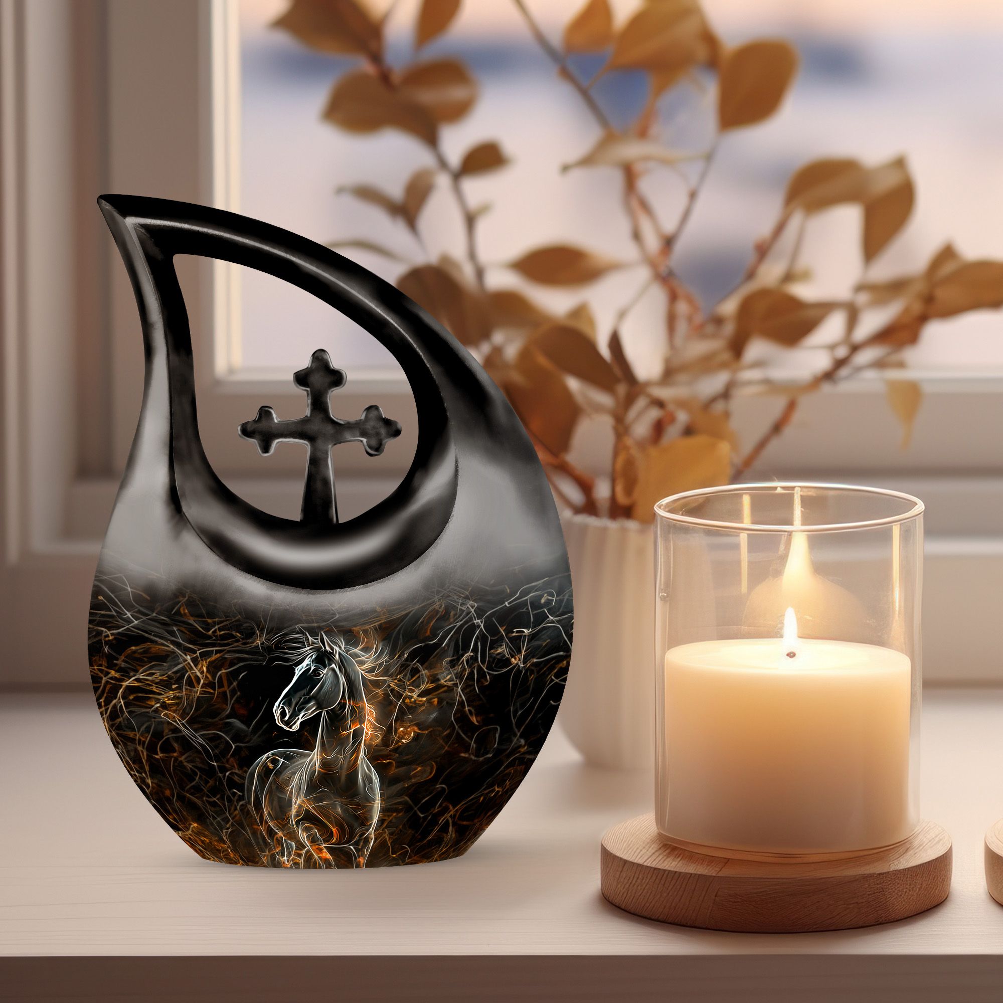 Honor your loved one's memory with this beautifully crafted, 10 Inch Horse Urn. Skillfully designed in a Cross Drop theme, the urn delivers a unique and lasting tribute. Crafted from high-quality aluminium, the urn weights 3.3 pounds and stands at an impressive height of 10 inches, it has the capacity to hold up to 200 cubic inches of ashes, suitable for an array of large urns requirements. The product comes with a velvet pouch for the containment of ashes, preserving the dignity of your departed in a fitting and respectful manner. Offering a meaningful continuation of the bond you shared, our urns can be personalized with engraved names, creating a truly custom monument for your loved one. Often found among customized urns for ashes for adults, unique urns for dad, and cremation monuments, this Horse Urn stands apart with its sophistication and elegance. Invest in a substantive, respectful token of remembrance for your dearly departed.