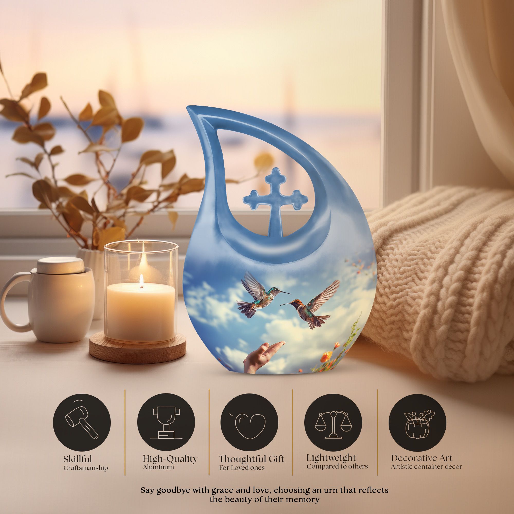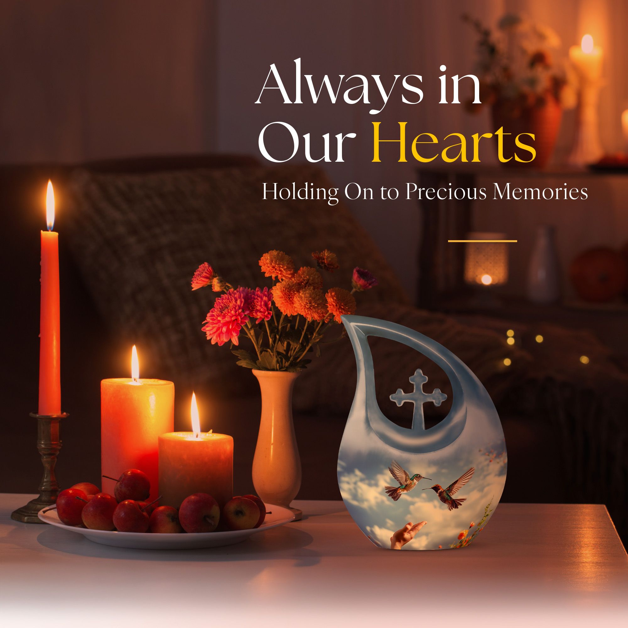 This memorial urn serves as a meaningful tribute, offering beauty, strength, and emotional comfort. With its hummingbird pair design and spacious capacity, it provides a lasting way to honor the memory of a cherished loved one.