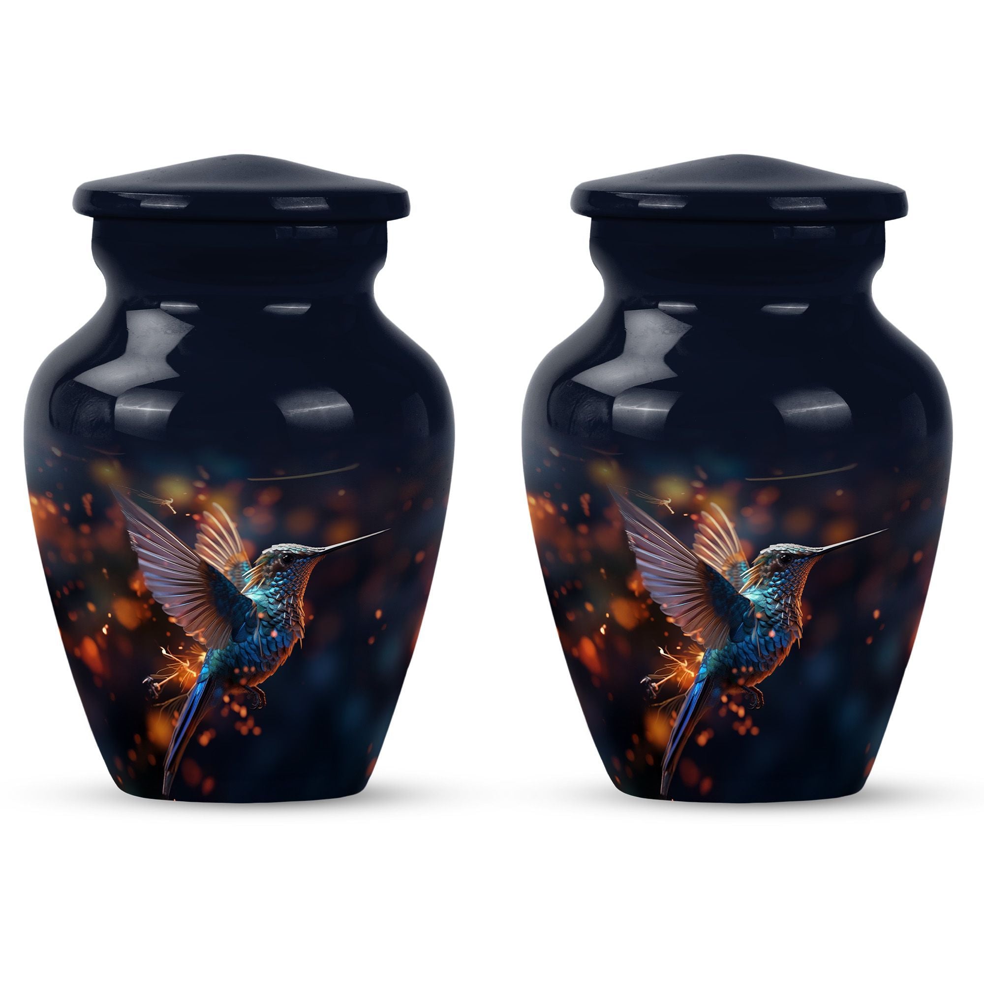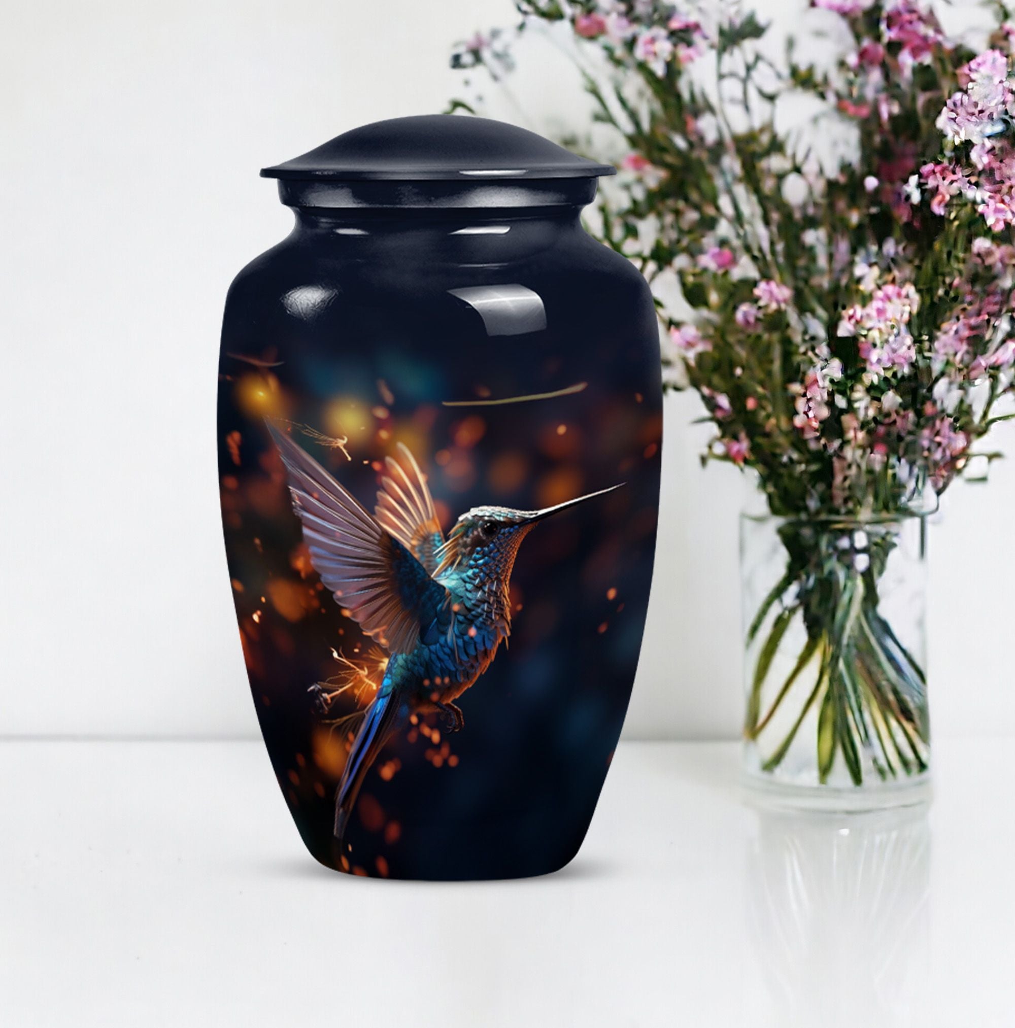 Introducing our stunning 10 inch 'Humming Birds Urn,' a profound and tasteful way to preserve the cherished memories of a loved one. Though constructed from robust aluminium, this abstract-themed large urn weighs a mere 3.3 pounds and is designed to be unobtrusive while signifying profound reverence. The capacity of this cremation large urn is around 200 cubic inches - ample space to securely house the ashes. The urn is delivered complete with a velvet pouch, offering an elegant and secure containment solution to honor and remember your beloved. A unique feature of this burial ashes urn is that it can be personalized with the name, providing an intimate touch to this already significantly symbolic item. This item is not just an urn for human ashes but a tribute and memorial vase representing endless affection and honour. Choose the Humming Birds Urn for the ideal blend of elegance, durability, and remembrance.