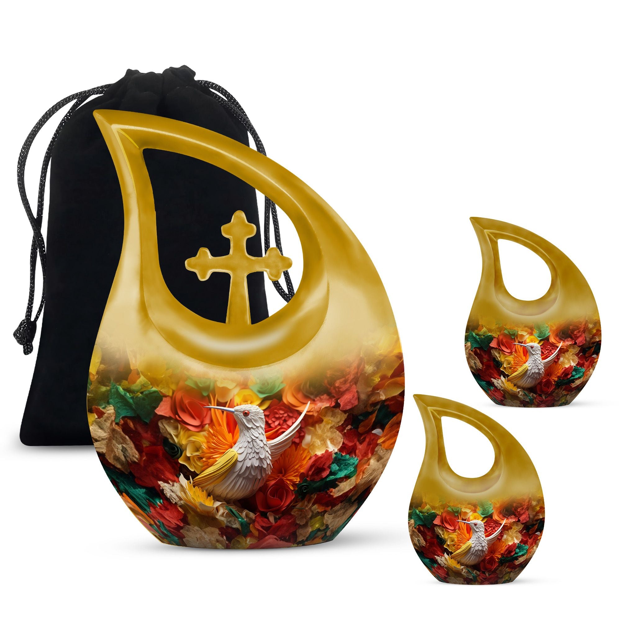 Crafted from durable aluminium, this 10-inch urn features vibrant floral detailing with a radiant hummingbird, symbolizing joy, renewal, and eternal remembrance. Its polished decorative finish makes it ideal for those looking for elegant cremation urns women, a versatile urn for adult male & female, or a memorial piece suitable for funeral, burial, or home display. The secure screw-top lid ensures long-term protection of ashes, while matching keepsake options—such as tiny urns for women & men, keepsake urns for men ashes, or small urns women—allow families to share precious memories in a personal and meaningful way. It also serves beautifully as an urn ashes for women, burial urn men, or an artistic women adult urn with lasting symbolism.