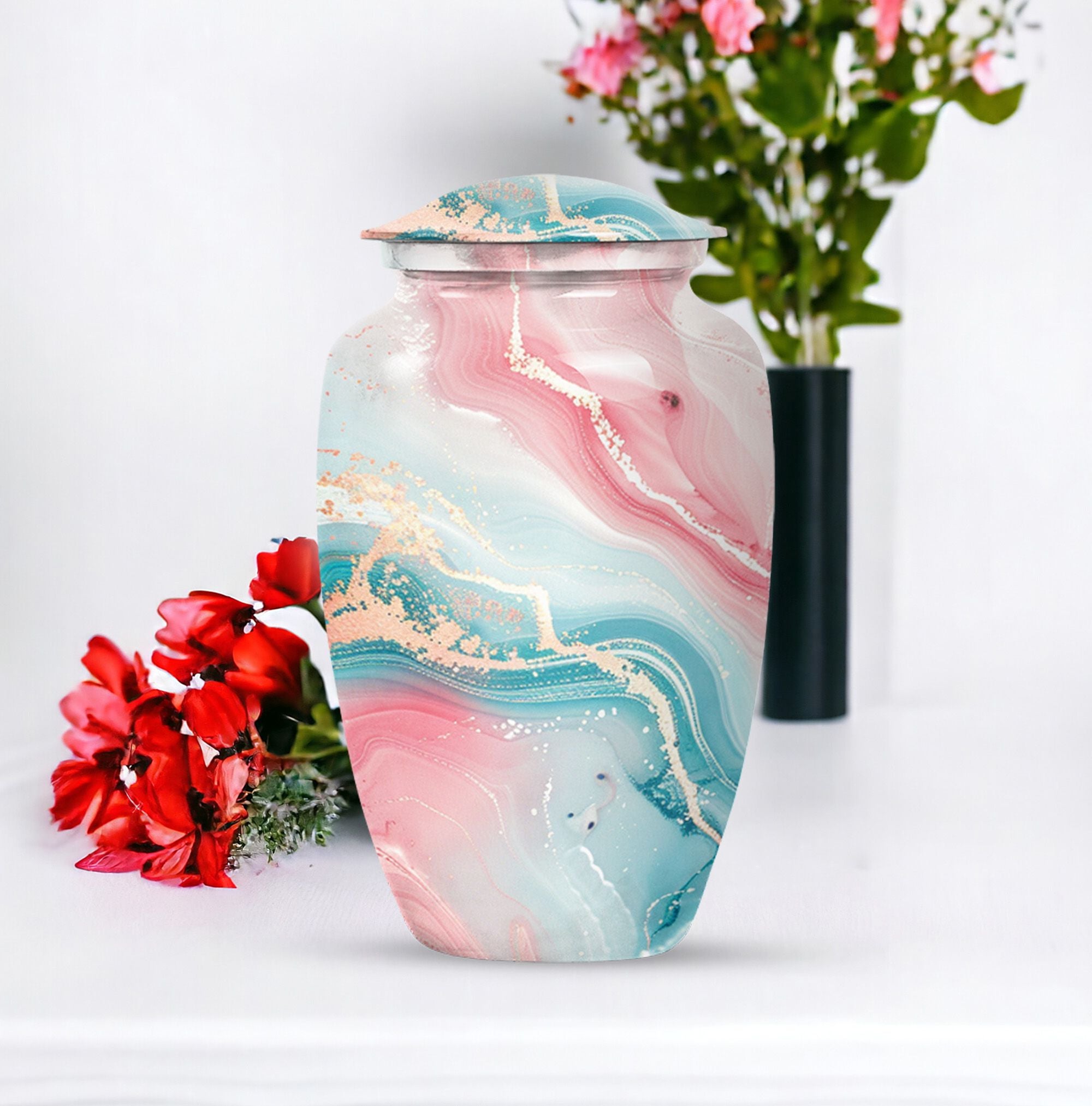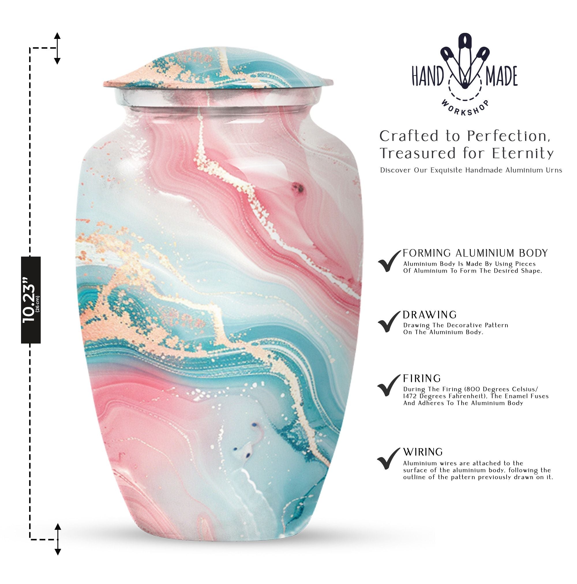 Experience a meaningful and heartfelt connection with our Abstract Urn, which plays a vital role in memorial ceremonies due to its expressive theme and meticulous construction. As a large urn, it comes in 10 inches in height with a weight of 3.3 pounds and a capacity of 200 cubic inches, adequate for an adult man's ashes. It's made from high-quality and sturdy aluminium material enhancing its durability for longer safekeeping of your loved one's ashes. Our cremation urn offers personalization; you can engrave names on it adding a personal touch. The urn comes with a luxurious velvet pouch for containment and respectful preservation of ashes. The captivating abstraction of this urn allows for nuanced reflection on life's transience. Incorporating terms such as 'urns for cremation ashes', 'funeral urns for human ashes adult man', and 'metal urns for adult human ashes', our urn stands as an emblem of innovative and modern urns for human ashes. Please note that this product does not include design customization.