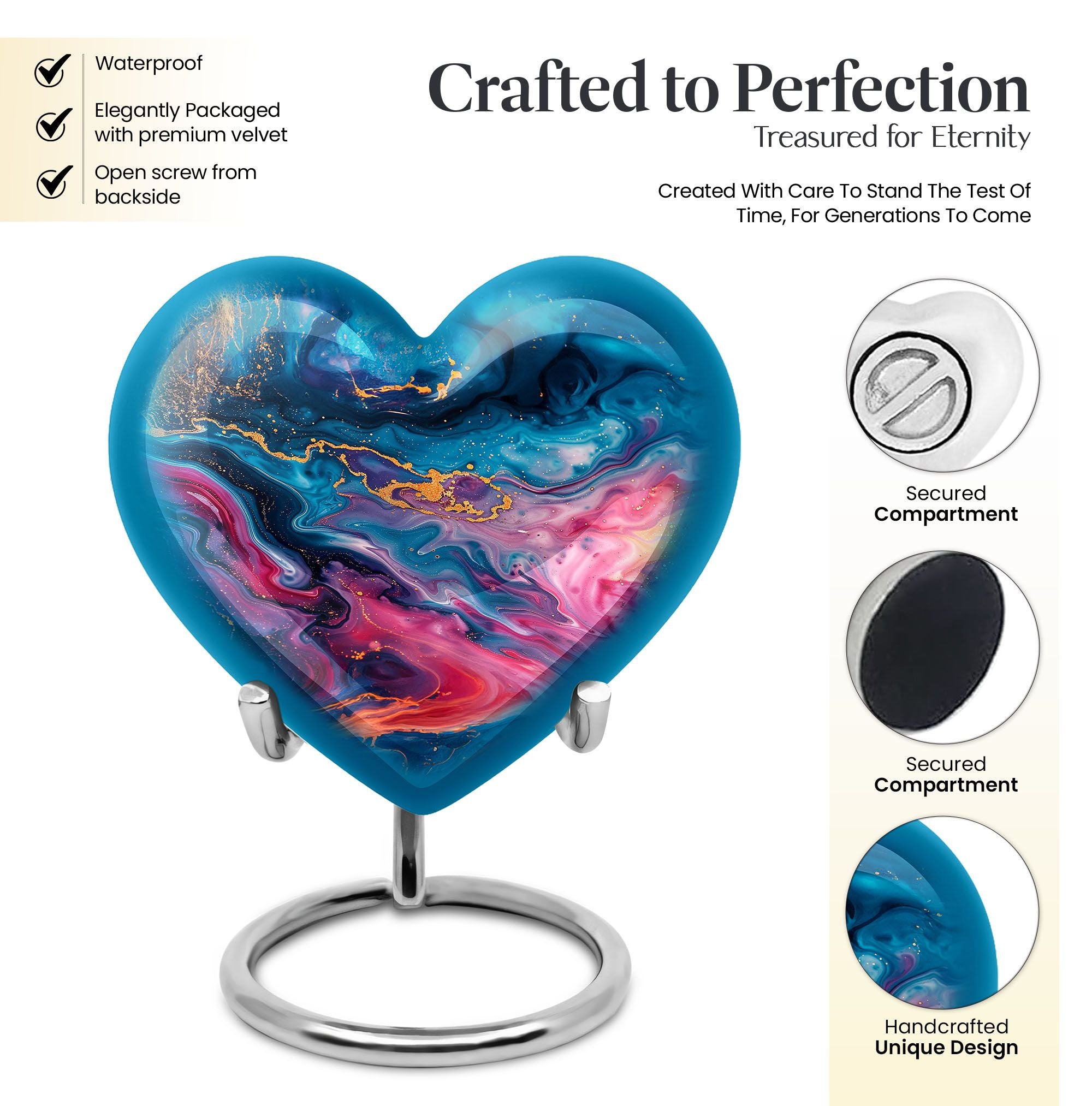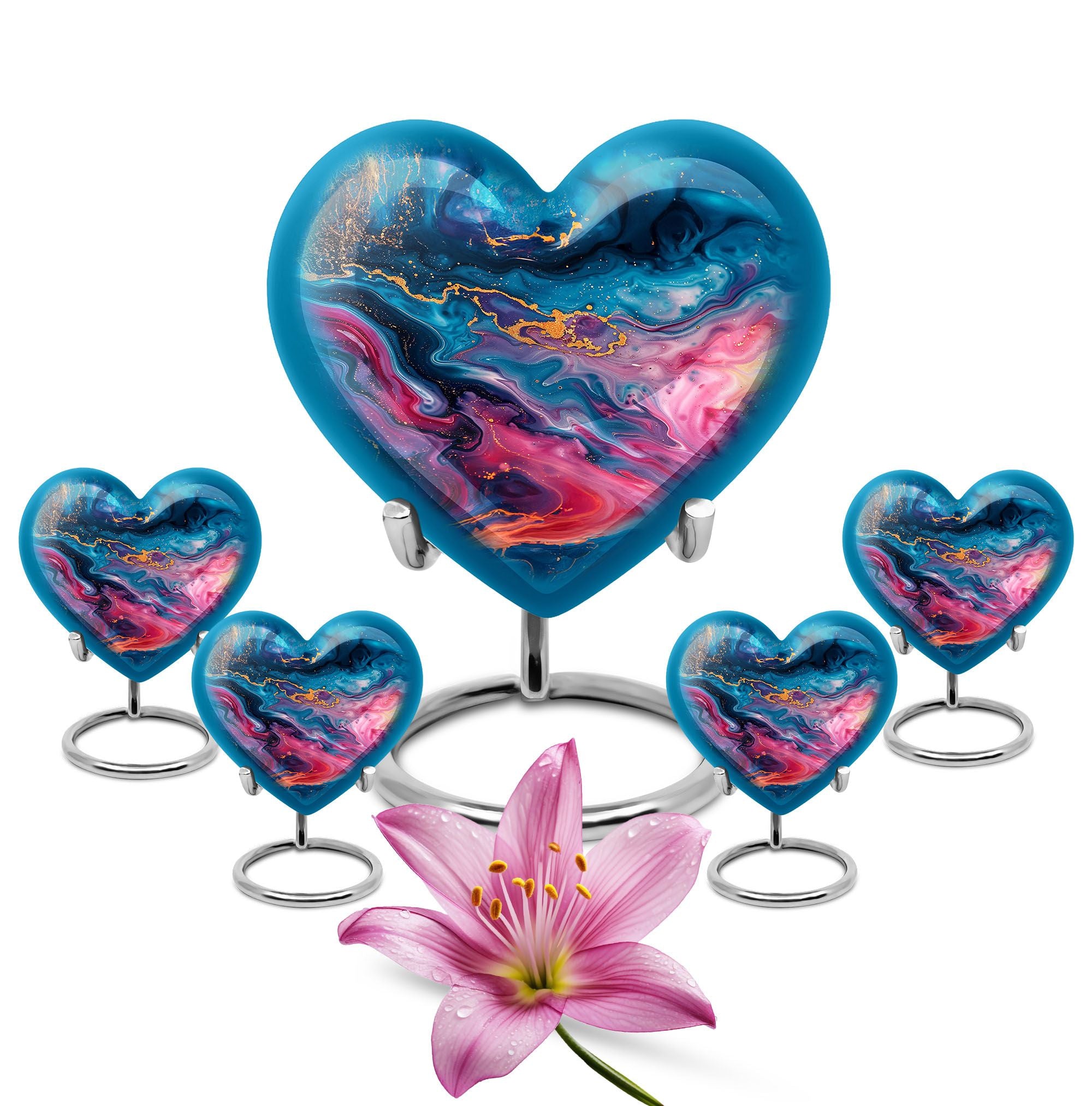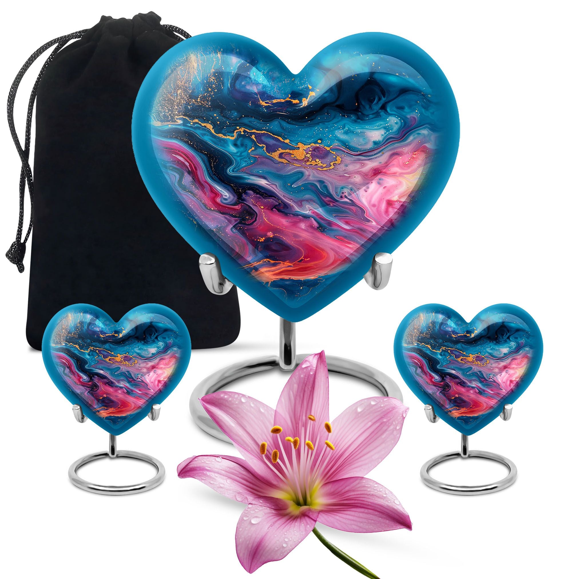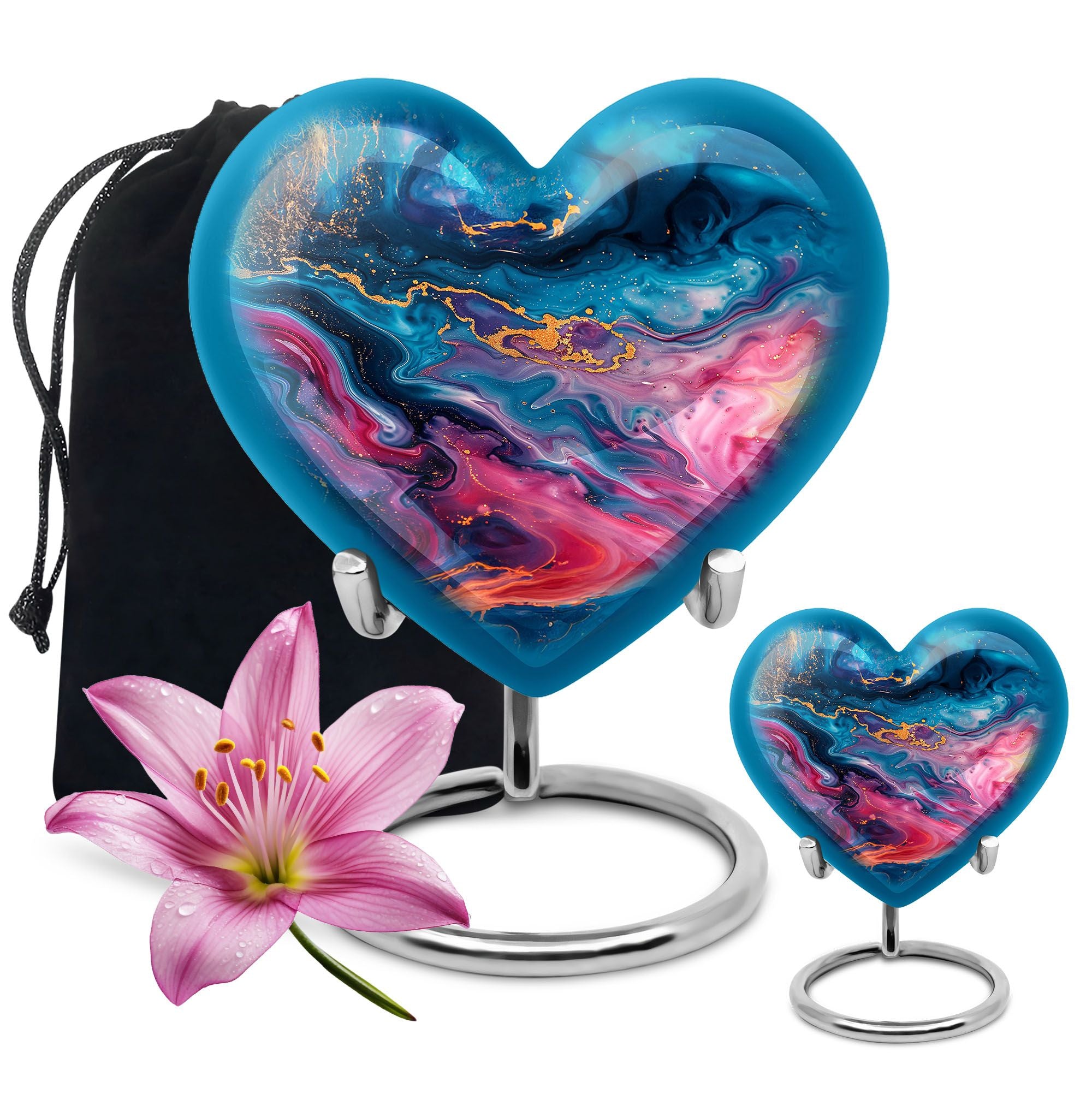 Immerse yourself in the profound beauty of remembrance with this 10-inch Abstract Urn. Crafted from sturdy aluminium, this burial urn weighs 3.3 pounds and accentuates an elegant heart urn theme. Symbolic of love and cherished memories, this large urn effortlessly adds depth to your memorial ceremony. Radiating a striking abstract design, this cremation urn has a capacity of 200 cubic inches, perfect for honoring a beloved female adult, or a dual urn for an adult male and female. Exemplifying intricate craftsmanship, it comes with an exquisite velvet pouch for secure containment of ashes. Personalize this metal urn with engraved names, capturing the essence of the one you hold dear. As a fitting tribute, this urn can be used for a dignified burial in the ground. Embrace the memory of your loved ones in a unique, abstract design with this posh yet sturdy urn.