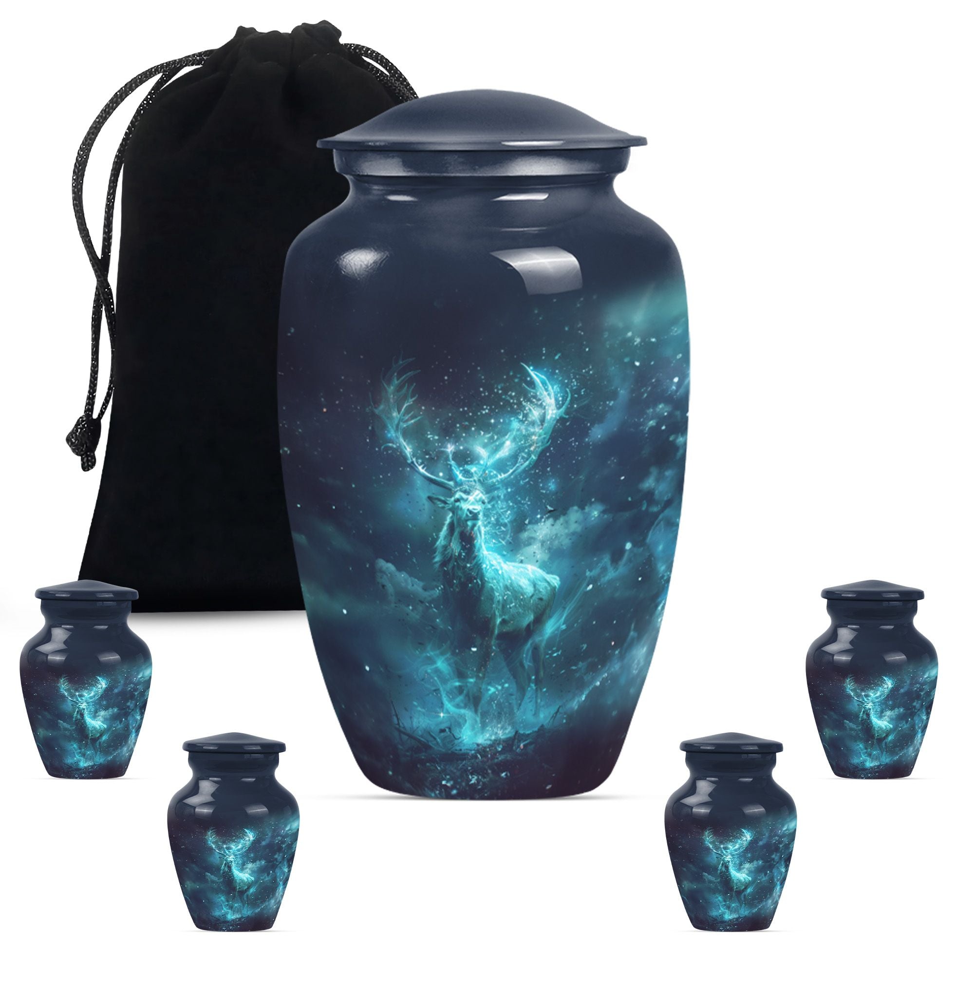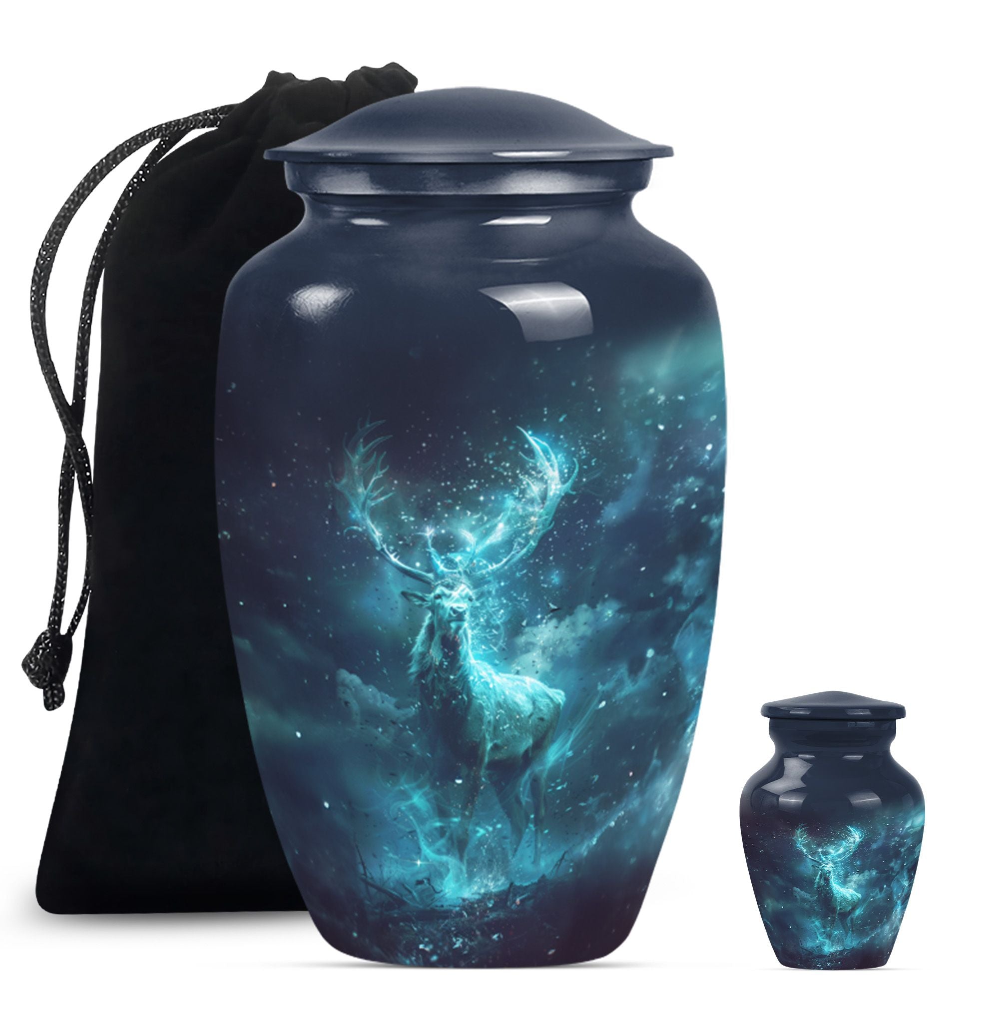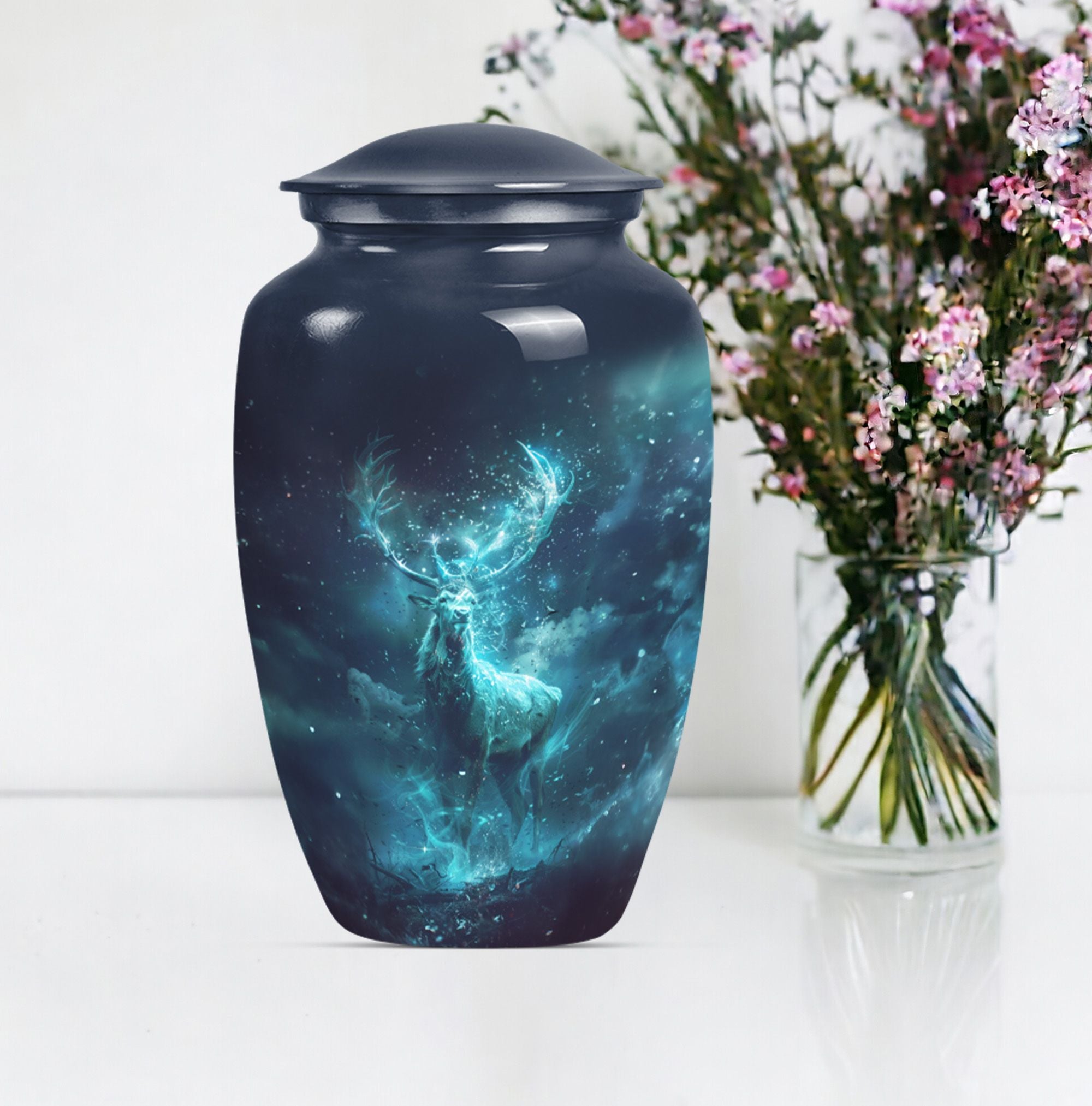 Discover a beautiful and reverent way to remember your loved ones with this Wolf Howling themed large urn for ashes. With a 10-inch stature, the urn creates a captivating silhouette, echoing the solemn beauty of a classic urn. Sturdily constructed from aluminium, it weighs just 3.3 pounds yet maintains robust resilience. Additionally, the urn has a capacity of 200 cubic inches, providing ample space for ashes. The inherent solemnity of the cremation process is heightened by the vessel’s discerning materials and craftsmanship. A velvet pouch is included in the package for the dignified containment of ashes. Personalize the urn with engraved names to make it uniquely yours, adding a touch of distinction and emotional resonance. Predominantly large urn-themed, this product respectfully aligns with the cremation medium urns, human ash urn, funeral gift, and metal urn categories. Though overwhelmingly solemn in its application, the urn exudes a serene, dignified aesthetic appreciated by adults and seniors alike.
