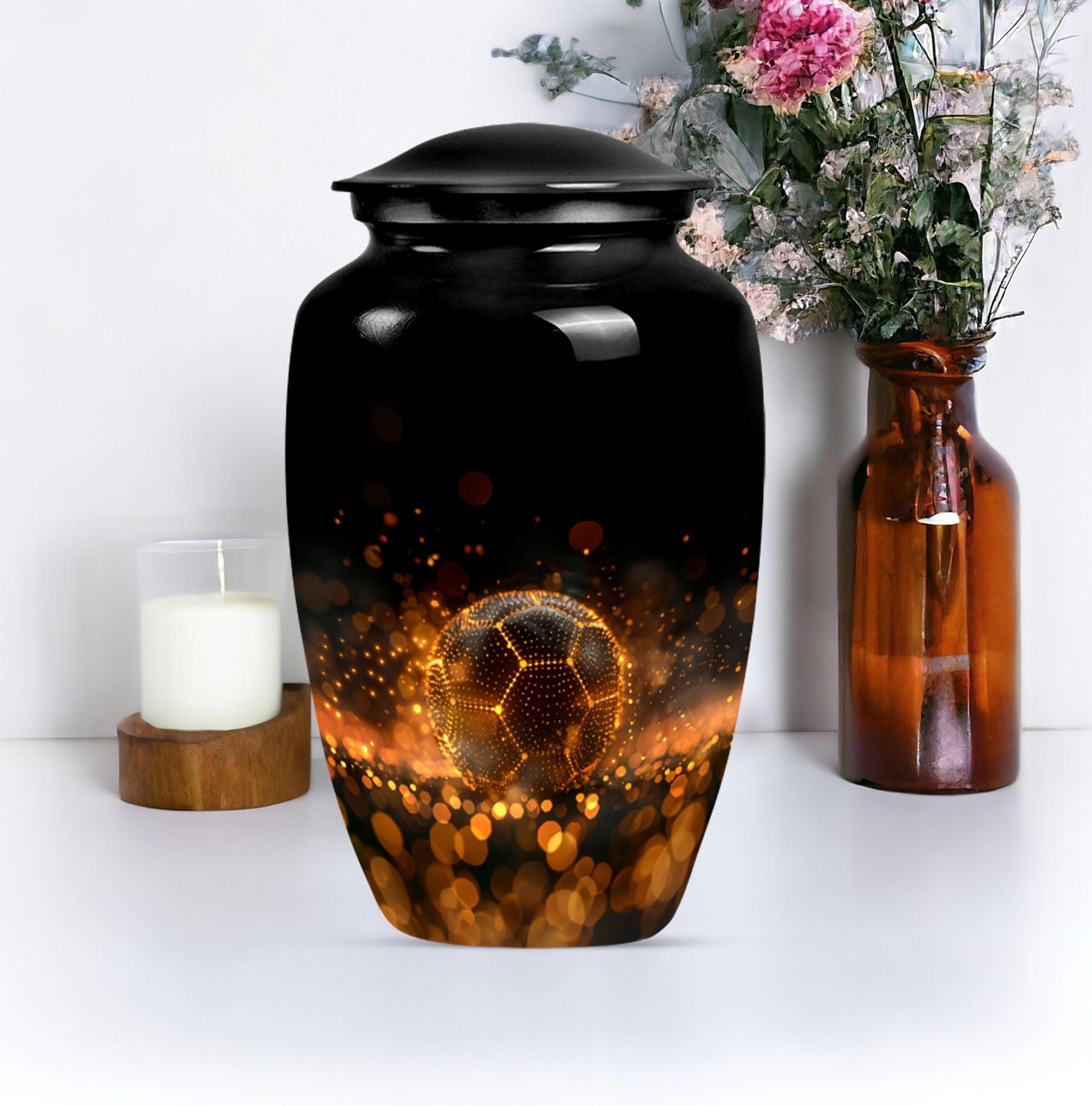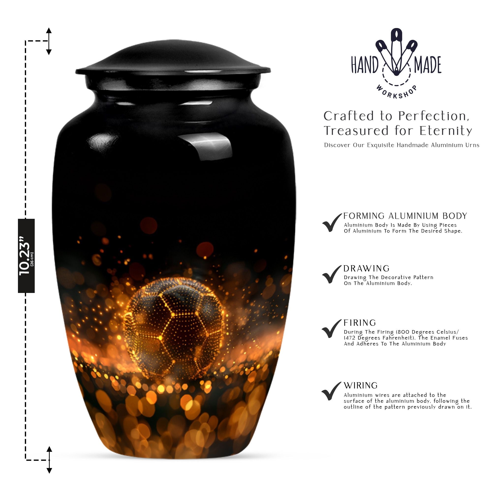 Express your everlasting love with this 10-inch Abstract-themed Soccer Urn, a compelling selection meant for memorial ceremonies. Crafted meticulously from the premium quality Aluminium, this memorial urn for women ashes puts forward an opportunity to remember the departed in an aesthetic manner. Weighing 3.3 pounds, exhibiting 10 inches in height, our Large Urn holds a capacity of up to 200 cubic inches. It creates an intimate touch point that aligns with the deeply personal moment of remembering your beloved. The urn package also includes a lavish velvet pouch that safely and respectfully contains the ashes. What sets our product apart is the personalization feature, which allows you to uplift the tribute by engraving names on the urn. Whether it’s for ground burial or as a keepsake, this metal urn for human ashes adult female stands out in its purpose, serving as a touching symbol of the life it represents. Note: The design specification remains undisclosed in this description.