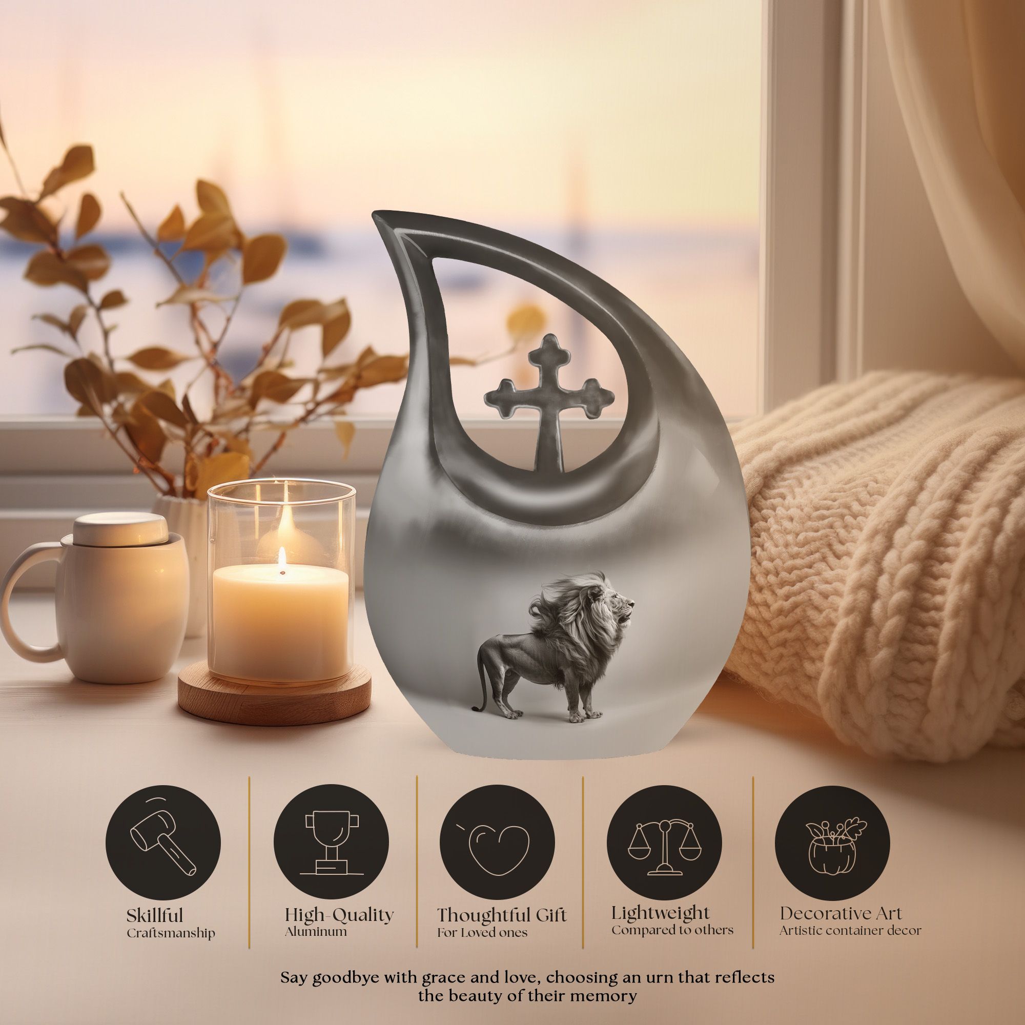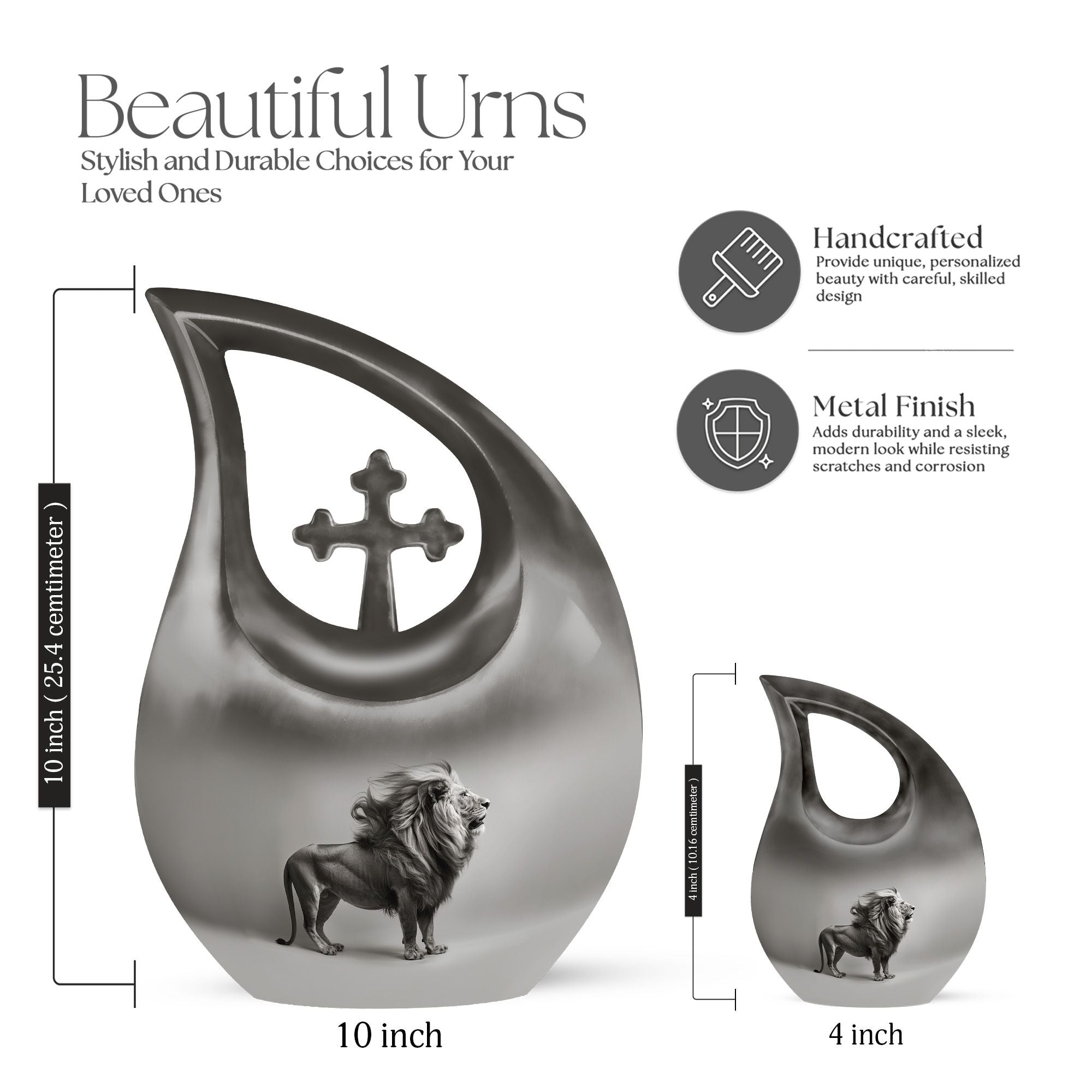 Crafted from durable aluminum, this 10 inch urn features finely detailed lion artwork that reflects strength and protection. The secure screw-top lid and smooth finish make it ideal for families looking for mens urns for human ashes, funeral urns men, funeral urns women, or beautifully crafted options such as cremation urn women or cremation urn men. Elegant and dependable, it serves as a lasting resting place for any adult loved one.