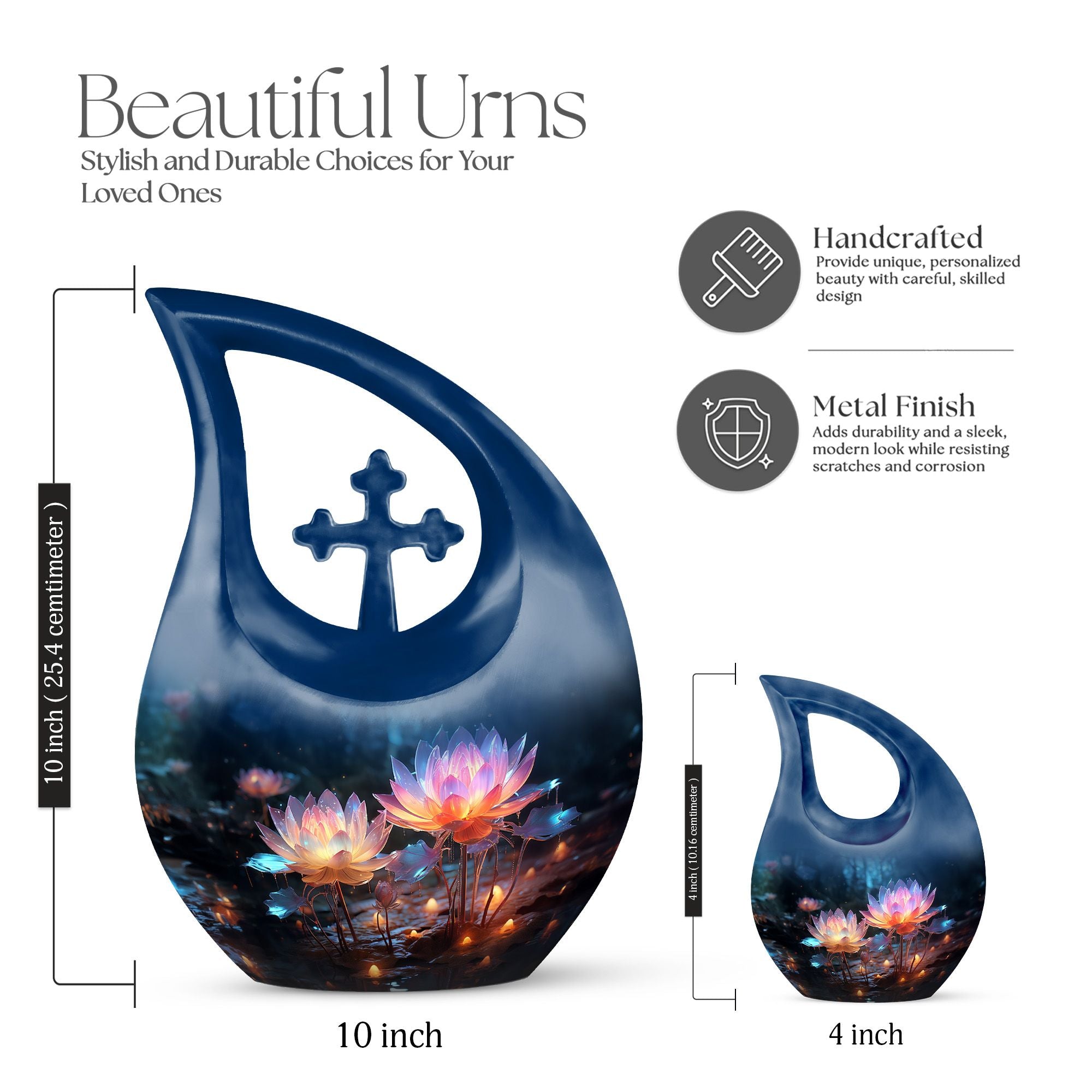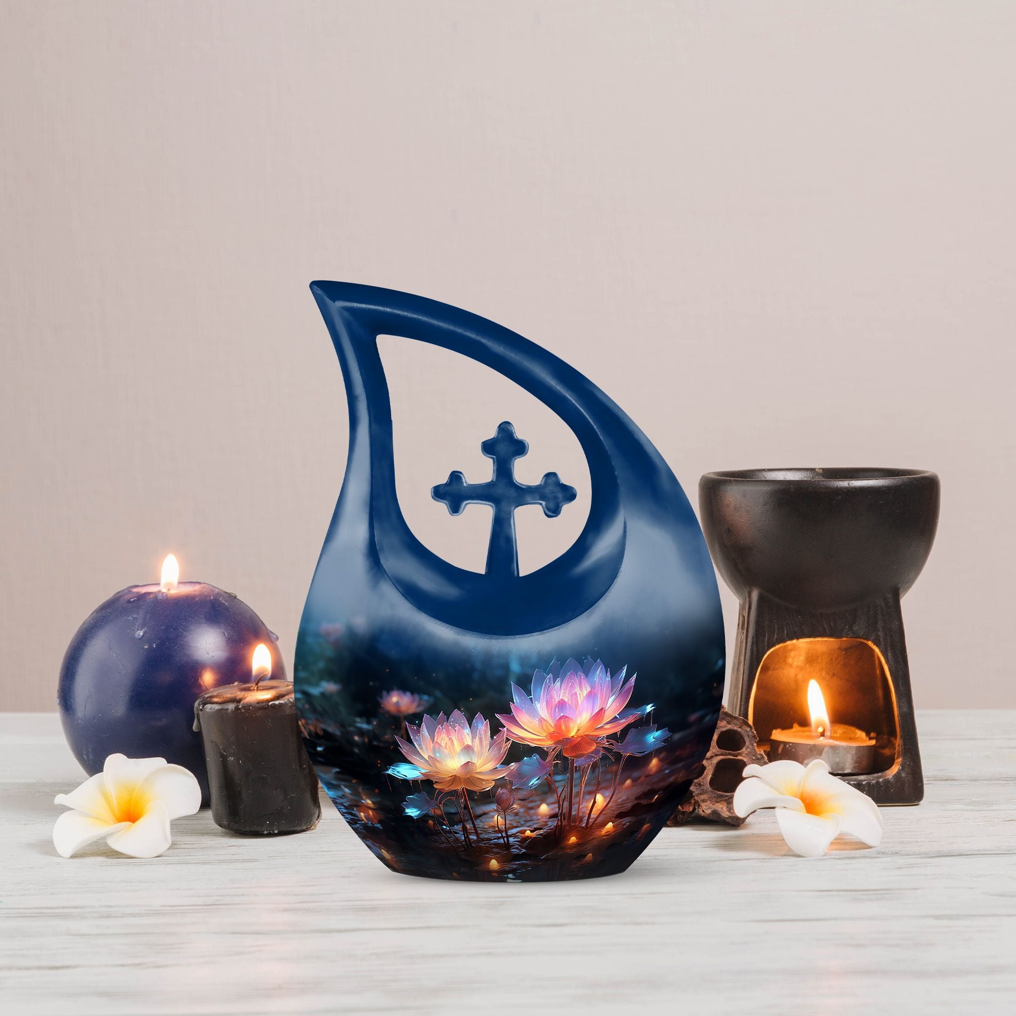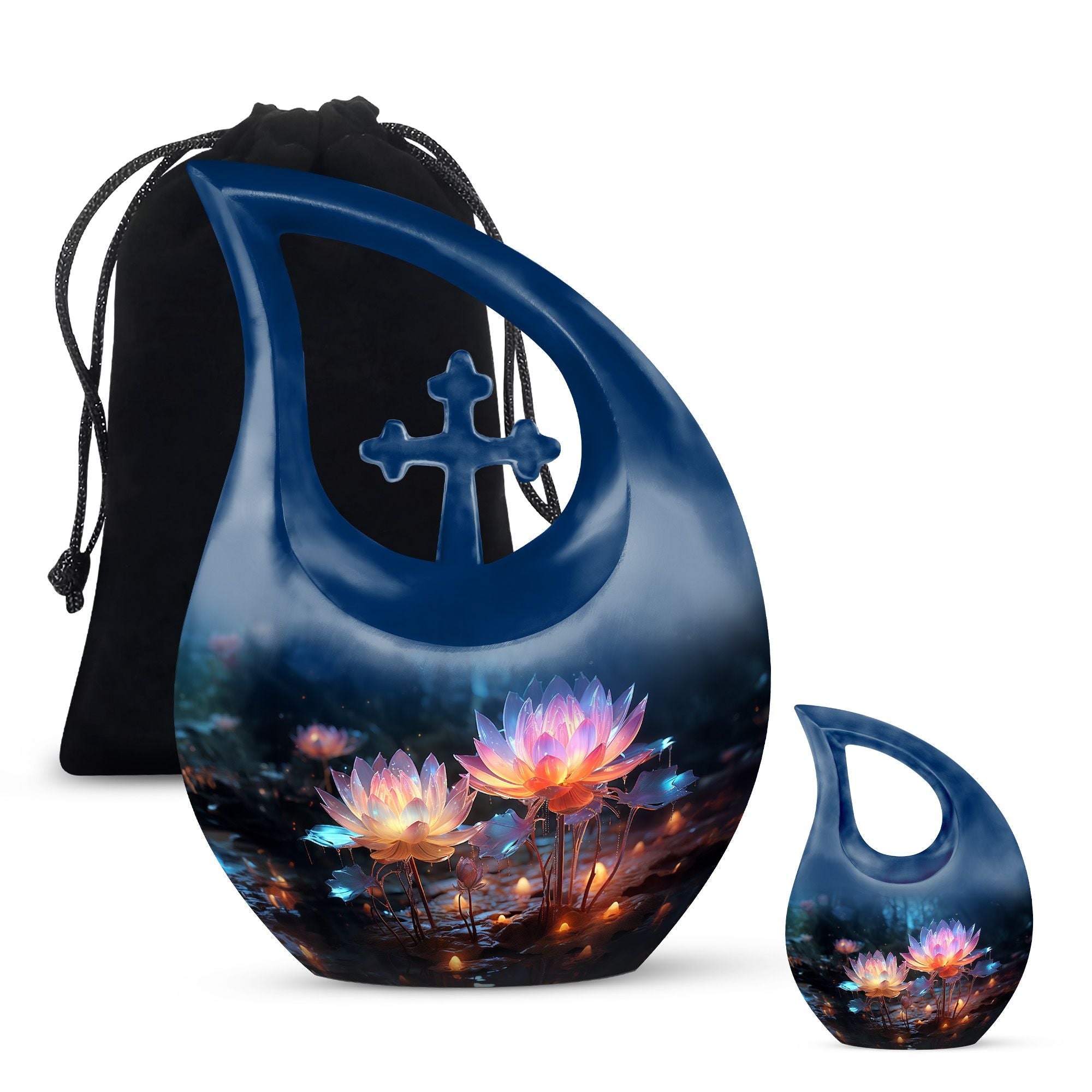 Celebrate a life of love, light, and faith with our Blue Teardrop Cremation Urn for Human Ashes, adorned with a Glowing Lotus Flower and Cross design. This graceful urn embodies peace and rebirth — the lotus symbolizing purity and the cross reflecting eternal faith. Perfect as a large urn for ashes adult male or a radiant memorial for women, it offers a deeply meaningful way to honor a cherished soul.