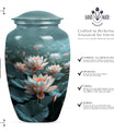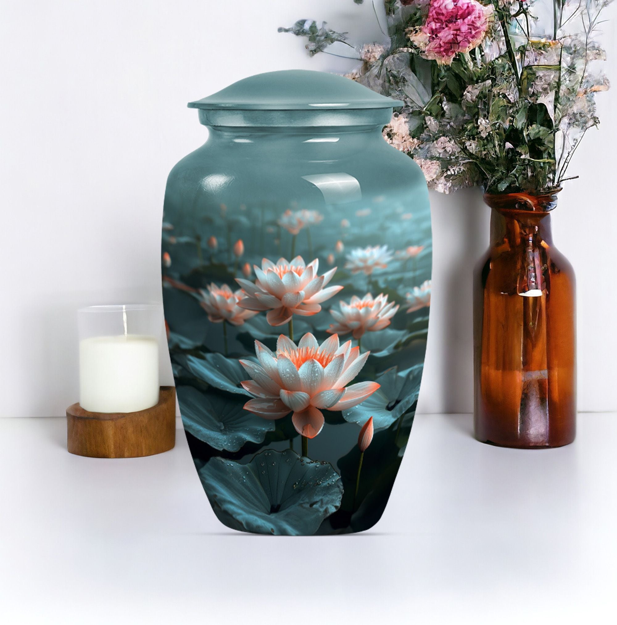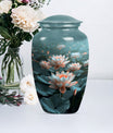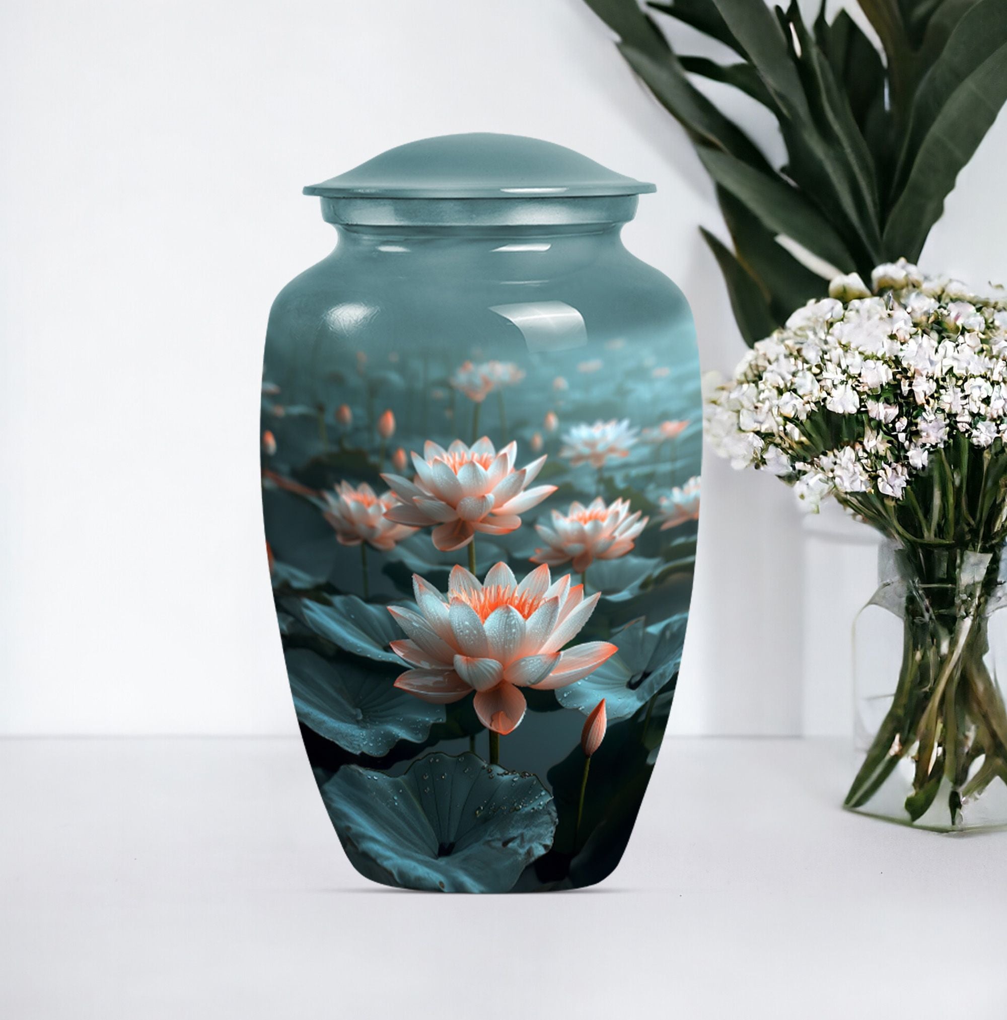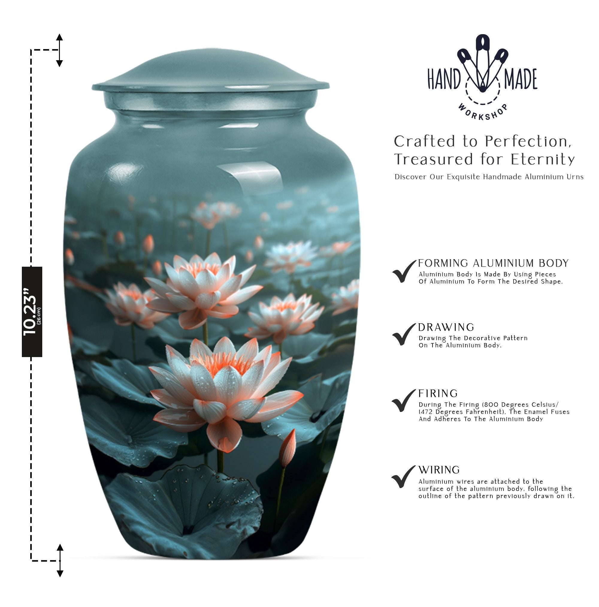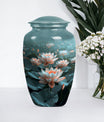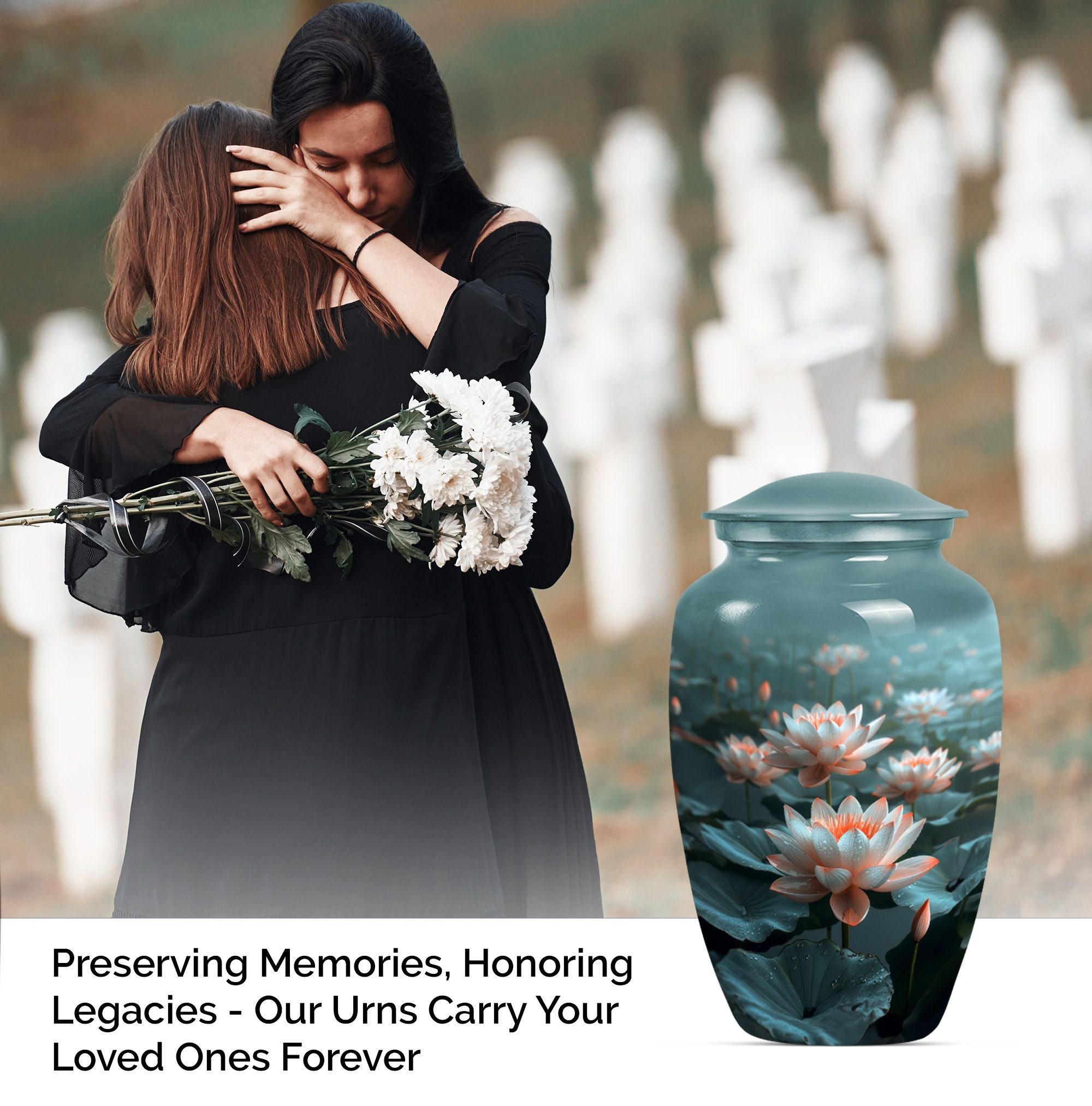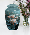 Discover the solace and lasting bond that our Classic Lotus Urn brings in honoring your beloved one. Sized at a considerable 10 inches, this burial urn allots 200 cubic inches of capacity, adequate to hold the remains of an adult. This large, aluminium-casted urn, tipping the scales at 3.3 pounds, offers durability and longevity. Its abstract theme provides a unique, yet comforting feel. This Lotus Urn navigates a path of remembrance without losing the touch of home – it’s a compact urn uniquely suited for urban dwellings. The package includes a soft velvet pouch, ensuring secure containment of the precious memorial. To make it more meaningful, you can personalize this cremation urn with engraved names, adding a stirring touch to this remembrance. Whether it's cremation ashes for your mother or any cherished adult in your life, memorial urns like these provide an honoring blend of sturdiness, suitability, and sentimental value.