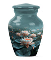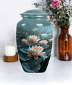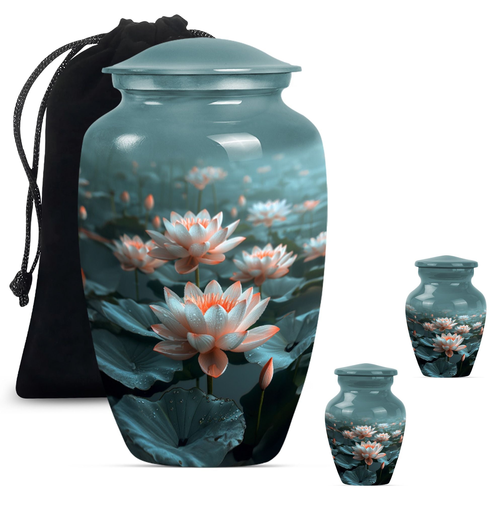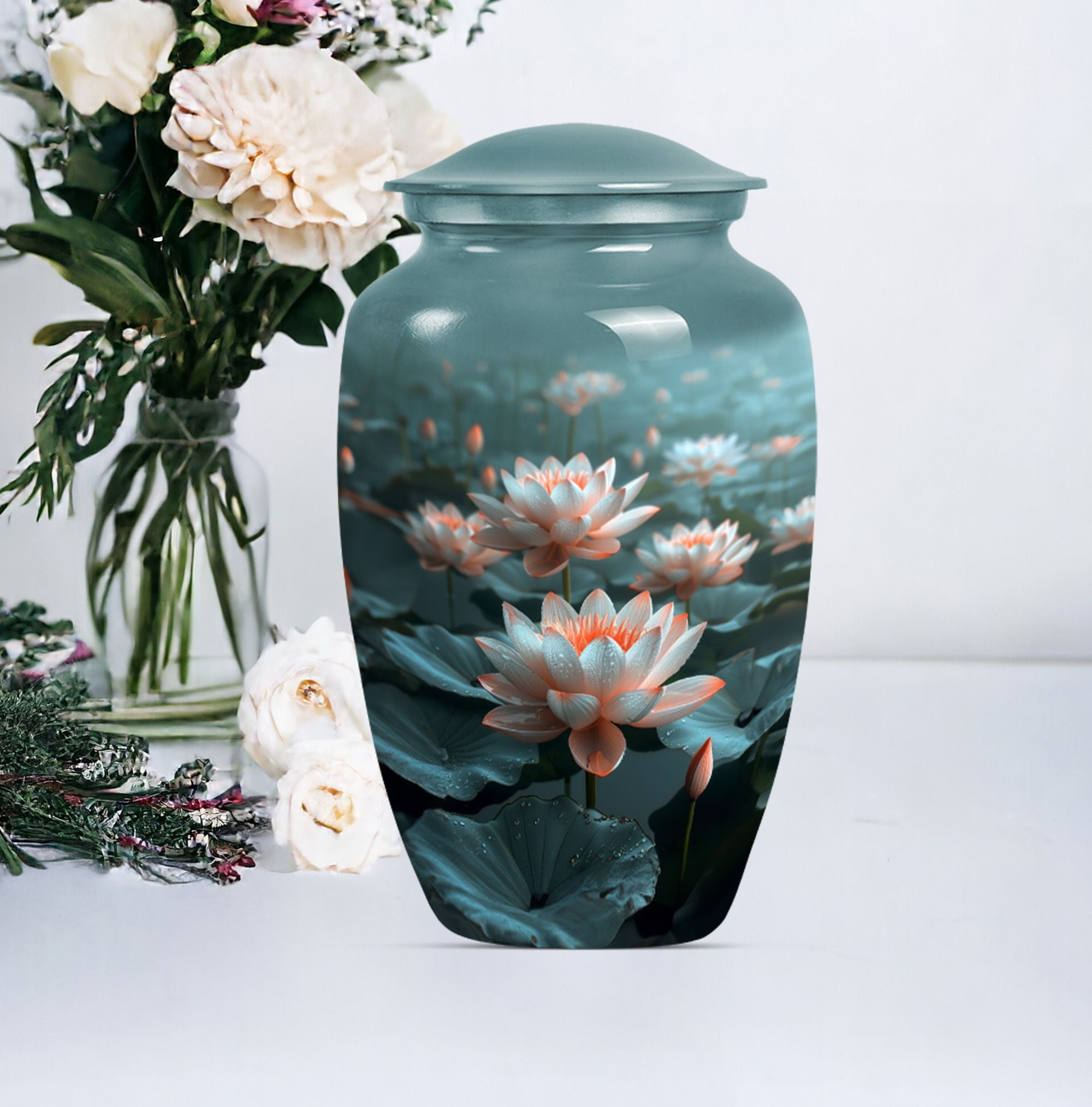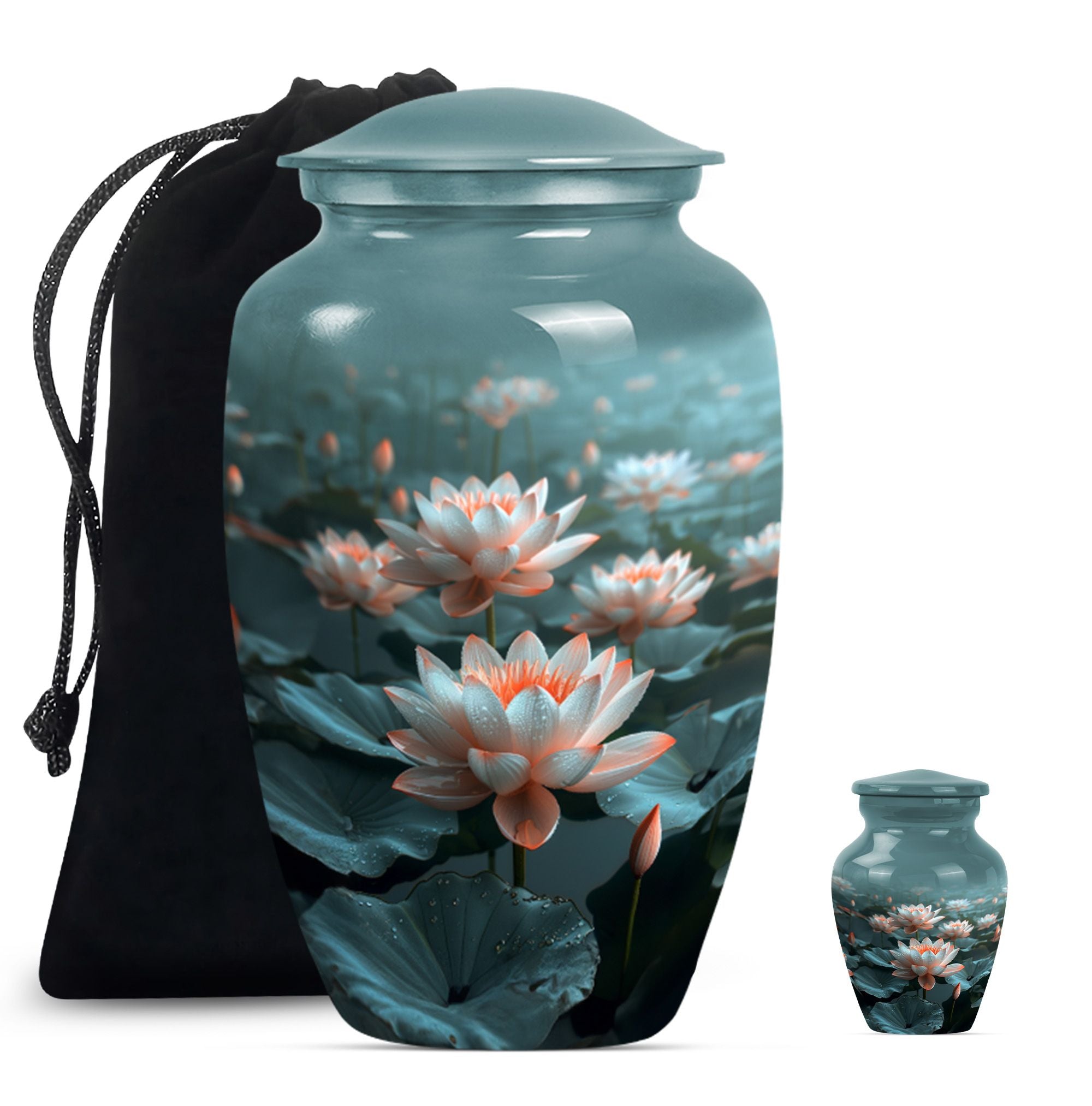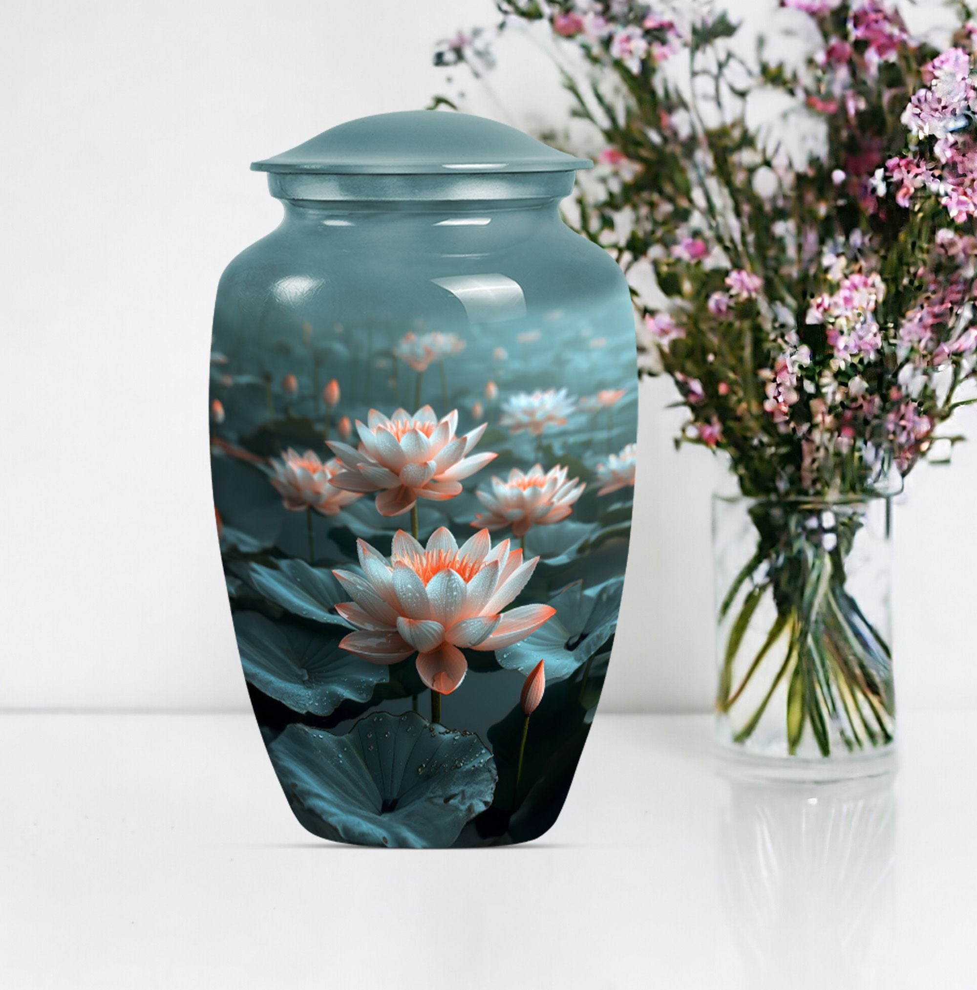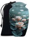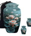 Discover the solace and lasting bond that our Classic Lotus Urn brings in honoring your beloved one. Sized at a considerable 10 inches, this burial urn allots 200 cubic inches of capacity, adequate to hold the remains of an adult. This large, aluminium-casted urn, tipping the scales at 3.3 pounds, offers durability and longevity. Its abstract theme provides a unique, yet comforting feel. This Lotus Urn navigates a path of remembrance without losing the touch of home – it’s a compact urn uniquely suited for urban dwellings. The package includes a soft velvet pouch, ensuring secure containment of the precious memorial. To make it more meaningful, you can personalize this cremation urn with engraved names, adding a stirring touch to this remembrance. Whether it's cremation ashes for your mother or any cherished adult in your life, memorial urns like these provide an honoring blend of sturdiness, suitability, and sentimental value.