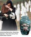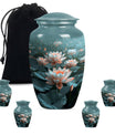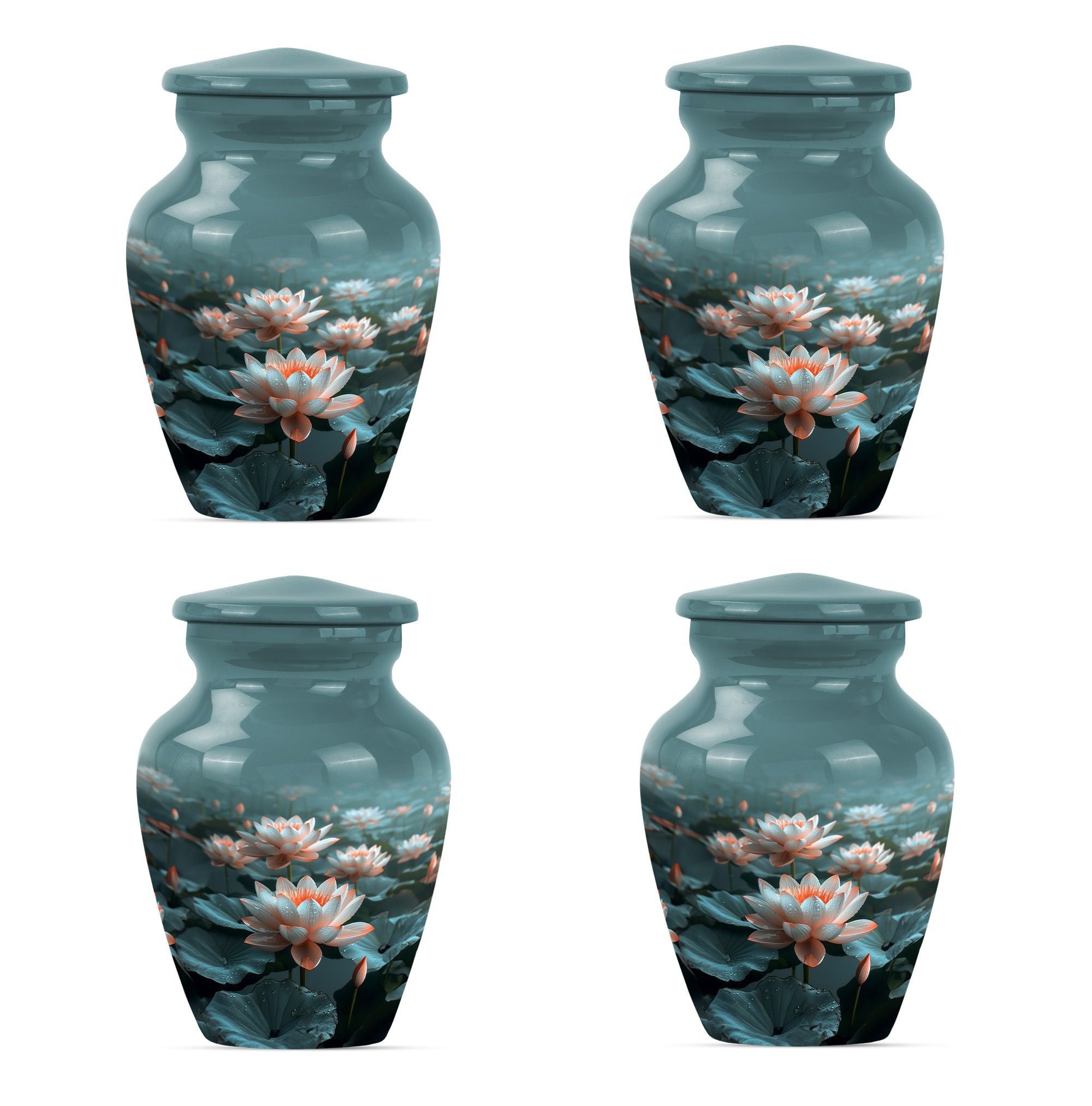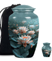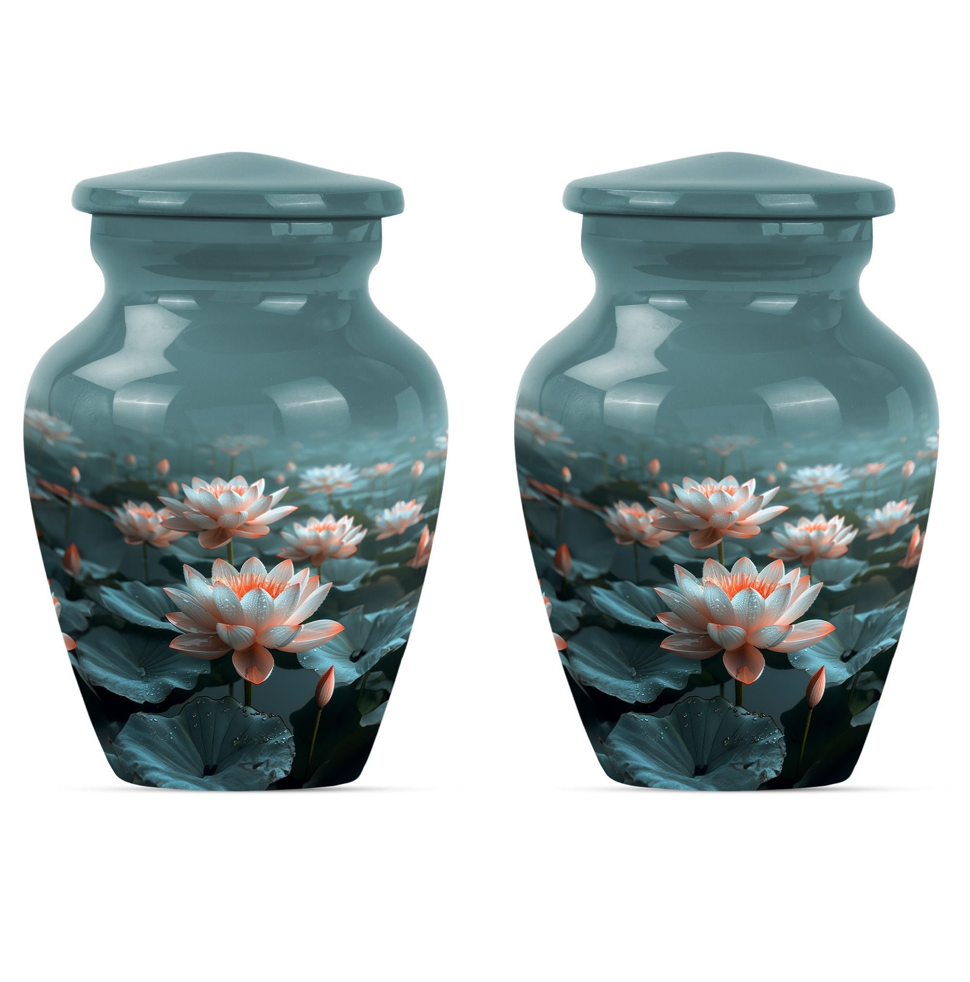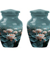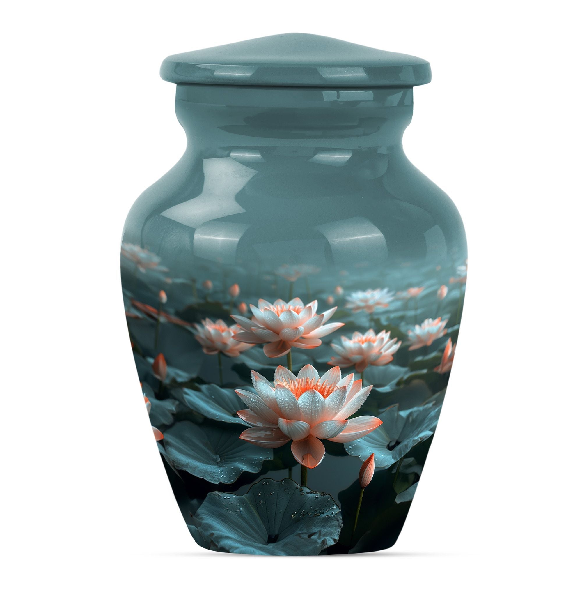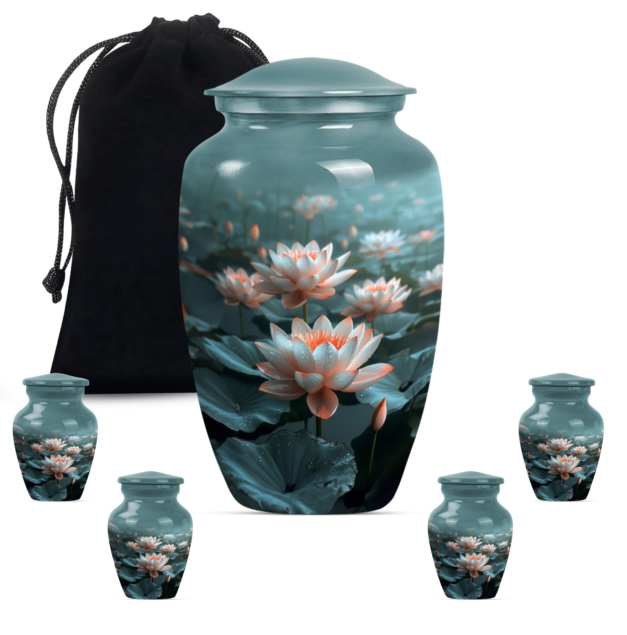 Discover the solace and lasting bond that our Classic Lotus Urn brings in honoring your beloved one. Sized at a considerable 10 inches, this burial urn allots 200 cubic inches of capacity, adequate to hold the remains of an adult. This large, aluminium-casted urn, tipping the scales at 3.3 pounds, offers durability and longevity. Its abstract theme provides a unique, yet comforting feel. This Lotus Urn navigates a path of remembrance without losing the touch of home – it’s a compact urn uniquely suited for urban dwellings. The package includes a soft velvet pouch, ensuring secure containment of the precious memorial. To make it more meaningful, you can personalize this cremation urn with engraved names, adding a stirring touch to this remembrance. Whether it's cremation ashes for your mother or any cherished adult in your life, memorial urns like these provide an honoring blend of sturdiness, suitability, and sentimental value.