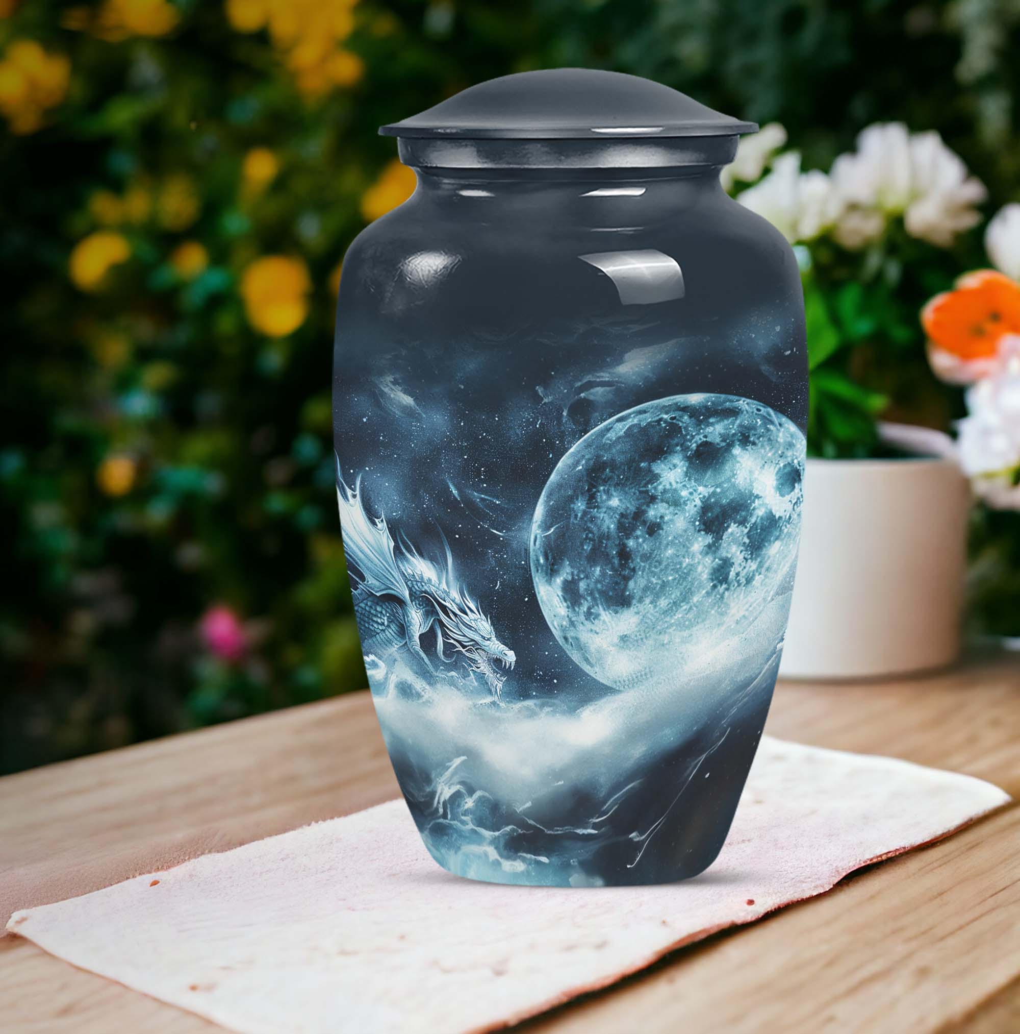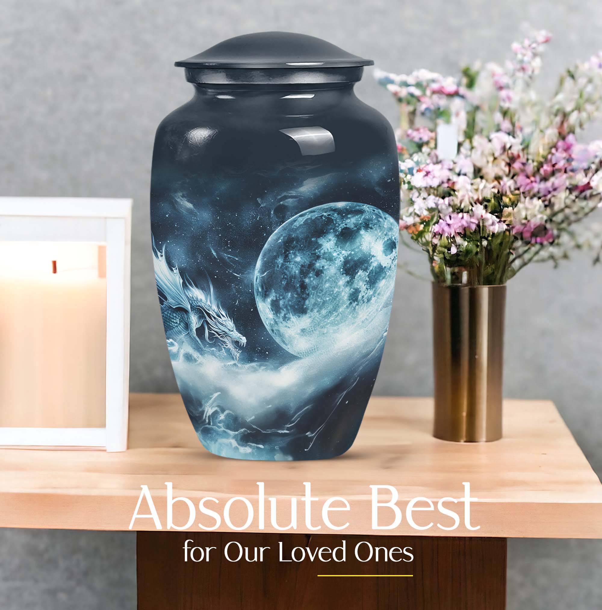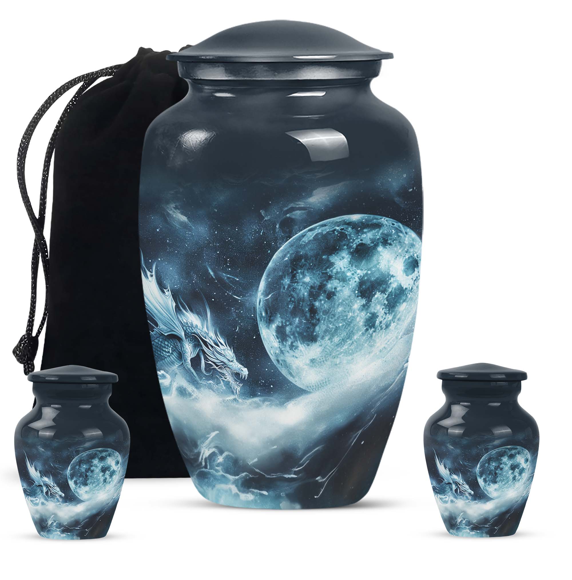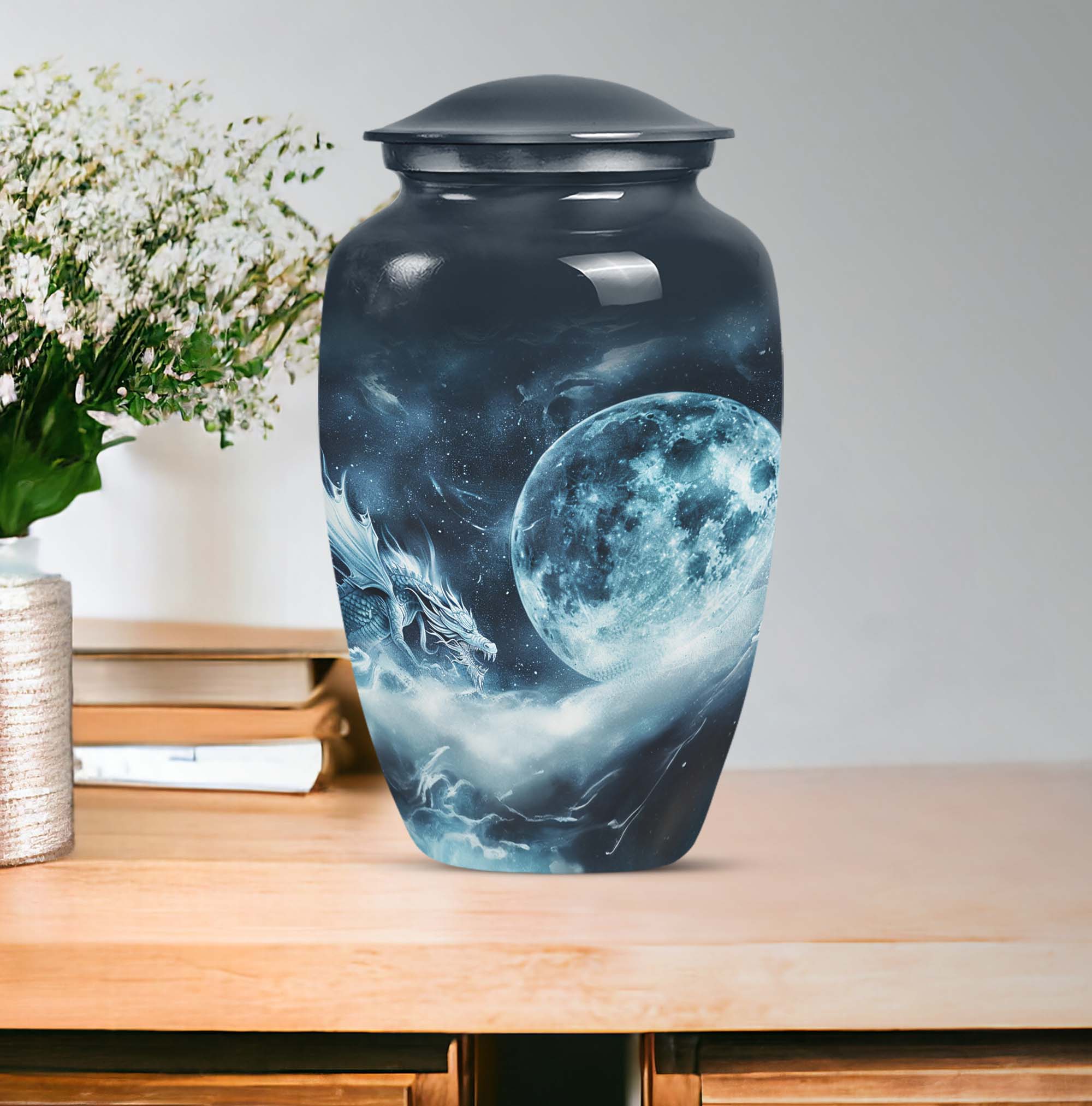 The elegantly crafted Lunar Urn is a superb choice for those in search of a meaningful way to cherish the memory of departed loved ones. Primarily designed to serve as an exquisite receptacle for adult ashes, this urn, measuring at a substantial 10 inches, provides ample space to store up to 200 cubic inches. Every Large Urn is constructed from high-grade aluminum, ensuring a substantial weight of 3.3 pounds, which adds an element of sturdiness to its aesthetic appeal. The abstract theme that graces each urn adds a touch of subtle sophistication, perfectly suited for women. The package also includes a plush velvet pouch, providing a dignified containment for the ashes. For a more personable tribute, there is an option to customize through meticulously engraved names. Often sought-after as burial funeral urns or cremation memorial urns, this product is an excellent choice in memorial ceremony supplies. With the Lunar Urn, each remembrance becomes a sacred homage, filled with love, respect, and reverence.