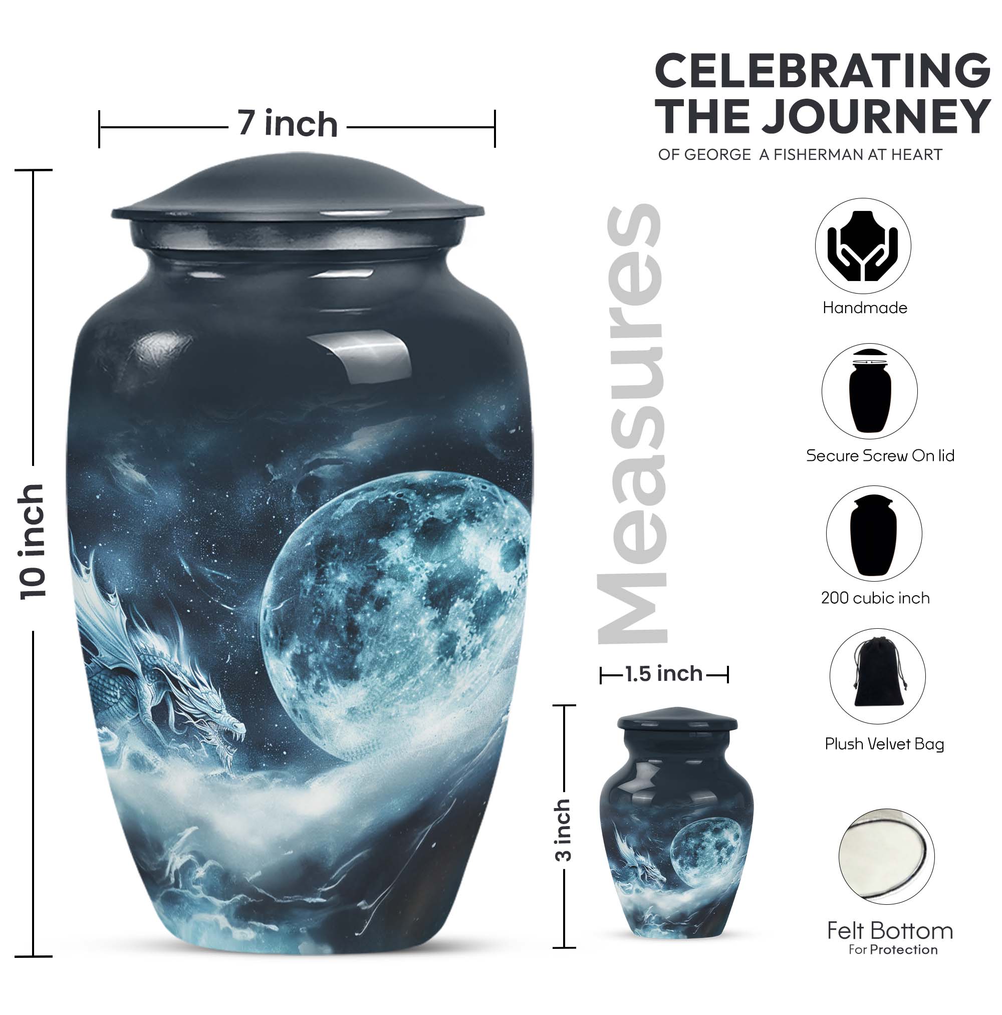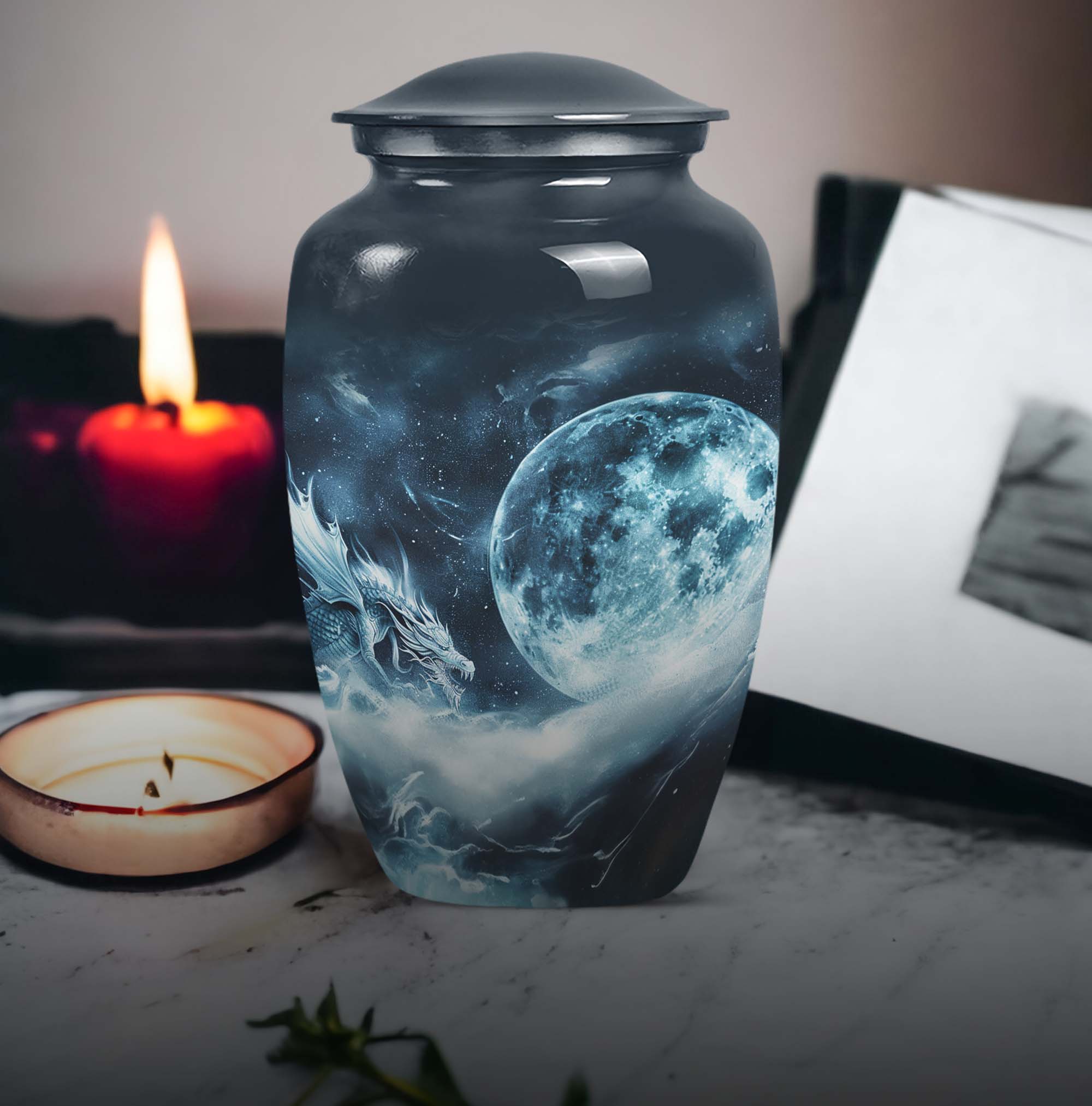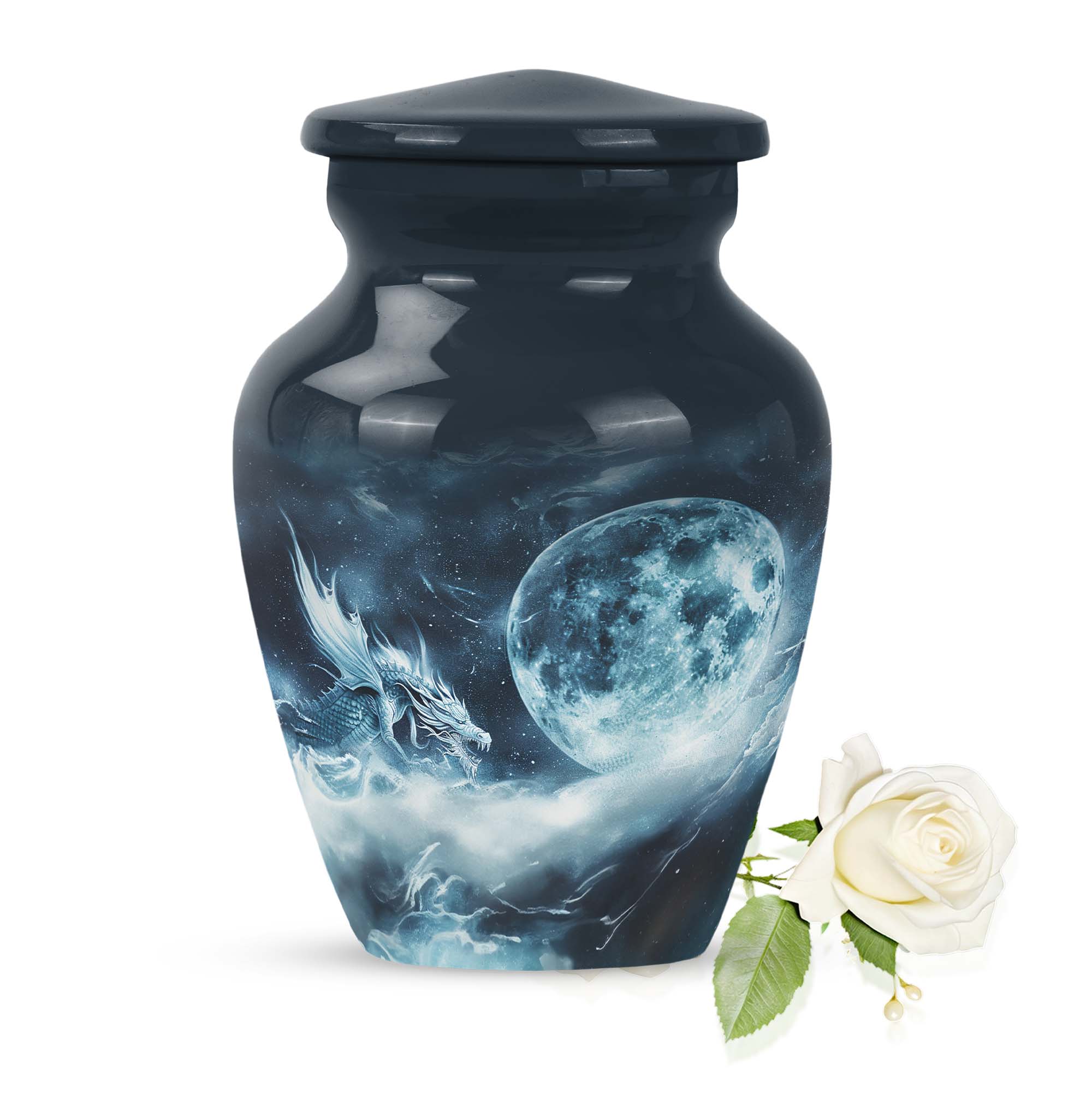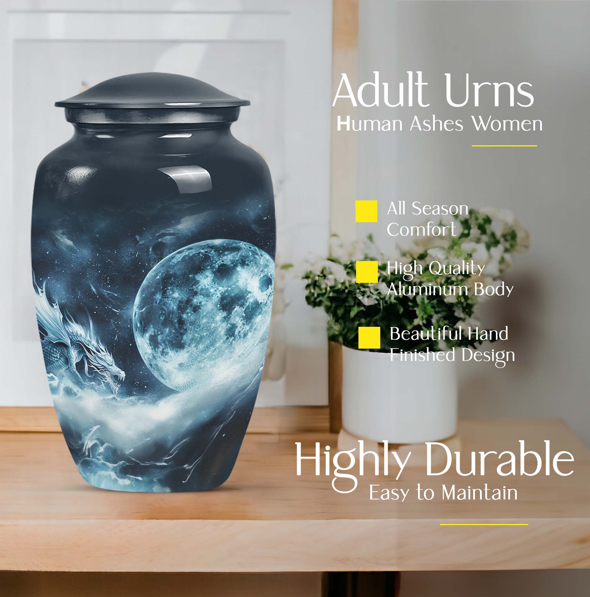 The elegantly crafted Lunar Urn is a superb choice for those in search of a meaningful way to cherish the memory of departed loved ones. Primarily designed to serve as an exquisite receptacle for adult ashes, this urn, measuring at a substantial 10 inches, provides ample space to store up to 200 cubic inches. Every Large Urn is constructed from high-grade aluminum, ensuring a substantial weight of 3.3 pounds, which adds an element of sturdiness to its aesthetic appeal. The abstract theme that graces each urn adds a touch of subtle sophistication, perfectly suited for women. The package also includes a plush velvet pouch, providing a dignified containment for the ashes. For a more personable tribute, there is an option to customize through meticulously engraved names. Often sought-after as burial funeral urns or cremation memorial urns, this product is an excellent choice in memorial ceremony supplies. With the Lunar Urn, each remembrance becomes a sacred homage, filled with love, respect, and reverence.