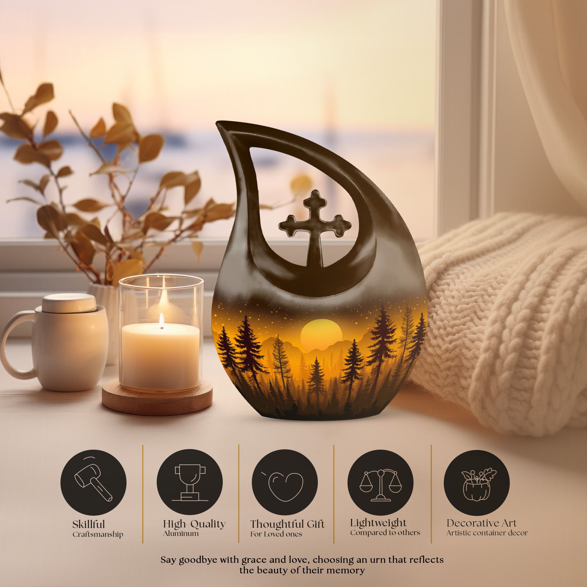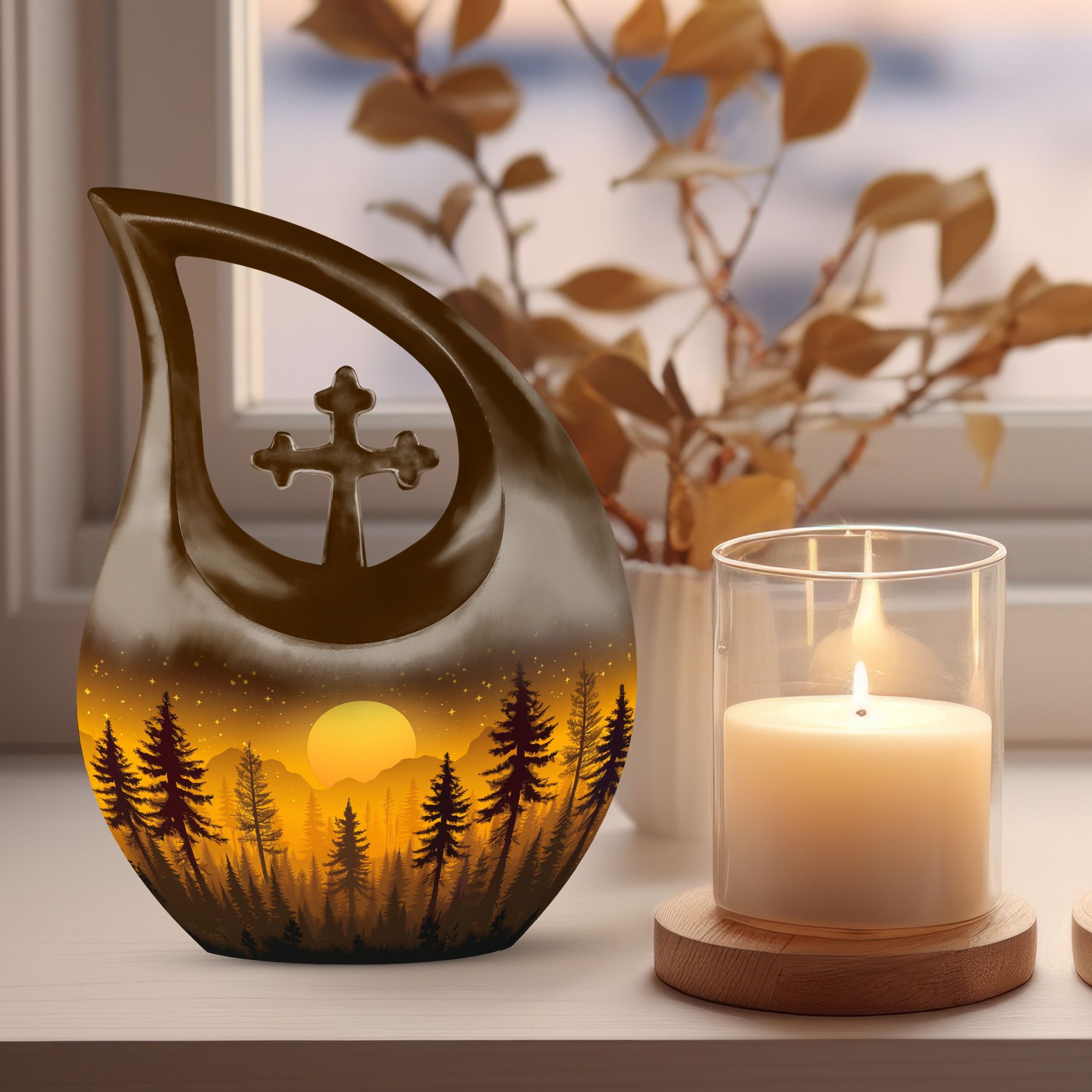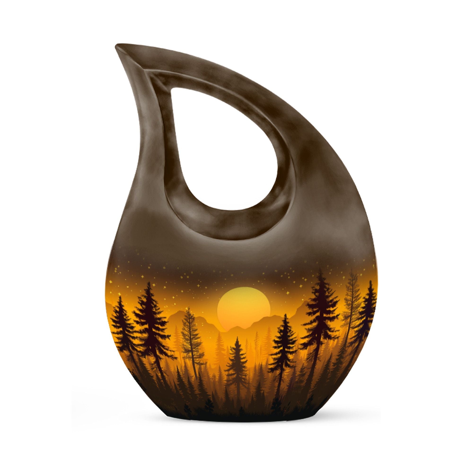 Expertly handcrafted from durable aluminum, this forest motif urn for ashes features a stunning blend of moonlight silver and deep woodland tones. Each detail captures the spirit of harmony and renewal, making it one of the most unique urns for human ashes available. Its secure screw-top lid ensures ashes are kept safe and protected, while the polished finish creates a serene and elegant display suitable for any memorial setting.