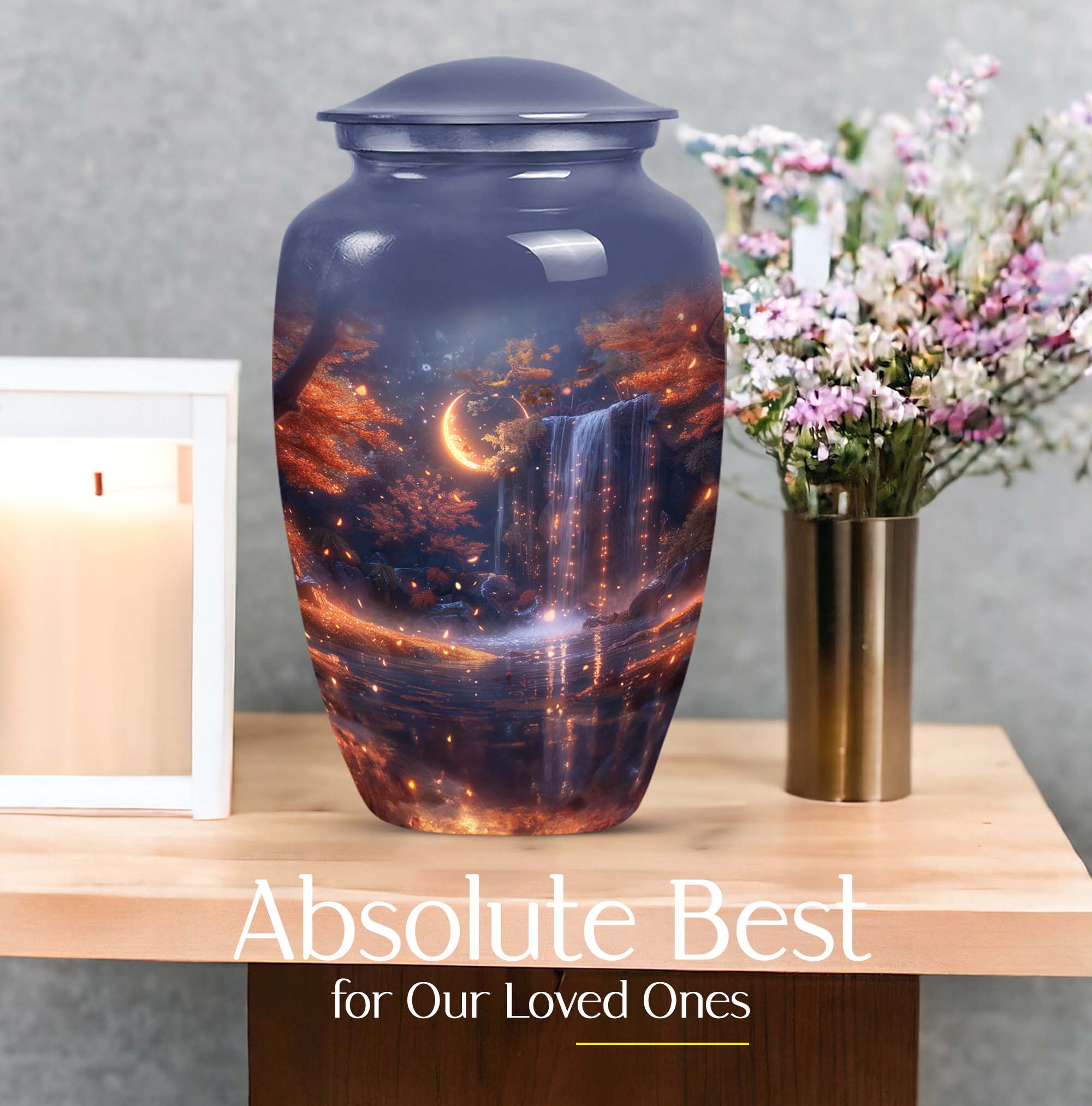 Pay tribute to your loved ones with the Lunar Urn, a perfect choice among memorial funeral urns for ashes. This 10-inch, large urn creates an everlasting memorial. Crafted with the utmost care from high-grade Aluminium, it weighs 3.3 pounds and boasts an abstract theme, offering a multi-dimensional tribute to cherished memories. Its dimensions are well suited to hold up to 200 cubic inches of ashes. This appealing urn not only serves as a memorial but also doubles as a decorative piece, thanks to its Classic Urn style often sought by those looking for unique urns for human ashes. Add a personal touch to this urn through customization by engraving names on it. It also comes with a velvet pouch for containment and safekeeping of the ashes, ensuring they remain undisturbed. Whether used for cremation ashes of mother and father or someone else close to your heart, the Lunar Urn encompasses diverse sentiments with its distinctive structure and appearance. Its highly detailed design ensures it stands out, uplifting the ambience while serving as a gentle reminder of the departed soul.