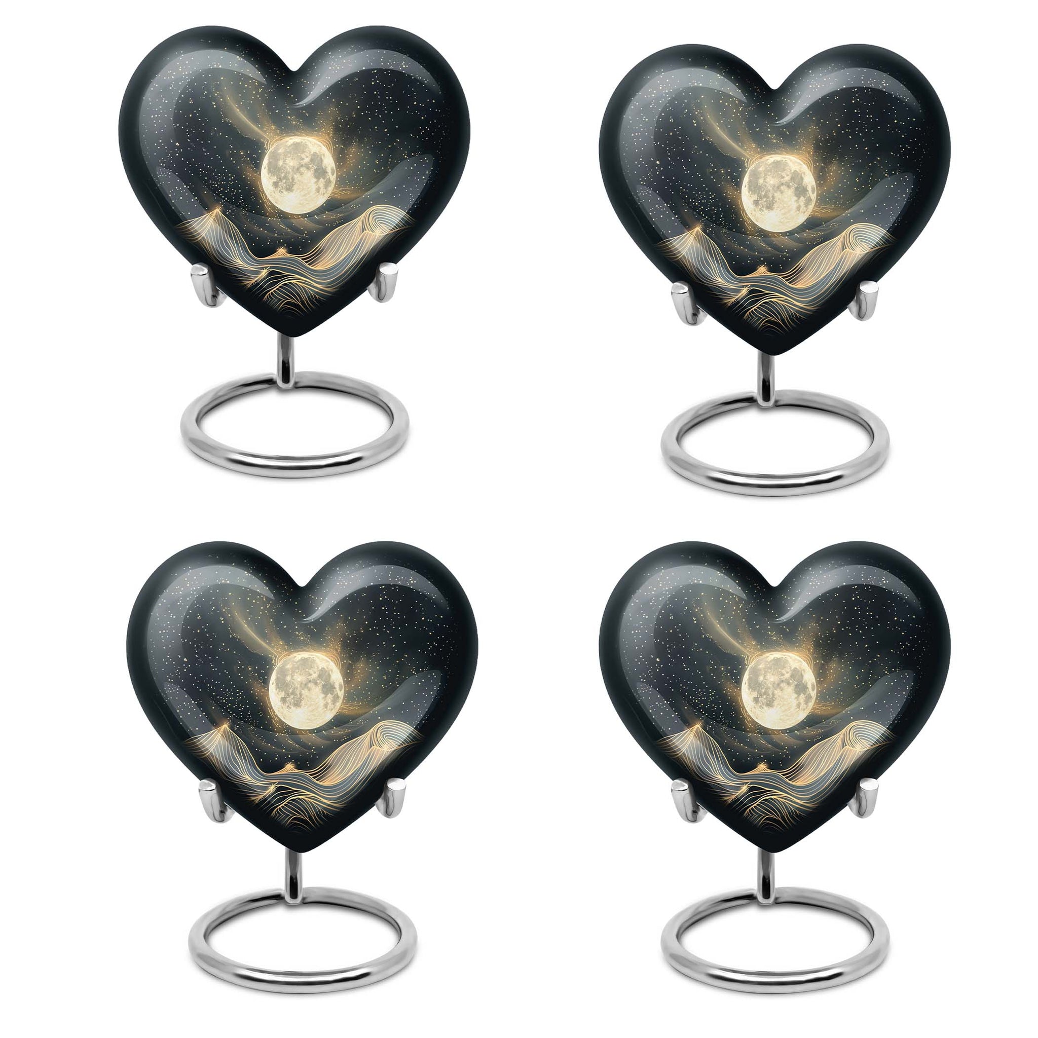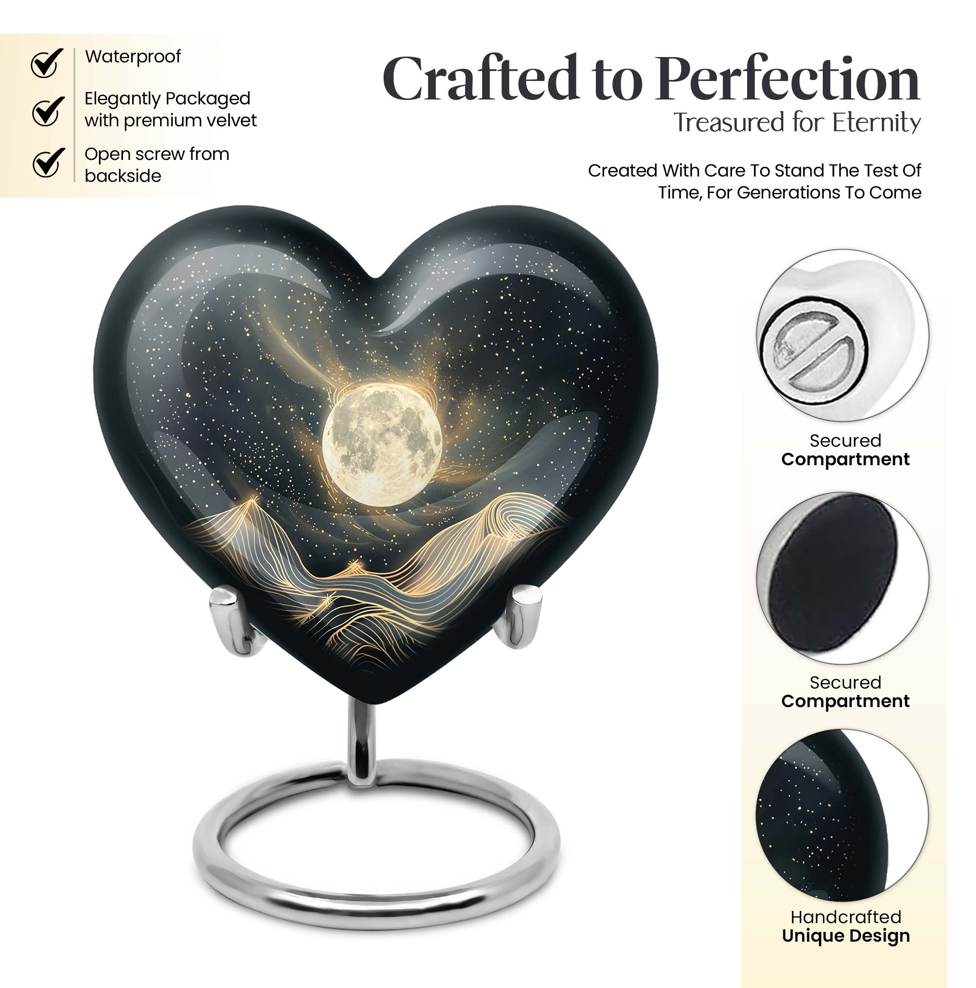 Embrace a loving and abstract symbol of remembrance with our 10-inch Lunar Urn, handcrafted from durable aluminium. This large artifact sports a unique heart theme, artistically striking while subtly portraying a sense of warmth. The dimensions of this subtle memorial funeral urn perfectly symbolize a loving embrace with a capacity of 200 cubic inches, sufficient to securely hold the ashes of your loved one. Weighing 3.3 pounds, its substantial feel mirrors its profound purpose, offering a tangible sense of closure. This product comes with a soft velvet pouch for the containment and respectful preservation of ashes. For a special touch, this lunar urn offers customization that allows you to personalize with engraved names, adding significant depth to an already profound memorial. It's not just an urn; it's a loving resting place, a symbol of eternal peace and a monument of perpetual memories. Ideal for seniors and adults seeking memorial urns, fulfilling searches related to 'human ash urns,' 'urns for human ashes,' and 'mom cremation urn.' Note: Design not specified.