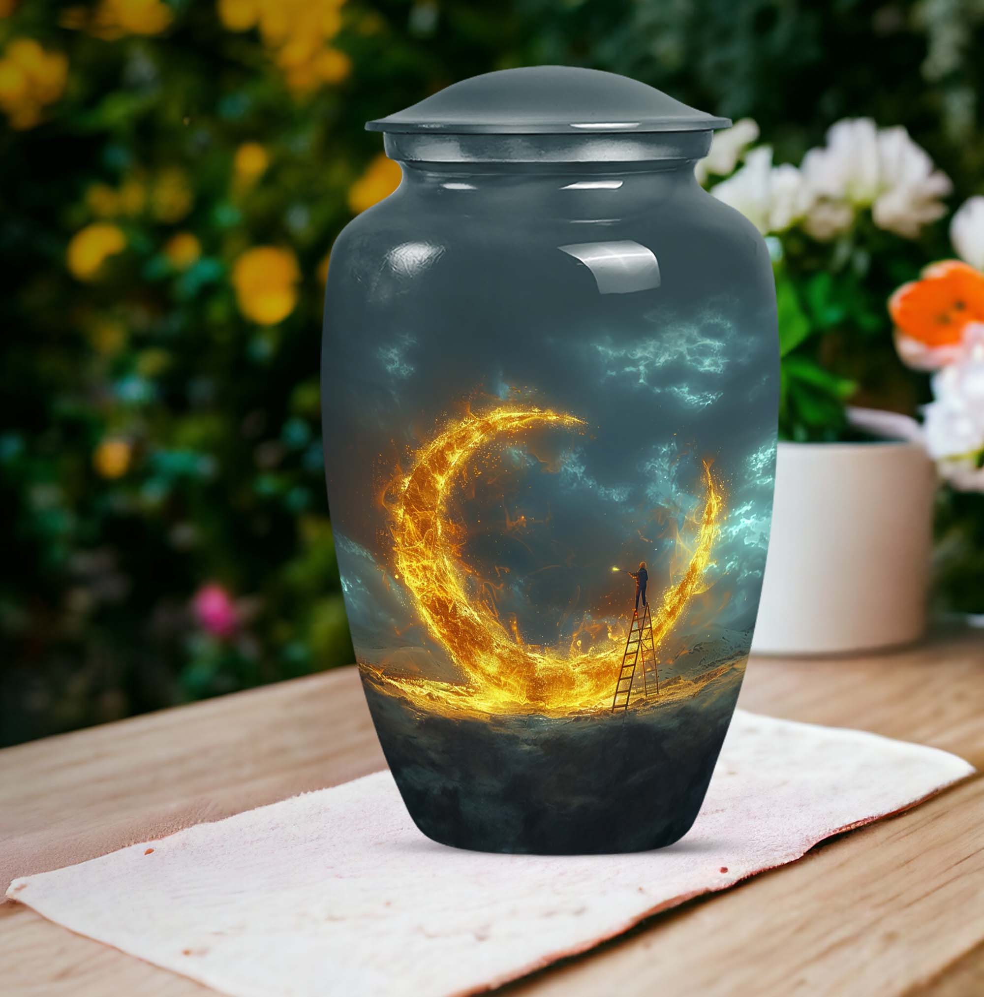 Immortalize the memory of a cherished one with our Lunar Urn, a premium cremation large urn for ashes designed to preserve and honor their legacy. Handcrafted from high-quality aluminium, this large urn stands 10 inches in height, capable of holding up to 200 cubic inches of ashes. Weighing 3.3 pounds, it's an incredibly durable and substantial piece that perfectly balances robustness with elegance. The abstract theme of our Lunar Urn delivers a unique artistic touch, catering to a wide variety of aesthetic preferences. For a more personalized memorial, this item can be engraved with names, ensuring a bespoke commemoration. The urn is accompanied by a velvet pouch, offering discreet and respectful containment of remains. Ideal for funeral gifts, our Lunar Urn outshines other cremation medium urns and metal urns for human ashes, providing a tangible piece of comfort for the loss of a loved one. This size and shape of the urn encapsulate the usefulness as well as the aesthetic sophistication of a classic urn without an overtly direct reference to the design itself. Pay the ultimate tribute to your loved one with our Lunar Urn, a testament to their unforgettable impact and memory.