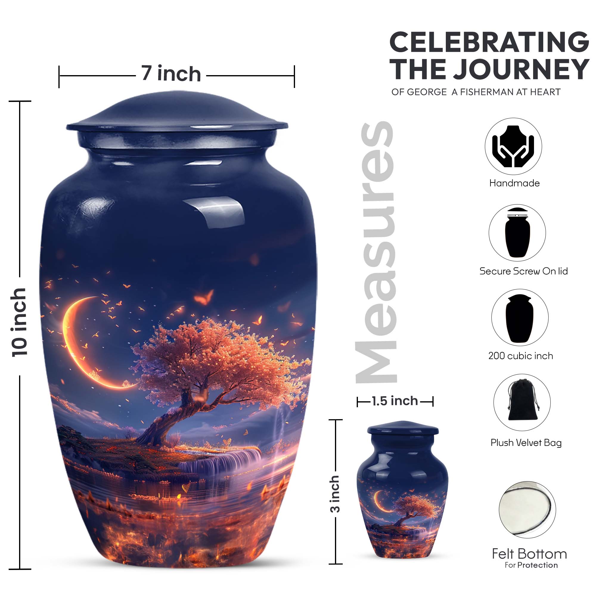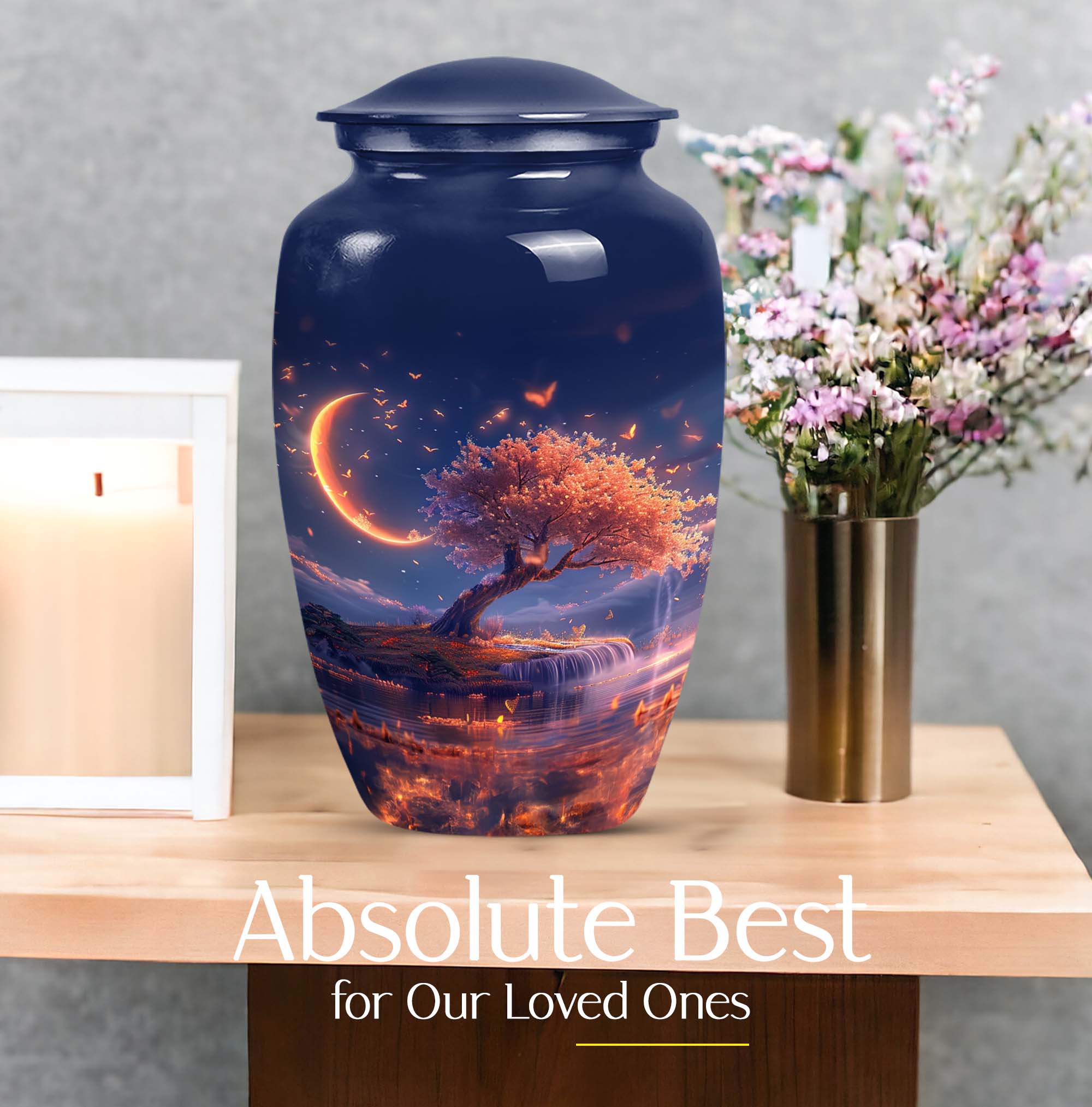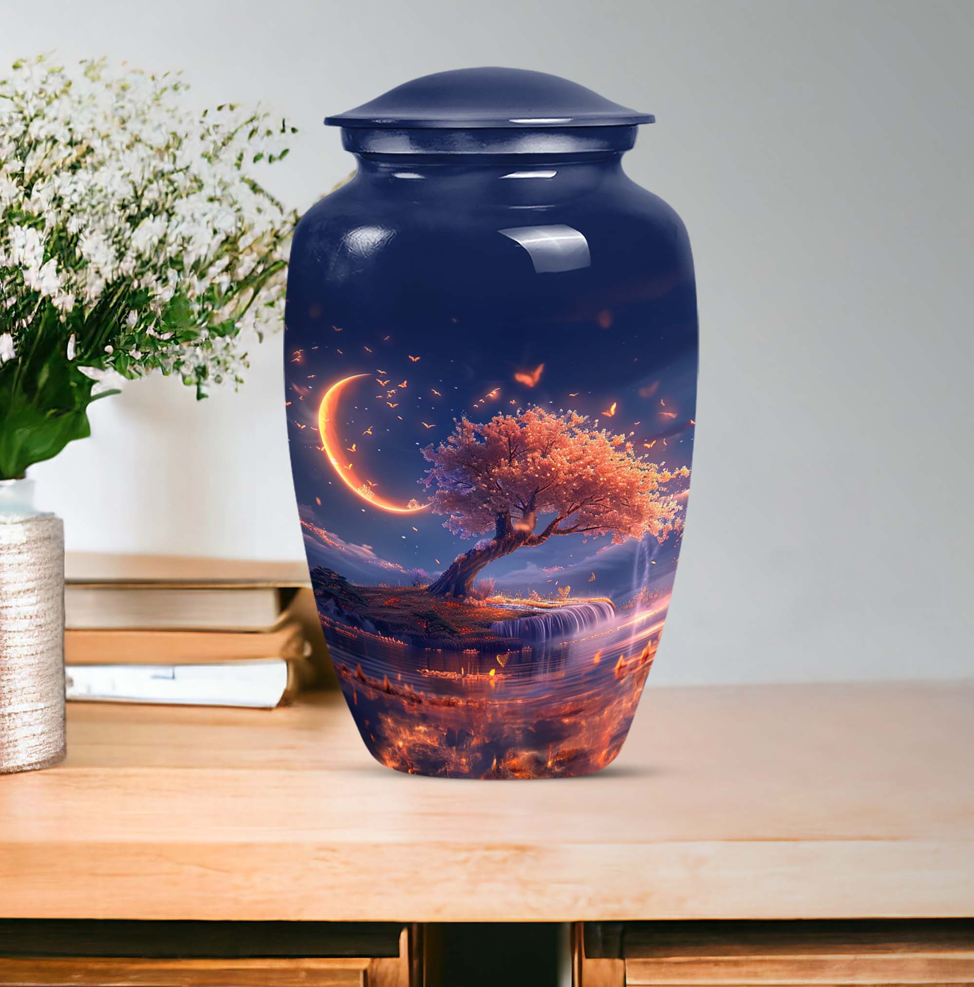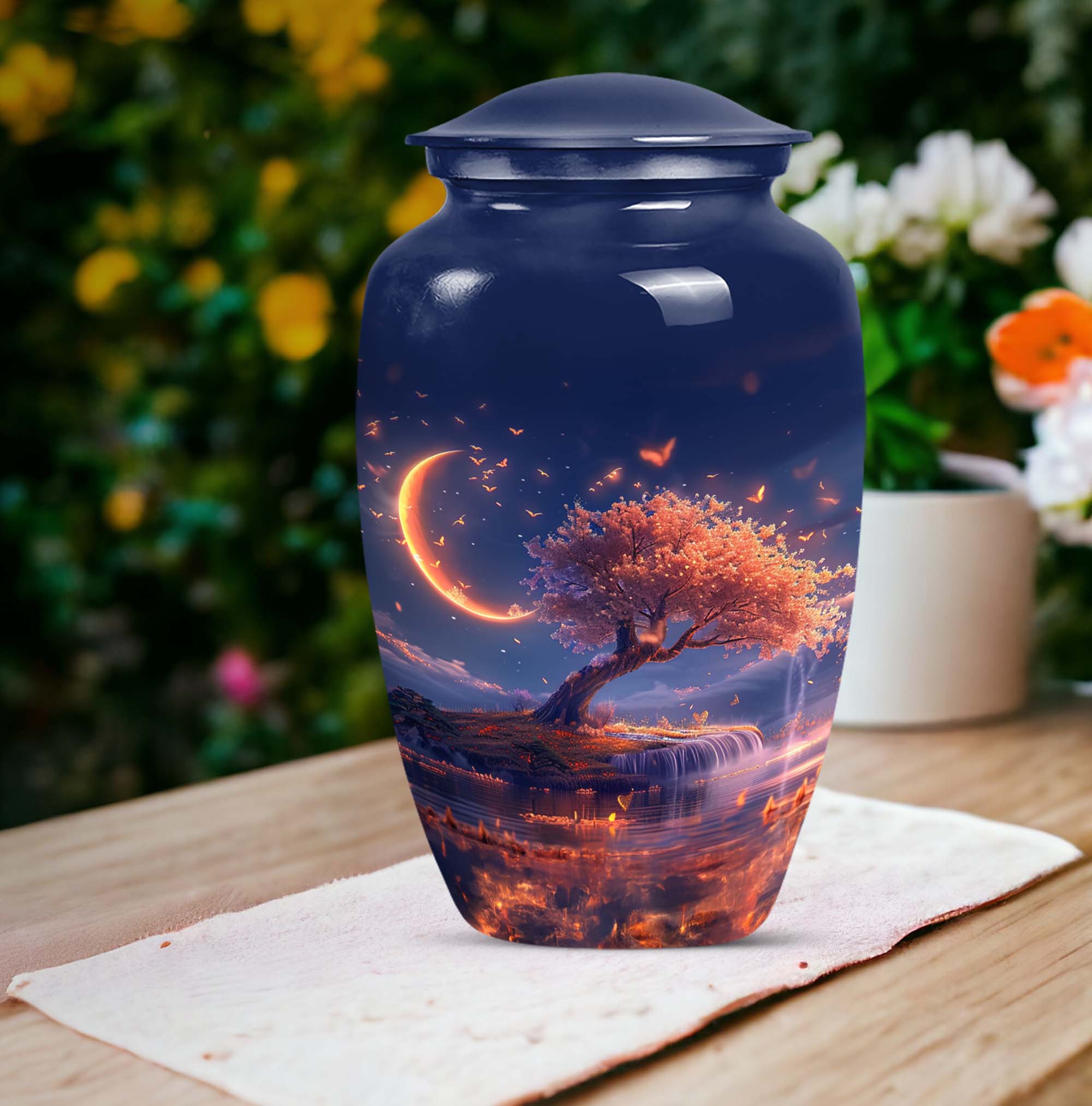 Immerse yourself in contemplation and remembrance with the Lunar Urn, a profound piece from our range of memorial urns. Crafted meticulously from robust and enduring aluminium, this large urn stands tall at 10 inches, making it perfect for a dignified resting place of your loved one. It carries an impressive capacity of 200 cubic inches, suited to hold the ashes of adult women and men alike. The urn weighs 3.3 pounds, offering a substantial and poignant symbol of remembrance. With an abstract theme running through it, this classic urn aligns the aesthetics with profound emotion. Each urn additionally comes with a velvet pouch for the containment of ashes, providing an added layer of privacy and respect. One may even elect to imprint a mark of personal significance, as this urn permits customization with engraved names. Intensify your reverence and respect, with this piece from our burials and ceremonies supplies, that connects seamlessly to the profoundness of your emotions.