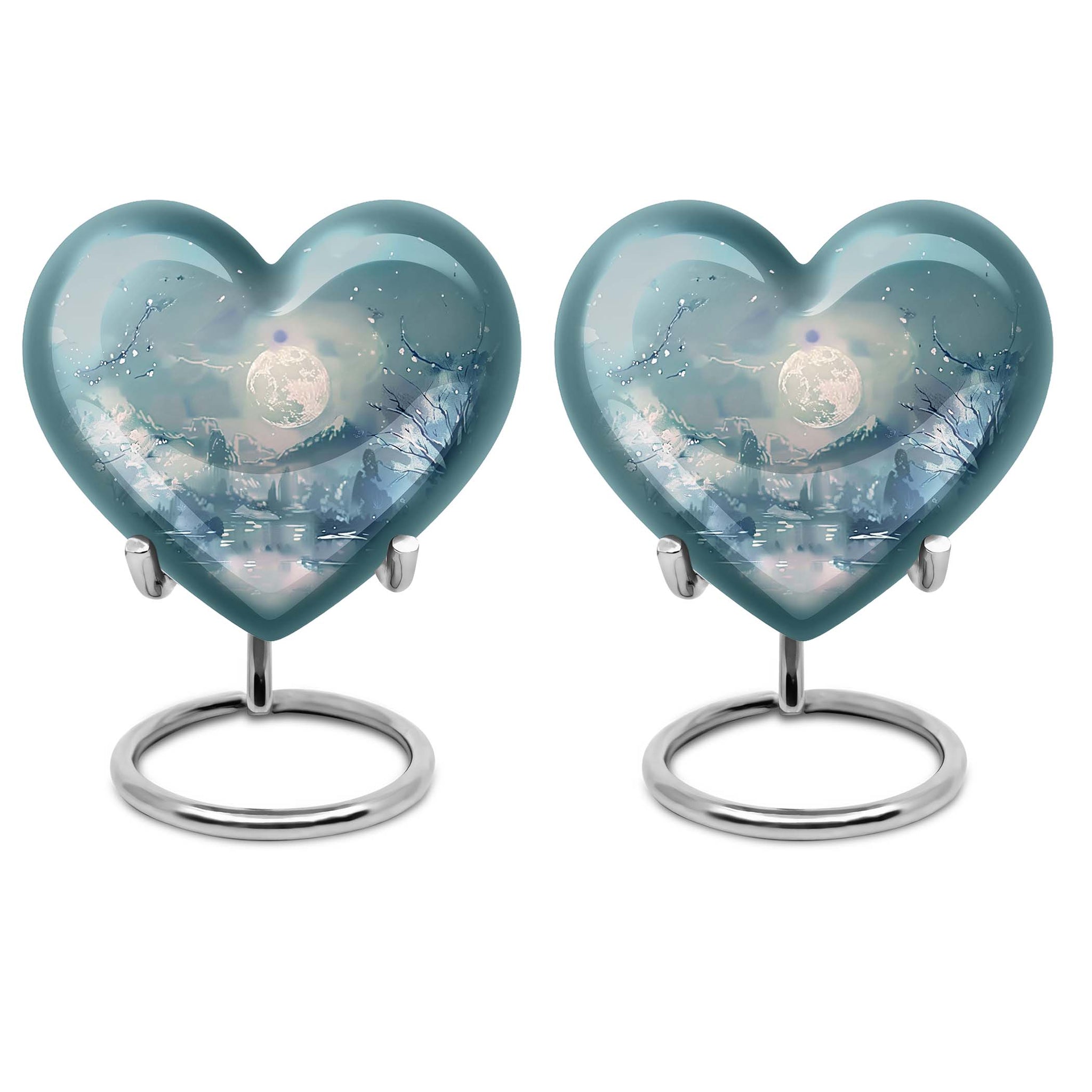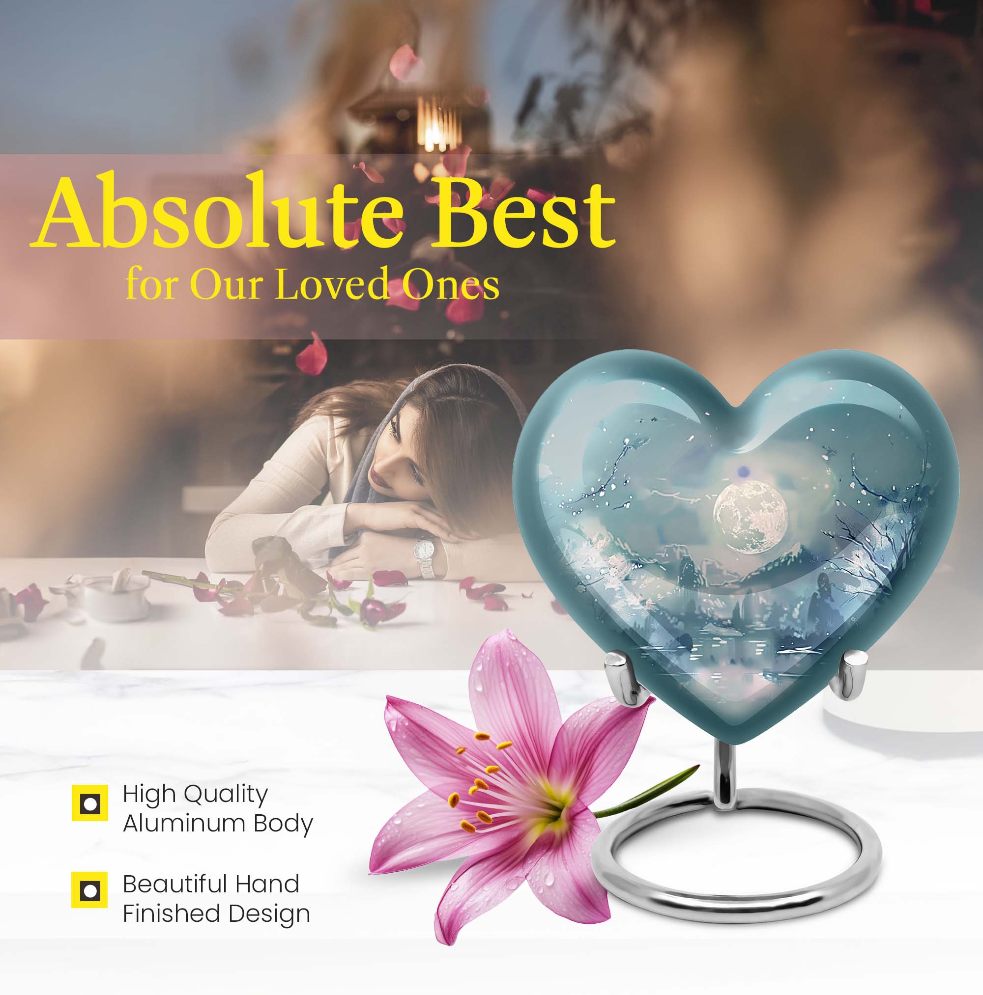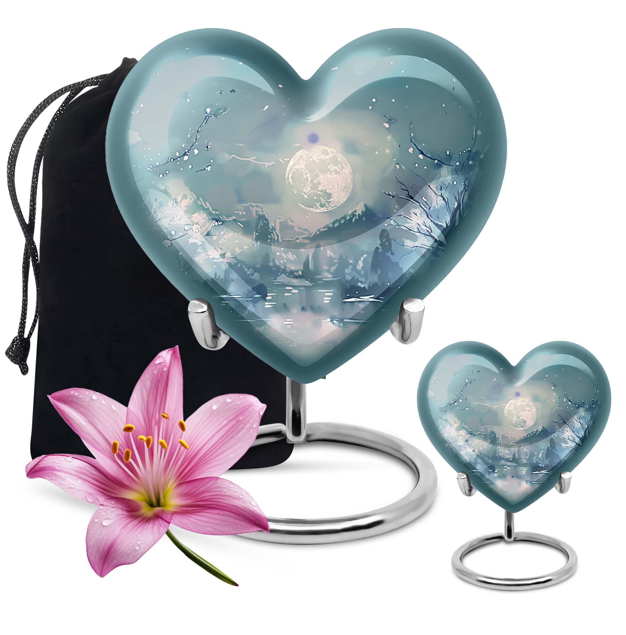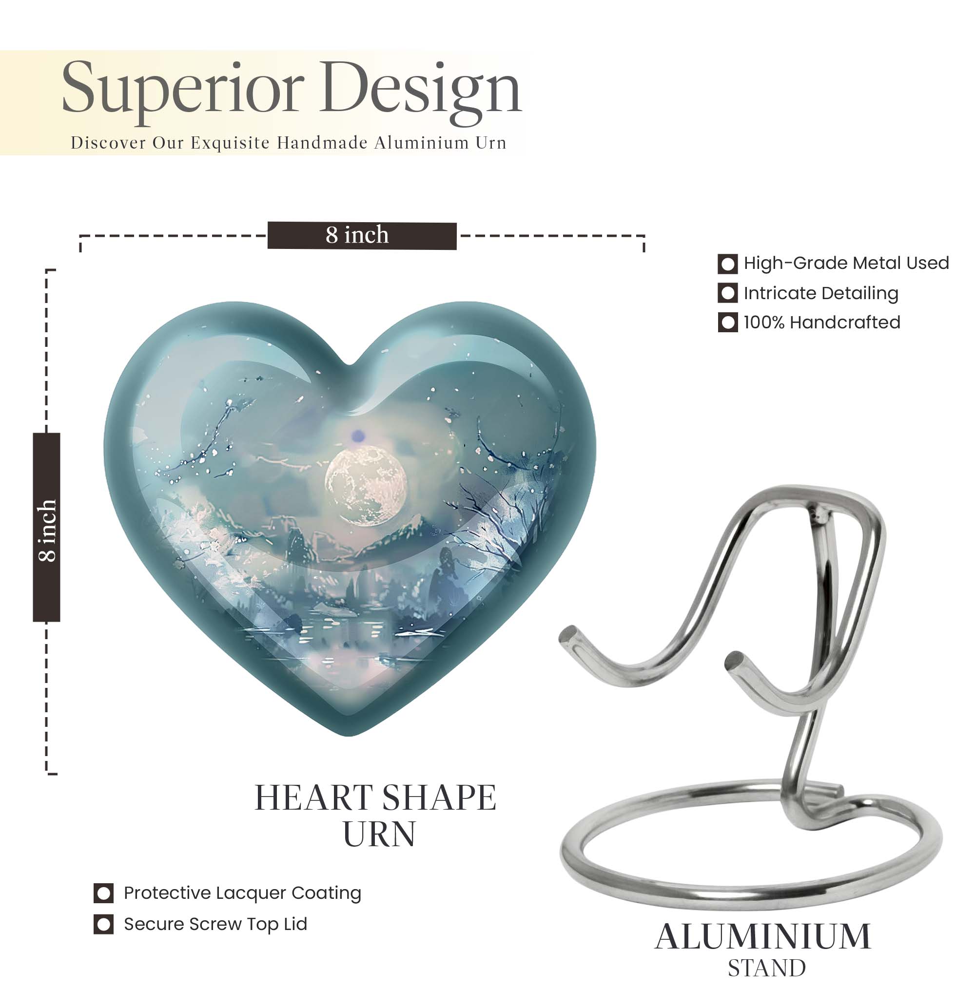 Presenting a distinctive Lunar Urn, specifically constructed for mature adults, this exceptional piece is an elegant choice for storing the ashes of your departed loved ones. It's not just a burial cremation urn; it's a heart-shaped keep-sake of love and memories. With its substantial size of 10 inches and a capacity of 200 cubic inches, this Urn is suitable for both men and women, perpetuating their presence. Made of sturdy aluminum, it weighs 3.3 pounds. The abstract theme caters to an aesthetic choice that transcends the gender barrier. The package comes complete with a velvet pouch for secure and dignified containment of ashes. We also offer the option to personalize this large urn with engraved names, facilitating a profound, lasting connection with your loved one. While avoiding the typical jargon, this Lunar Urn is an extraordinary pick among memorial urns designed with heartfelt affection.