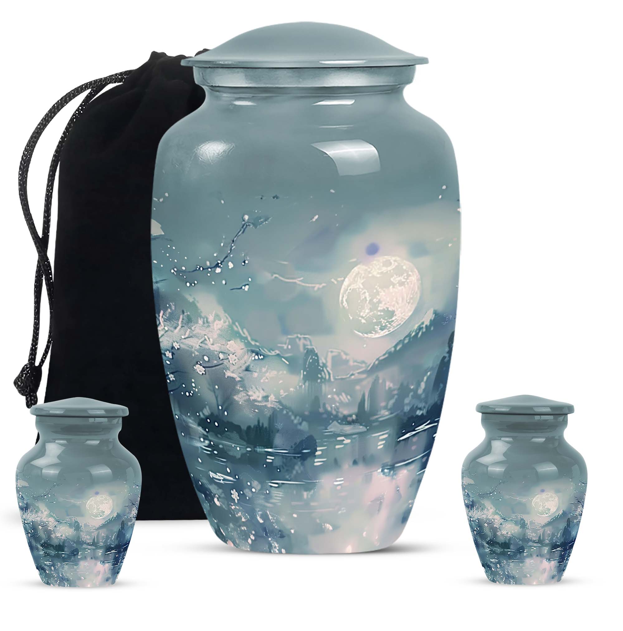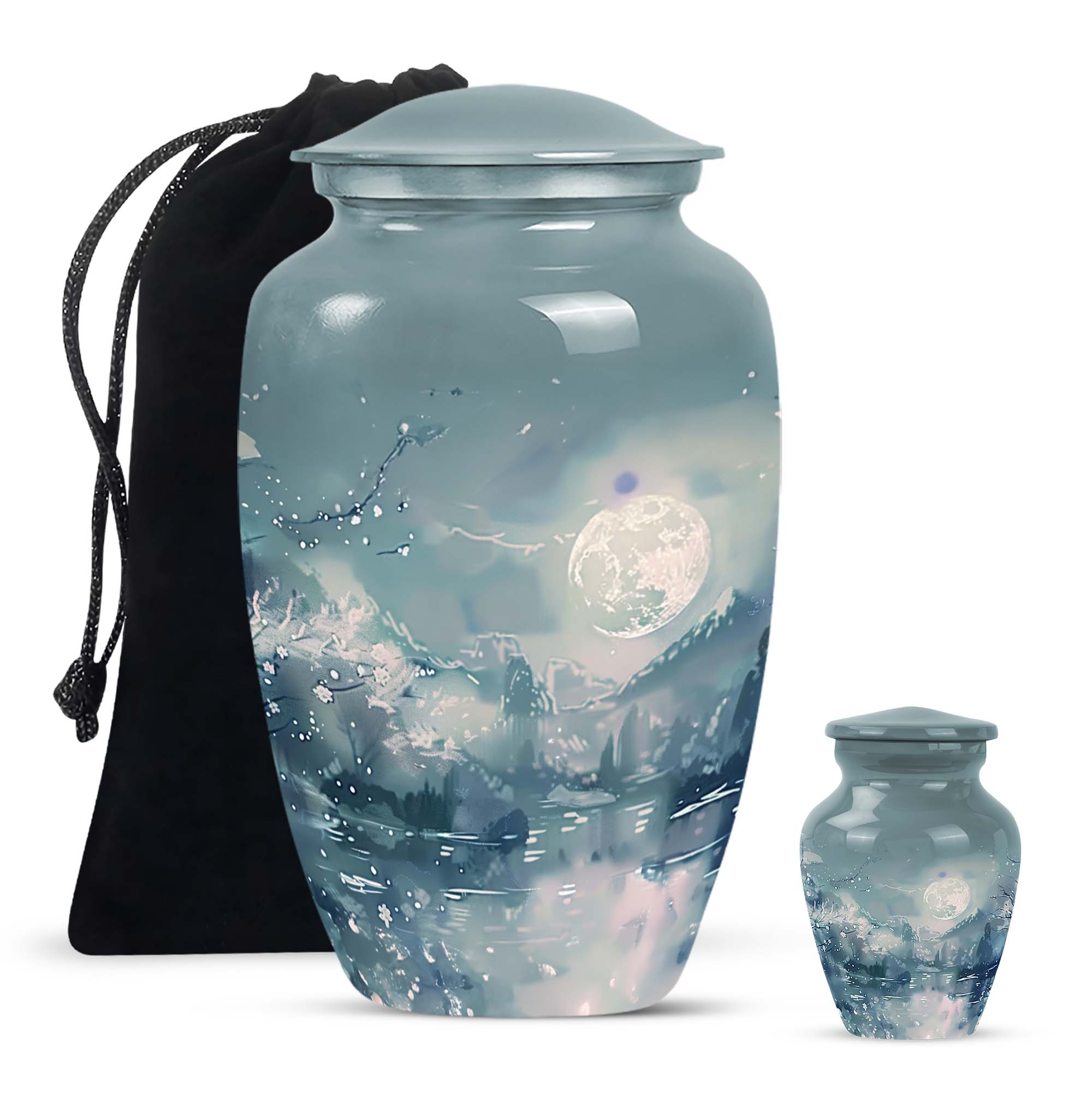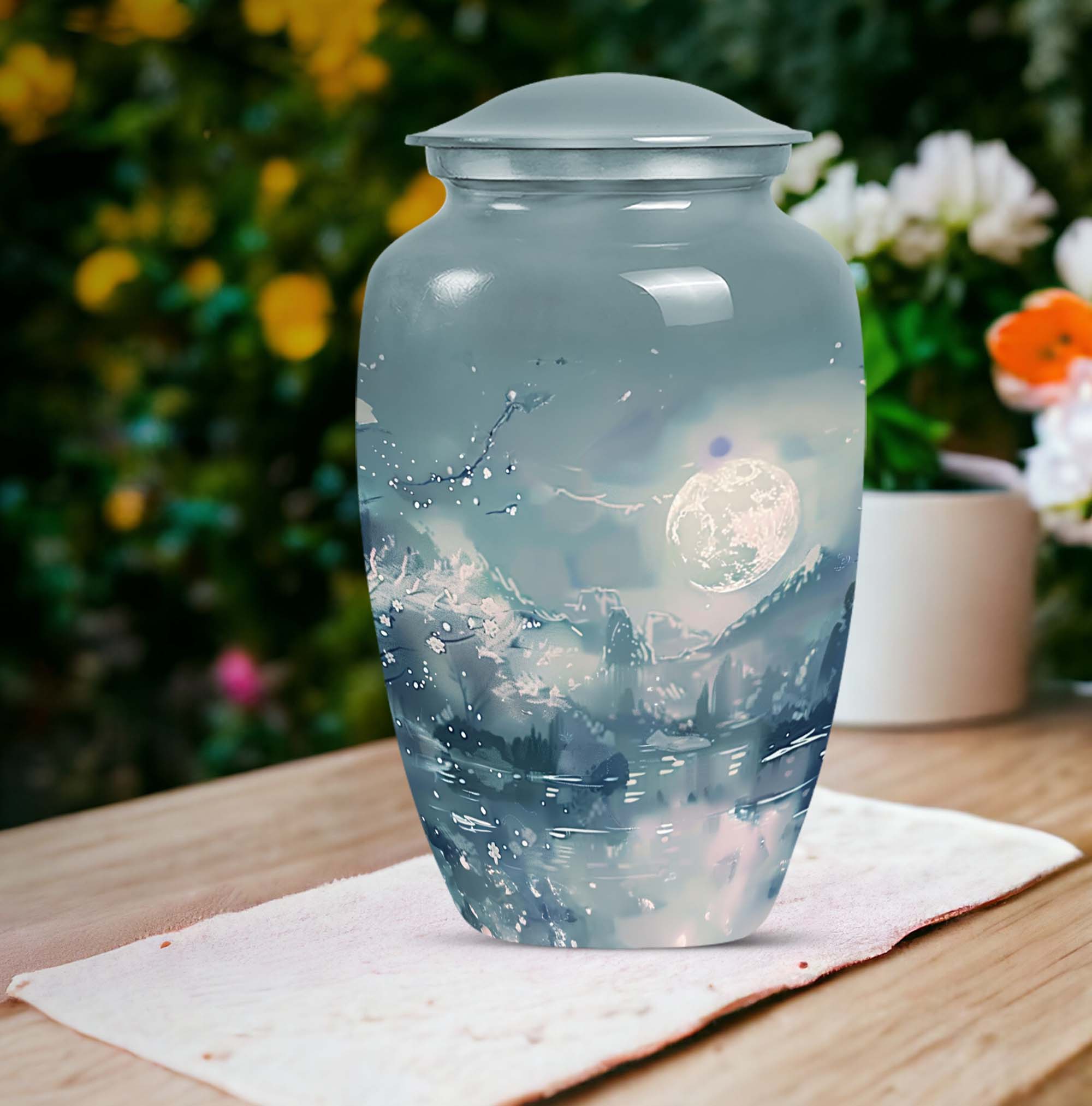 Illuminate the memory of your loved ones with our Lunar Urn, an exquisite choice among burial cremation urns tailored for women and men alike. This 10-inch, meticulously crafted large urn is presented in an abstract theme, reflecting a dignified and timeless tribute. Made from resilient and lightweight aluminium, the urn weighs a moderate 3.3 pounds making it convenient for positioning or relocation. Impressively, our Lunar Urn holds up to 200 cubic inches of ashes, suitable for adult use. Encased with your purchase is a complimentary velvet pouch, thus offering a tasteful, secure containment for the ashes. For a more intimate touch, buyers also have the option to personalize this keepsake with engraved names; a sentimental mark of remembrance. Whether you're considering cremation urns for men or women, this Lunar Urn is a vast option for those seeking a special memorial piece.