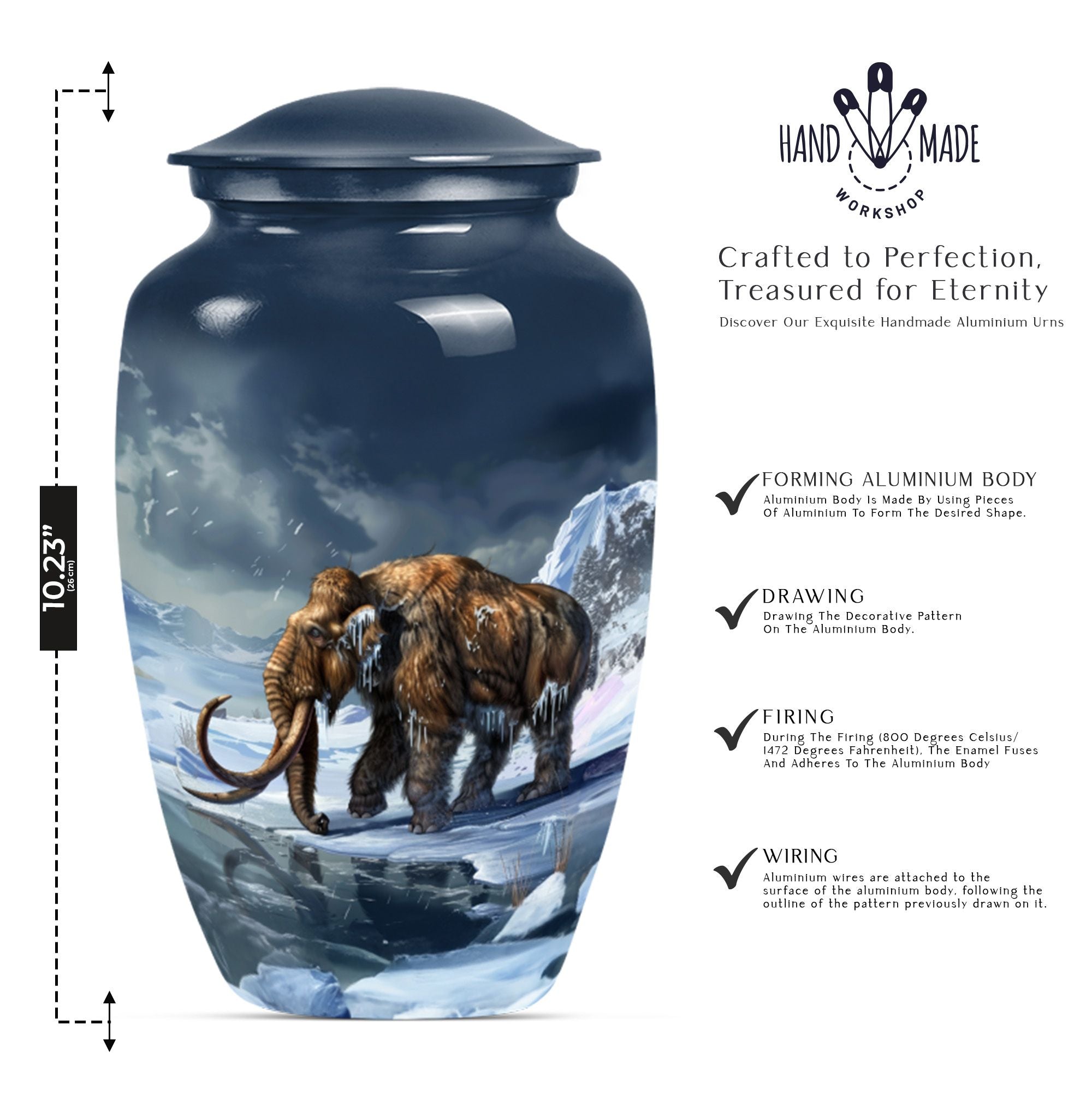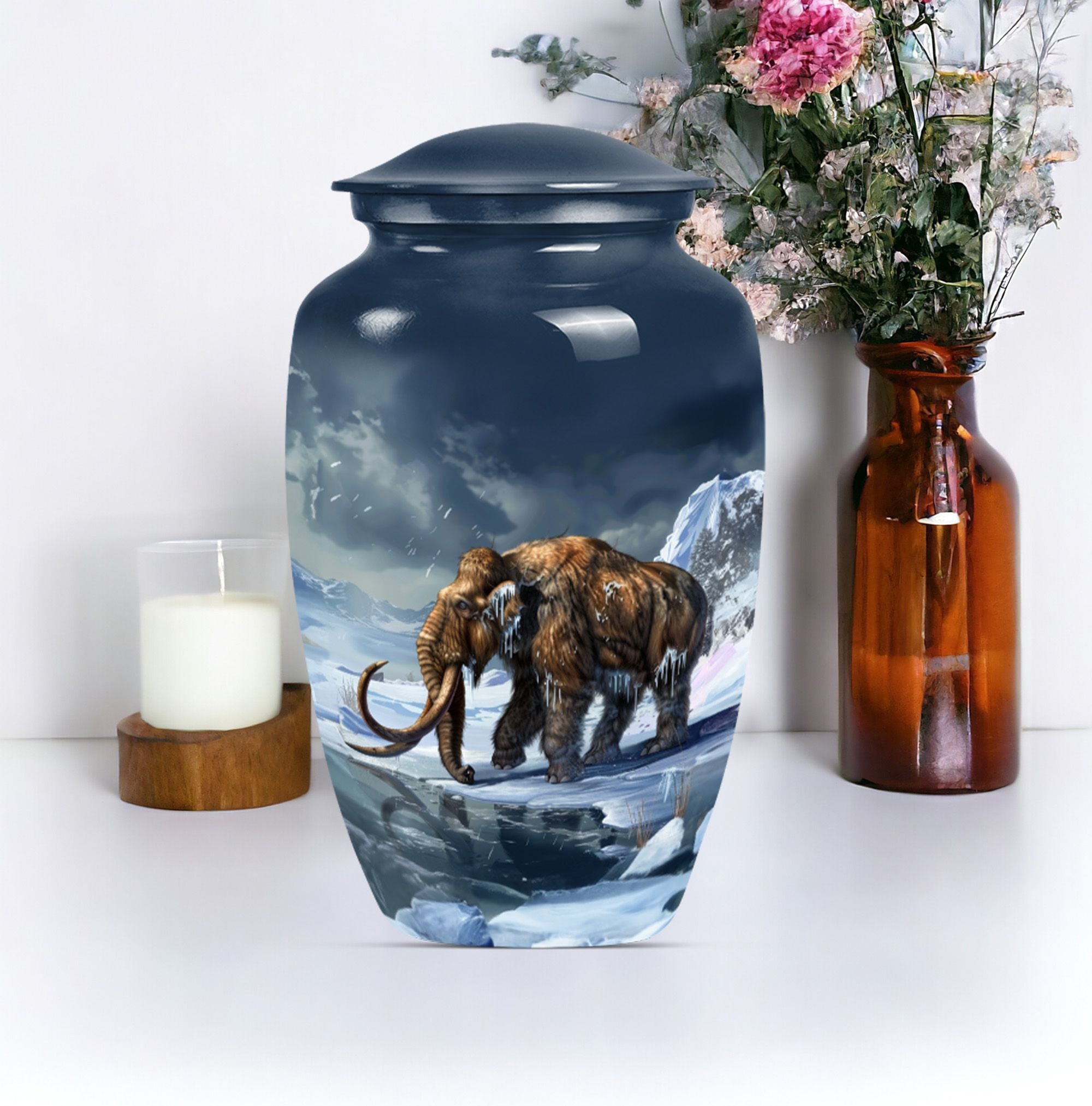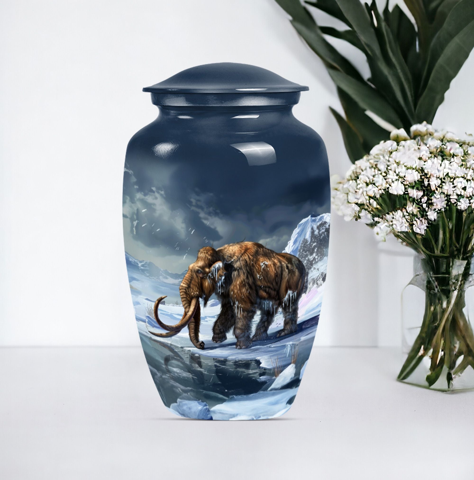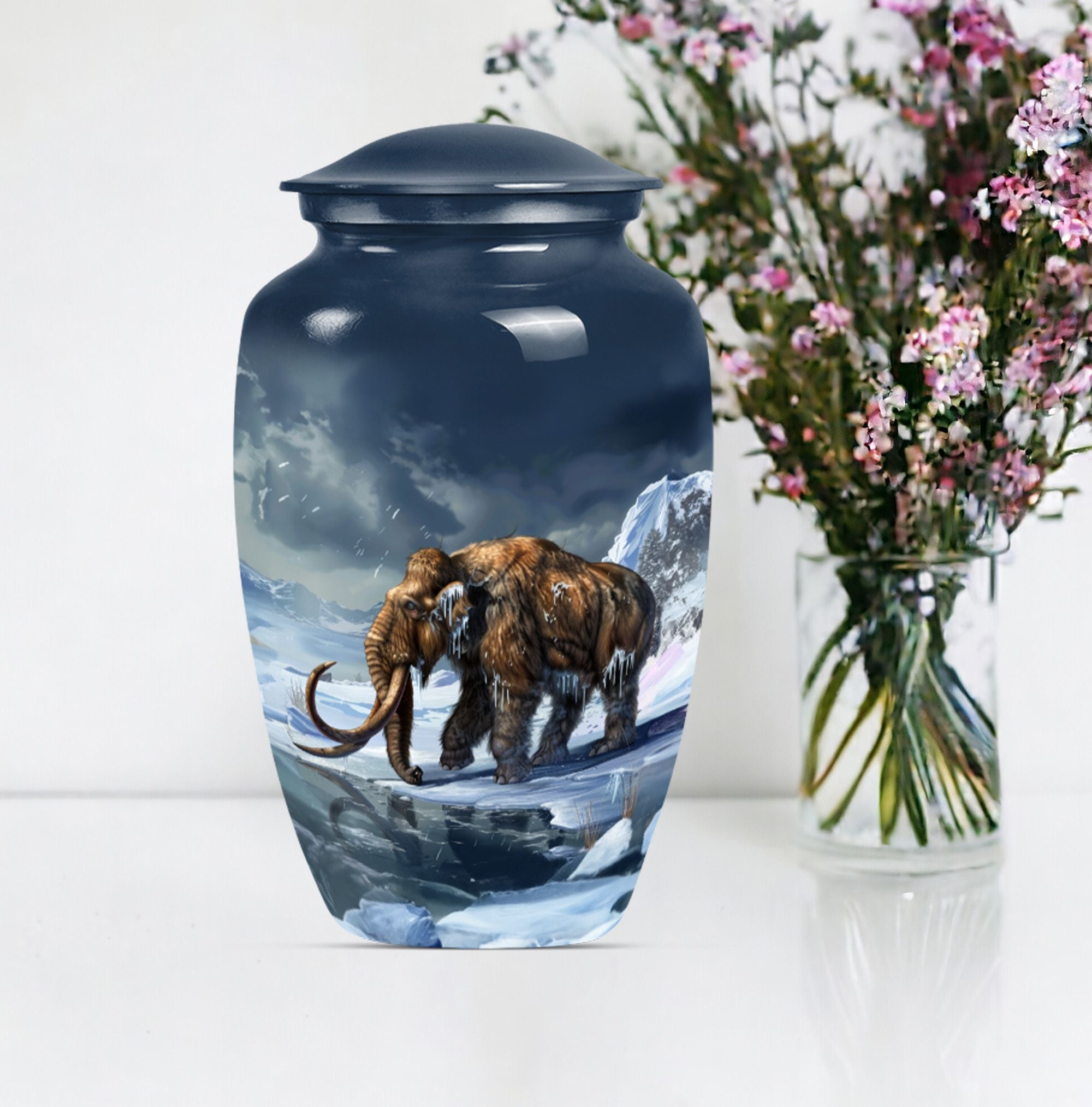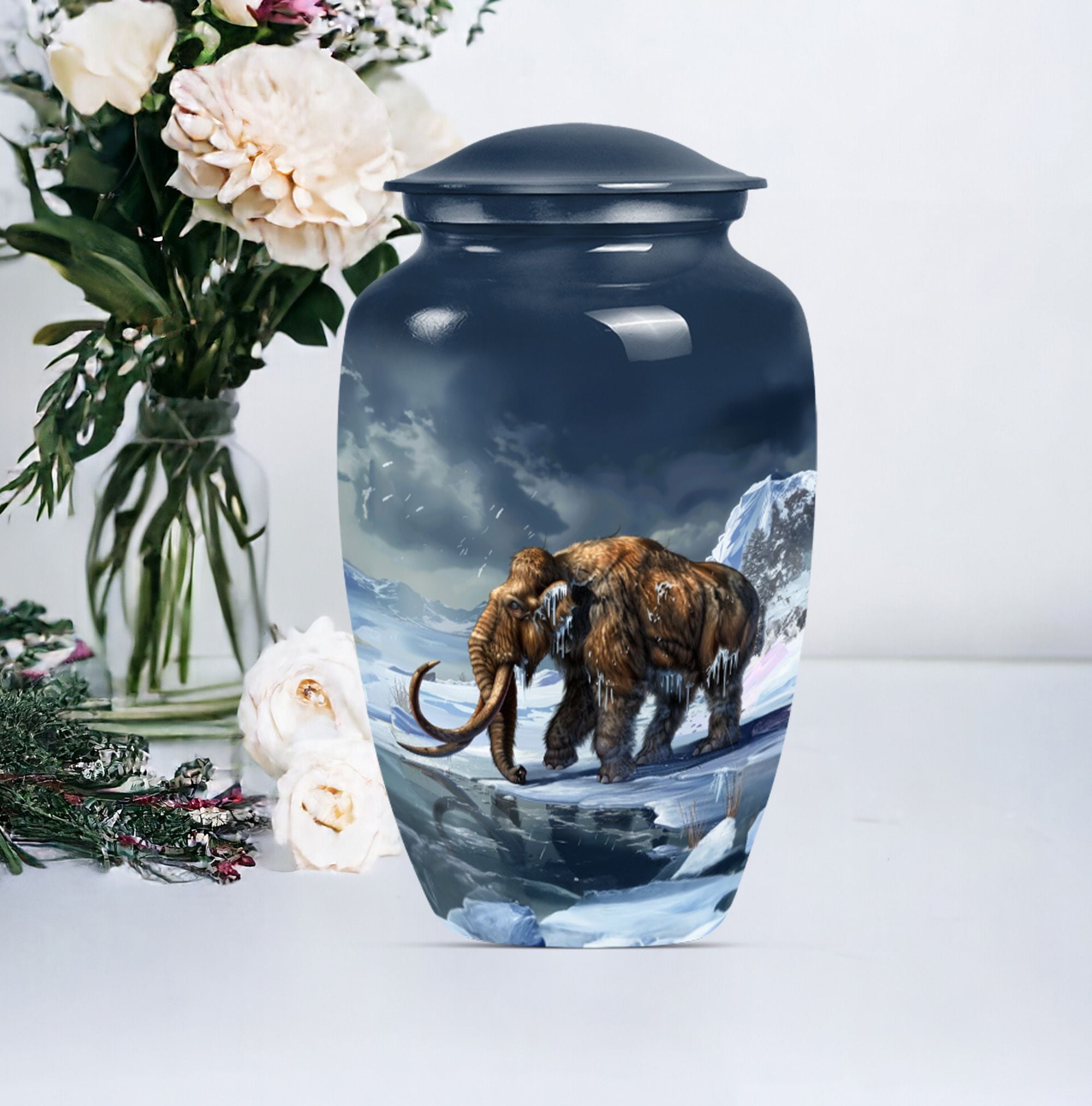 Carry the dearly departed's memory forward with our dignified mammoth Urn, a peaceful dwelling for funeral ashes. This cremation urn, standing at 10 inches, is unique in its kind. It provides a capacious 200 cubic inches space to safely enshrine the remains of your precious seniors. Made from high-grade aluminium, it brings weight and durability — 3.3 pounds of long-lasting peace. This large urn features a floral theme, a touching tribute to life's perennial renewal amidst impermanence. Its classic appeal is amplified by the ability to personalize; we invite you to engrave names and transform it into an eternally cherished memorial. Included in the package is a velvet pouch for the empathetic containment of ashes, ensuring your tokens of love and respect have the grace they deserve. A singular blend of elegance and solace, such metal urns for adult human ashes are uncommon pieces of art. Incredible, isn't it? This urn is much more than a box; it's a remarkable symbol of remembrance, a gentle whisper of eternal love.