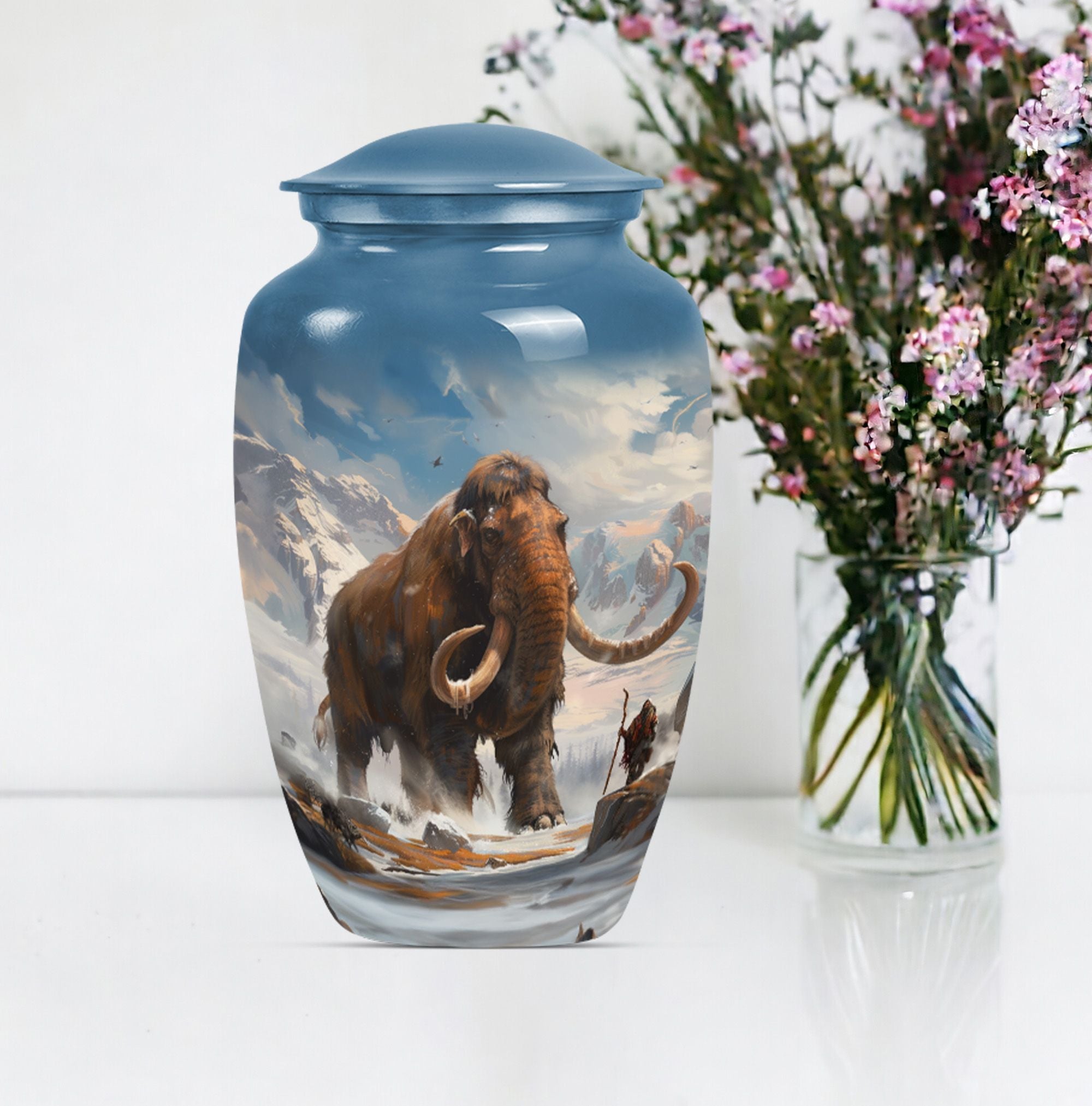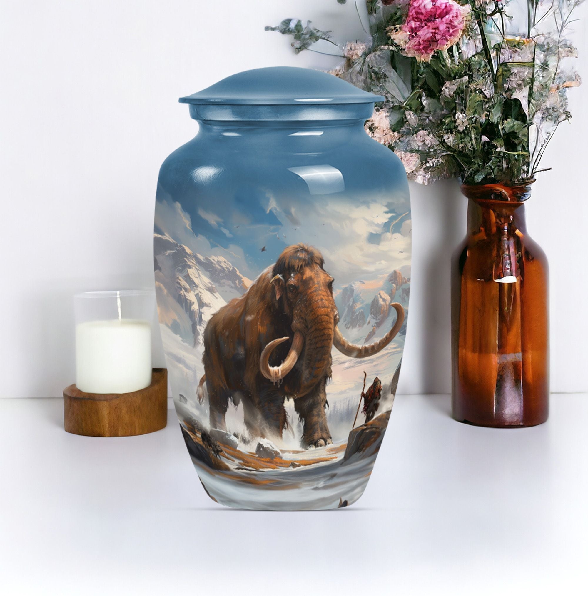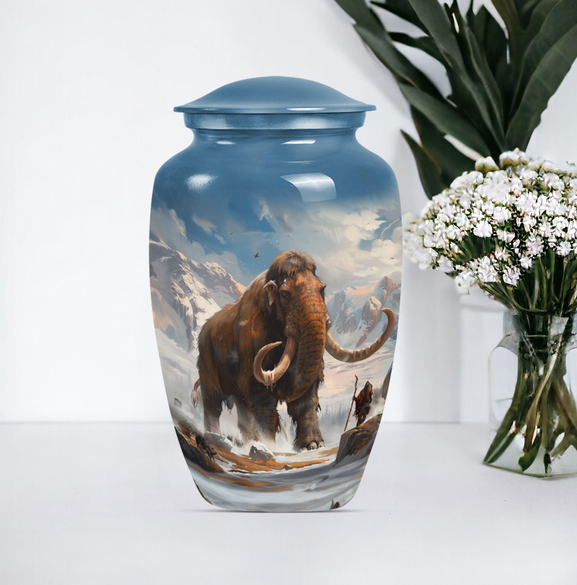 Discover a timeless way to honor your loved one with this exquisite mammoth urn. This large urn, measuring 10 inches in height, is delicately crafted from sturdy, high-quality aluminium, giving it a substantial weight of 3.3 pounds. Thanks to its capacity of 200 cubic inches, this cremation urn can respectfully contain a substantial amount of ashes. The package includes a velvet pouch, providing a soft, dignified containment for the ashes. Further adding to its uniqueness, this urn offers the option to personalize, with space for engraved names. Its theme features delicate flowers, stirring a sense of calm serenity, an invocation of the eternal cycle of life. Often sought after in the burial funeral cremation urns sphere, this cremation urn is an excellent choice for human ashes, be it adult male or female. Laden with elegance and solemn beauty, it can also serve as a decorative piece in your home. Experience a unique blend of reverence and art with this cherished keepsake.
