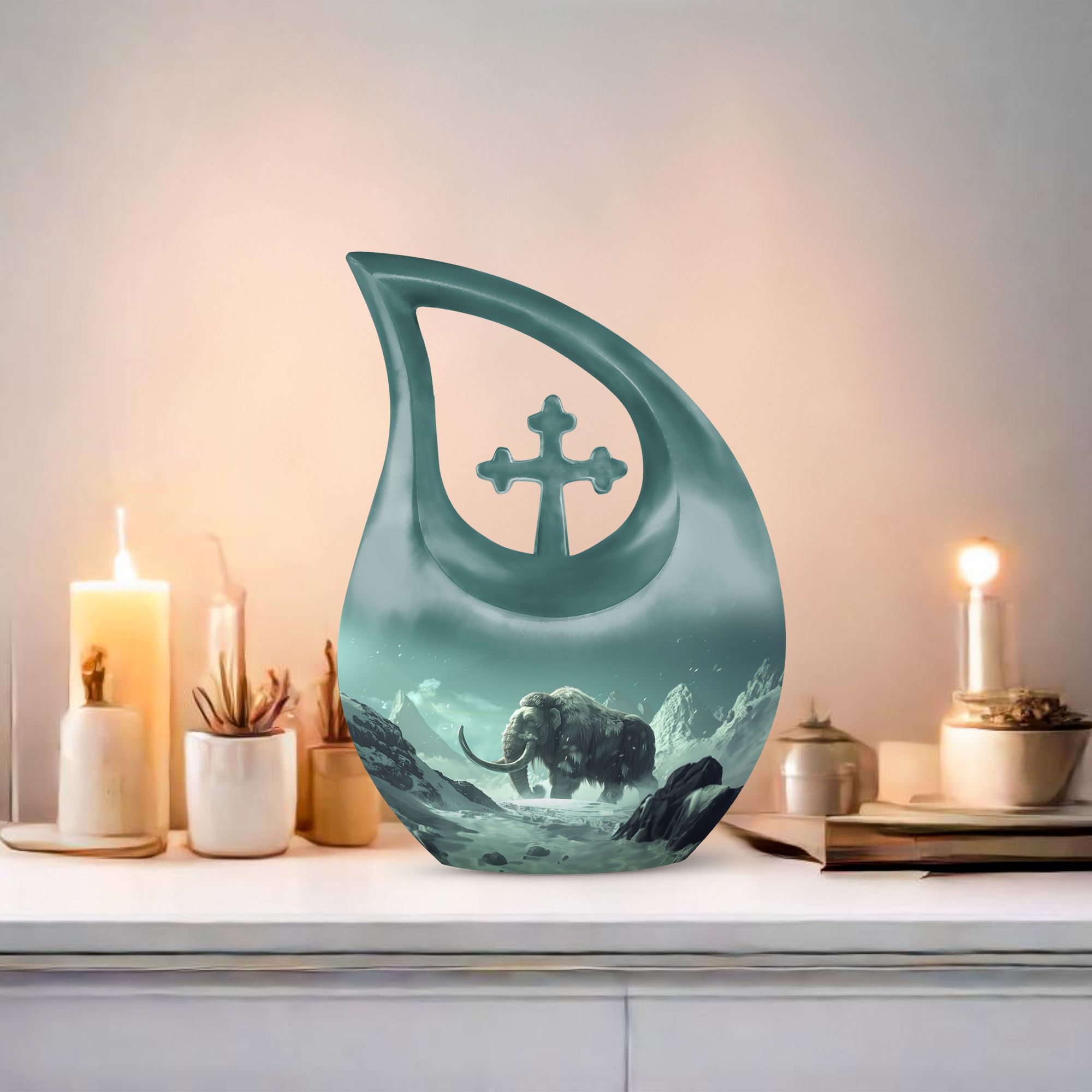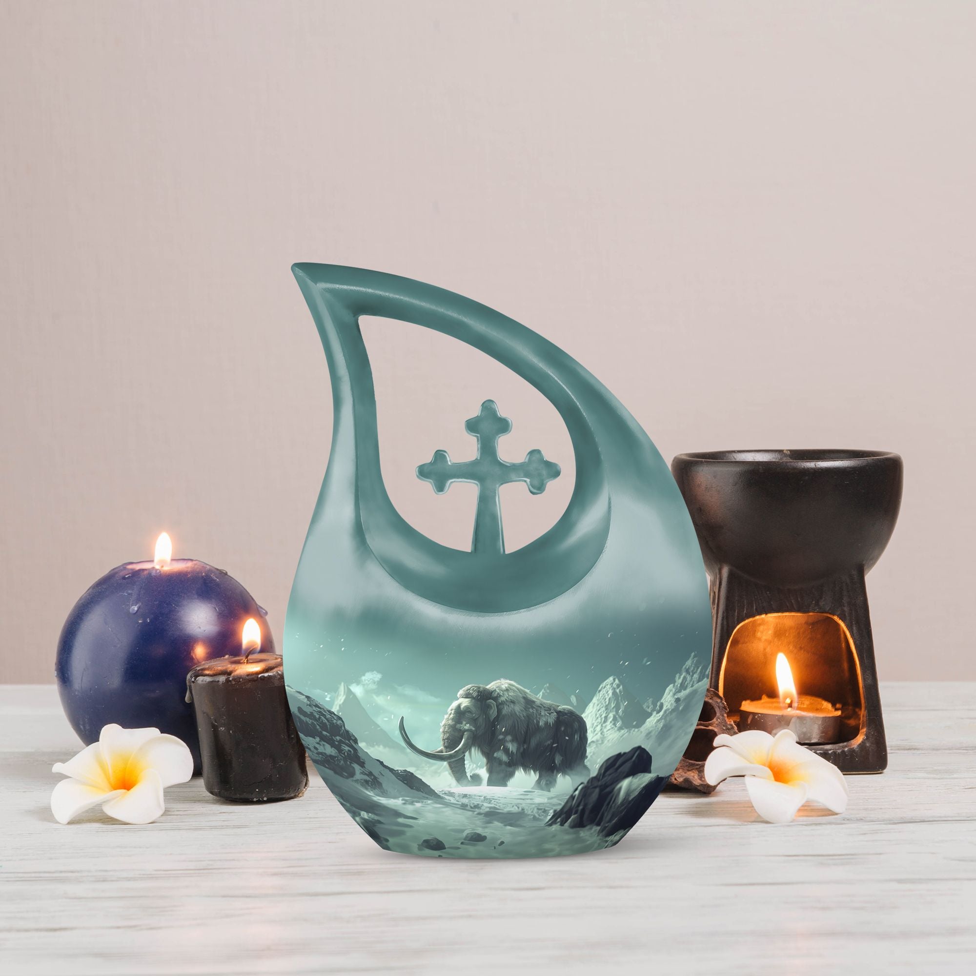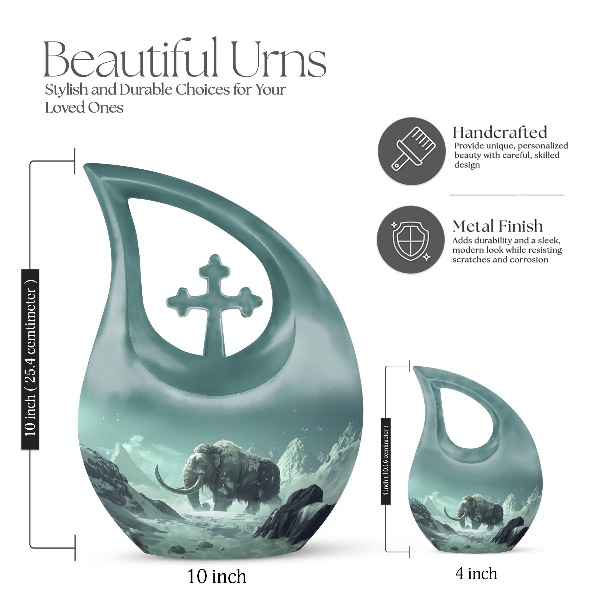 Embrace the eternal serenity with our 'Mamoth Urn', a ceremonially crafted large urn that speaks volumes of your admiration for the beloved. This dignified piece, cast from hard-wearing aluminium, is towering at a significant size of 10 inches which can house the memories measure up to 200 cubic inches. It gives a tangible form to your love, safeguarding the ashes within a plush velvet pouch. The exterior carries the somber aesthetics of a 'Cross Drop' theme, reassuring a peaceful resting place for your loved one. Furthermore, you can add a personal touch to this small cremation urn creating an immortal connection through engraved names. Despite its robust construction, it is convenient to handle with a weight of just 3.3 pounds. If you're exploring the cyber market for human urns, urn for mom, custom made urns, or distinctive butterfly urns for ashes, this elegantly crafted masterpiece could be the ideal choice. Commemorate the departed souls with a haven accommodating their spiritual essence, gravitating towards our 'Memorial Urns'.