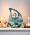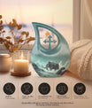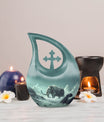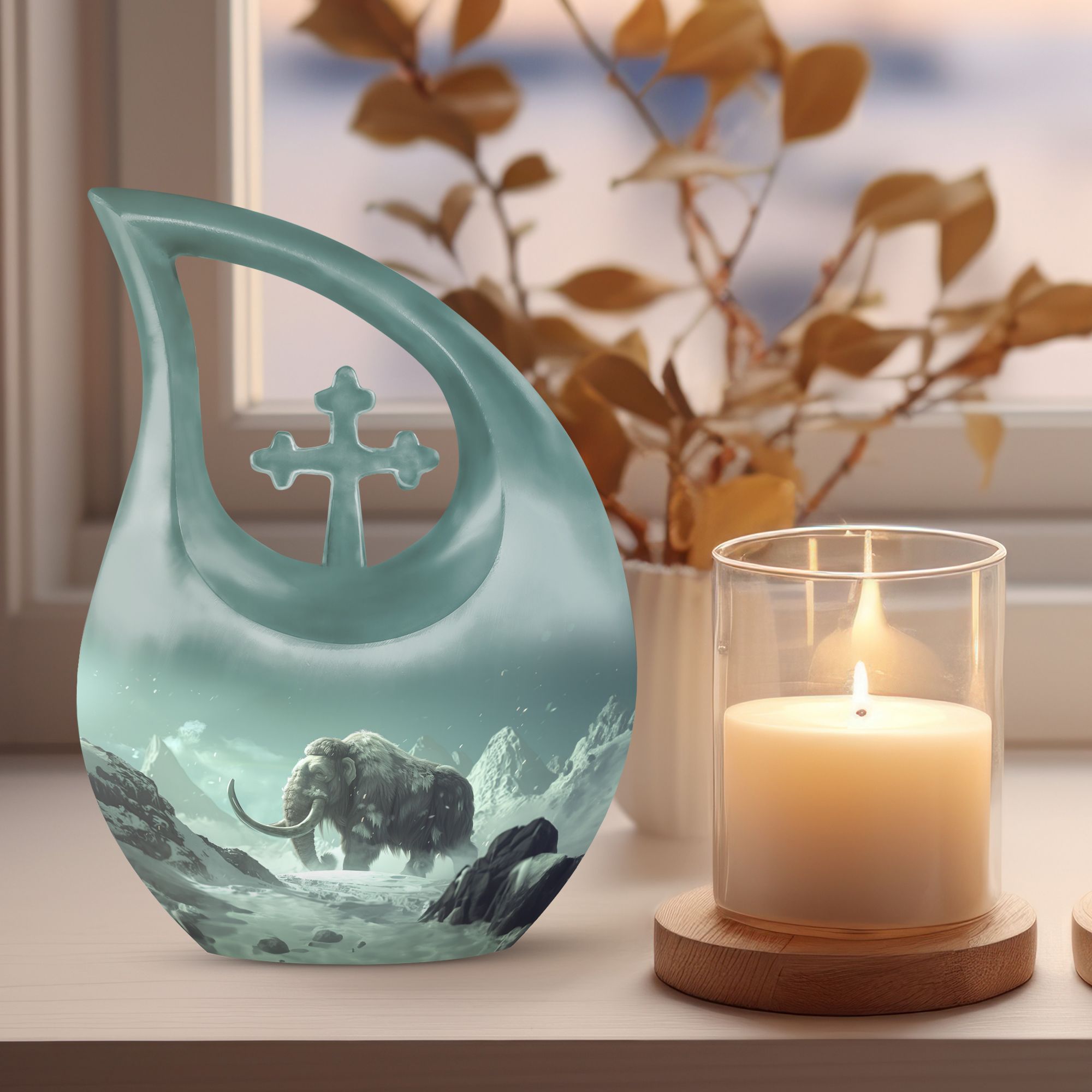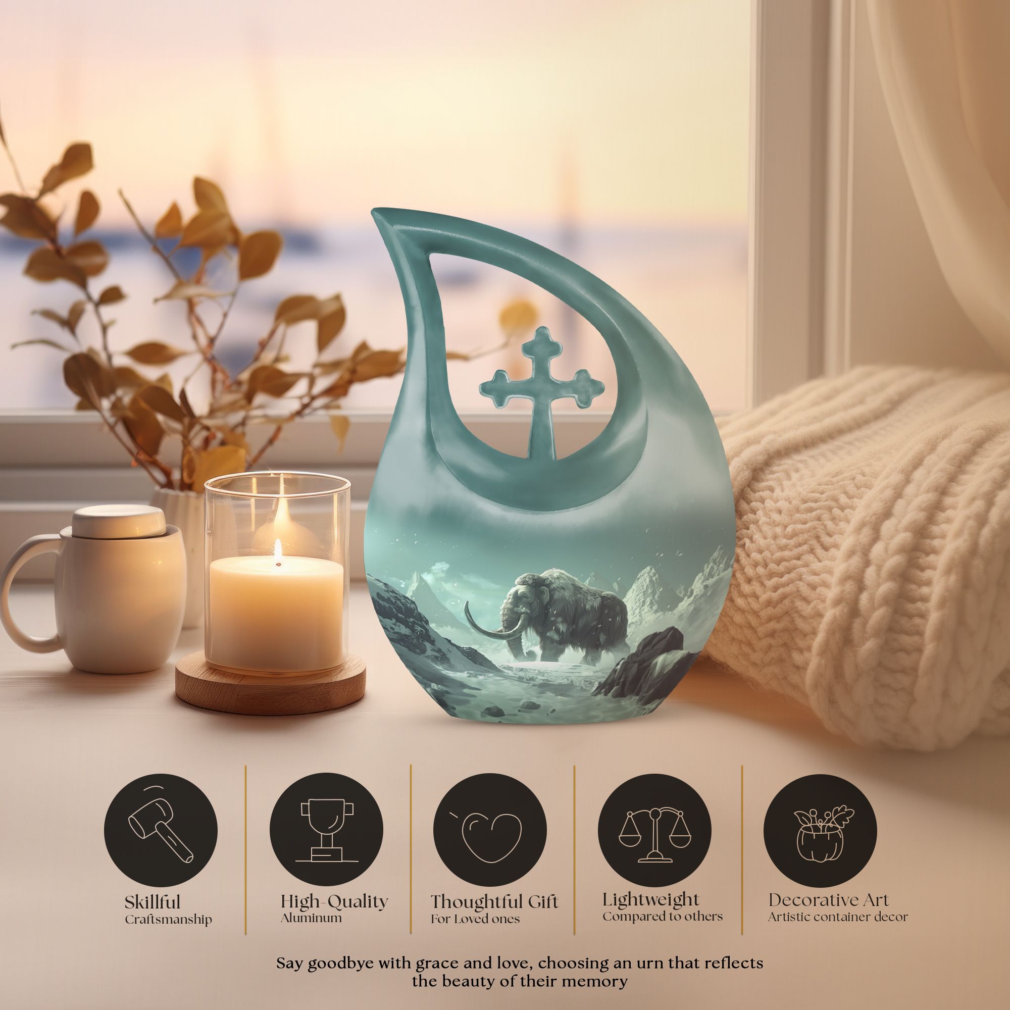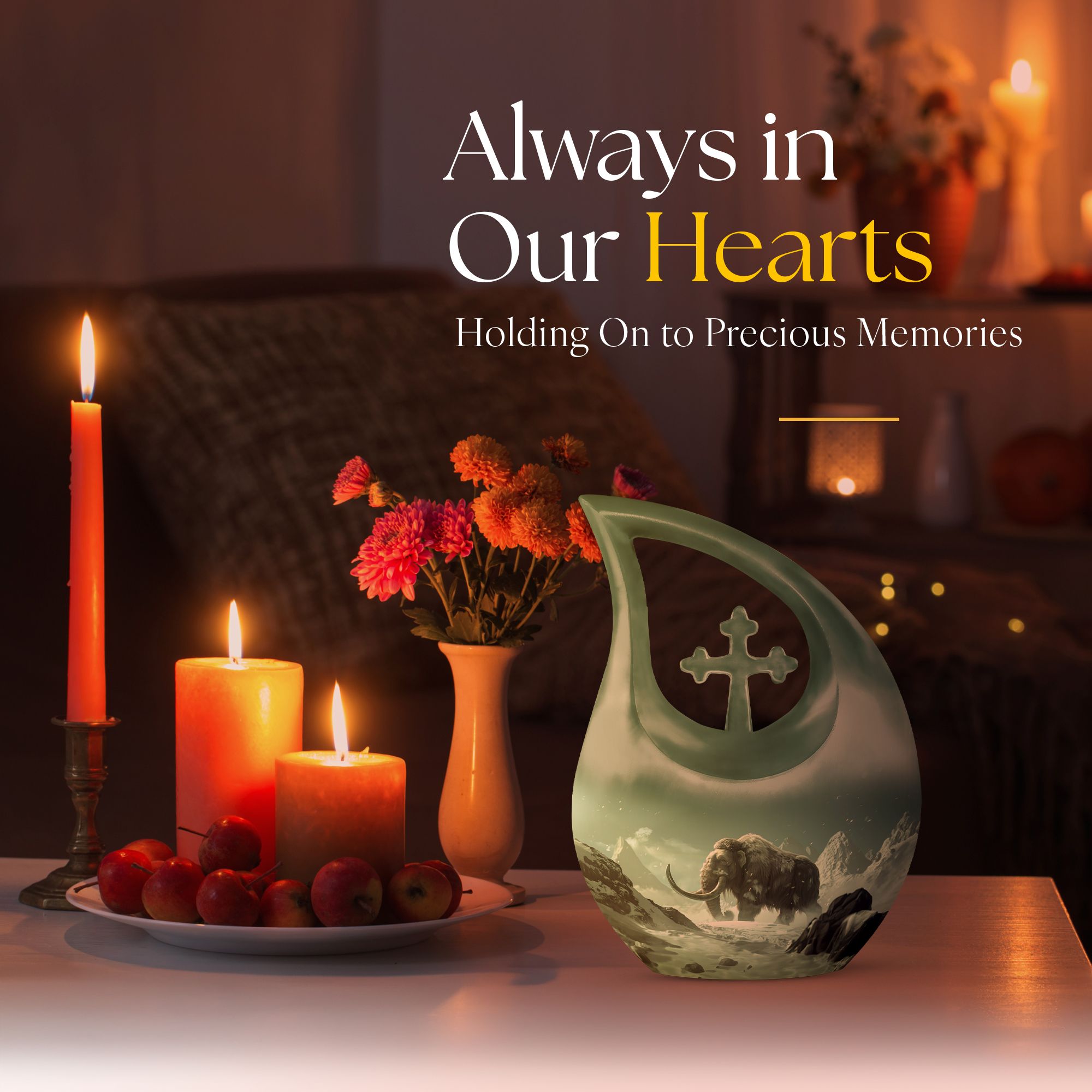 Embrace the eternal serenity with our 'Mamoth Urn', a ceremonially crafted large urn that speaks volumes of your admiration for the beloved. This dignified piece, cast from hard-wearing aluminium, is towering at a significant size of 10 inches which can house the memories measure up to 200 cubic inches. It gives a tangible form to your love, safeguarding the ashes within a plush velvet pouch. The exterior carries the somber aesthetics of a 'Cross Drop' theme, reassuring a peaceful resting place for your loved one. Furthermore, you can add a personal touch to this small cremation urn creating an immortal connection through engraved names. Despite its robust construction, it is convenient to handle with a weight of just 3.3 pounds. If you're exploring the cyber market for human urns, urn for mom, custom made urns, or distinctive butterfly urns for ashes, this elegantly crafted masterpiece could be the ideal choice. Commemorate the departed souls with a haven accommodating their spiritual essence, gravitating towards our 'Memorial Urns'.