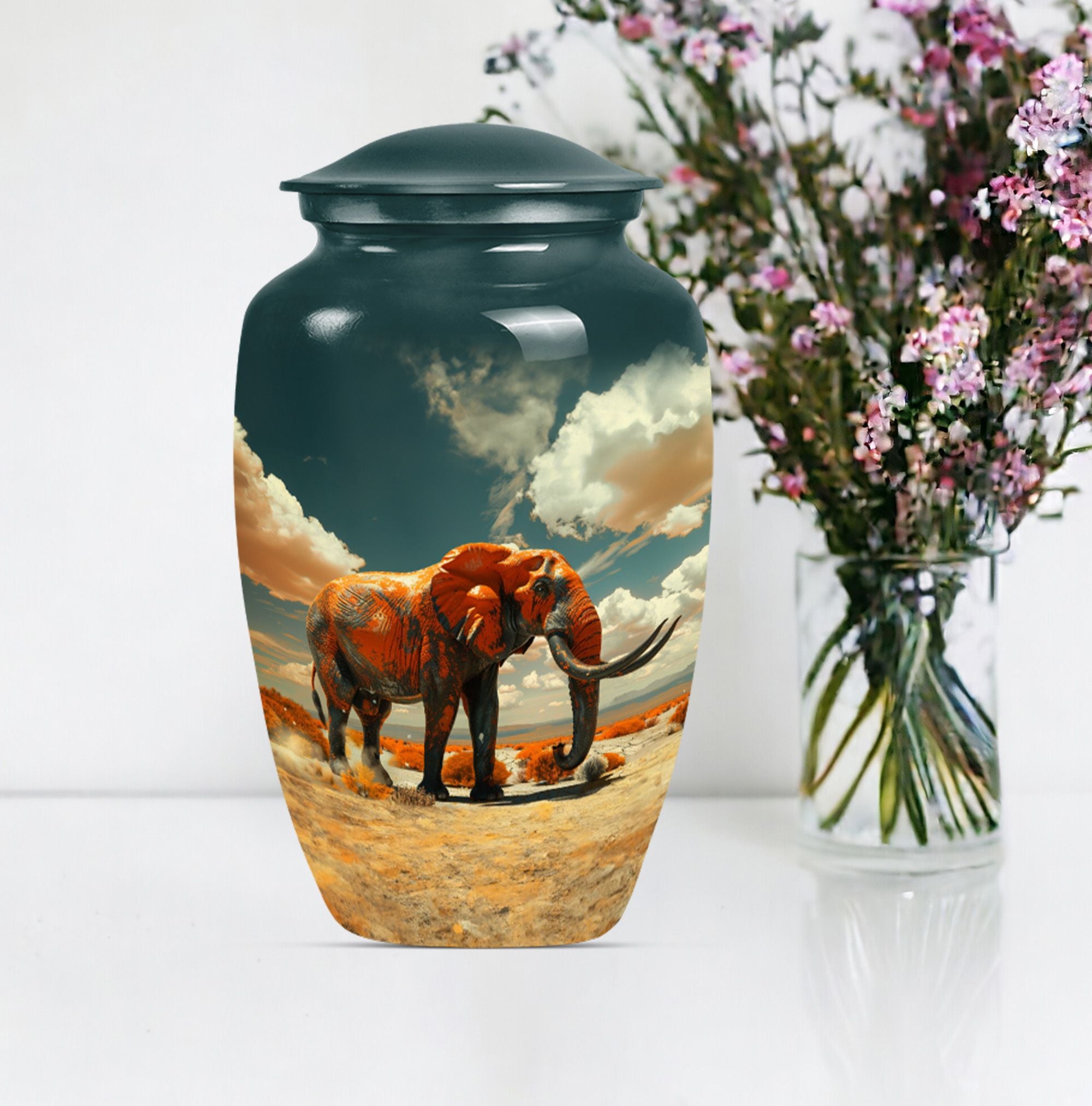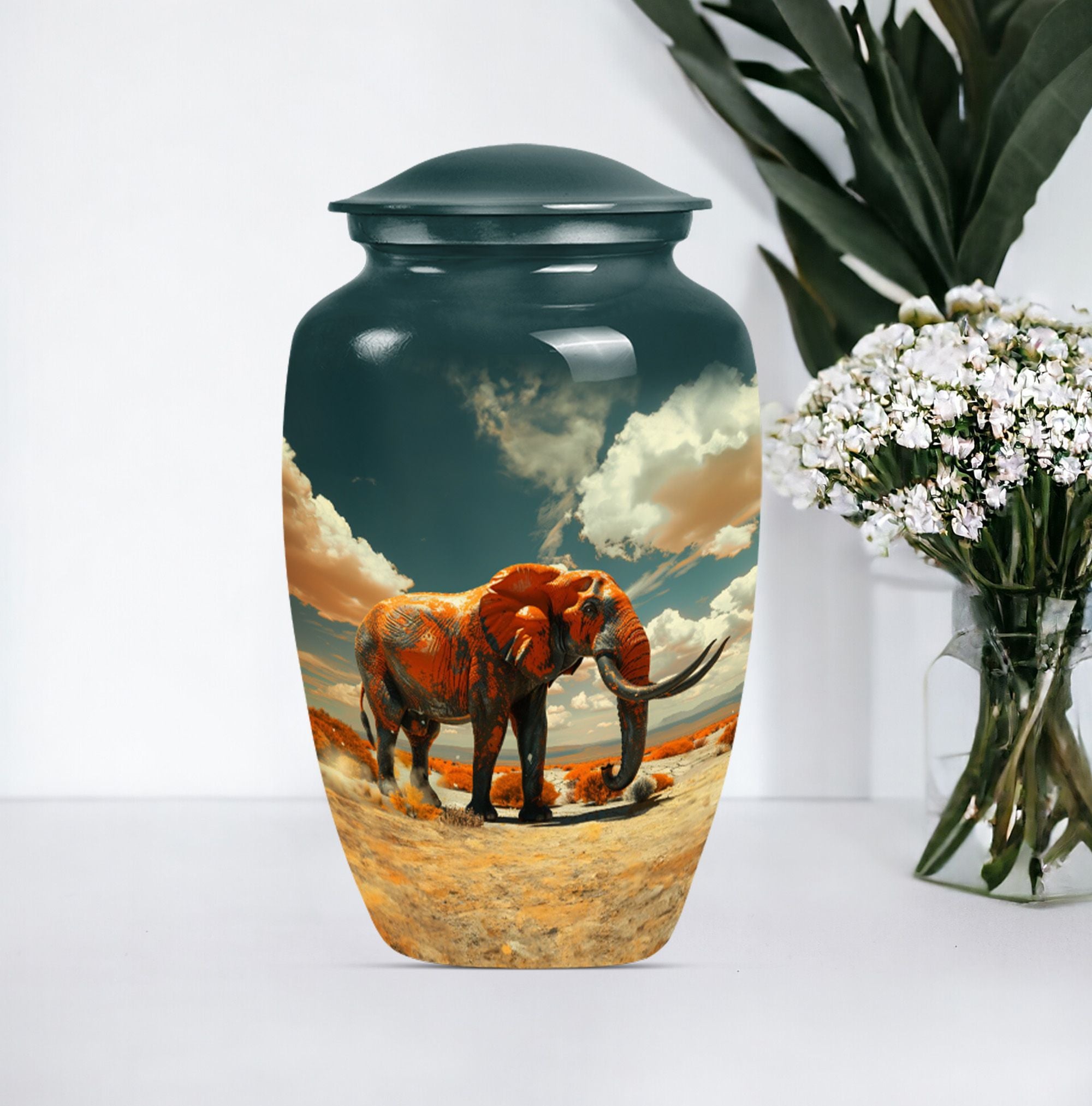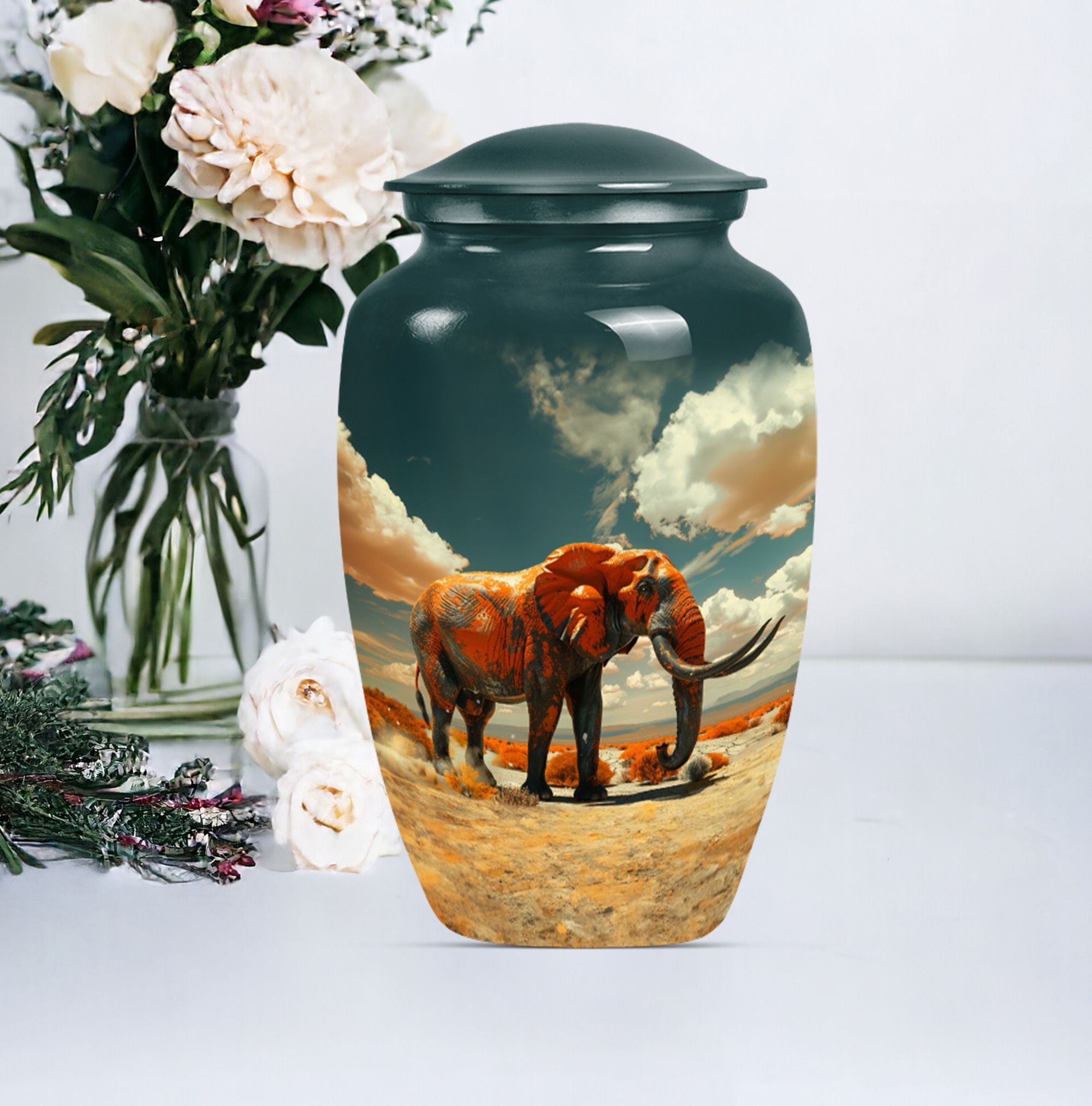 Presenting a profoundly dignified way to immortalize a beloved one - our 'Mamoth Urn'. This classic, large, 10-inch urn, embodies a floral theme and is a beautiful memorial forever urn. Skillfully crafted from robust aluminium, it guarantees long-lasting durability, weighing a sturdy 3.3 pounds. Our detailed craftsmanship ensures a capacity of 200 cubic inches, apt for the containment of adult human ashes. The urn comes accompanied with a velvet pouch for a respectful preservation of the remains. To enhance the personal touch, we offer to etch engraved names on it, building a deeper connection. Commonly sought by consumers, this funeral urn for human ashes adult or memorial urn, strikes the intricate balance between our need to remember and the beauty of letting go. Perfect for those searching for a uniquely dignified 'cremation urn' or 'human cremation urn'. So, celebrate and preserve the precious memory of a life well-lived with our Mamoth urn.