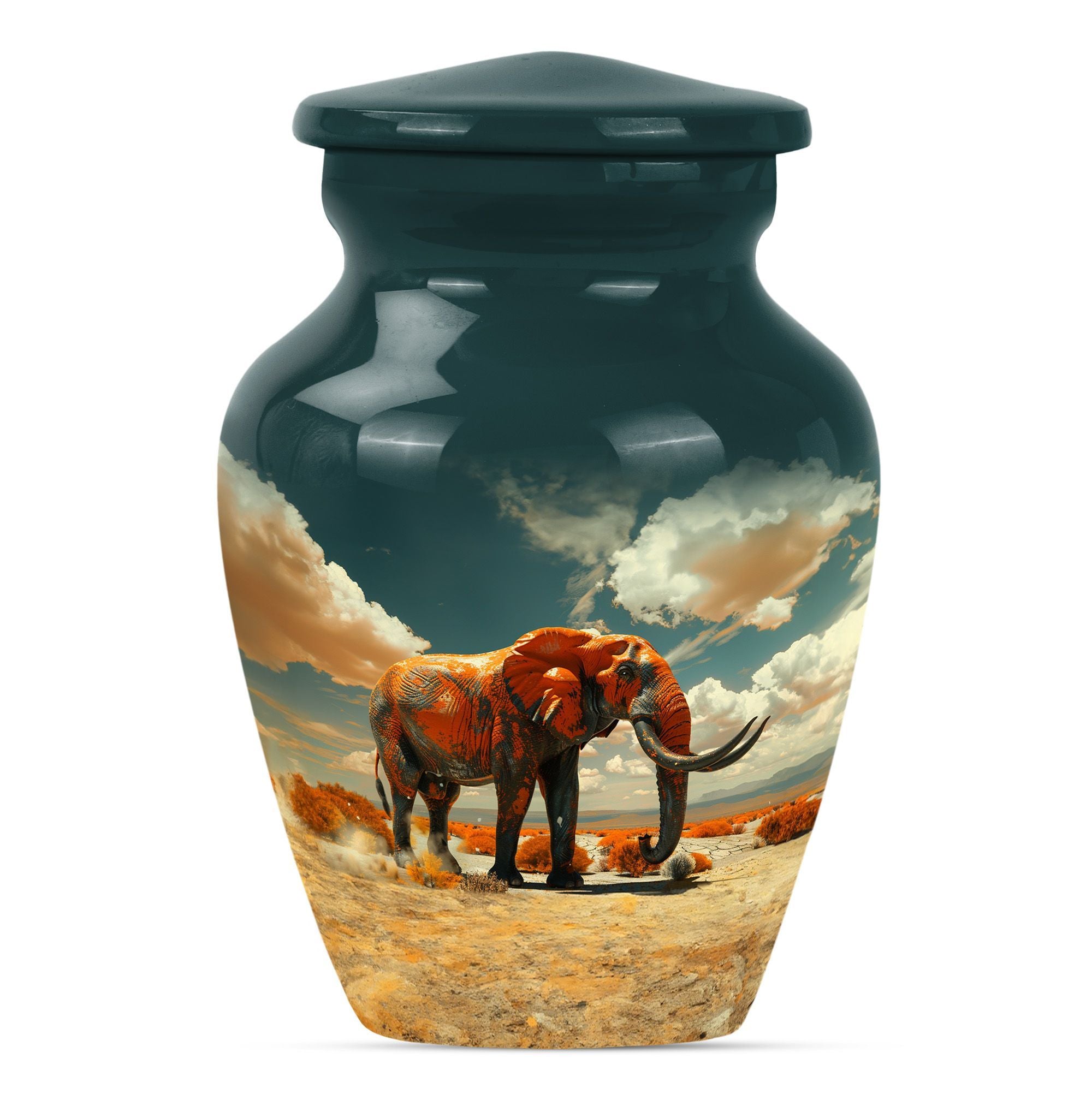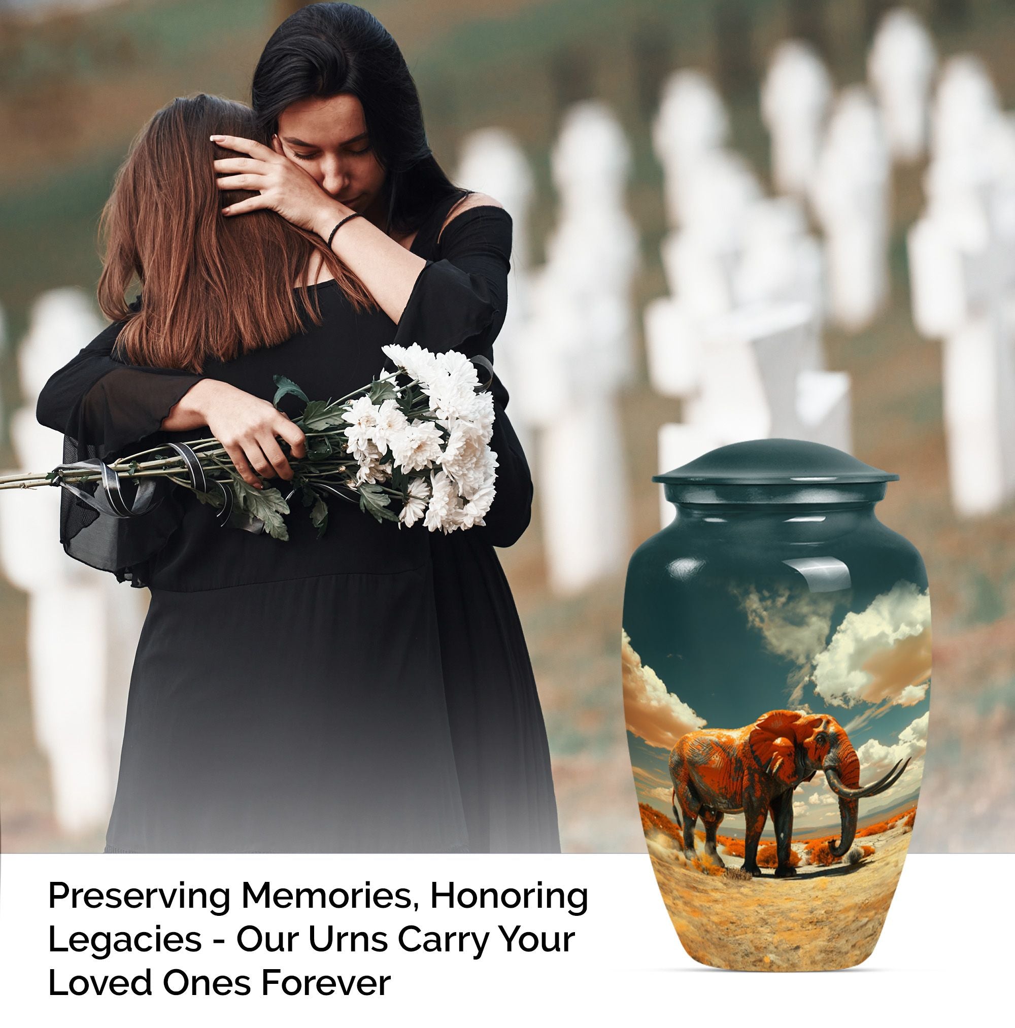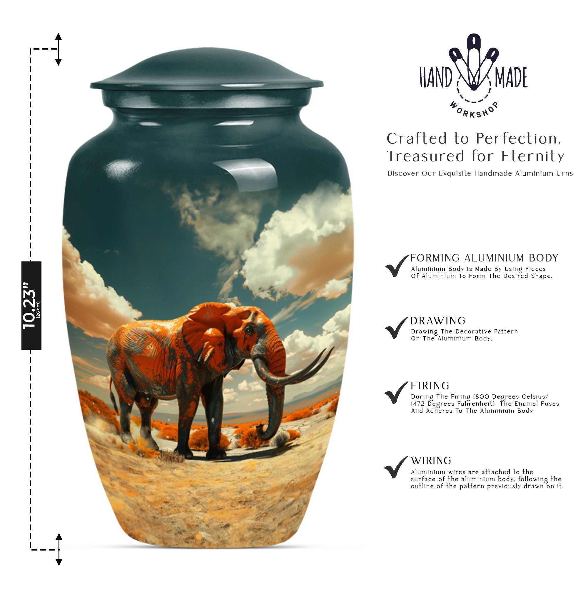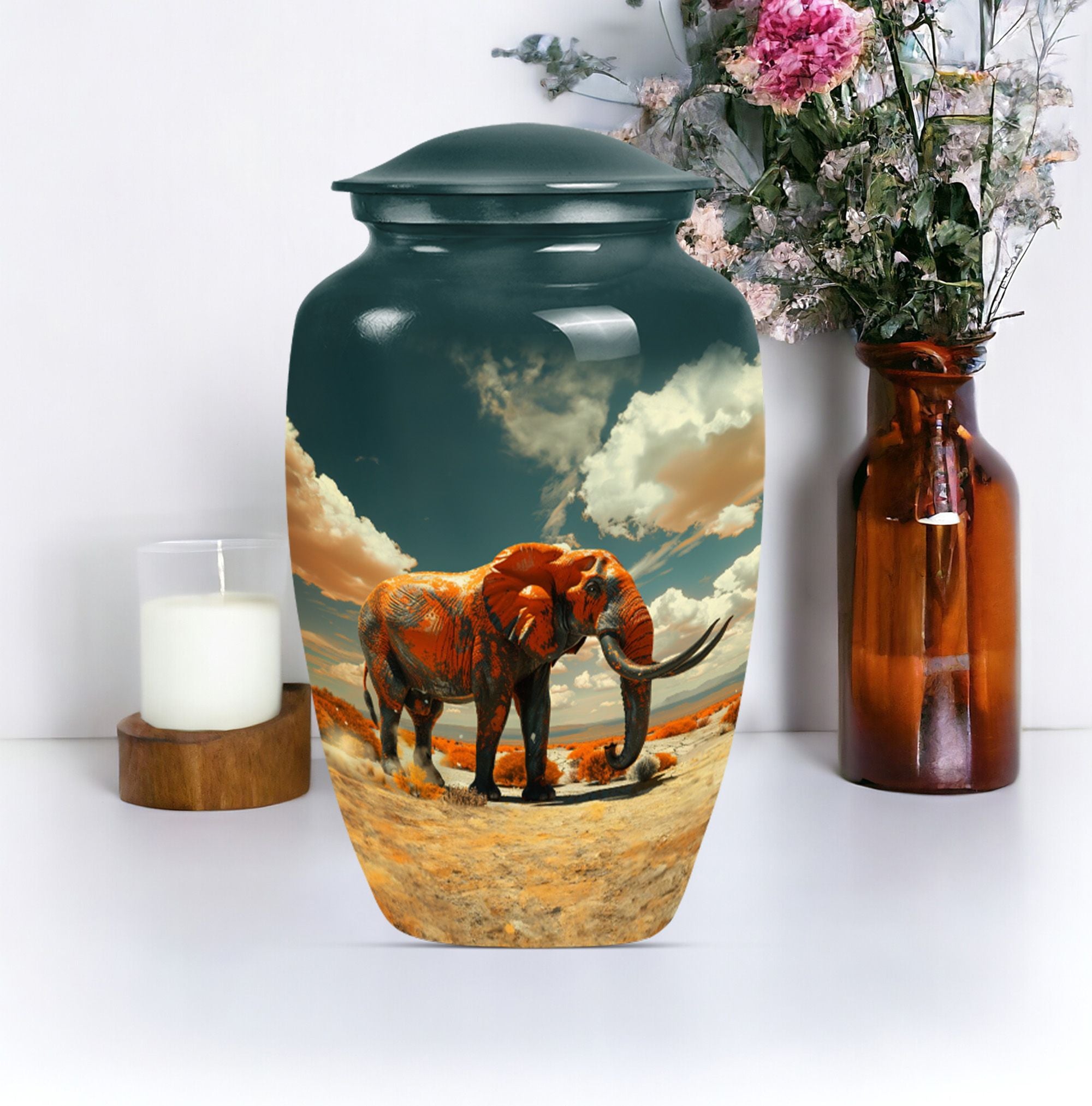 Presenting a profoundly dignified way to immortalize a beloved one - our 'Mamoth Urn'. This classic, large, 10-inch urn, embodies a floral theme and is a beautiful memorial forever urn. Skillfully crafted from robust aluminium, it guarantees long-lasting durability, weighing a sturdy 3.3 pounds. Our detailed craftsmanship ensures a capacity of 200 cubic inches, apt for the containment of adult human ashes. The urn comes accompanied with a velvet pouch for a respectful preservation of the remains. To enhance the personal touch, we offer to etch engraved names on it, building a deeper connection. Commonly sought by consumers, this funeral urn for human ashes adult or memorial urn, strikes the intricate balance between our need to remember and the beauty of letting go. Perfect for those searching for a uniquely dignified 'cremation urn' or 'human cremation urn'. So, celebrate and preserve the precious memory of a life well-lived with our Mamoth urn.