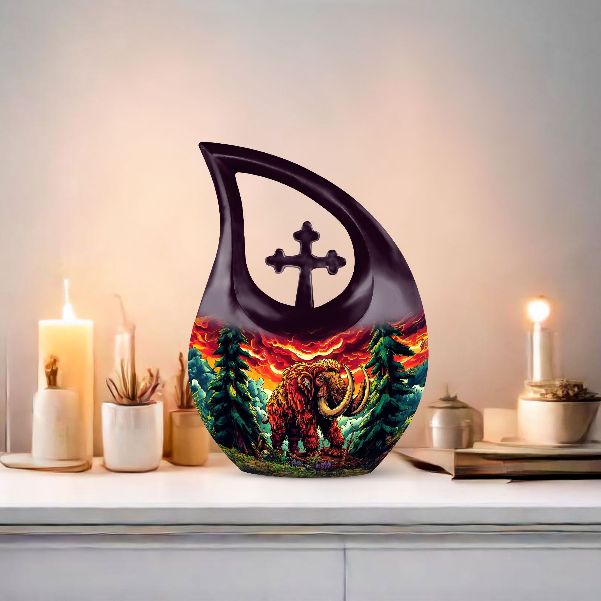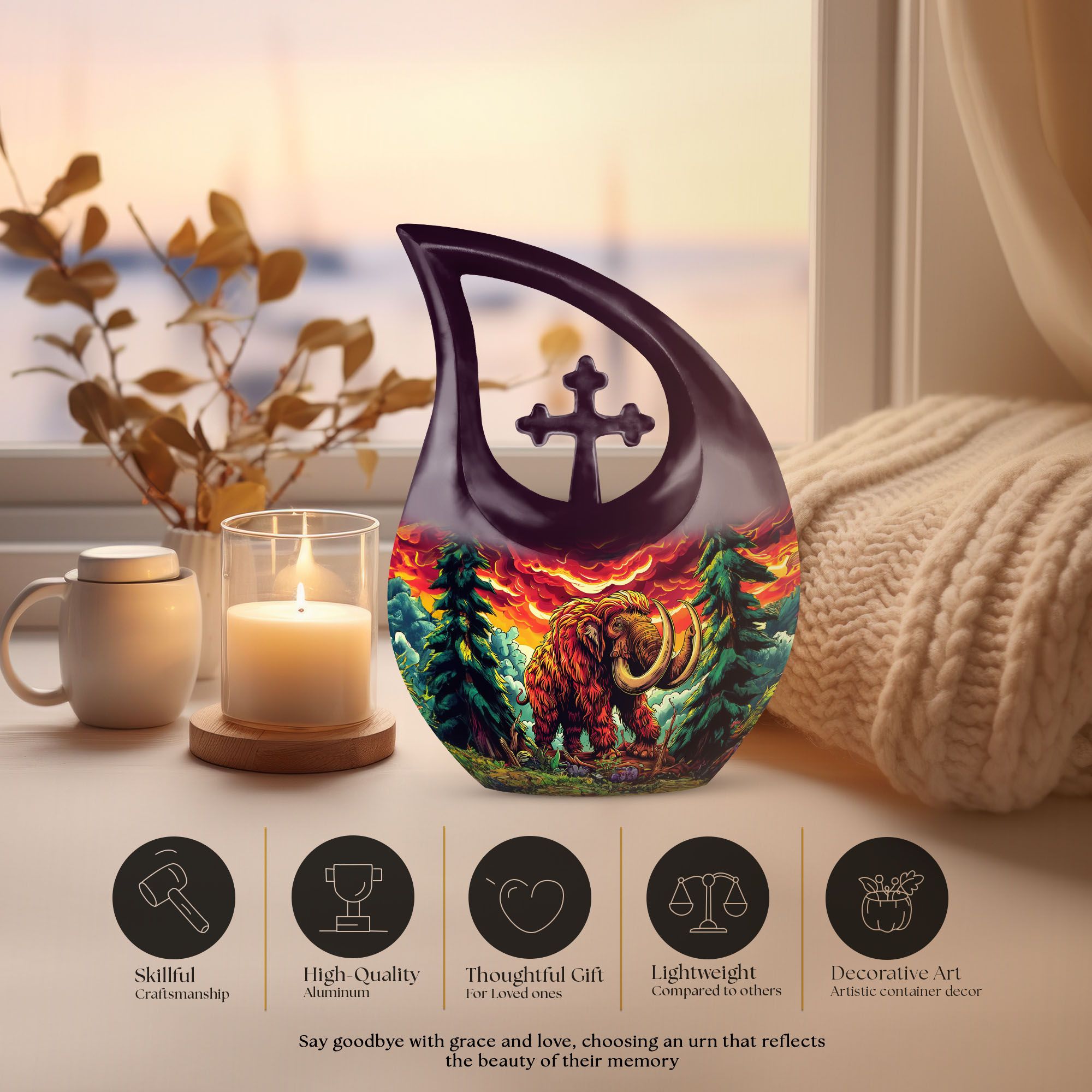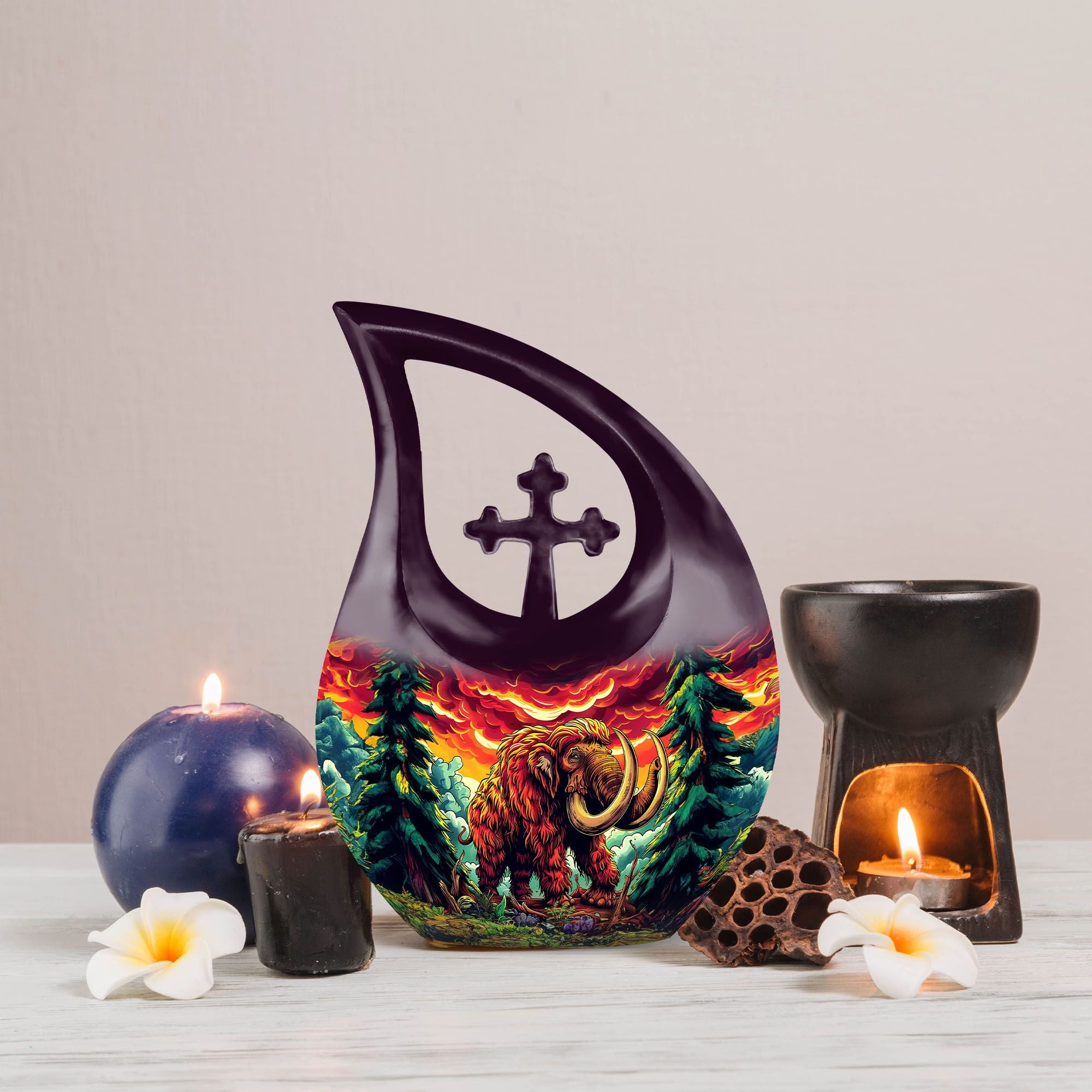 Bring solace and tranquility in your time of sorrow with our stunning Mamoth Urn. With its size of 10 inches and a weight of a mere 3.3 pounds, this luxurious memorial urn emanates class and reverence. Made of high-quality aluminium, the urn promises longevity and sturdiness. The 'Cross Drop' pattern gift wraps the theme of 'Mamoth' elegantly. As unique as the memories you hold dear, our large urn offers a capacity of 200 cubic inches, allowing you a tangible connection with your loved one. Each purchase of our urn comes enclosed with a velvet pouch for dignified containment of ashes. Add a heartwarming touch by personalizing the urn with engraved names. Frequently searched as Modern Urn, Best Cremation Urn, and Burial Urns For Sale, our Mamoth Urn is a bestseller at heart. Kindly note, this comforting piece of memorial ceremony supplies resonates faith, love, and remembrance. Crafted for adults and seniors seeking solace in relics of togetherness, our urn is much more than an investment; it's a treasure.