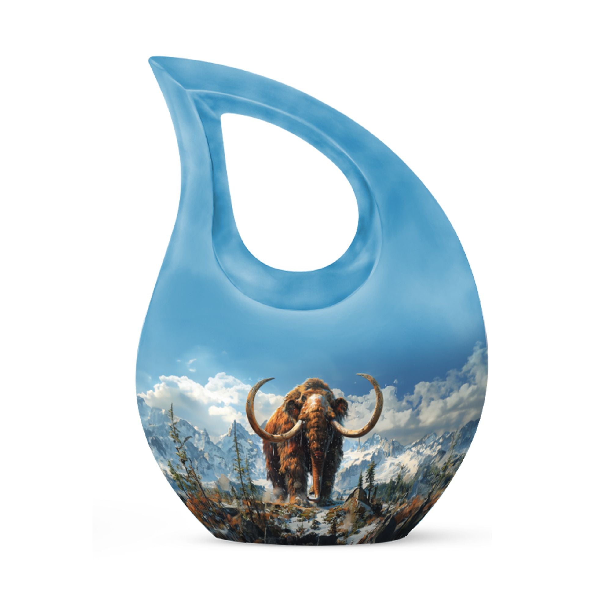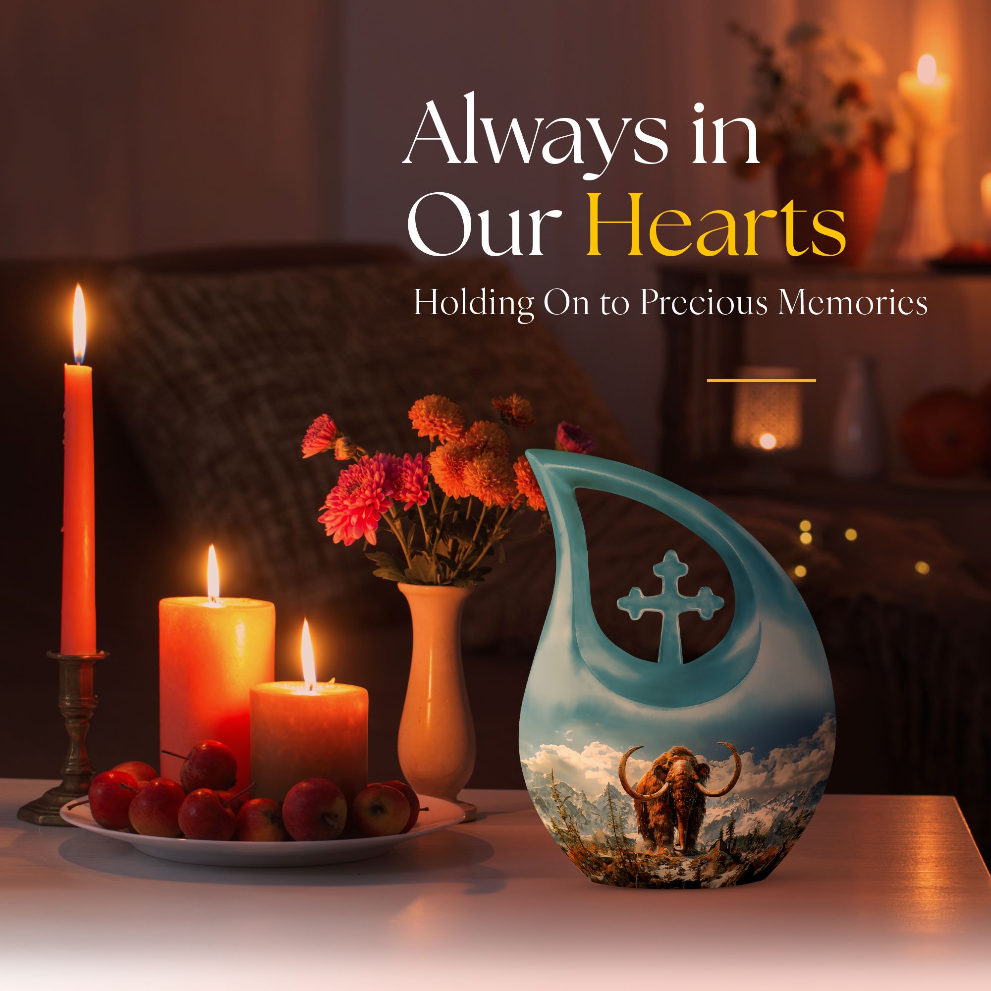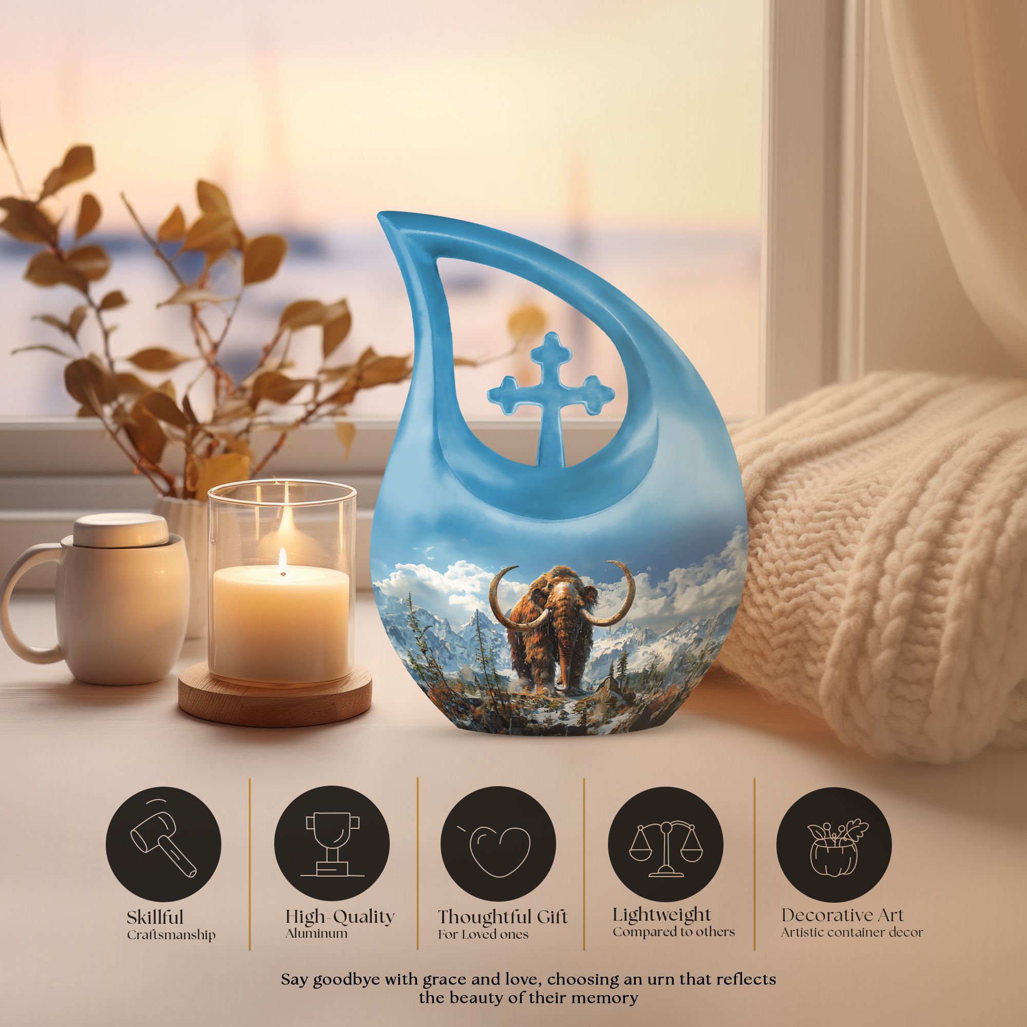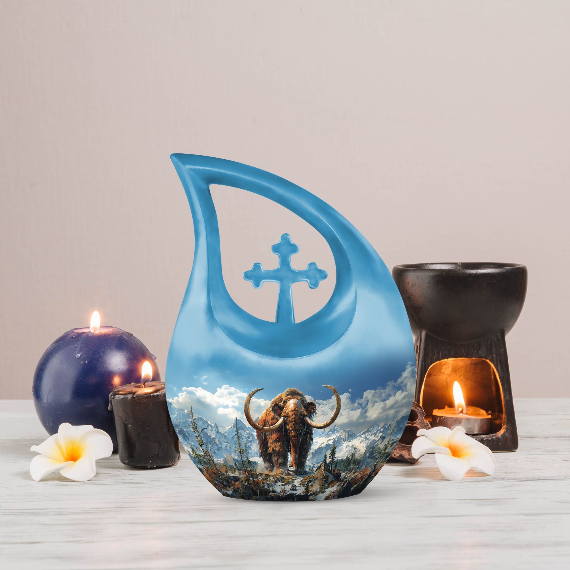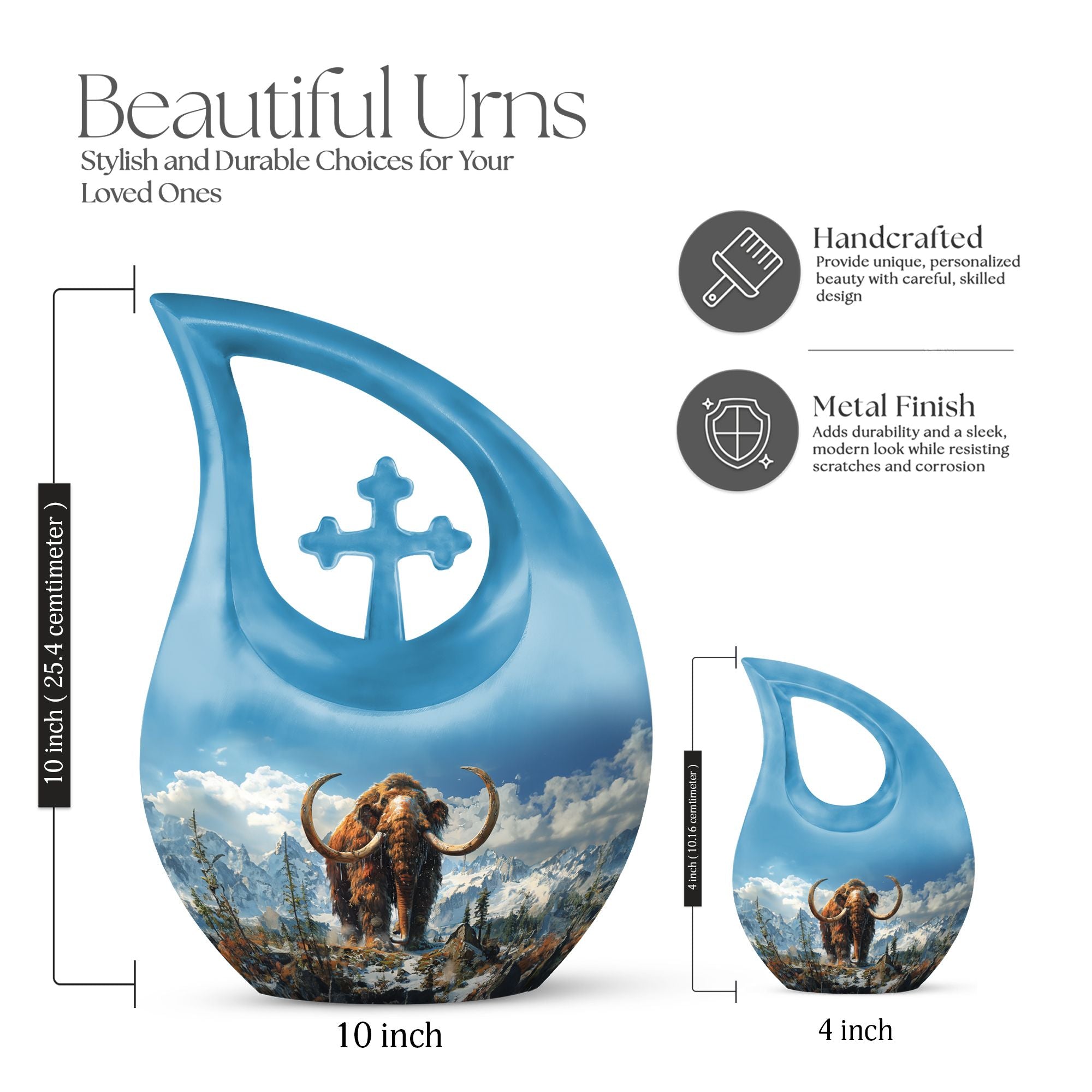 Honoring your beloved mom has never been as deeply heartfelt and special as with our beautiful Mamoth Urn. This 10-inch large urn, notably weighted at 3.3 pounds, is meticulously crafted from high-quality, enduring aluminium. It offers enough space, with a generous capacity of 200 cubic inches. Our tasteful, Mamoth-themed urn can be treasured in your chosen sacred spot or proudly displayed in any room, with its eye-catching Cross Drop design. It comes with a velvet pouch for keeping the ashes safe and consecrated. Furthermore, to make the memorial uniquely touching, we offer customization options allowing the addition of engraved names. This memorable urn delicately balances aesthetic appeal and symbolic significance for a lasting representation of your love and loss. Preferred also under terms like 'Double Urn,' 'Butterfly Urns For Ashes,' 'Decorative Urns For Ashes,' and 'Ashes Into Keepsakes', this urn is a significant addition to the repository of memorial urns.