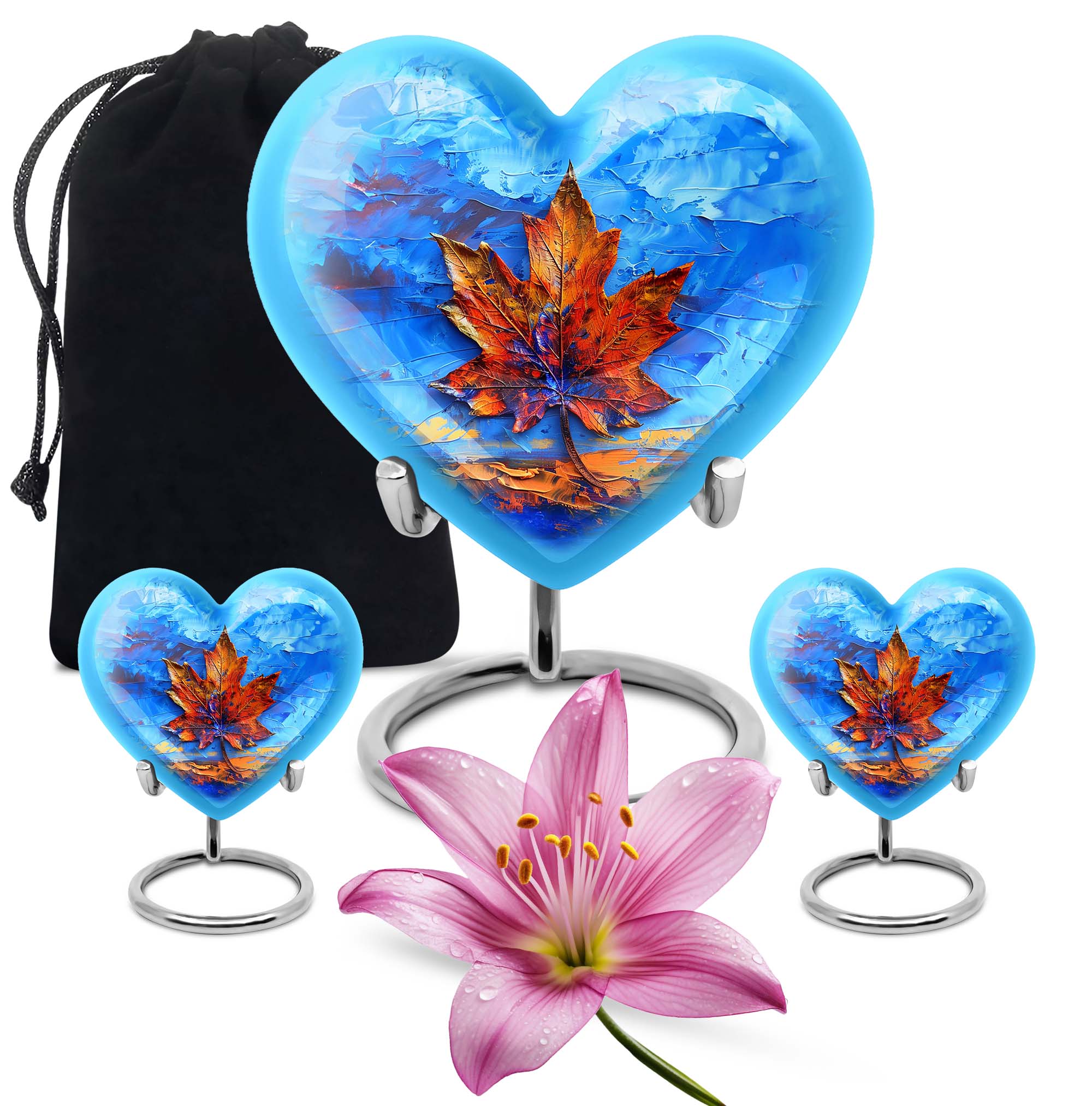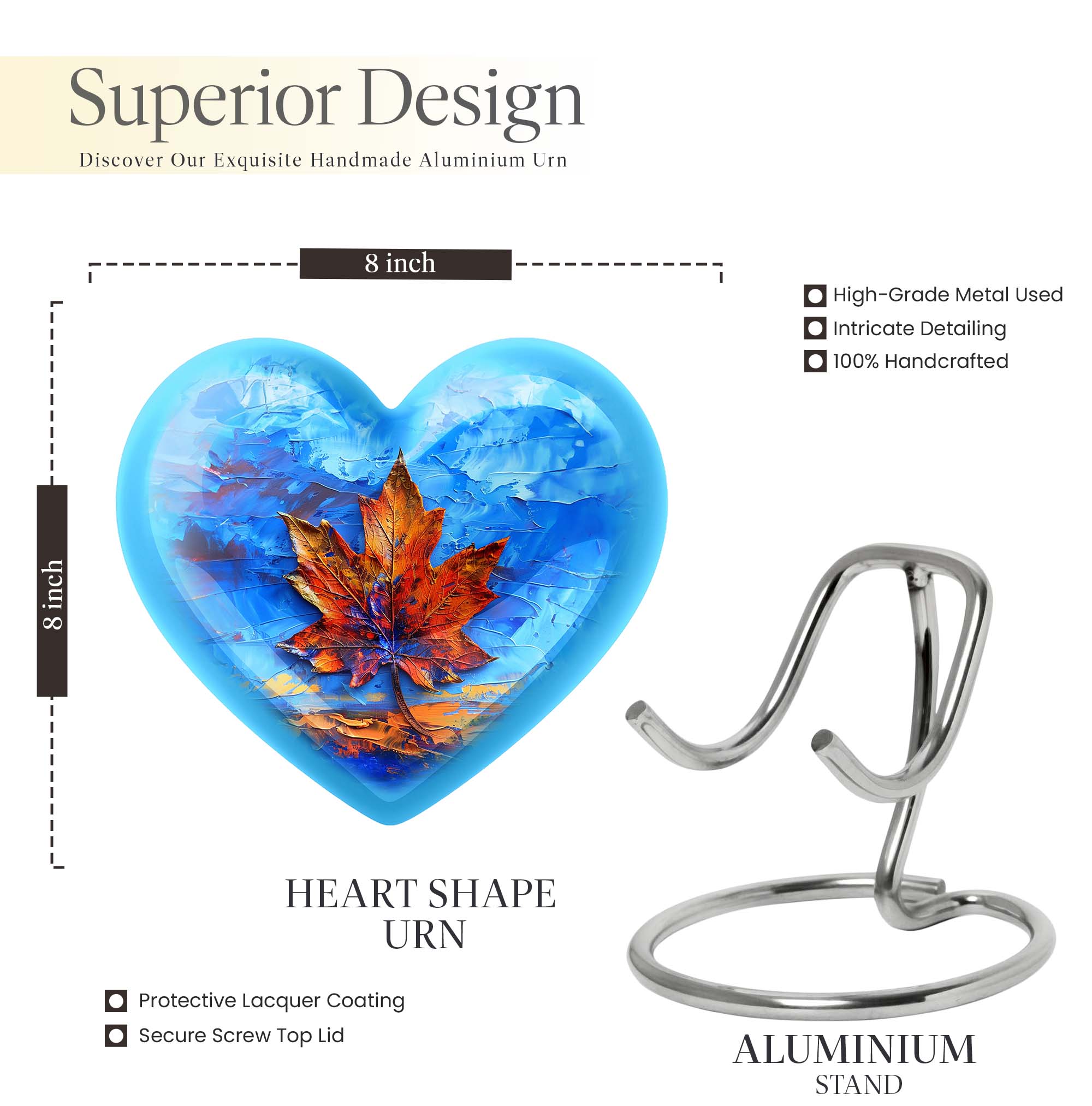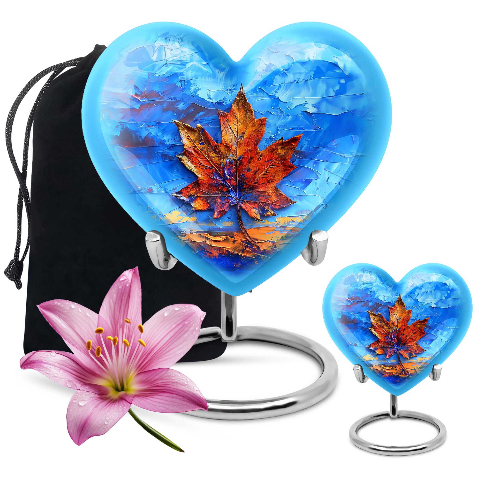 Honor the memory of your beloved one with this sophisticated Mapple Leaf Memorial Urn, an exceptional choice for women's ashes. Made from sturdy Aluminium, this urn demonstrates longevity & durability, seasoned with grace. Embellished with a delicate flower theme, it reflects a symbol of love, reincarnation, and purity. Unparalleled in its beauty, this heart-shaped Urn stands tall at 10 inches, comfortably accommodating 200 cubic inches of ashes. Weighing 3.3 pounds, it finds a balance between solidity and manageability. The package includes a soft velvet pouch, ensuring secure containment of the ashes. To make it more personal, this large urn allows for engraved names, enabling you to carry forward their legacy custom-made. Be it as a home memorabilia or for ground burial, this urn navigates the waves of grief with you. Please note: This listing is for urns for human ashes, specifically making it ideal as a women's urn or a metal urn for human ashes adult female.