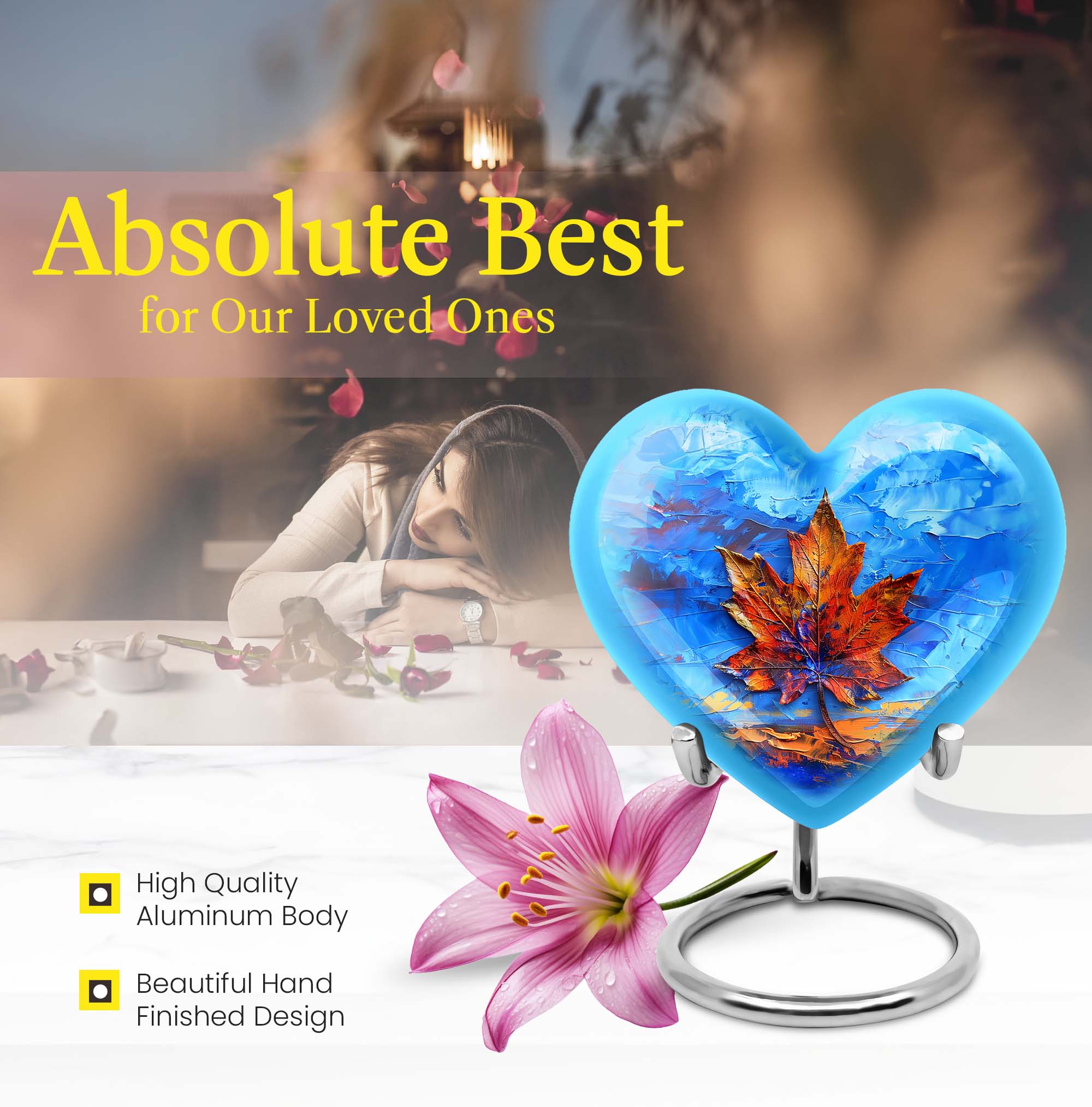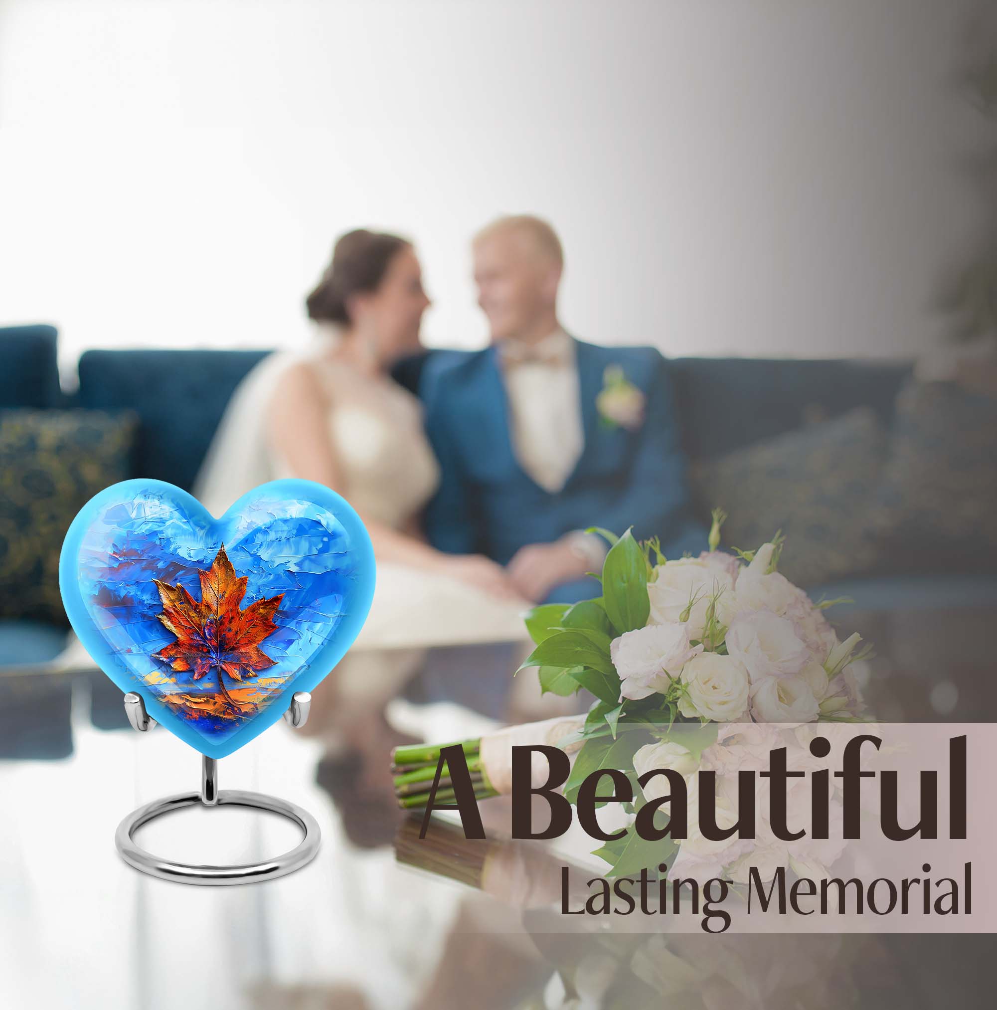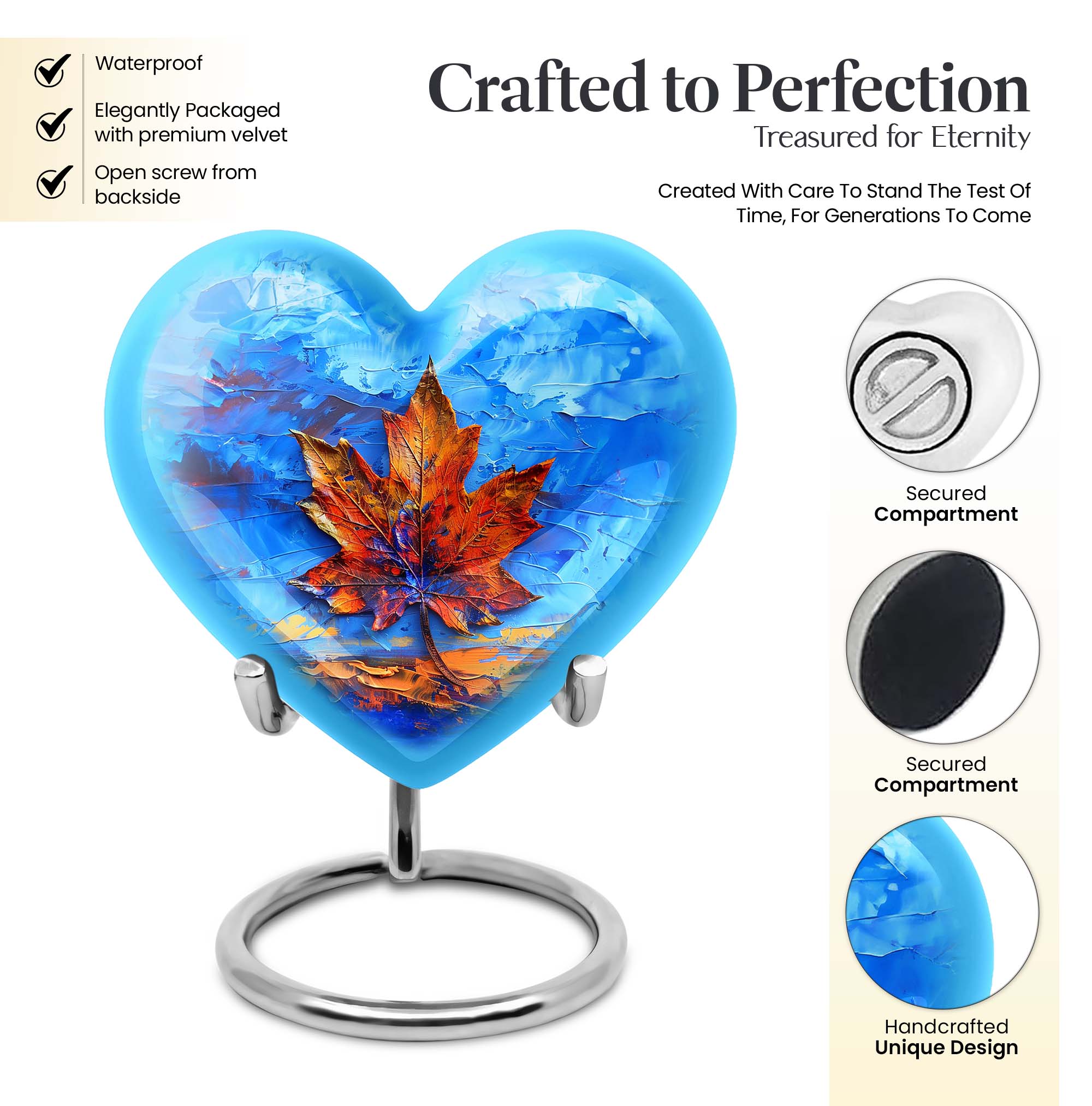 Honor the memory of your beloved one with this sophisticated Mapple Leaf Memorial Urn, an exceptional choice for women's ashes. Made from sturdy Aluminium, this urn demonstrates longevity & durability, seasoned with grace. Embellished with a delicate flower theme, it reflects a symbol of love, reincarnation, and purity. Unparalleled in its beauty, this heart-shaped Urn stands tall at 10 inches, comfortably accommodating 200 cubic inches of ashes. Weighing 3.3 pounds, it finds a balance between solidity and manageability. The package includes a soft velvet pouch, ensuring secure containment of the ashes. To make it more personal, this large urn allows for engraved names, enabling you to carry forward their legacy custom-made. Be it as a home memorabilia or for ground burial, this urn navigates the waves of grief with you. Please note: This listing is for urns for human ashes, specifically making it ideal as a women's urn or a metal urn for human ashes adult female.