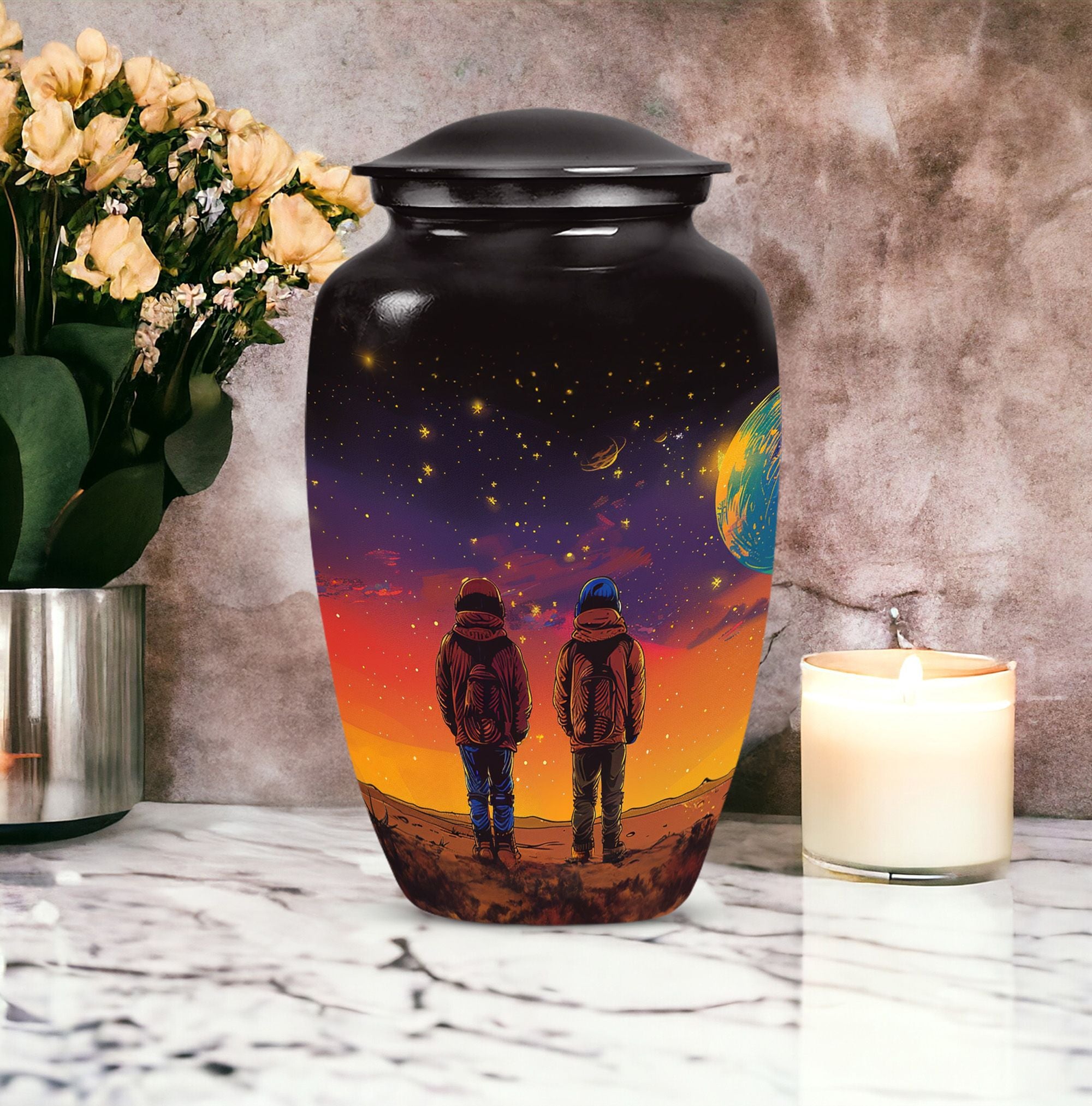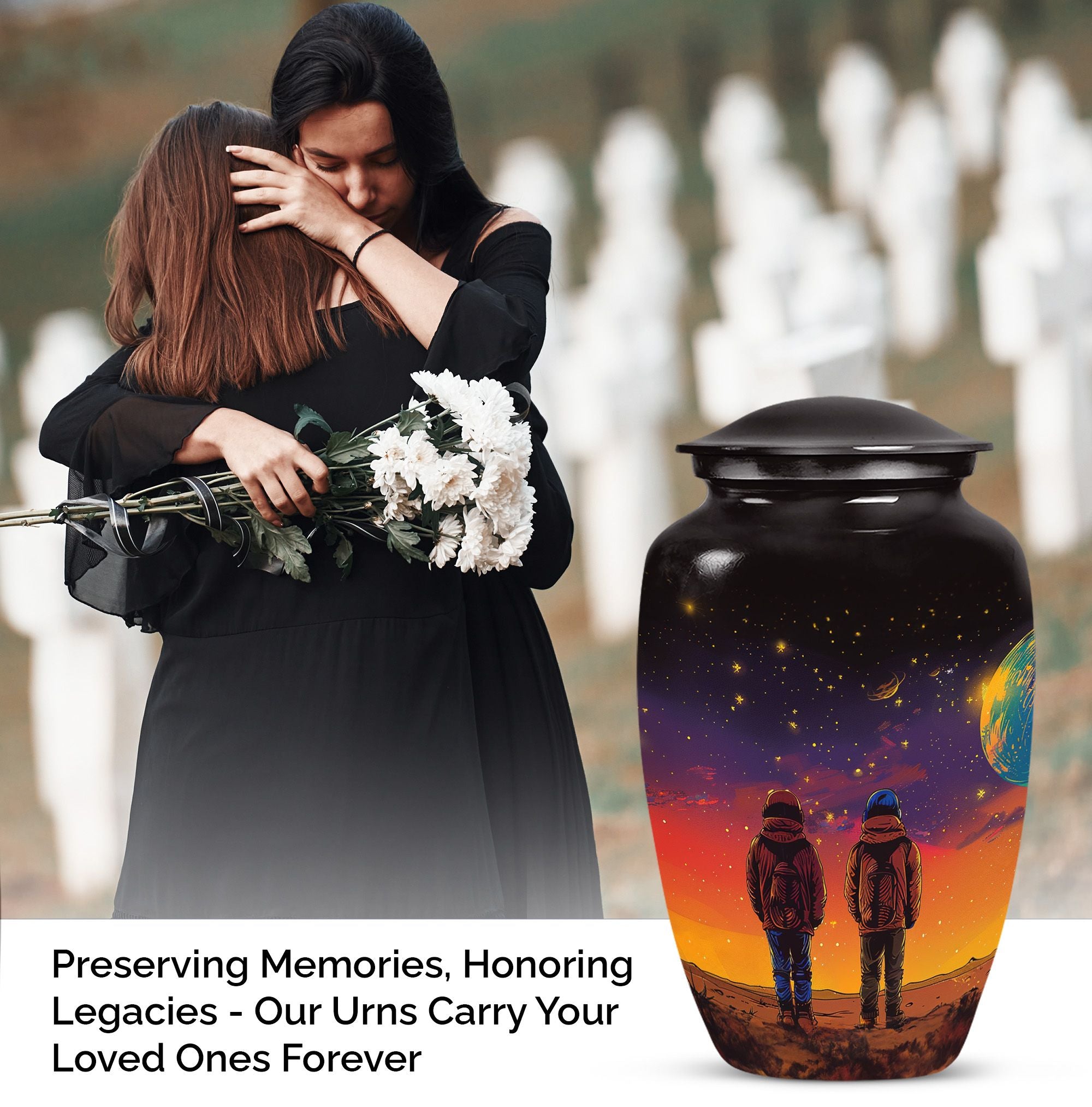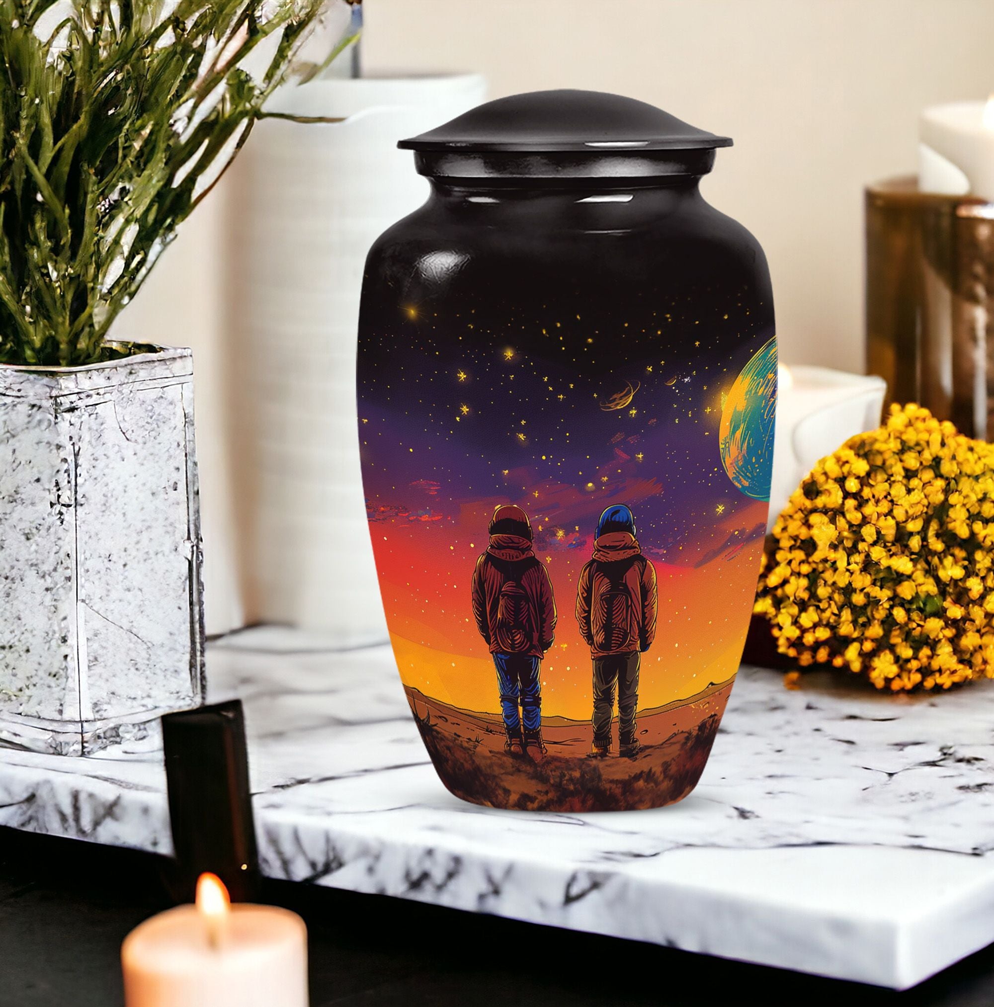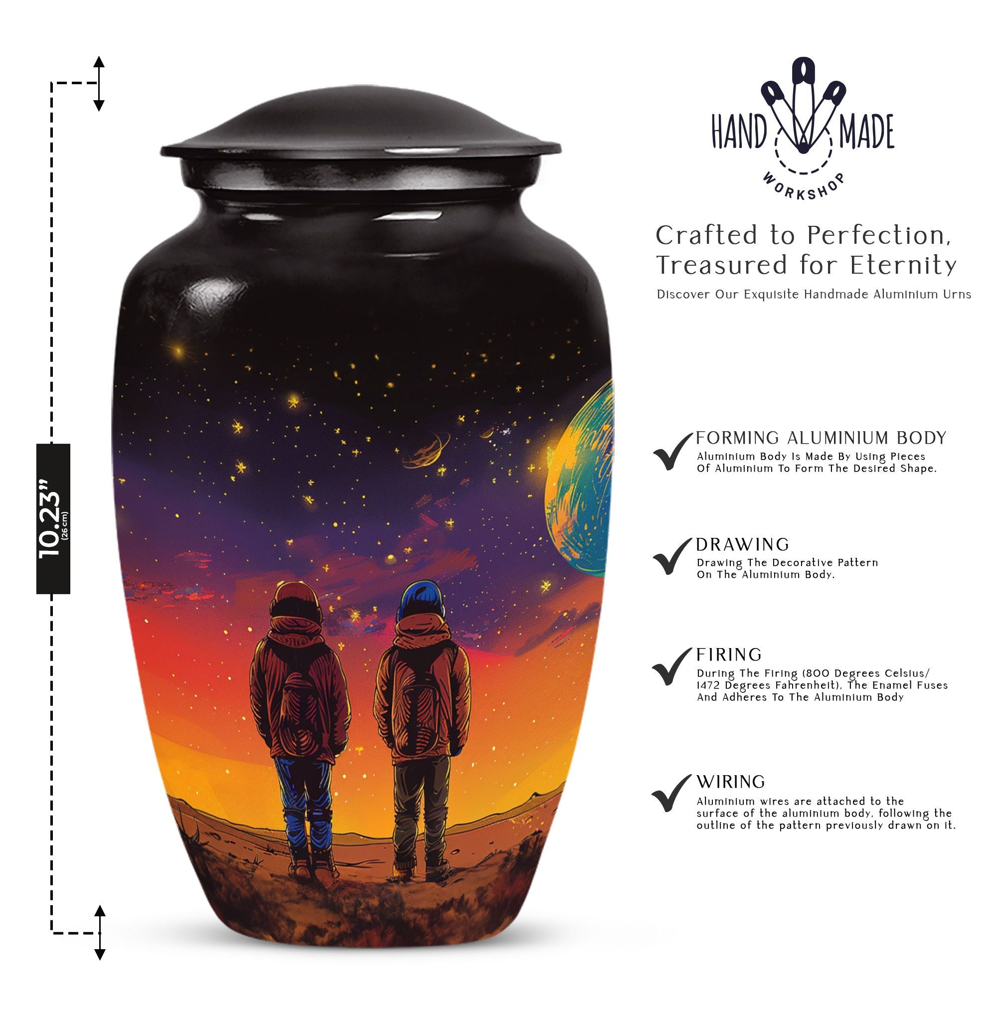 Embark on a well-deserved, fulfilling tribute to your beloved with our 'Brother and Sister Urn,' a perfect resting place that speaks with discreet elegance and profound respect. This Burial ash urn, with its refined large size of 10 inches, is meticulously crafted from steadfast Aluminium to withhold time's test. While being compact with dimensions of 10 inches in height, it offers ample space with a capacity of 200 cubic inches, gently encompassing the memories garnered over time. The abstract theme resonates with the essence of life and the intricate course of existence. To further cherish the person, this cremation urn can be personalized with engraved names, signifying a bond that poignantly triumphs time. The package is complemented with a delicate velvet pouch, handpicked for the containment of the precious ashes. Weighing at 3.3 pounds, it stands as a substantial marker of affectionate moments. Commemorate love's irreplaceable form by accommodating the cremation urn for adult female ashes, or adult male ashes, mirroring equal reverence for both. Cater to unforgettable feelings and offer a dignified memorial with our cremation urn, a testament of cherished togetherness sustained in each contour.
