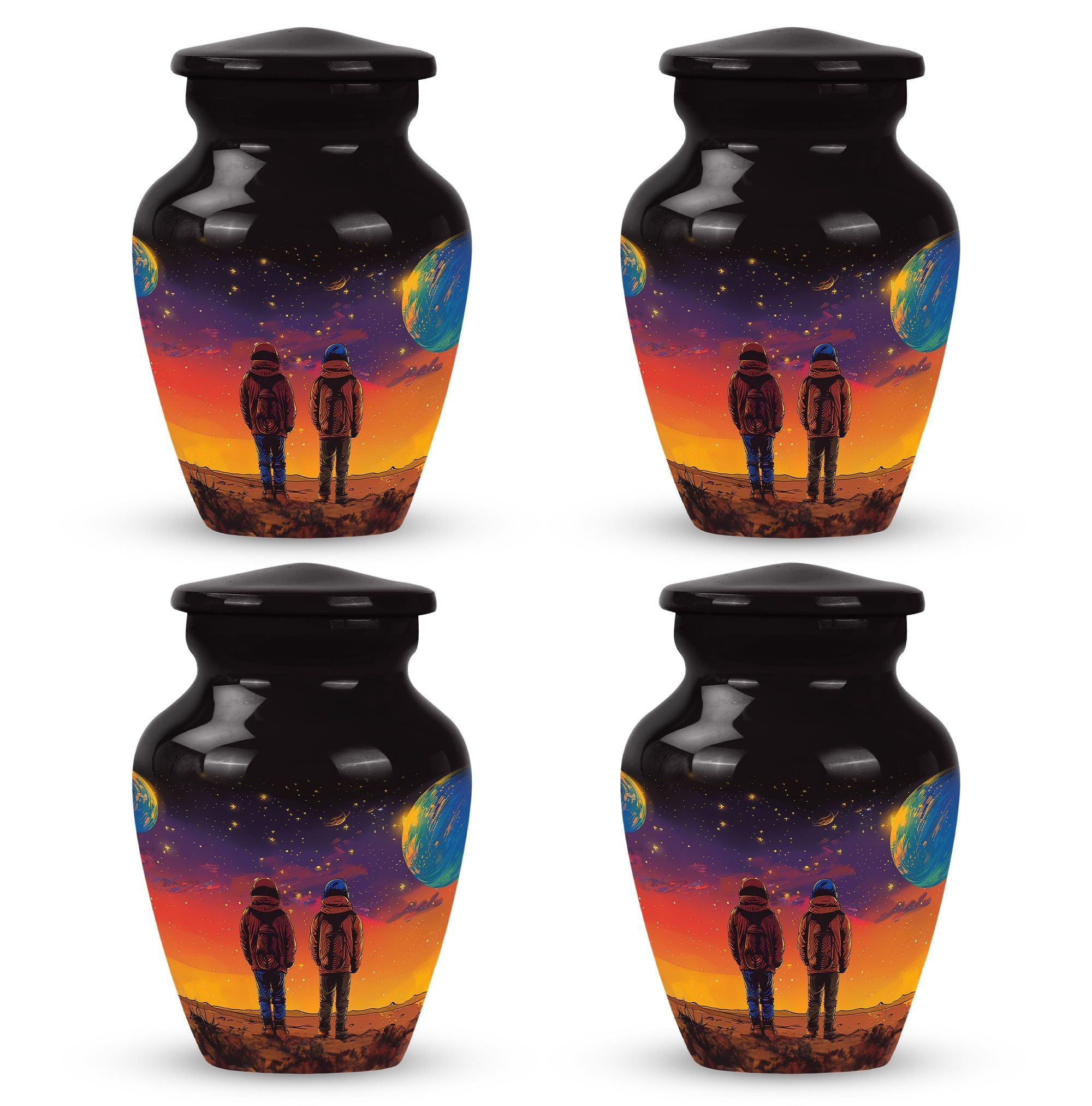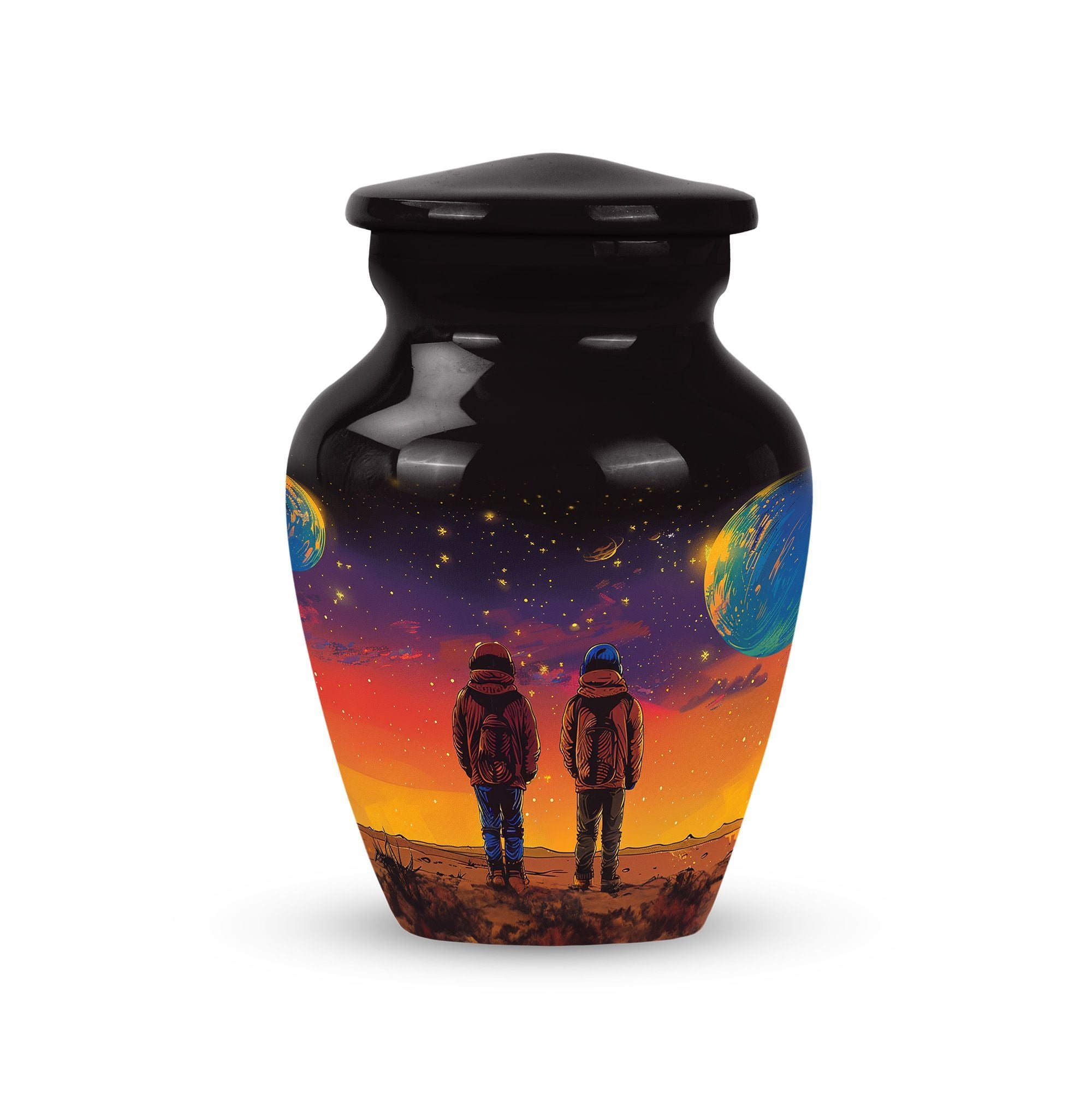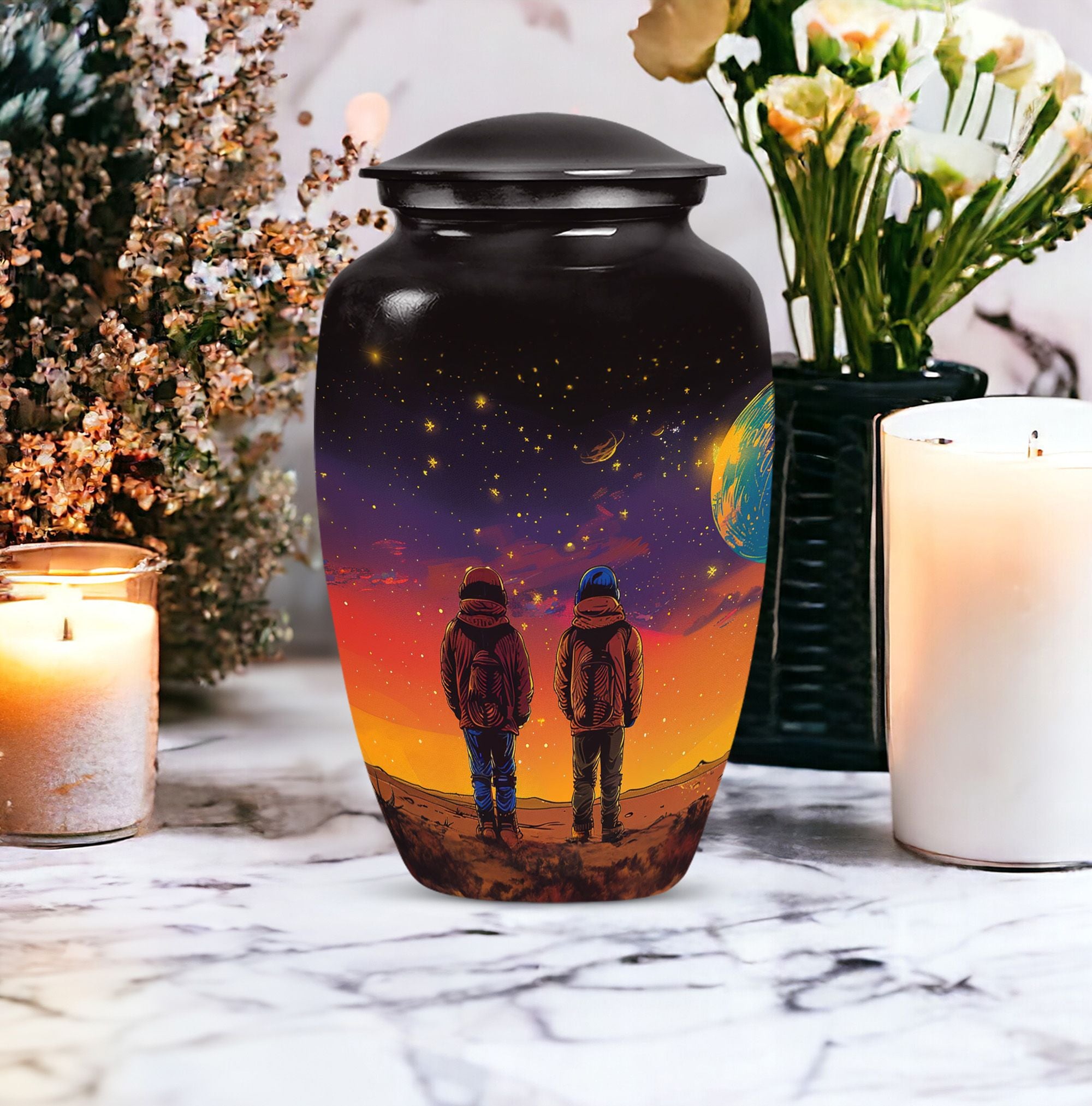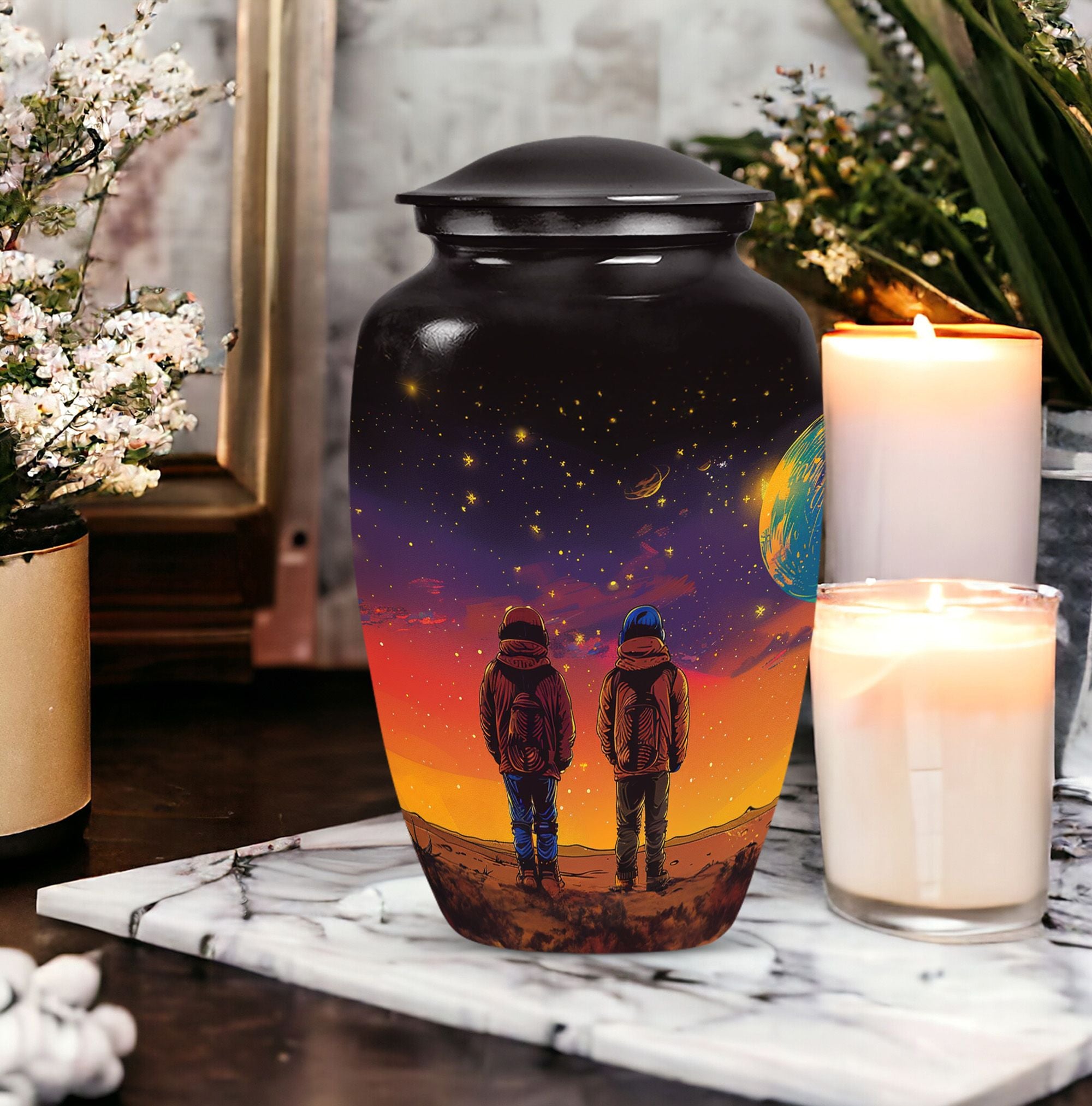Embark on a well-deserved, fulfilling tribute to your beloved with our 'Brother and Sister Urn,' a perfect resting place that speaks with discreet elegance and profound respect. This Burial ash urn, with its refined large size of 10 inches, is meticulously crafted from steadfast Aluminium to withhold time's test. While being compact with dimensions of 10 inches in height, it offers ample space with a capacity of 200 cubic inches, gently encompassing the memories garnered over time. The abstract theme resonates with the essence of life and the intricate course of existence. To further cherish the person, this cremation urn can be personalized with engraved names, signifying a bond that poignantly triumphs time. The package is complemented with a delicate velvet pouch, handpicked for the containment of the precious ashes. Weighing at 3.3 pounds, it stands as a substantial marker of affectionate moments. Commemorate love's irreplaceable form by accommodating the cremation urn for adult female ashes, or adult male ashes, mirroring equal reverence for both. Cater to unforgettable feelings and offer a dignified memorial with our cremation urn, a testament of cherished togetherness sustained in each contour.