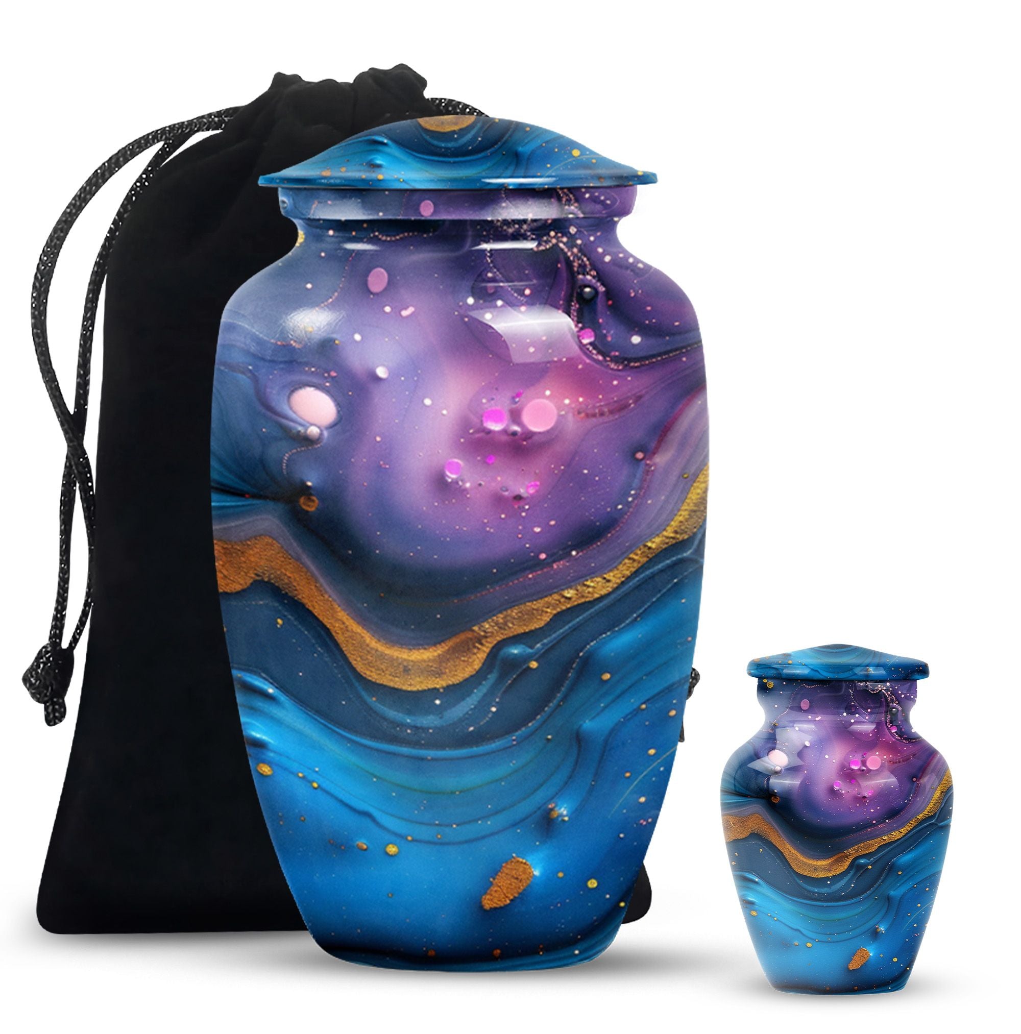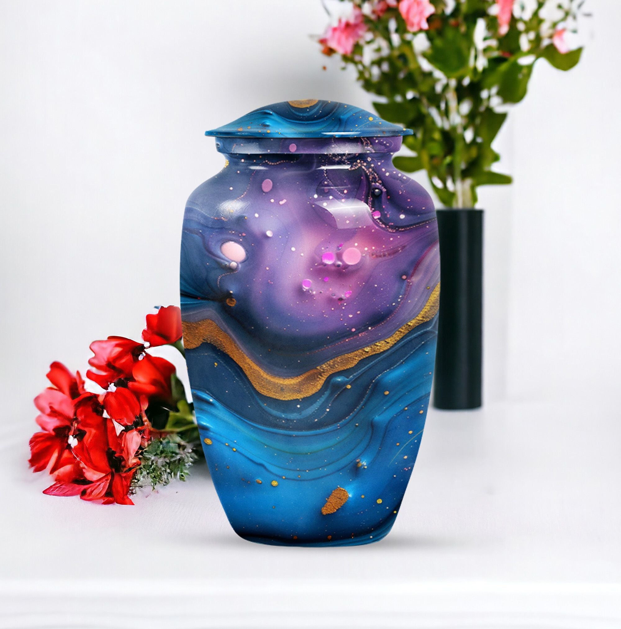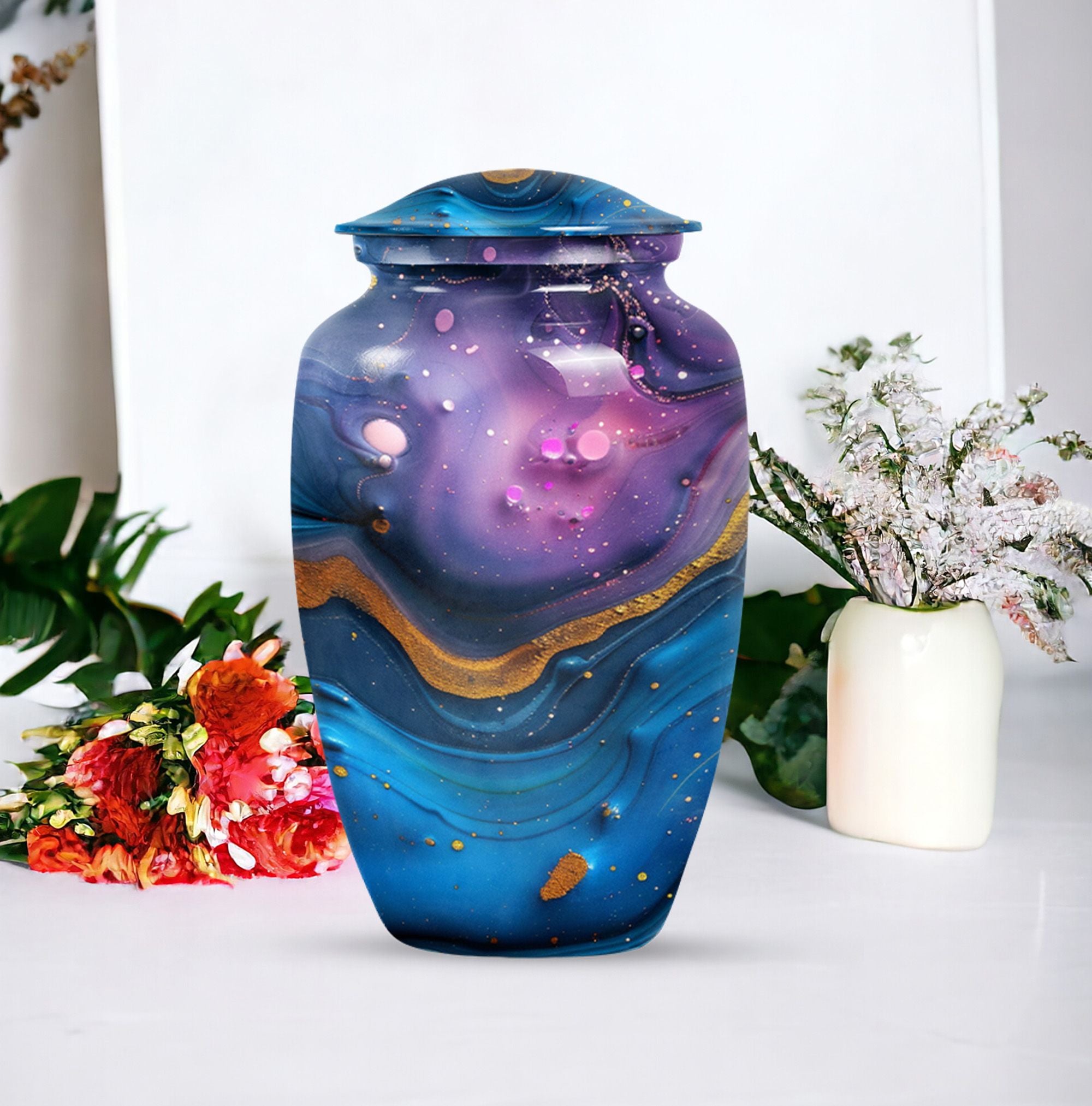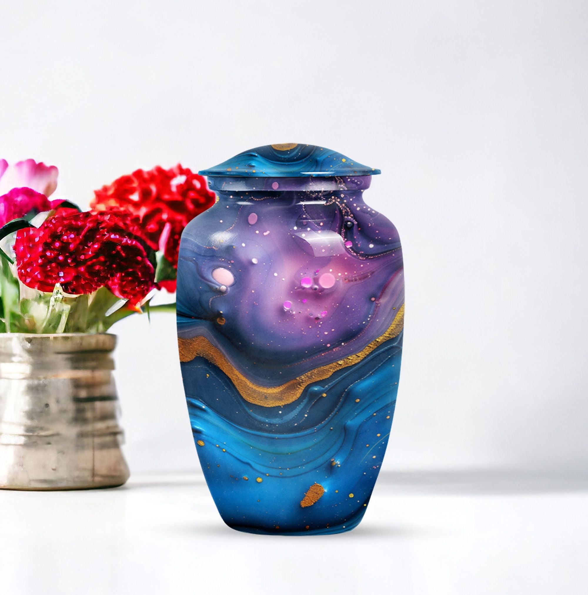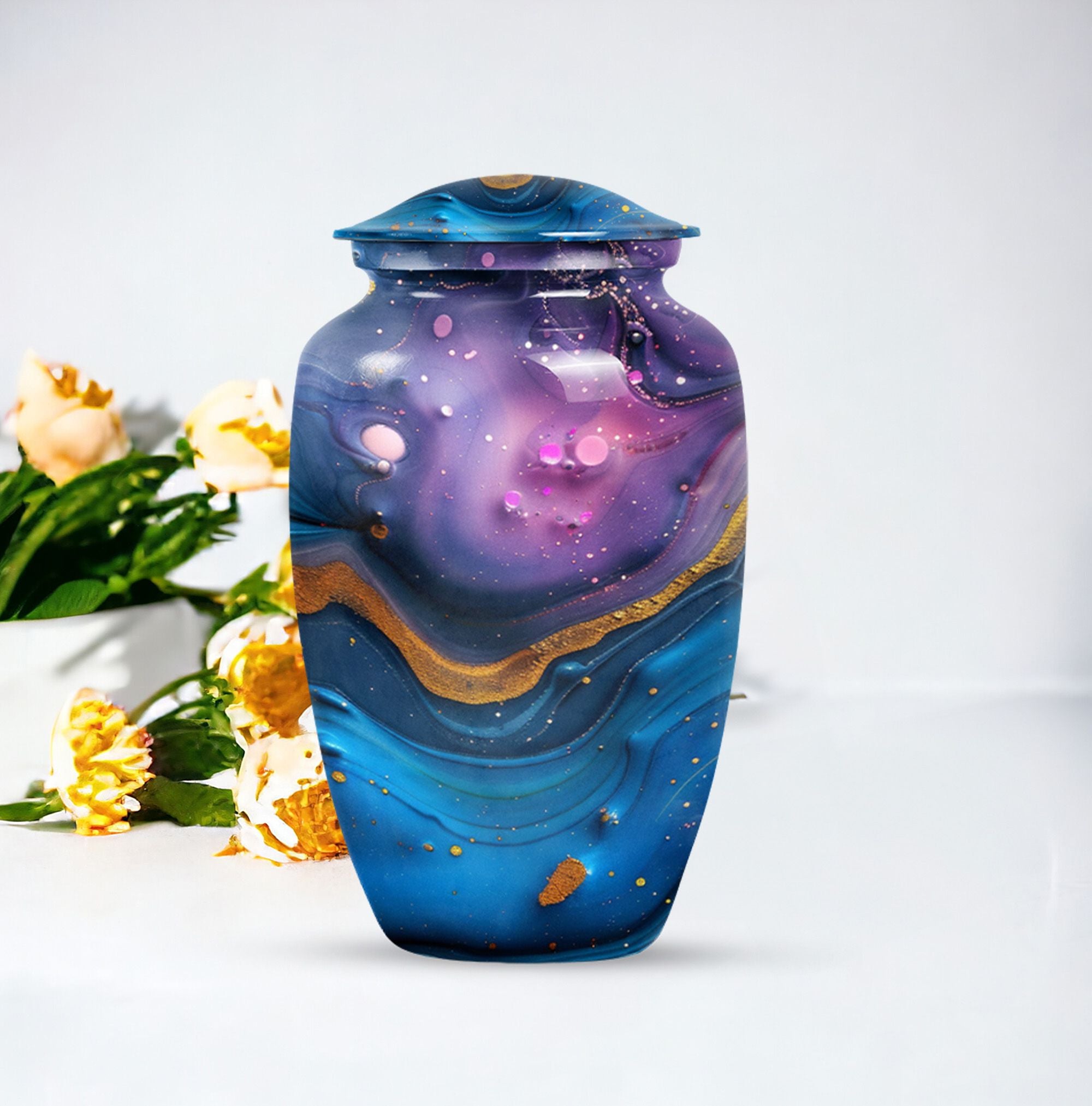 Immerse in a profound expression of remembrance with our 10 Inch Abstract Aluminium Cremation Urn. A special product in our lineup of Large Urns options, this superior piece transcends the usual urn appeal with its distinctive abstract theme. Weighing a substantive 3.3 pounds, the urn carries with it a unisex appeal, making it an ideal choice of cremation urns for men, and burial urns for cremation ashes of mother. With dimensions caressing a height of 10 inches, its colossal capacity of 200 cubic inches ensures sufficient space for containment. Each purchase includes a plush velvet pouch, perfect for safely housing the cherished ashes of your loved one. Personalized customization allows a touch of intimacy, with the option of engraved names. Evoking a sense of lasting elegance, this creator de resistance stands not just as a urn ash funeral urn, but a timeless keepsake of remembrance.