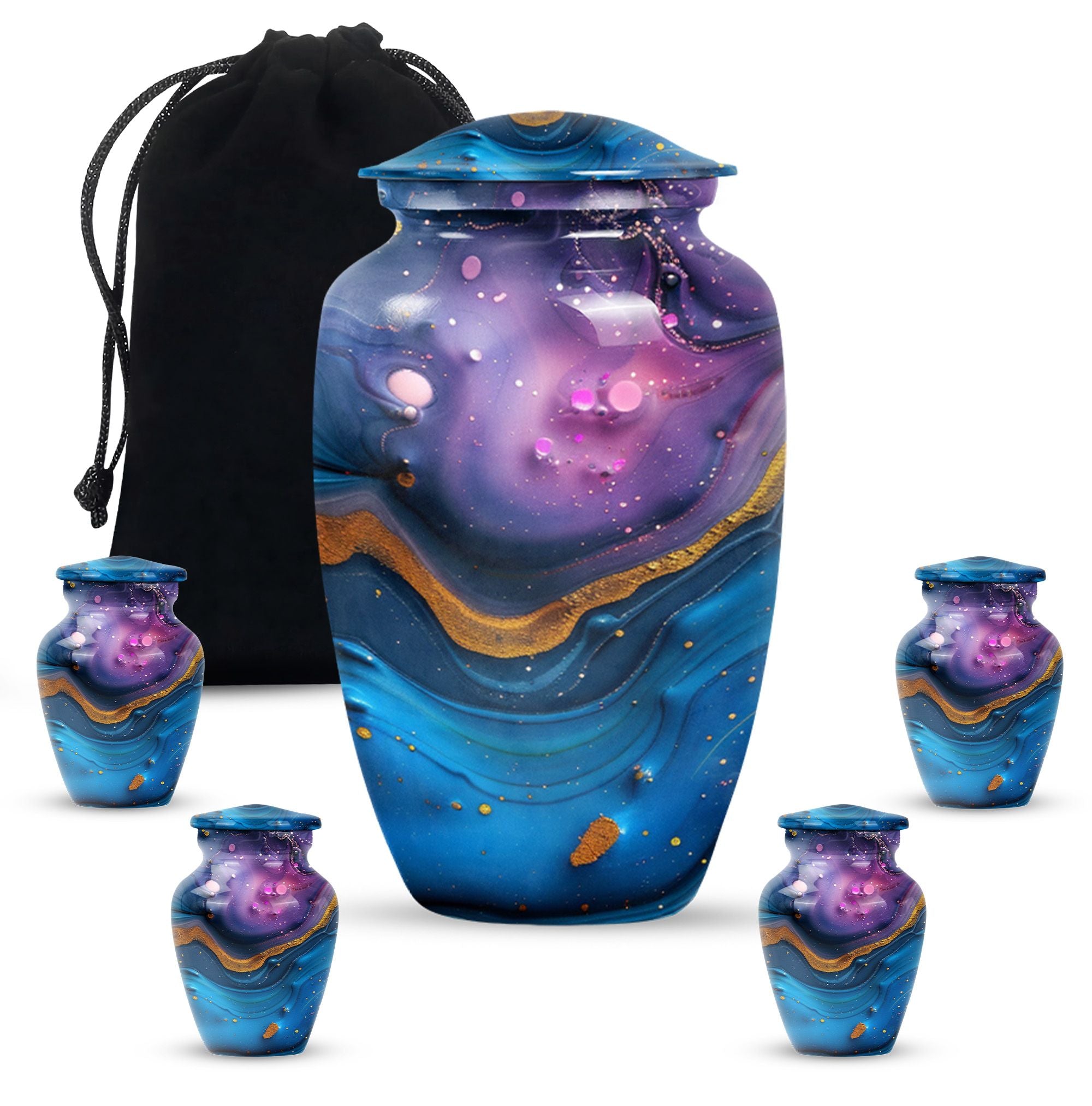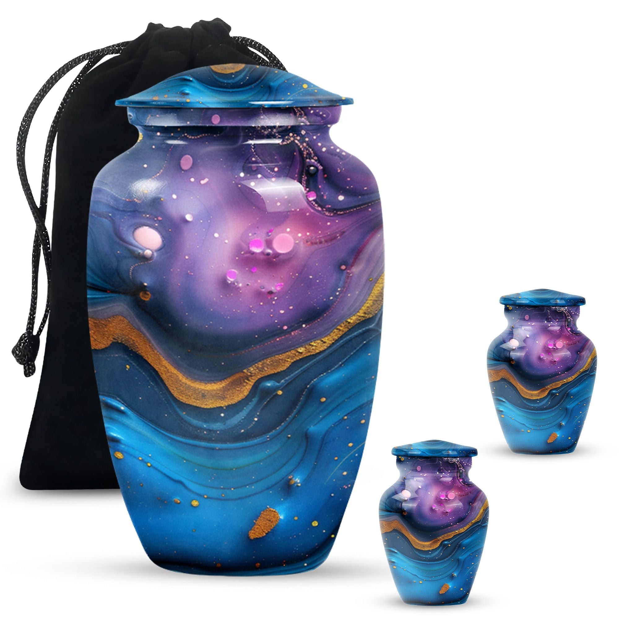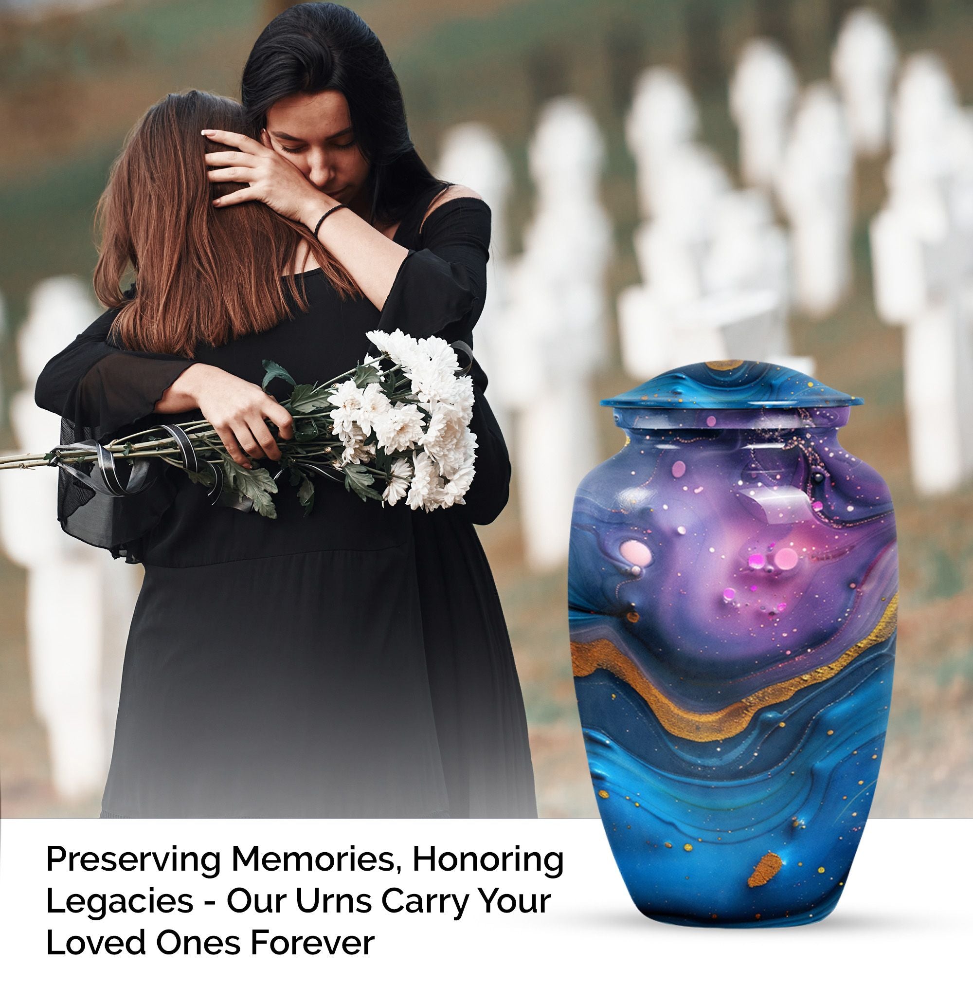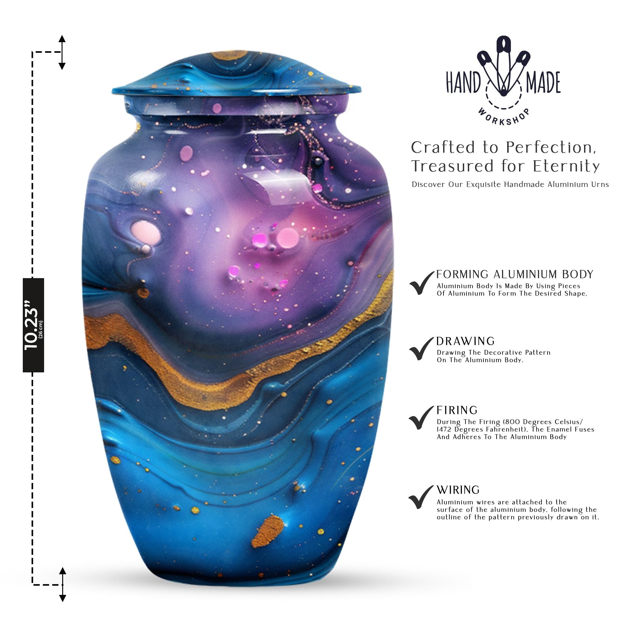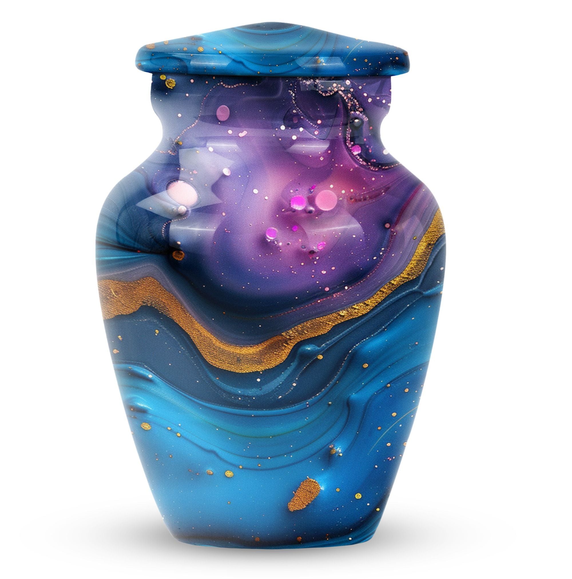 Immerse in a profound expression of remembrance with our 10 Inch Abstract Aluminium Cremation Urn. A special product in our lineup of Large Urns options, this superior piece transcends the usual urn appeal with its distinctive abstract theme. Weighing a substantive 3.3 pounds, the urn carries with it a unisex appeal, making it an ideal choice of cremation urns for men, and burial urns for cremation ashes of mother. With dimensions caressing a height of 10 inches, its colossal capacity of 200 cubic inches ensures sufficient space for containment. Each purchase includes a plush velvet pouch, perfect for safely housing the cherished ashes of your loved one. Personalized customization allows a touch of intimacy, with the option of engraved names. Evoking a sense of lasting elegance, this creator de resistance stands not just as a urn ash funeral urn, but a timeless keepsake of remembrance.