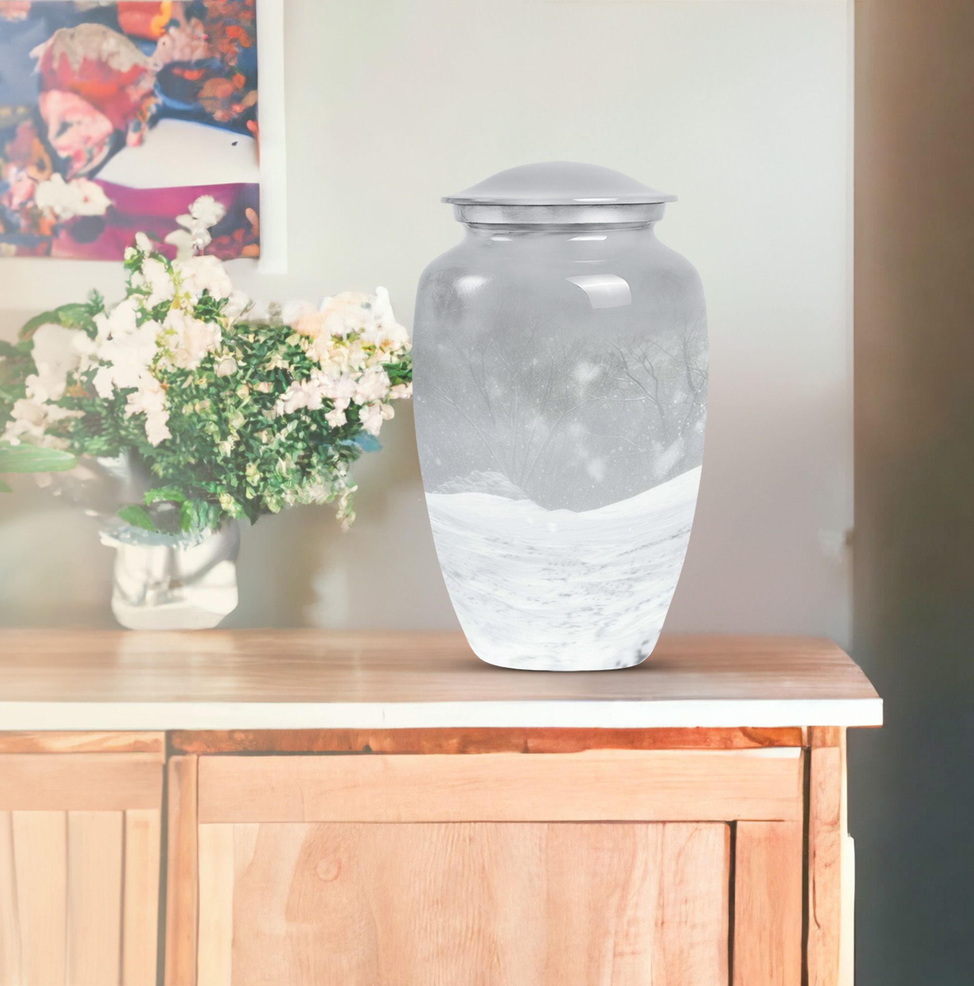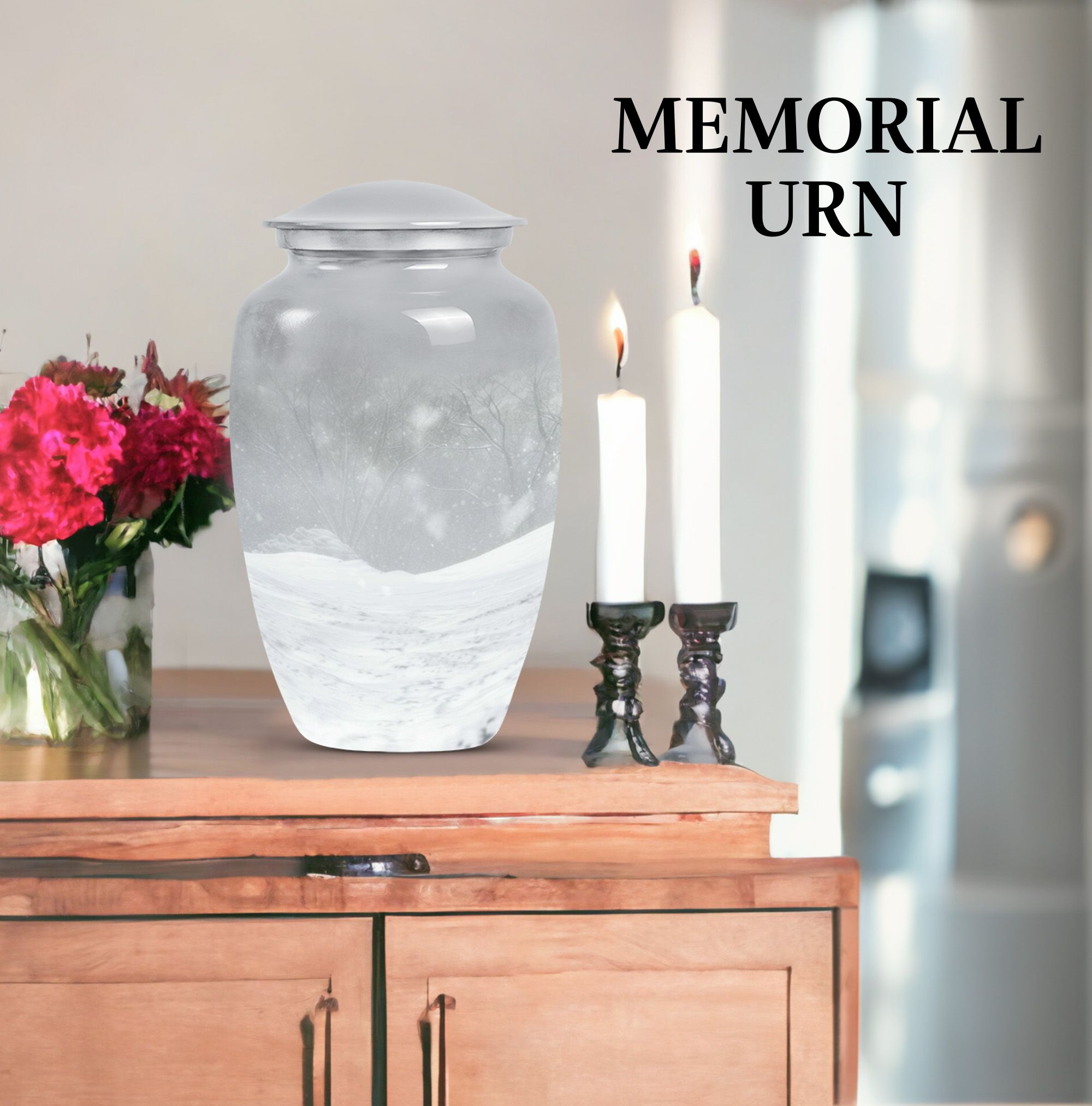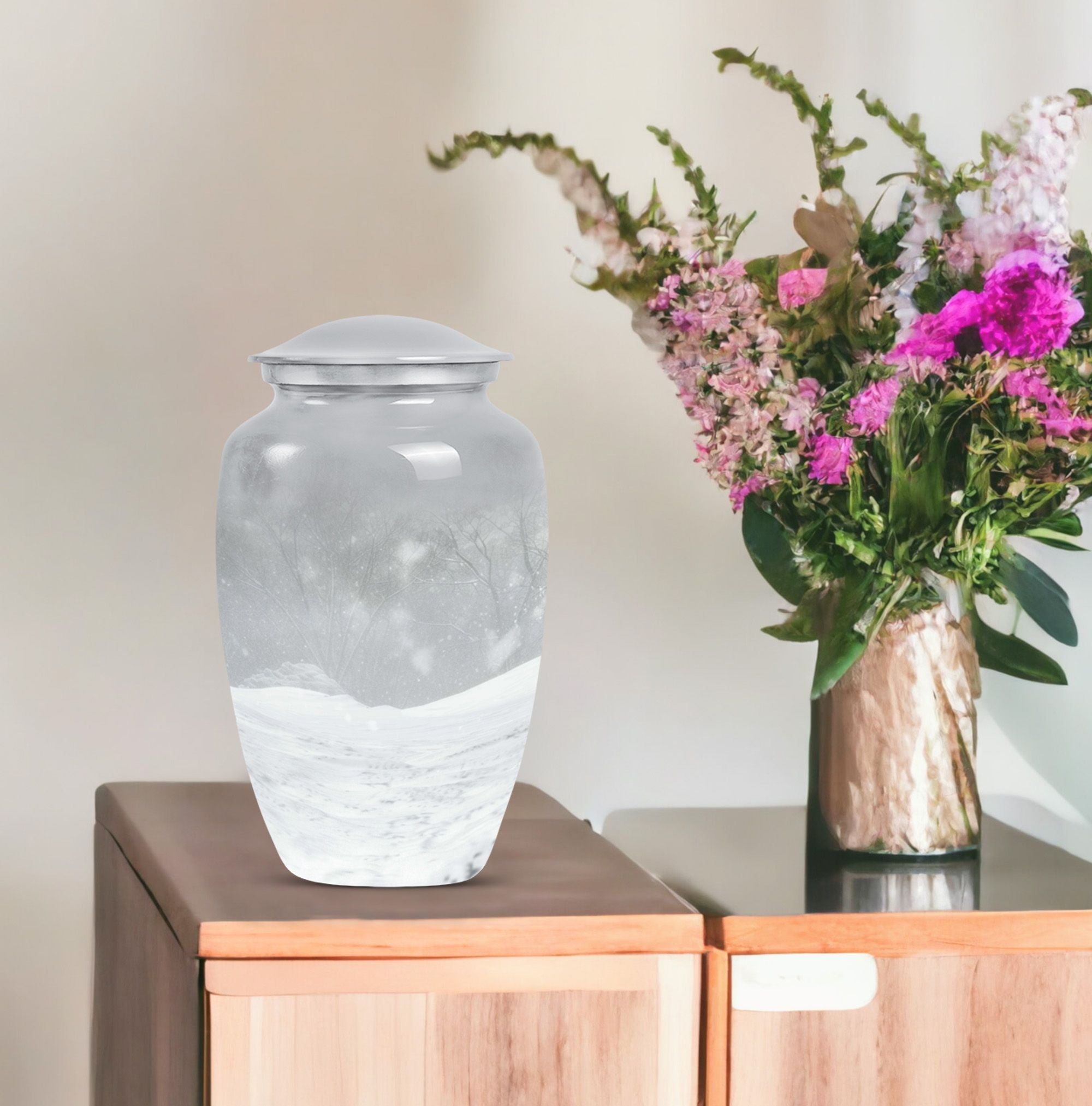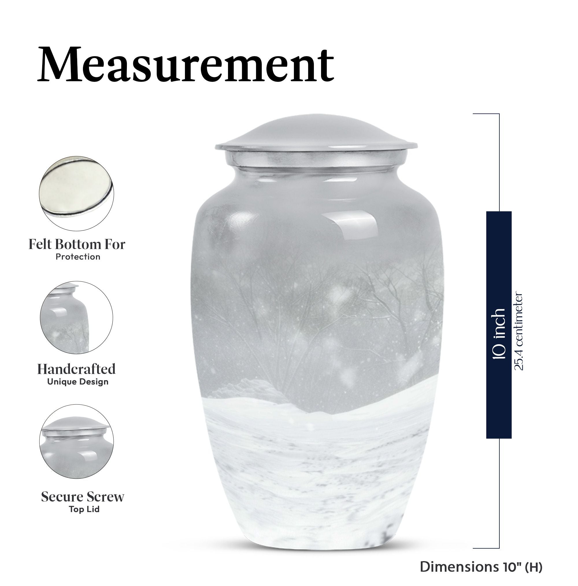 Our exquisite 'Mountain Winter Urn' elegantly addresses the need for a remarkable, dignified final resting place. It's more than just a cremation urn; it's a tasteful remembrance of your beloved mom. Skillfully crafted with fine aluminum, this large urn boasts a substantial size of 10 inches and a weight of 3.3 pounds. Strikingly abstract in theme, it encapsulates a cherished life into its sizable capacity of 200 cubic inches. Each urn can be personalized with engraved names, adding that unique touch that makes it truly special. A luxurious velvet pouch is provided for secure containment of ashes and safekeeping. Its simplicity and sophistication make it an ideal choice for outdoor, tranquil settings. So if you're looking for funeral urns for adult ashes, ash urn for adults or metallic burial urns that appeal to both the heart and sight, our 'Mountain Winter Urn' stands as a distinguished selection. It’s not just about the physical features; it's about creating spaces of lasting memories in our hearts.