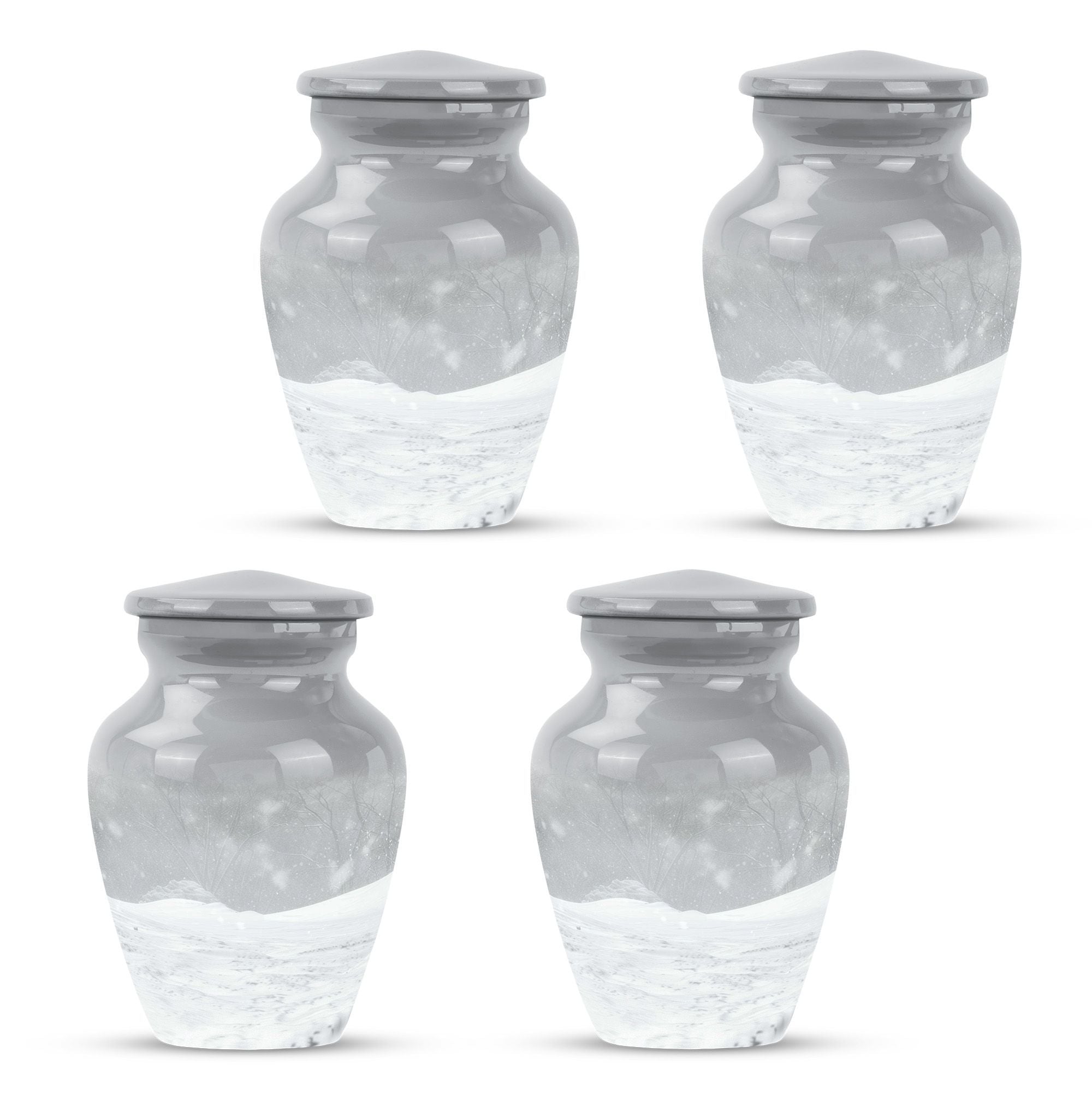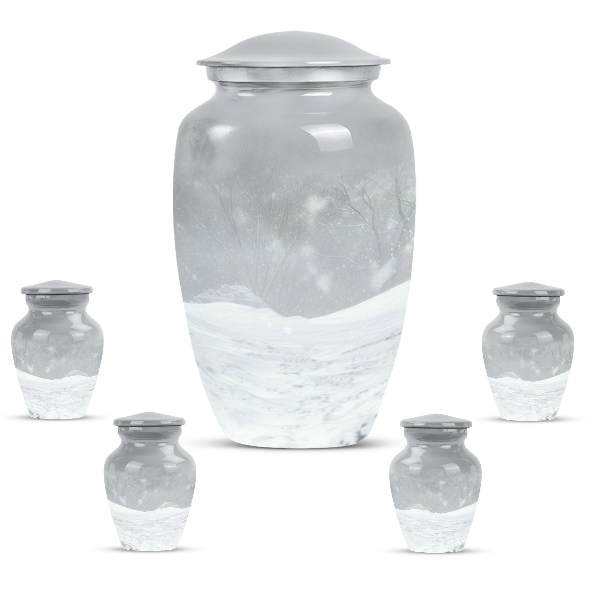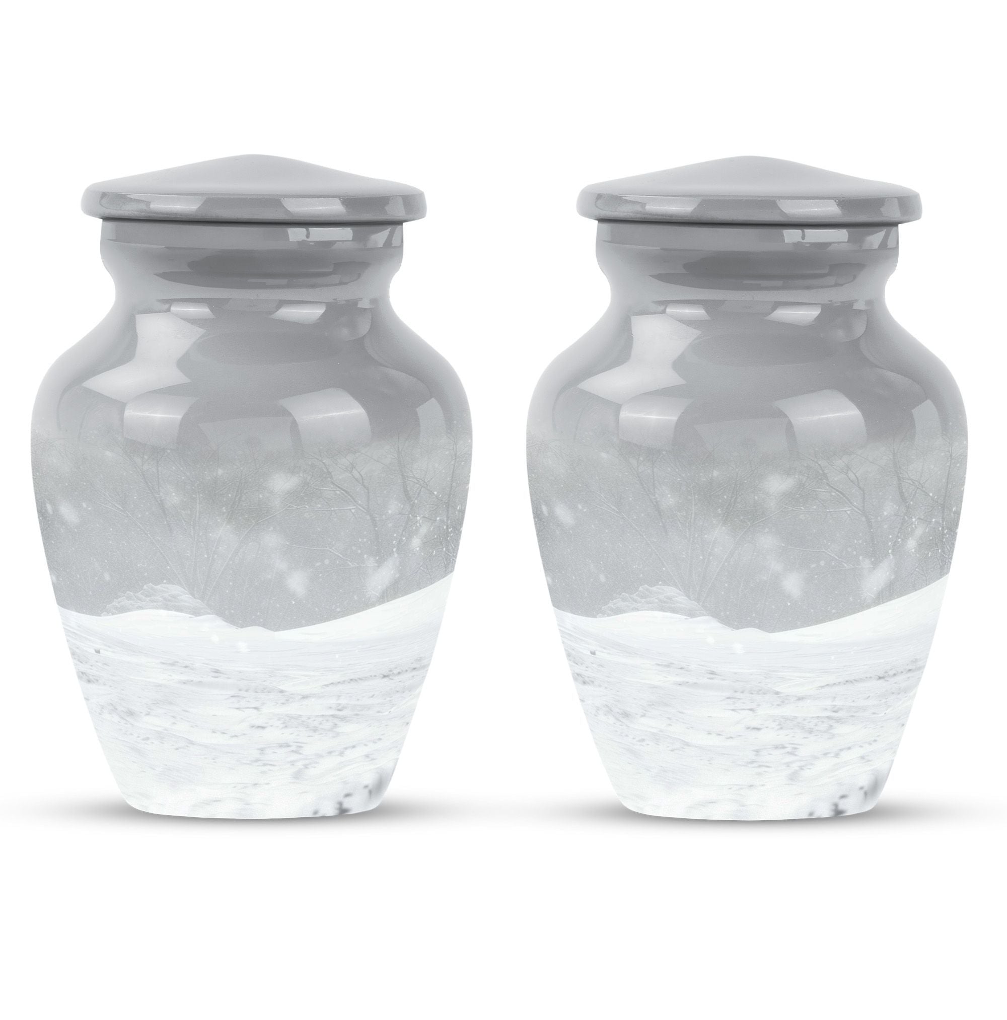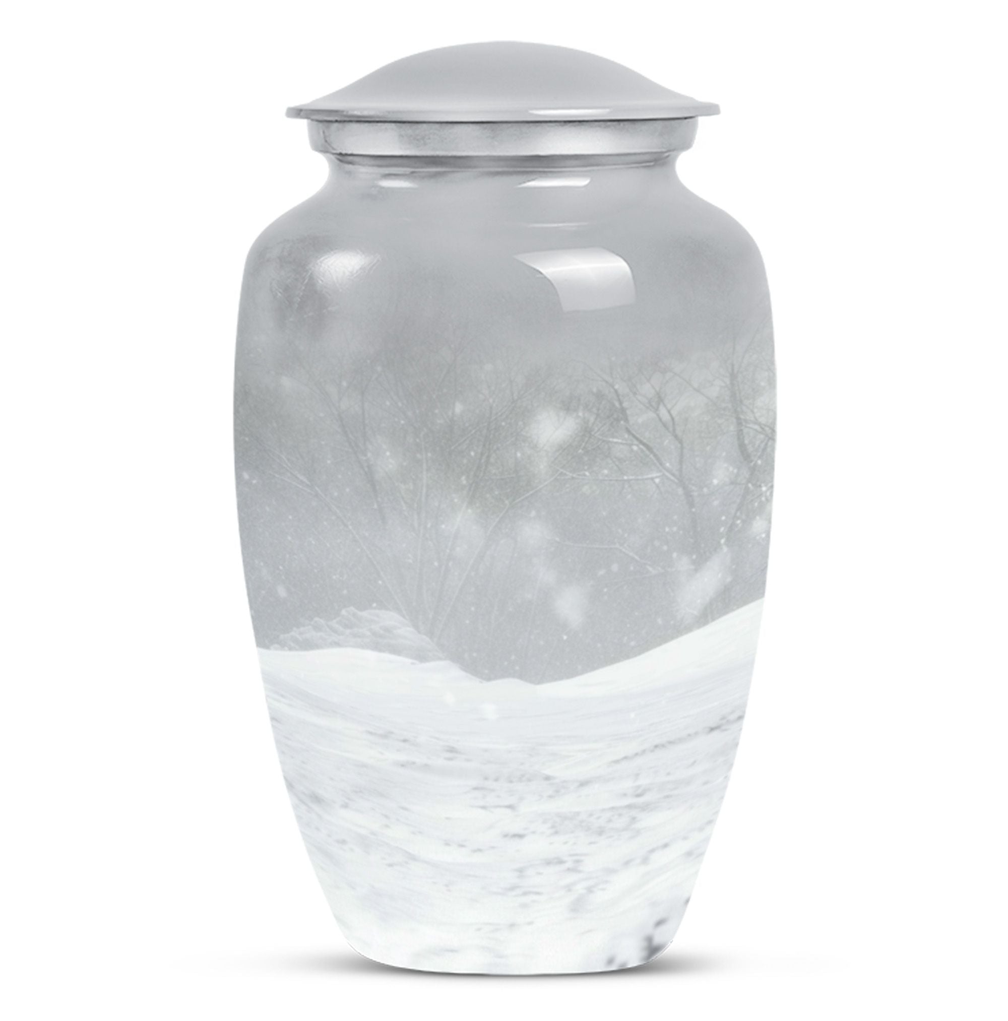 Our exquisite 'Mountain Winter Urn' elegantly addresses the need for a remarkable, dignified final resting place. It's more than just a cremation urn; it's a tasteful remembrance of your beloved mom. Skillfully crafted with fine aluminum, this large urn boasts a substantial size of 10 inches and a weight of 3.3 pounds. Strikingly abstract in theme, it encapsulates a cherished life into its sizable capacity of 200 cubic inches. Each urn can be personalized with engraved names, adding that unique touch that makes it truly special. A luxurious velvet pouch is provided for secure containment of ashes and safekeeping. Its simplicity and sophistication make it an ideal choice for outdoor, tranquil settings. So if you're looking for funeral urns for adult ashes, ash urn for adults or metallic burial urns that appeal to both the heart and sight, our 'Mountain Winter Urn' stands as a distinguished selection. It’s not just about the physical features; it's about creating spaces of lasting memories in our hearts.