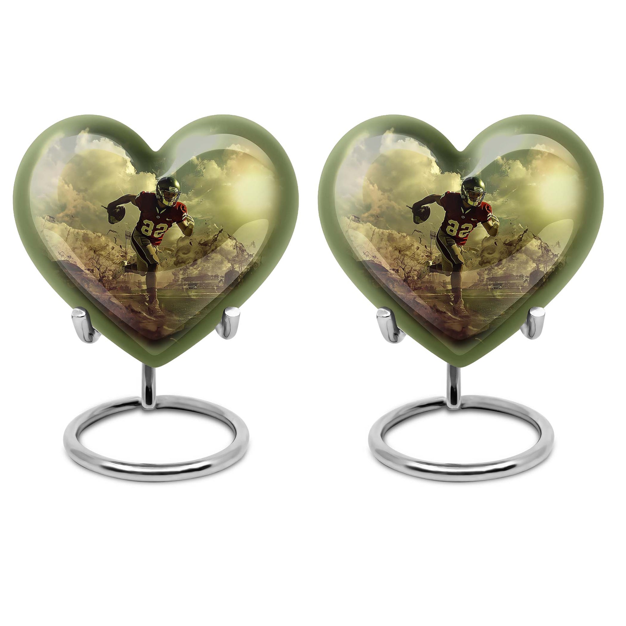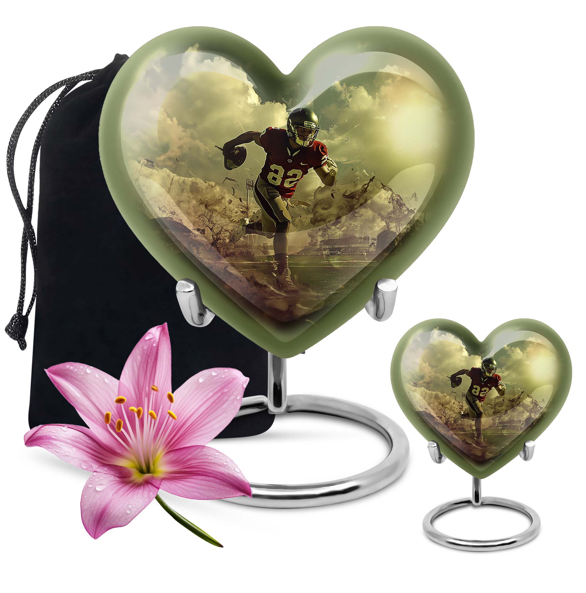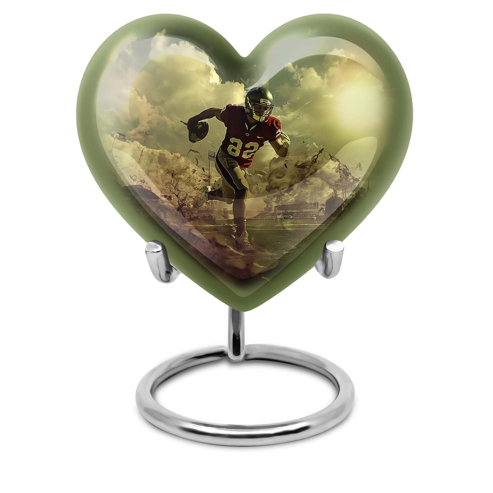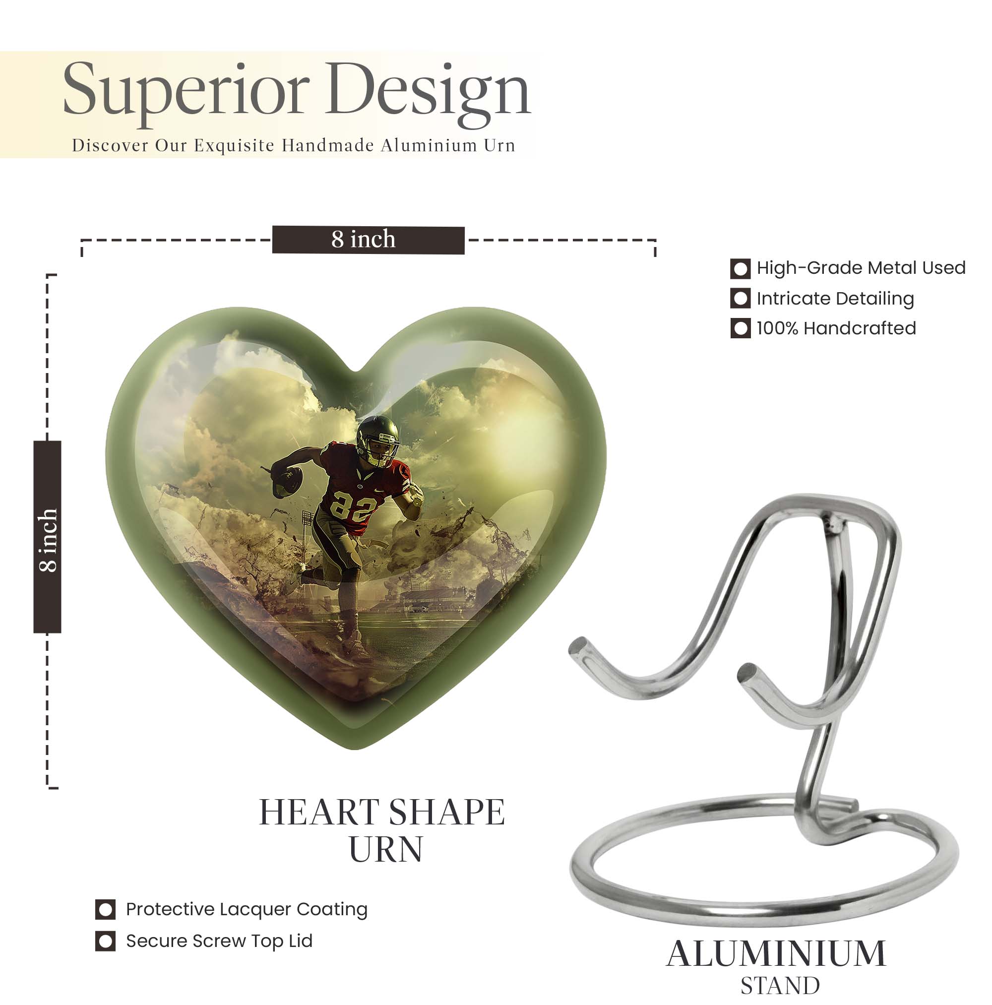 Elevate your homage to your loved ones with this dignified funeral burial urn, meticulously crafted for adult human ashes. Rendered in solid aluminium, this 10-inch cremation urn weighs around 3.3 pounds, promising durability and a lasting representation of reminiscence. Its abstract theme adds an artistic touch, while the Heart Urn design brings peace, making it the perfect addition to your memorial ceremony supplies. Storage isn't an issue as the urn accommodates up to 200 cubic inches of ashes, and for added convenience, a velvet pouch is supplied for the containment of the ashes. Going beyond its function, this burial urn allows customization for a more personal touch – your choice to personalize with engraved names. Let this large footboll urn provide a fitting resting place for your loved ones, exuding tranquility and fitting elegantly on any shaped shelf.