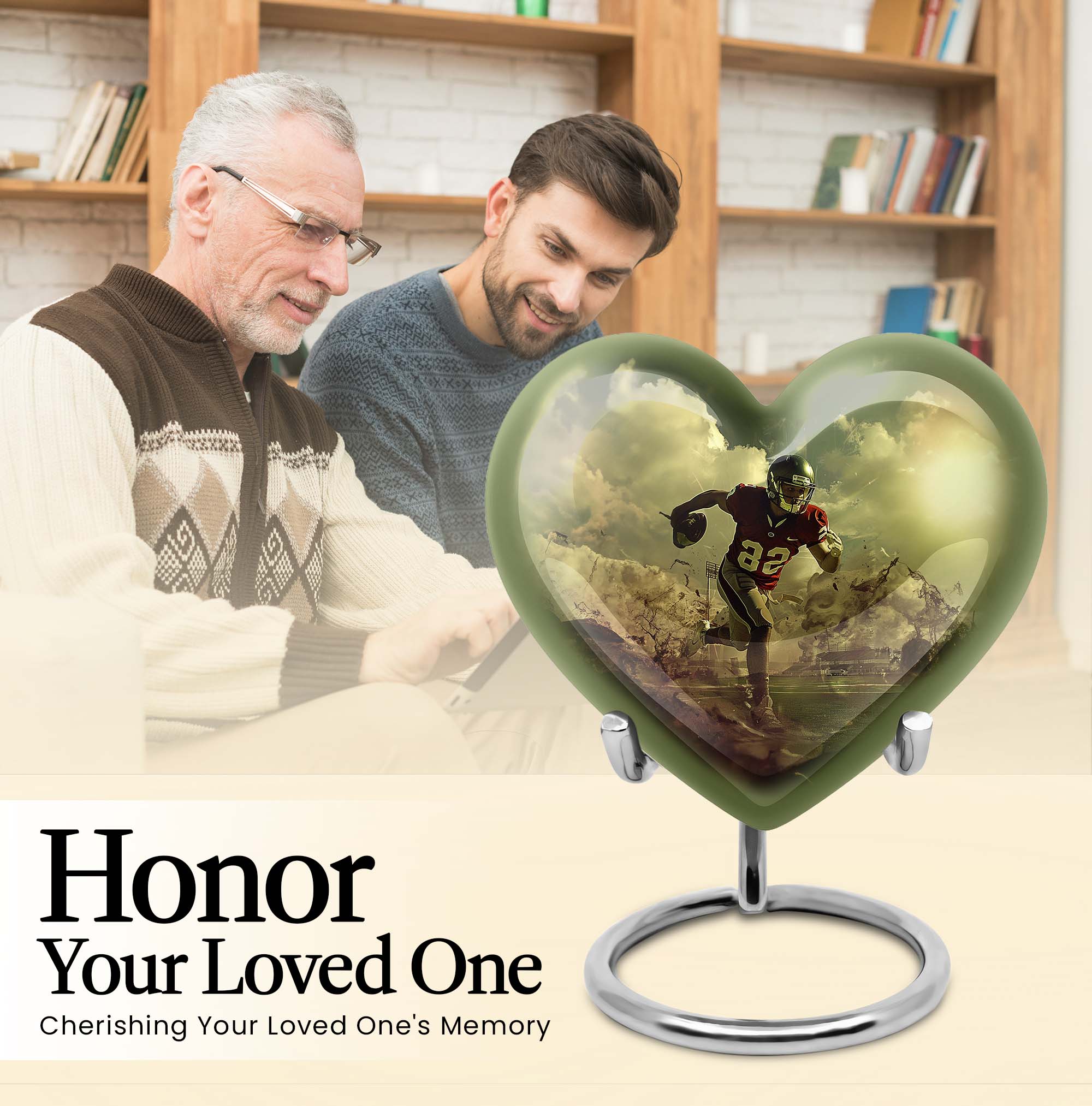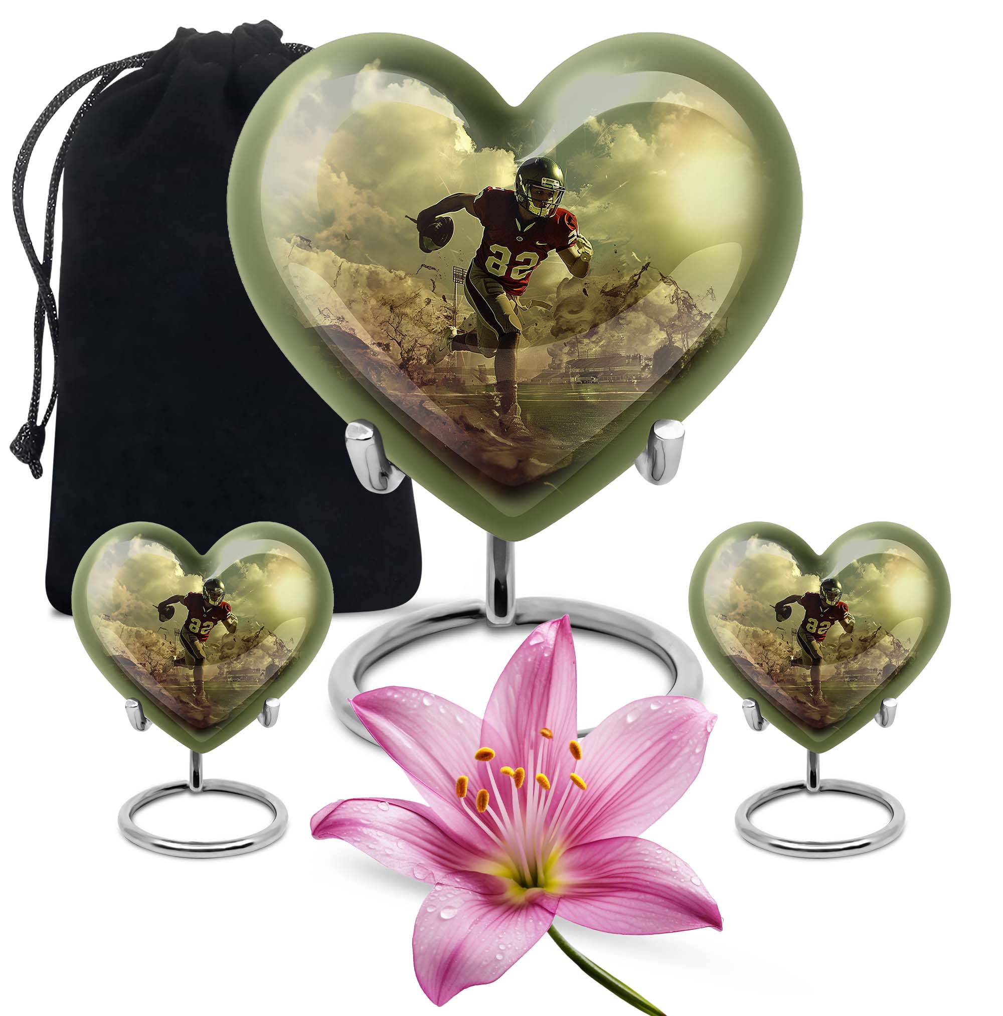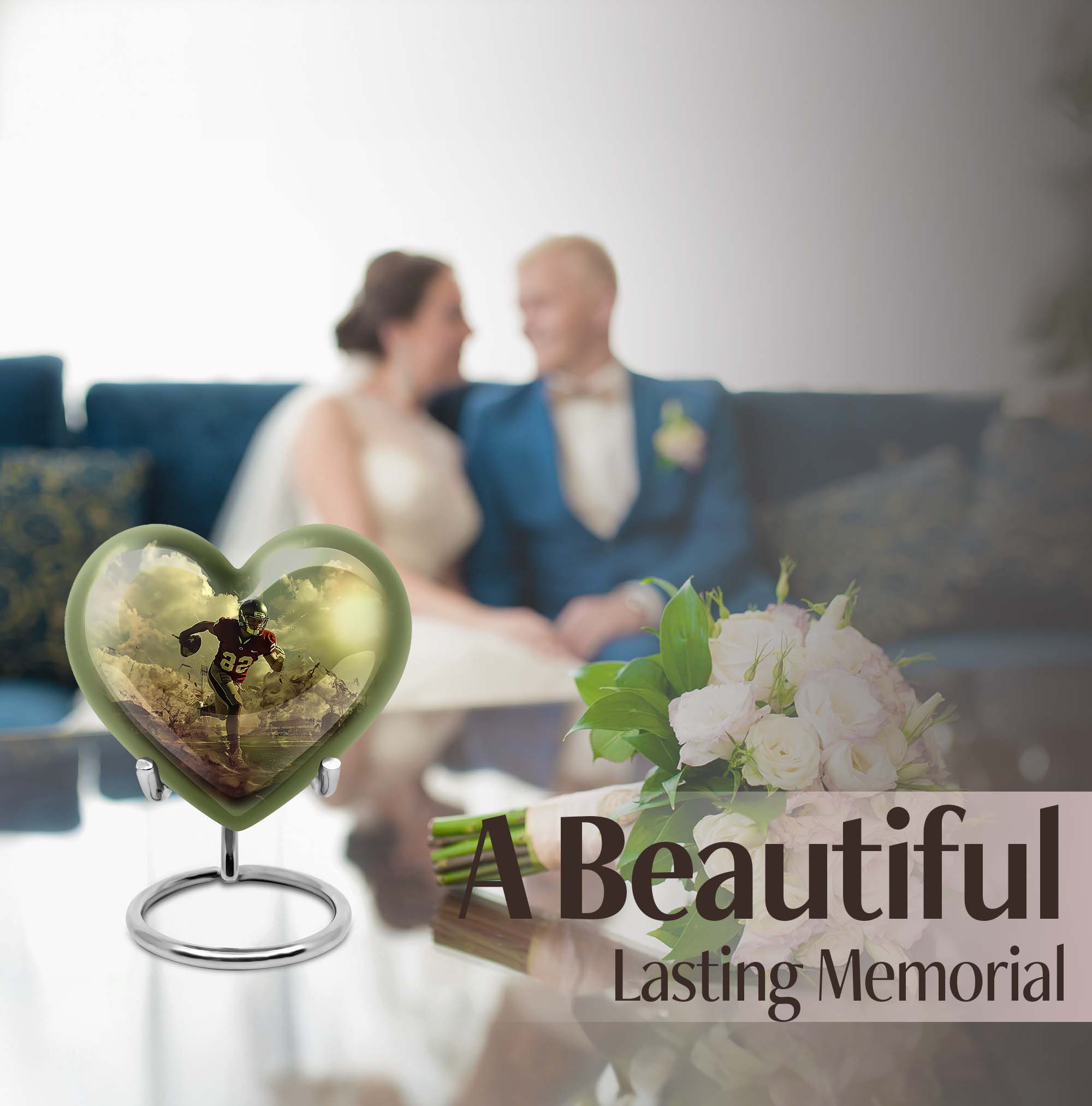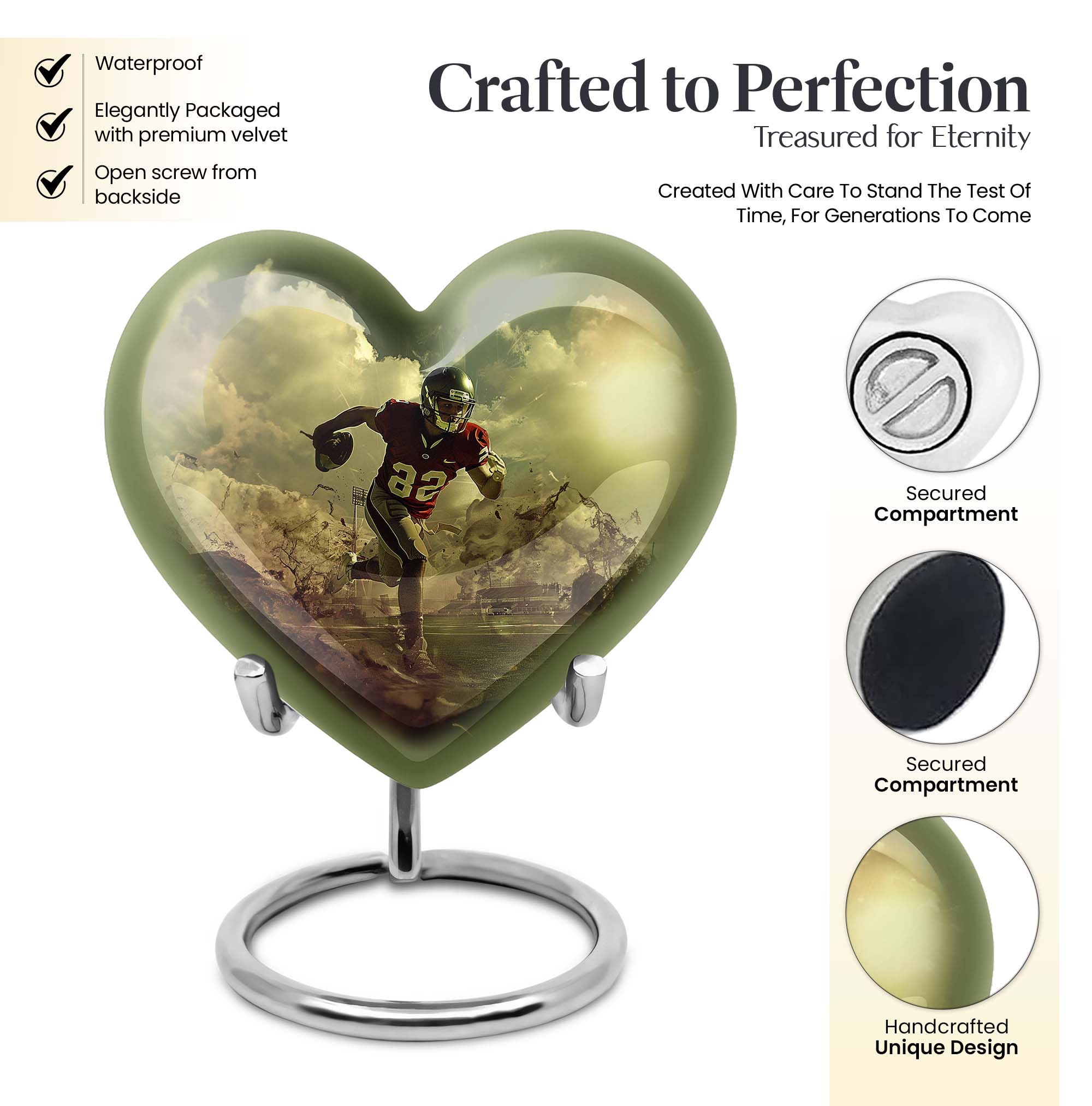 Elevate your homage to your loved ones with this dignified funeral burial urn, meticulously crafted for adult human ashes. Rendered in solid aluminium, this 10-inch cremation urn weighs around 3.3 pounds, promising durability and a lasting representation of reminiscence. Its abstract theme adds an artistic touch, while the Heart Urn design brings peace, making it the perfect addition to your memorial ceremony supplies. Storage isn't an issue as the urn accommodates up to 200 cubic inches of ashes, and for added convenience, a velvet pouch is supplied for the containment of the ashes. Going beyond its function, this burial urn allows customization for a more personal touch – your choice to personalize with engraved names. Let this large footboll urn provide a fitting resting place for your loved ones, exuding tranquility and fitting elegantly on any shaped shelf.