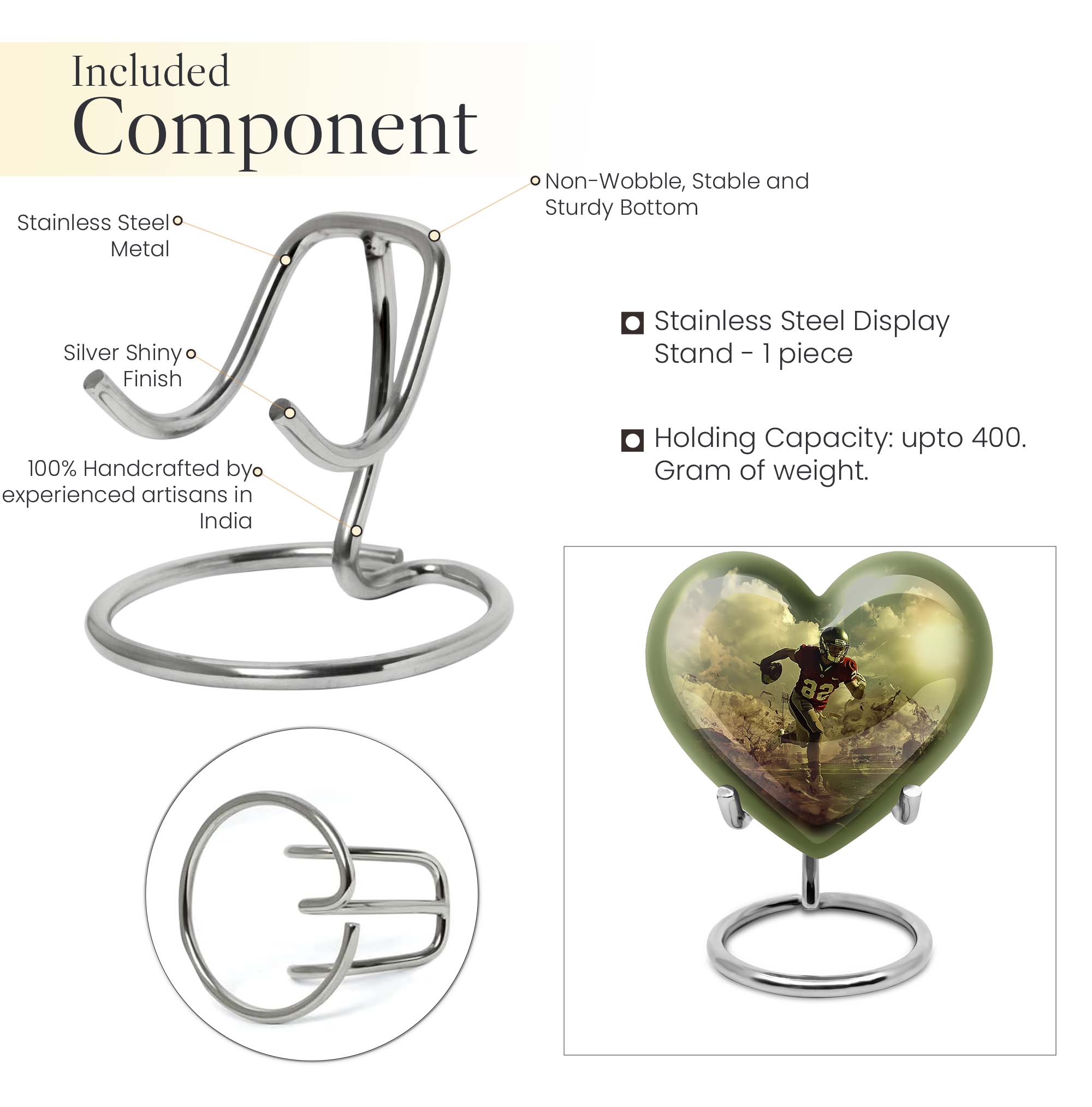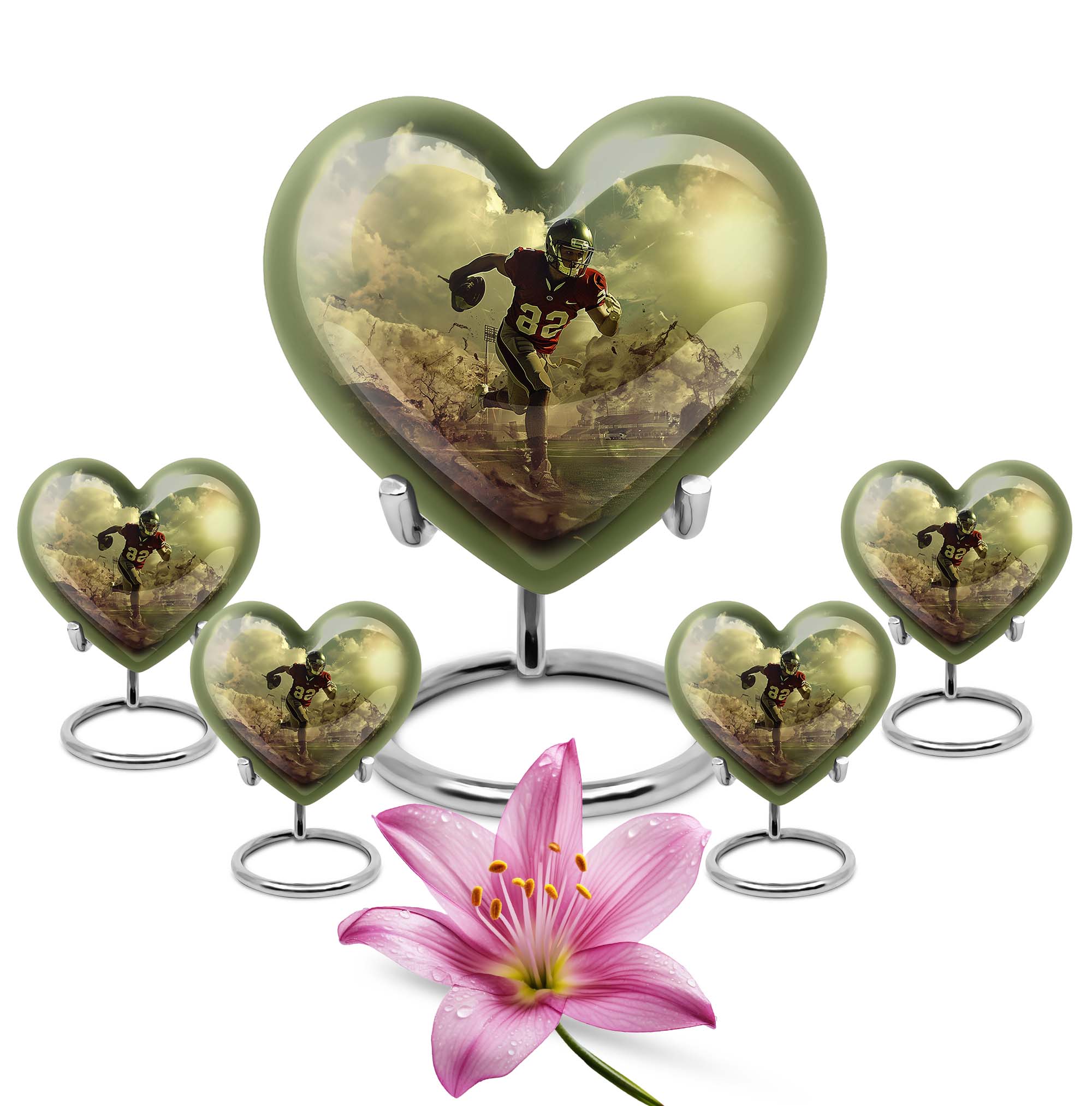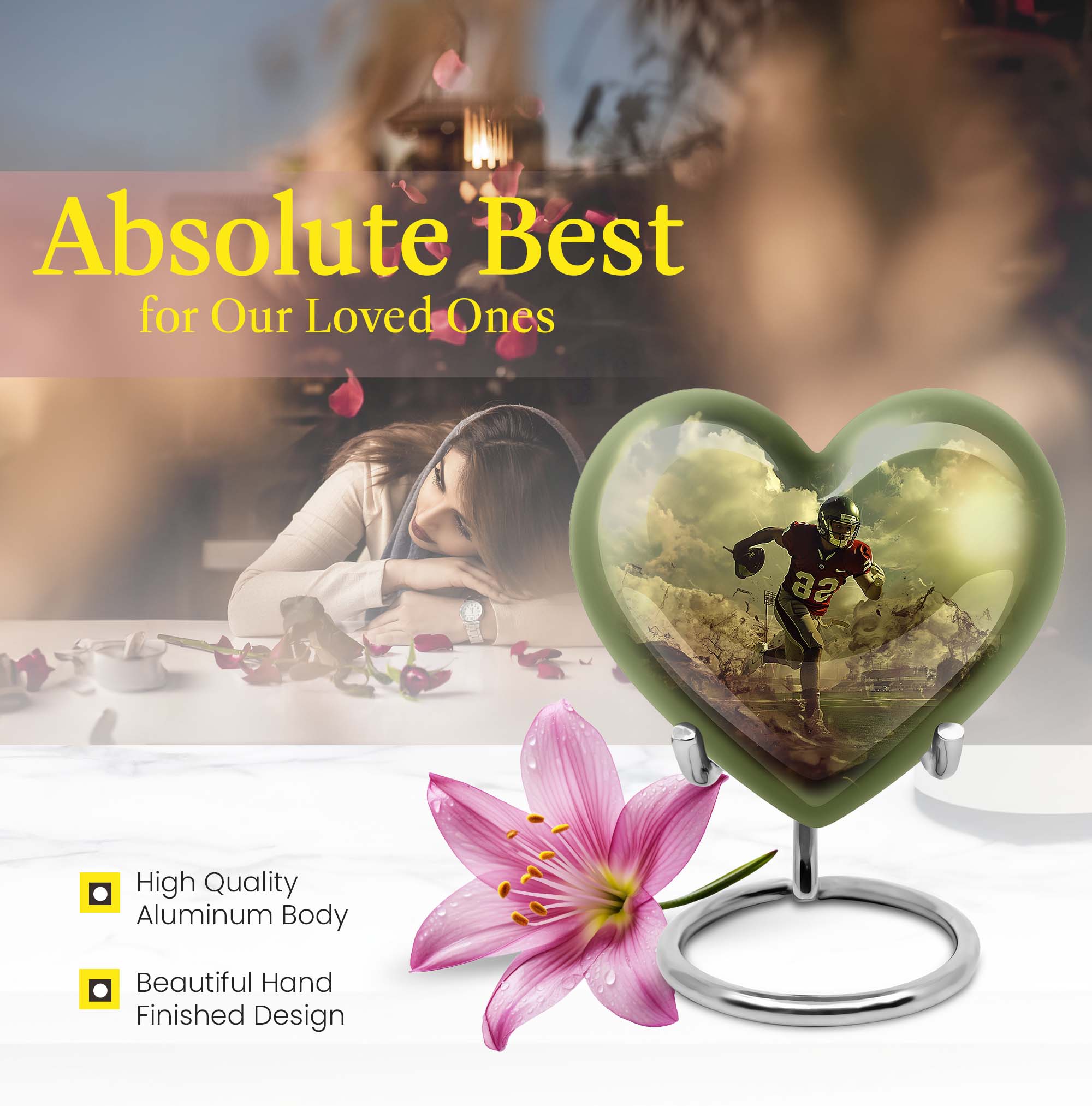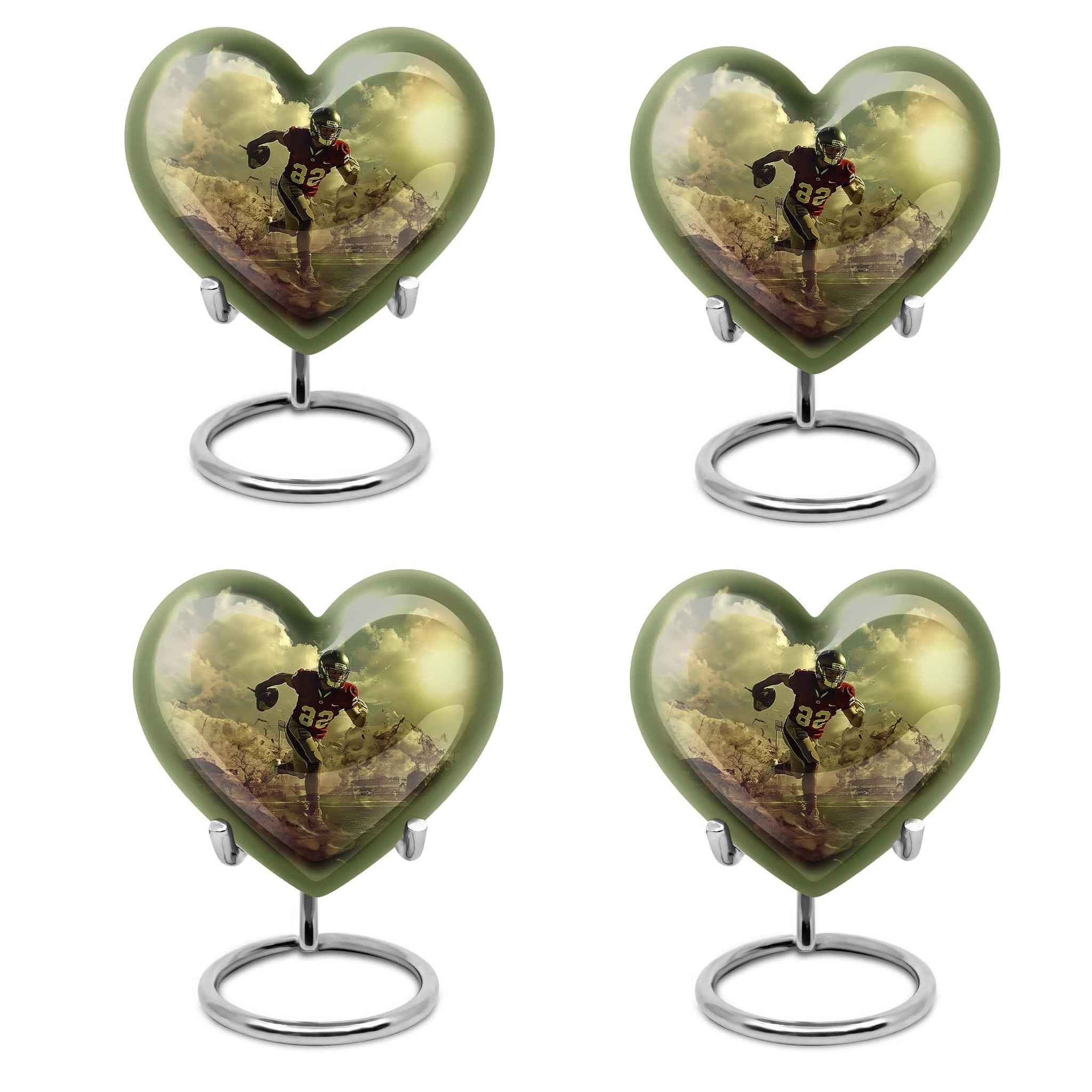 Elevate your homage to your loved ones with this dignified funeral burial urn, meticulously crafted for adult human ashes. Rendered in solid aluminium, this 10-inch cremation urn weighs around 3.3 pounds, promising durability and a lasting representation of reminiscence. Its abstract theme adds an artistic touch, while the Heart Urn design brings peace, making it the perfect addition to your memorial ceremony supplies. Storage isn't an issue as the urn accommodates up to 200 cubic inches of ashes, and for added convenience, a velvet pouch is supplied for the containment of the ashes. Going beyond its function, this burial urn allows customization for a more personal touch – your choice to personalize with engraved names. Let this large footboll urn provide a fitting resting place for your loved ones, exuding tranquility and fitting elegantly on any shaped shelf.