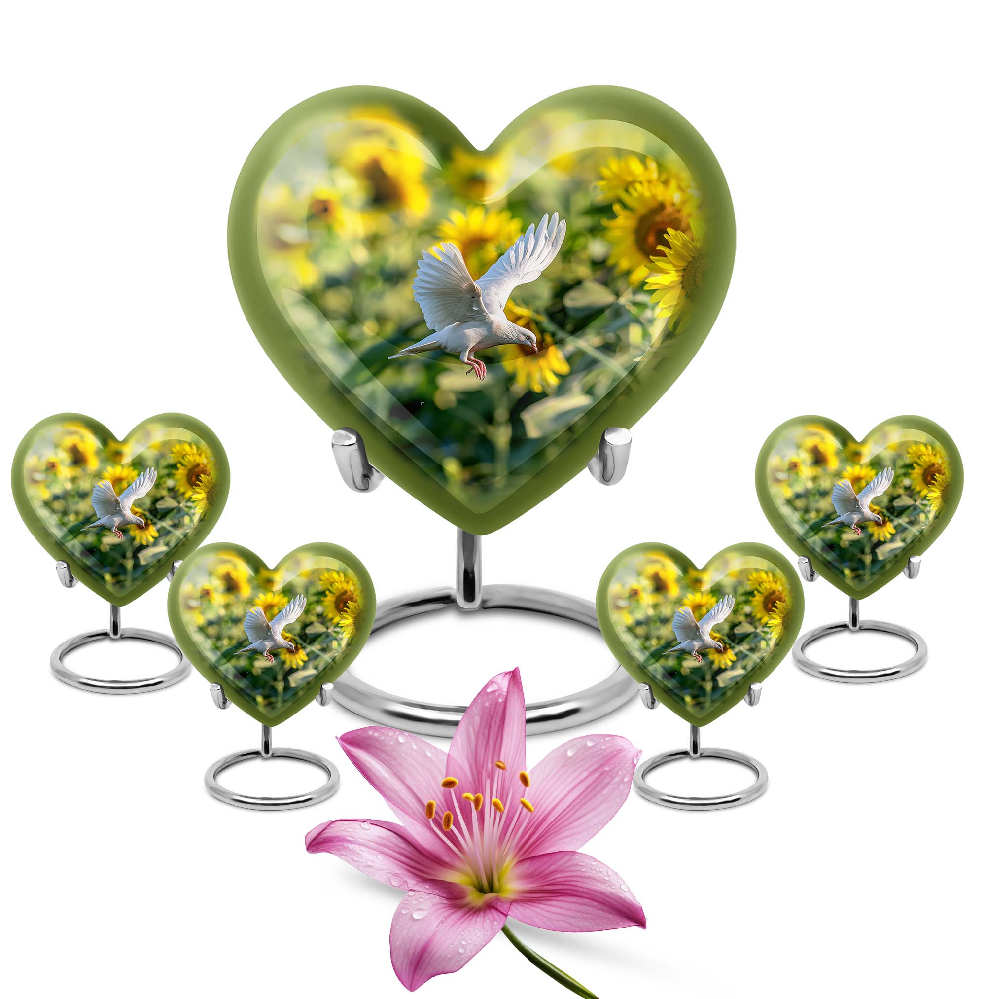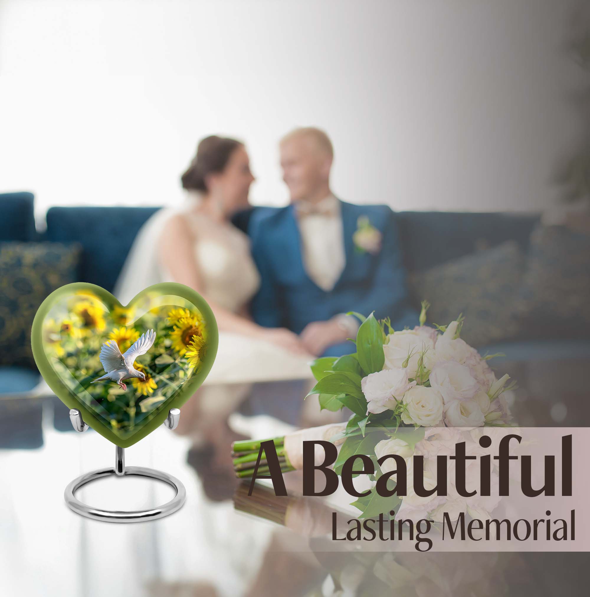 Find solace in honoring your cherished ones with our Heart Urn, a meticulously crafted 'dove Urn' falling under 'memorial urns' category. Ideal tribute for the final resting place of an adult female, this urn, crafted from robust aluminium, symbolizes durability and solemnity. Its unique abstract theme extends an artistic sentiment amid bereavement. Sized at 10 inches in height, with a weight of 3.3 pounds, ensures it maintains stability without being overwhelming. It provides ample capacity of 200 cubic inches, accommodating ashes respectfully. The urn is inclusive of a comforting velvet pouch, facilitating careful containment of ashes. To further personalize, take advantage of the opportunity to inscribe engraved names, adding an intimate touch to the memorabilia. This urn extends a sensory representation of peace akin to 'cremation medium urns for human ashes', embodying love and remembrance. A thoughtful selection among 'Large Urns', it offers a timeless keepsake that resonates comfort while respectfully acknowledging loss.