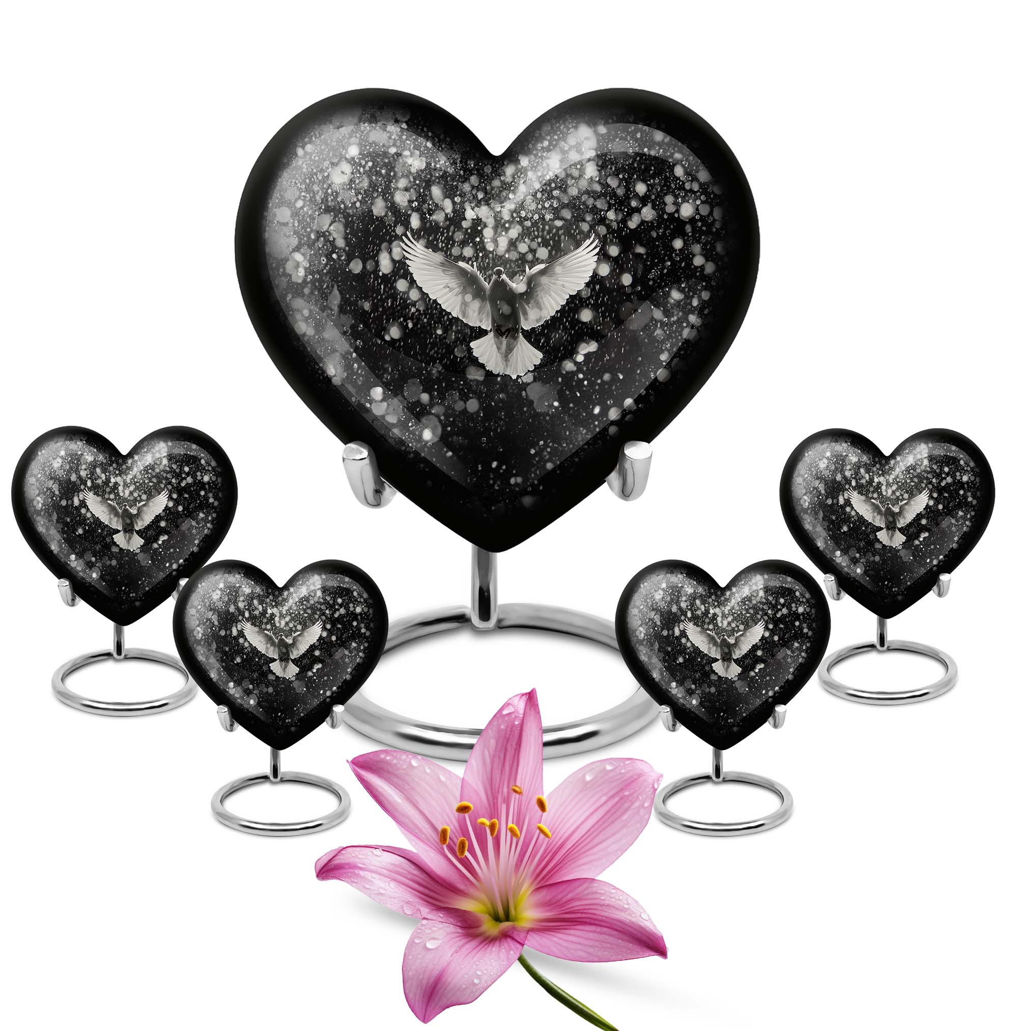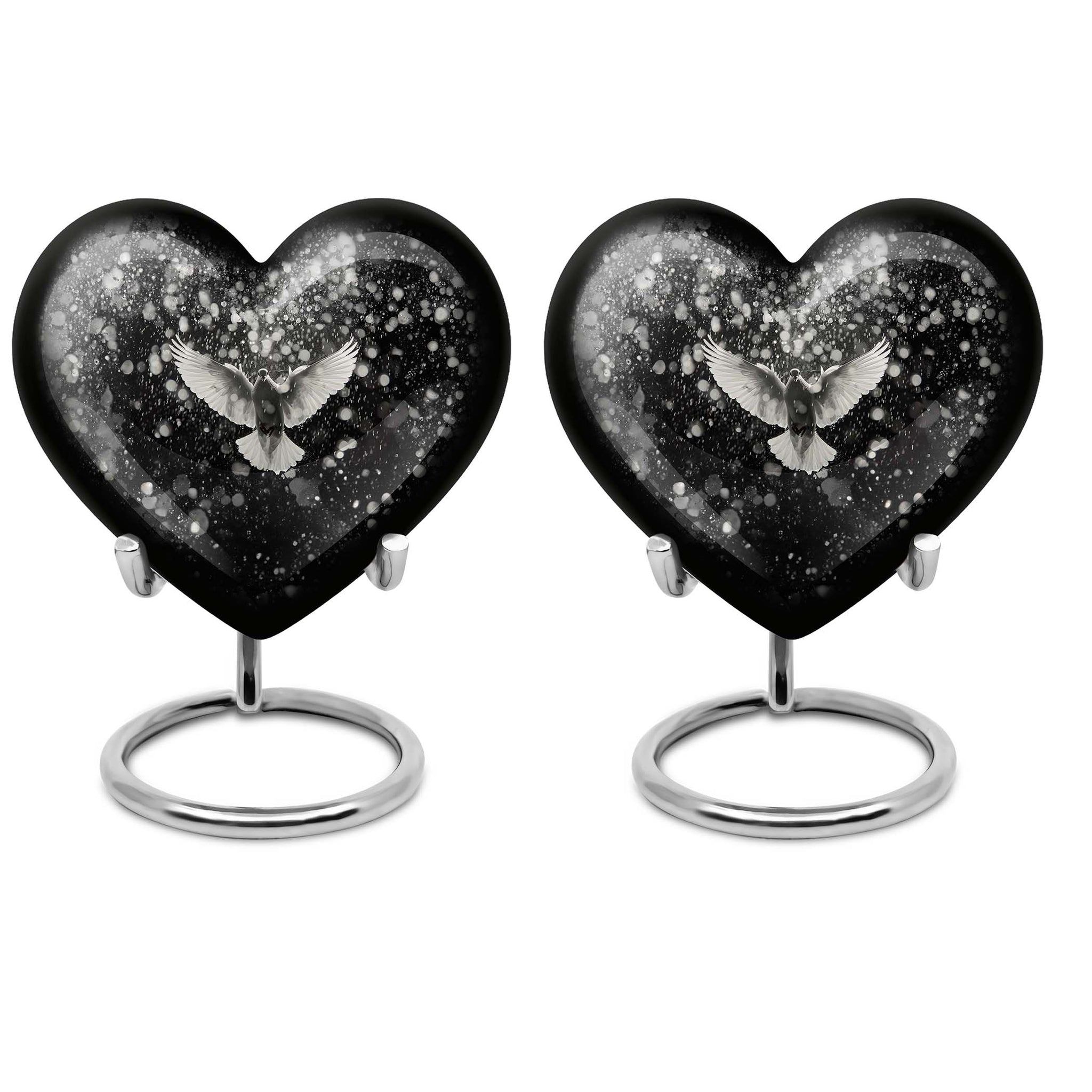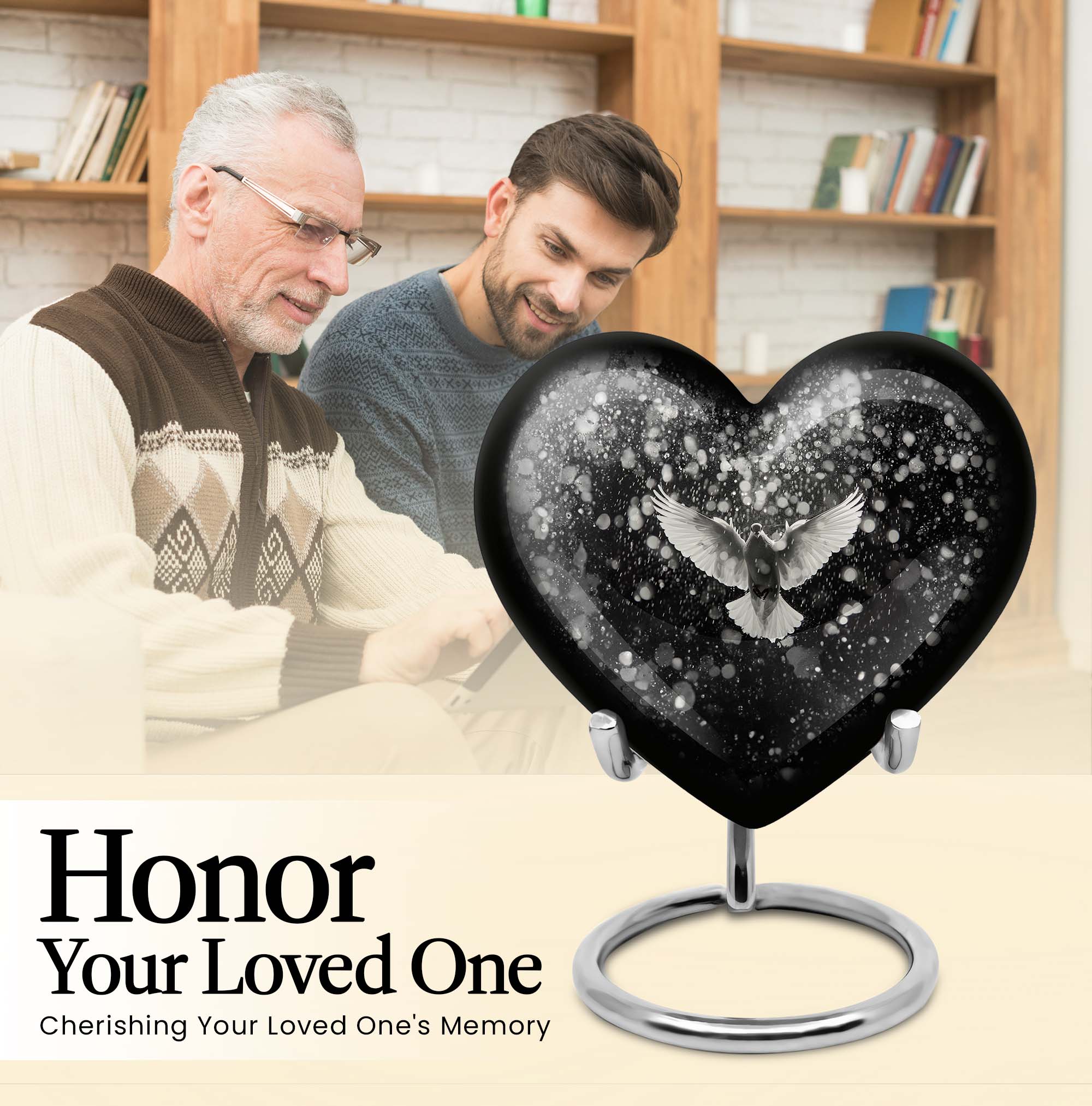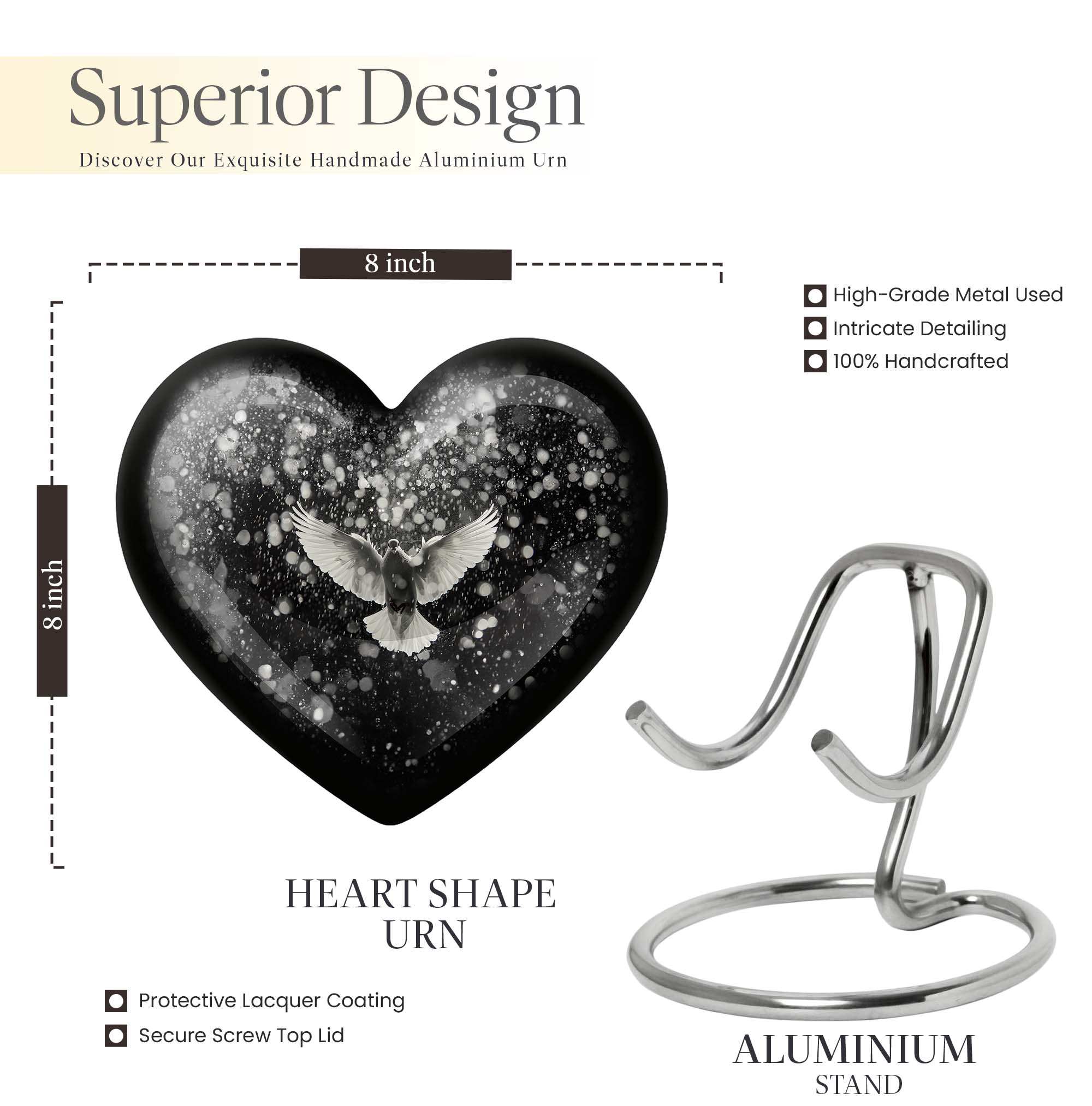 Commemorate the life of your loved ones with our elegantly crafted dove urn, one of our exceptional funeral large urns for human ashes adult male collection. Shaped in a symbolic heart design, this cremation urn stands 10 inches tall, making it a noticeable tribute. Constructed from durable aluminium, it has a unique abstract theme that adds a comforting touch to the ambience in any room. The urn weighs 3.3 pounds, suggesting a solid and sturdy structure to retain your precious memories. With a capacity of 200 cubic inches, it is designed to precisely contain ashes of adult individuals. Our dove urn is shipped with a velvet pouch for the containment and protection of the ashes. To make your memorial urn truly special, we offer personalized engraving with names, transforming it from a mere container to a precious keepsake. Besides dove urns, our range includes memorial urns for ashes adult female, ash adult women urns and cremation companion urns. Honor your cherished ones with a memorial as unique as they were.