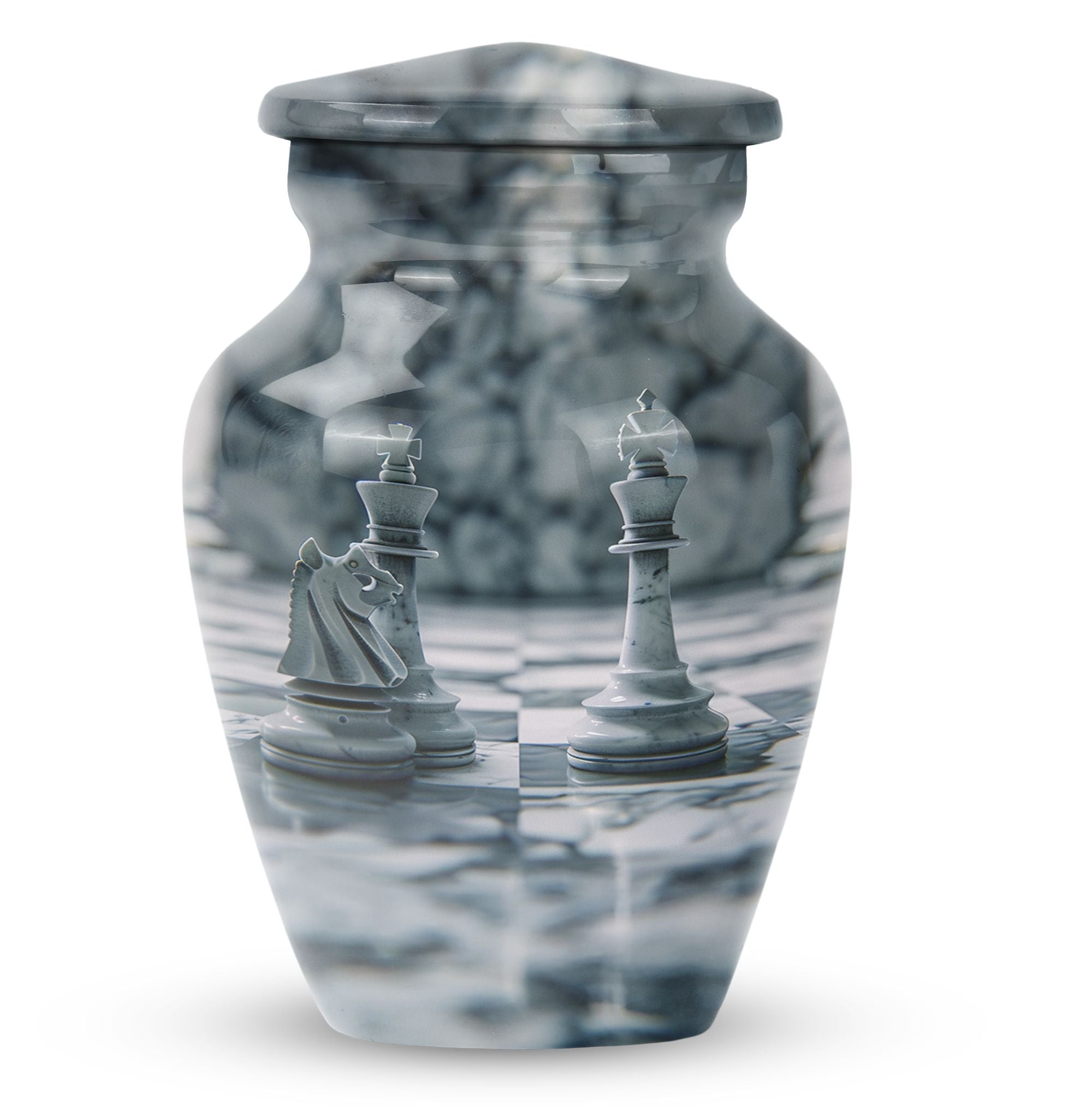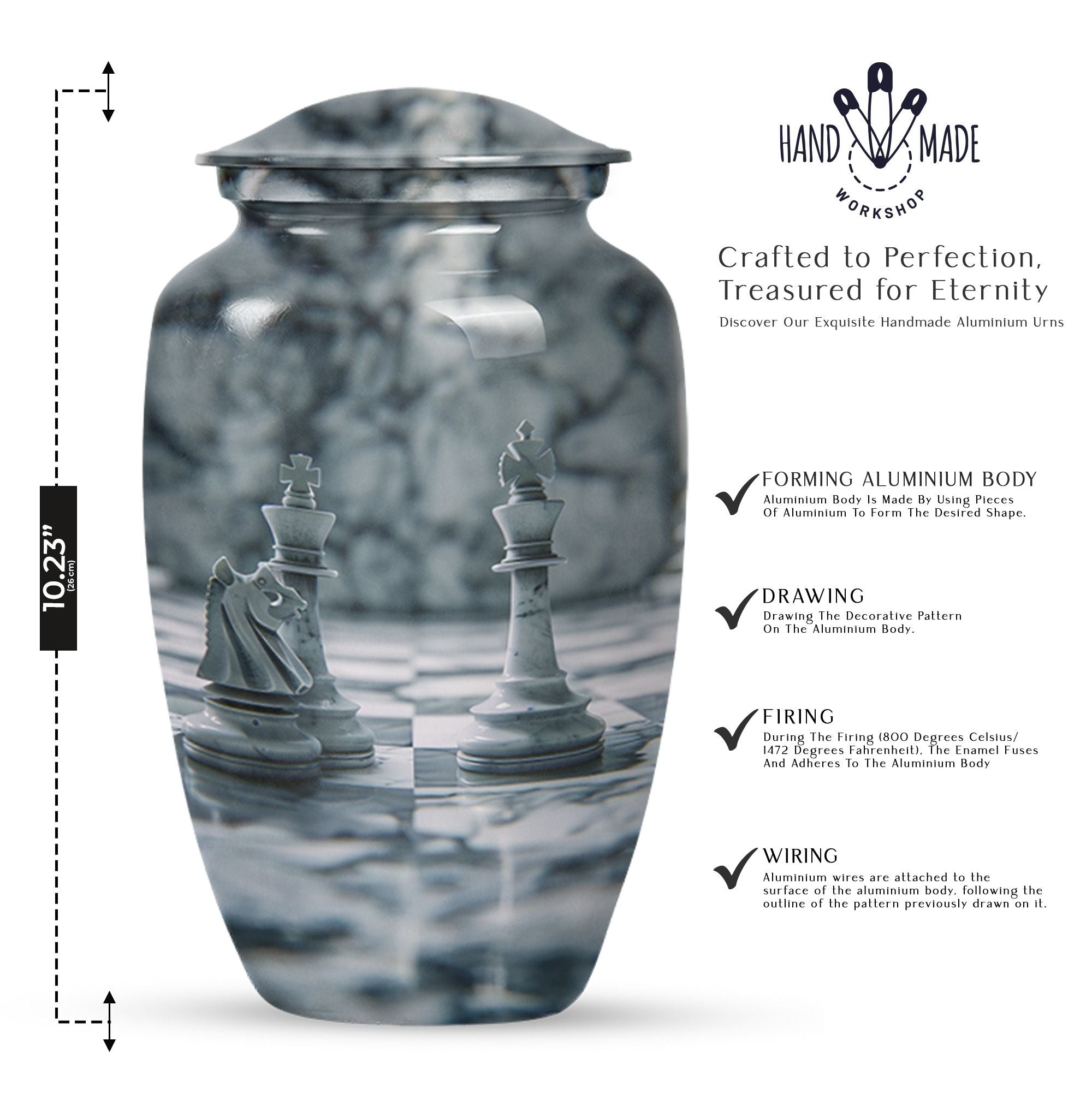 Discover a powerful symbol of eternal tranquility with our Abstract Urn, a meticulously crafted cremation urn ideal for memorializing an adult male. This urn, standing 10-Inch tall, with a spacious volume of 200 cubic inches, features an unassuming yet striking abstract theme that soothes the heart with its timeless appeal. Created from sturdy aluminium, this large urn weighs a solid 3.3 pounds, blending strength with elegance. We understand that every memory is unique, that's why we offer customization options, allowing you to personalize this cremation urn with engraved names. This package includes a velvet pouch, providing a dignified space for containment of ashes. Whether you're looking for urns for males, portable urns for travel, or urn for ashes of a female, this versatile urn fits the bill perfectly. Invoke a sense of serenity in your metal mandir at home with this elegantly abstract urn, making every memory immortal.