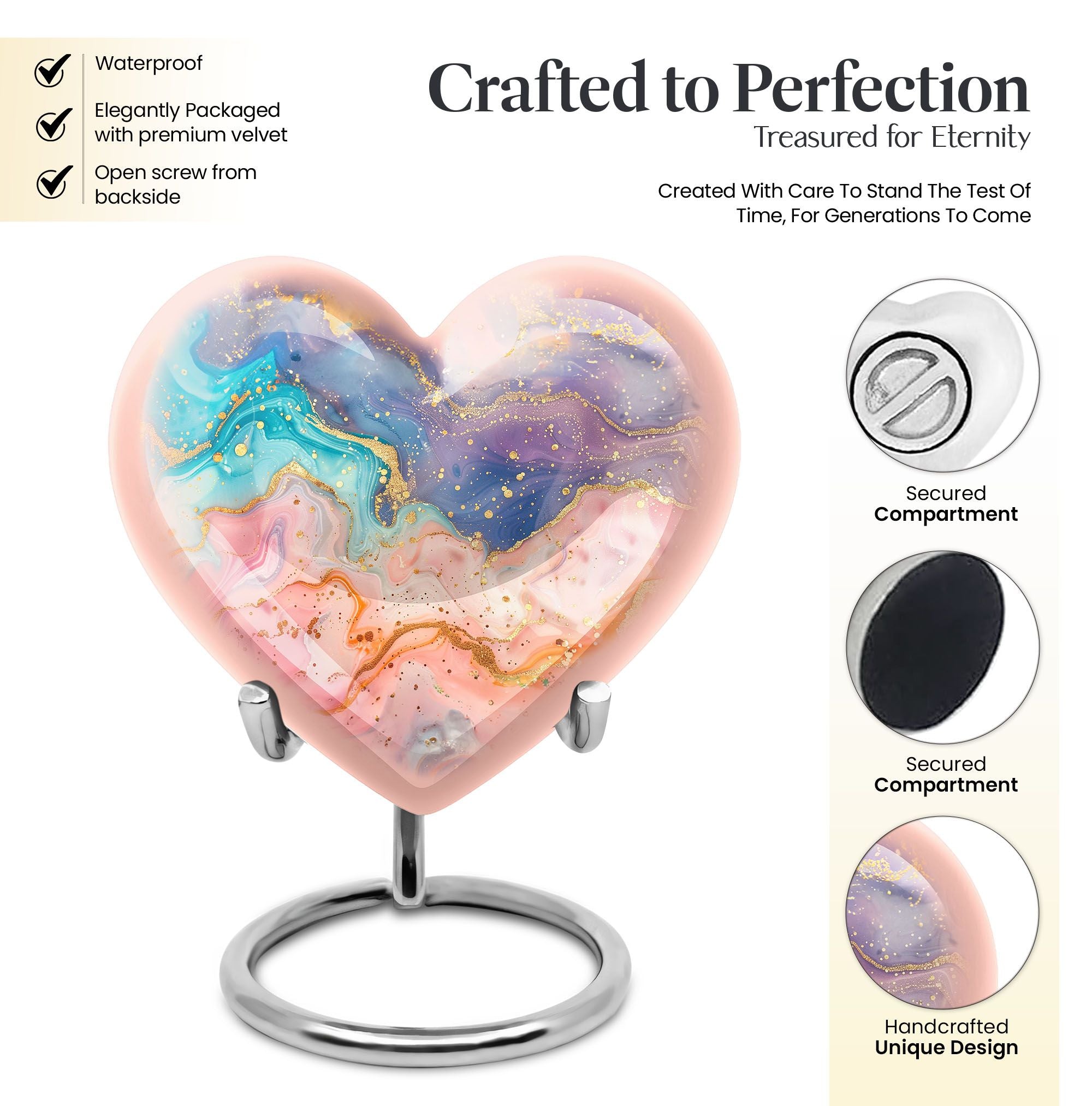 Presenting the meticulously crafted Abstract Urn, the epitome of funeral memorial urns - reverence and love in a symbolic fashion. Suitable for adults, this large urn carries a substantial capacity of 200 cubic inches, perfect for storing adult human ashes securely. This '10 Inch' high urn resonates with devotion, as it carefully holds cherished memories in its heart-shaped architecture, skillfully crafted from high-quality aluminium. The product weighs a mere 3.3 pounds, easily positioned on your preferred shelf, ensuring a serene and dignified memorial setup. Experience peace with the inclusion of a soft velvet pouch, assisting in the respectful containment of ashes. Customization options are available, permitting you to personalize the urn with engraved names, adding an intimate touch to this solemn keepsake. This Abstract Urn delivers an innovative alternative to mainstream funeral burial urns, stepping away from generic options for an inspiring, heart-centred concept. The immaculate design allows for a more personal, intimate experience, helping you to tangibly commemorate the life and memories of your loved ones.