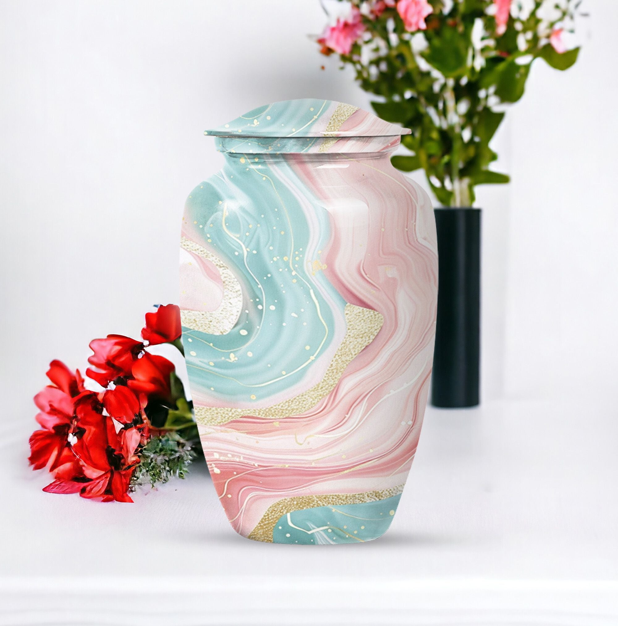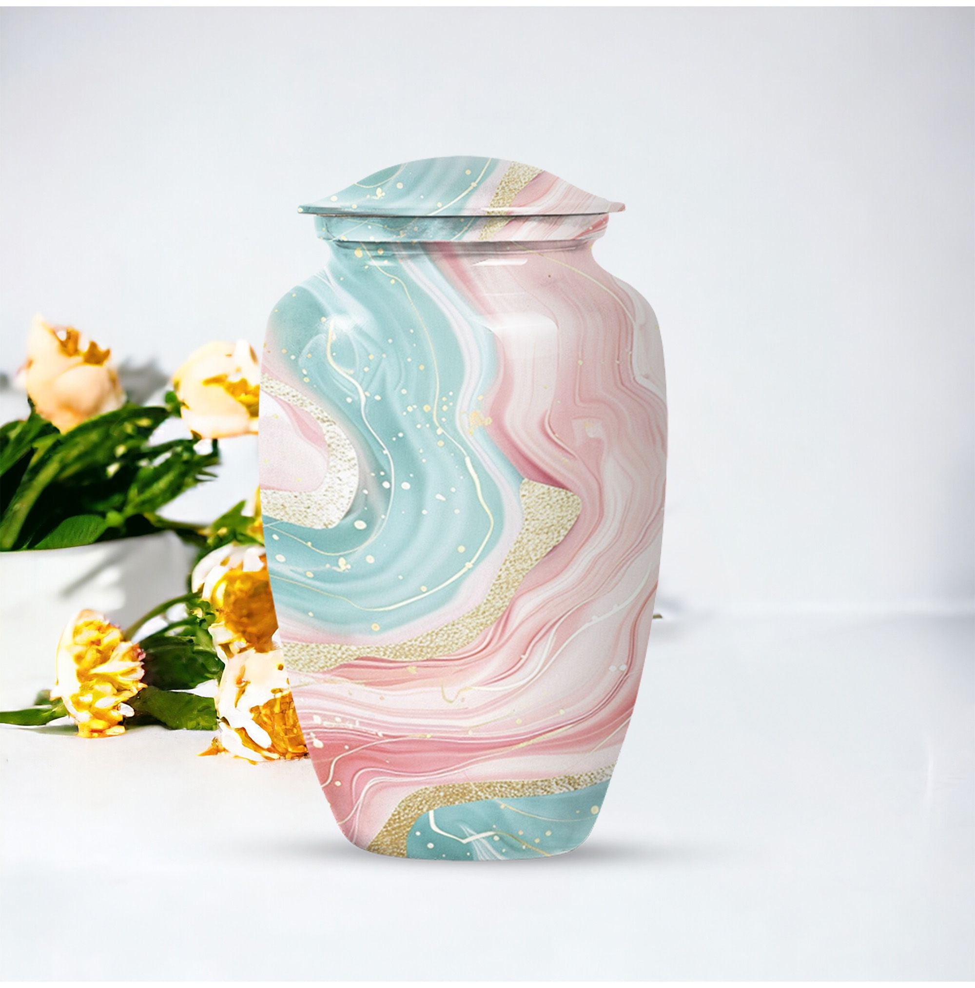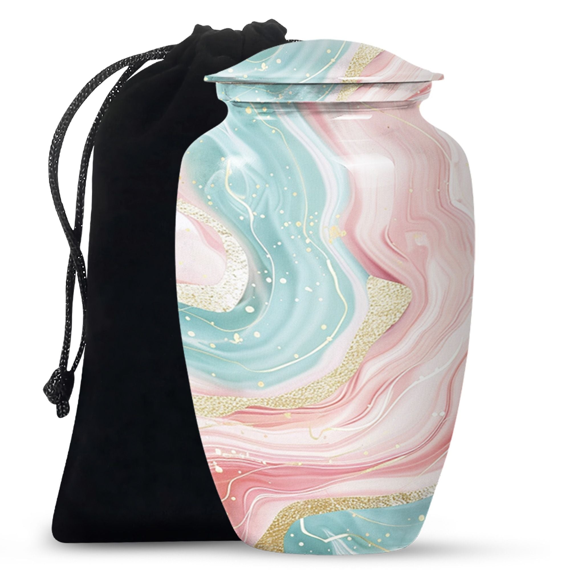Our abstract urn, a magnificent piece of craftsmanship, stands 10 inches high and is apt for use as both cremation urns and memorial urns. The elegant classic urn design, produced from high-quality aluminium, imparts an ethereal yet tangible reminder of your loved one's unique journey. With a capacity of 200 cubic inches, it has grace enough to hold all the memories and significance of a loved life. Genuine to the weight of its purpose, this urn weighs 3.3 pounds, giving it a comforting presence. You experience an added layer of solace with the personalization option, where you can engrave inheritable names. Importantly, we've considered your requirements in detail, for instance, the package comes with a velvet pouch, specifically created for the containment of ashes. Pay a heartfelt tribute to your loved ones with our large urn, radiating the iridescent allure of metal. This product paves a refined path towards remembering and memorializing. Uncommon keywords to consider include 'abstract urn', 'large urn iridescent metal' but refrain from using 'urn for funeral' or 'burial urns for men'.