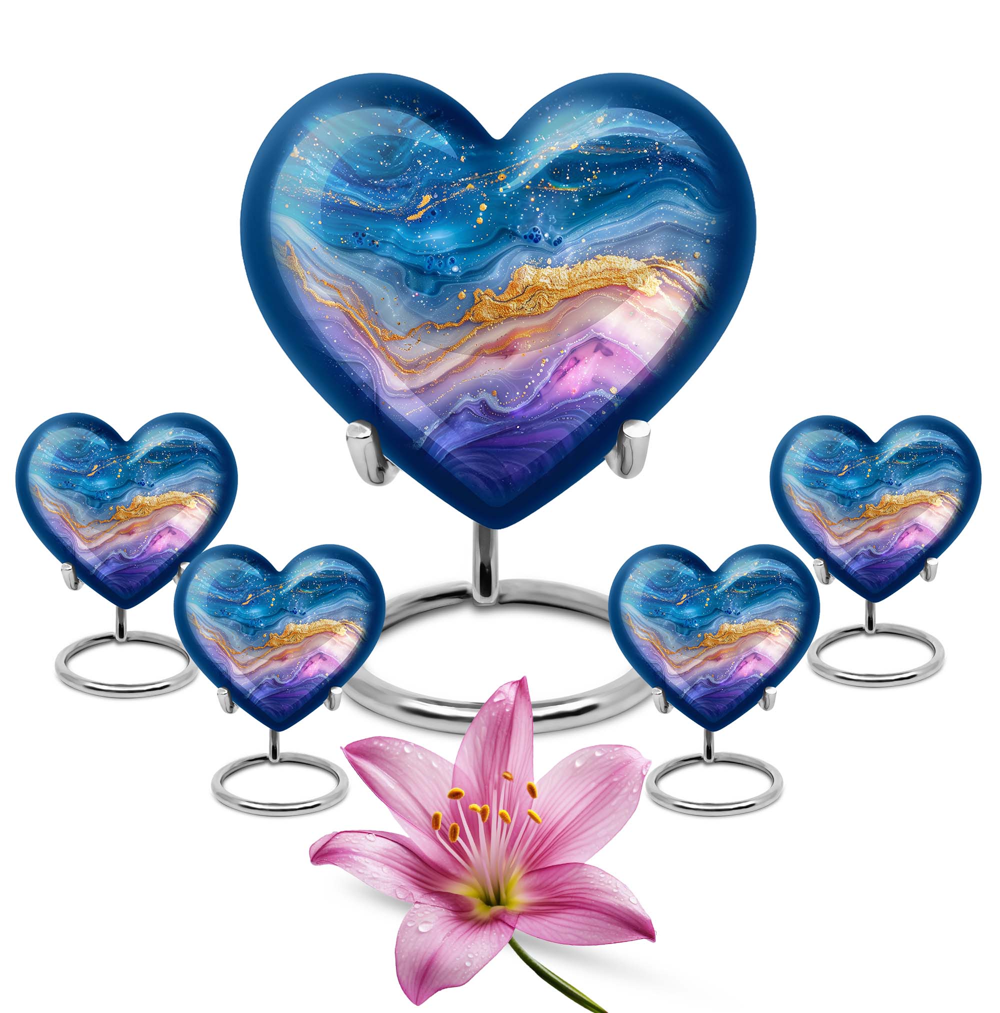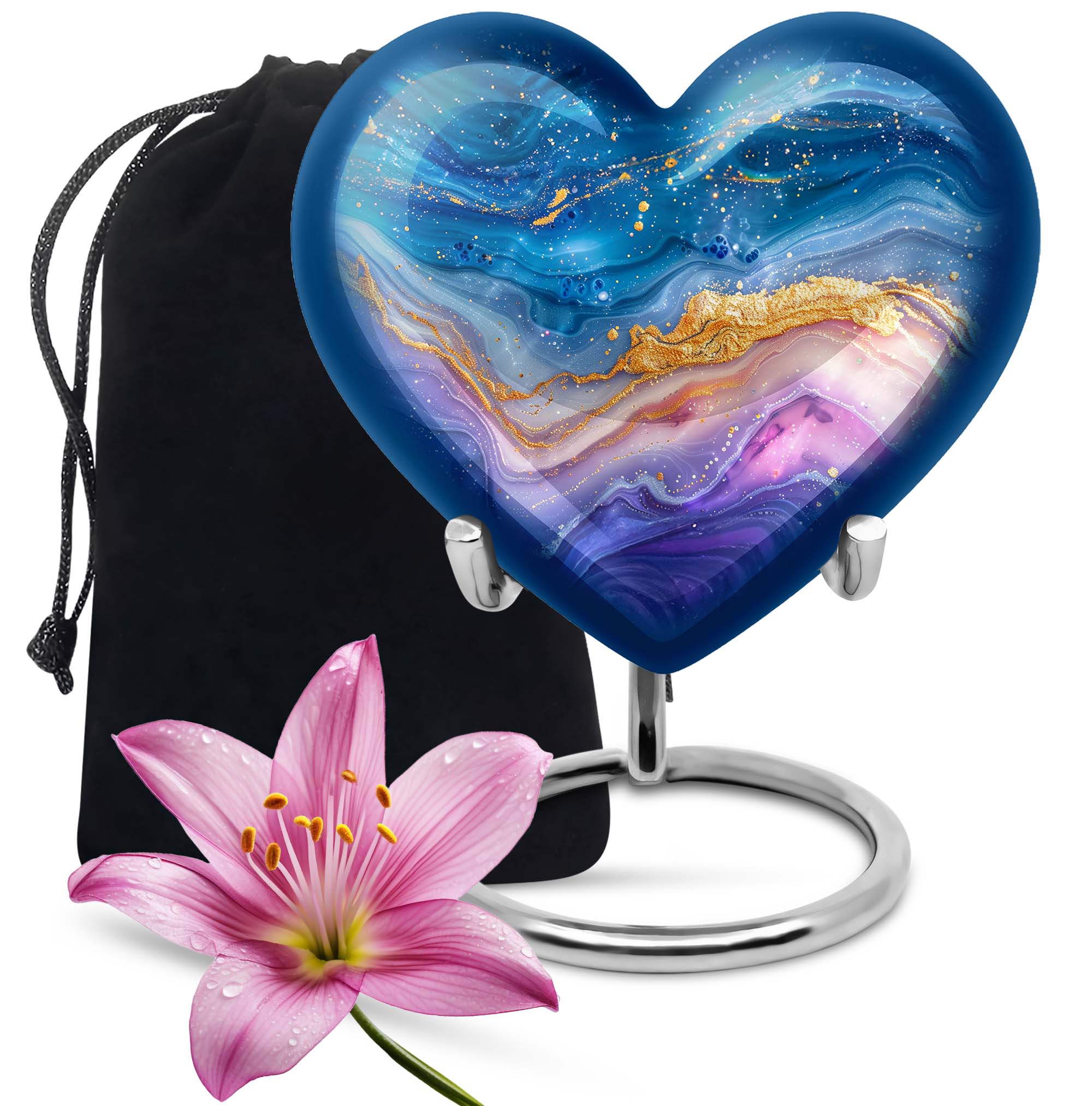 Exhibit your affection through this Abstract Urn, a large 10-Inch memorial alliance for both males and females that aims to cherish everlasting memories. This sublime piece of art not only serves as a resting place for beloved ones, but it also signifies high esteem. We have employed quality aluminum to grant our urns a sturdy build and longevity. This cremation urn rests at 3.3 pounds in weight, whilst sustaining a capacity of 200 cubic inches, comfortably housing the ashes of your adults. Its dimensions, consistent at a majestic 10 inches in height, are perfectly proportioned to exude its presence subtly. Every package arrives intact, containing a sleek velvet pouch for safeguarding the ashes. With the prospect of personalization, you can customize your Abstract Urn by engraving names. This distinctive yet sophisticated 'Heart Urn' is an excellent choice for Companion Urns for Two Adults, looking for a tribute befitting their beloved ones. Surprise yourself with this meticulously crafted large metal urn for ashes that blend utility and aesthetics seamlessly.