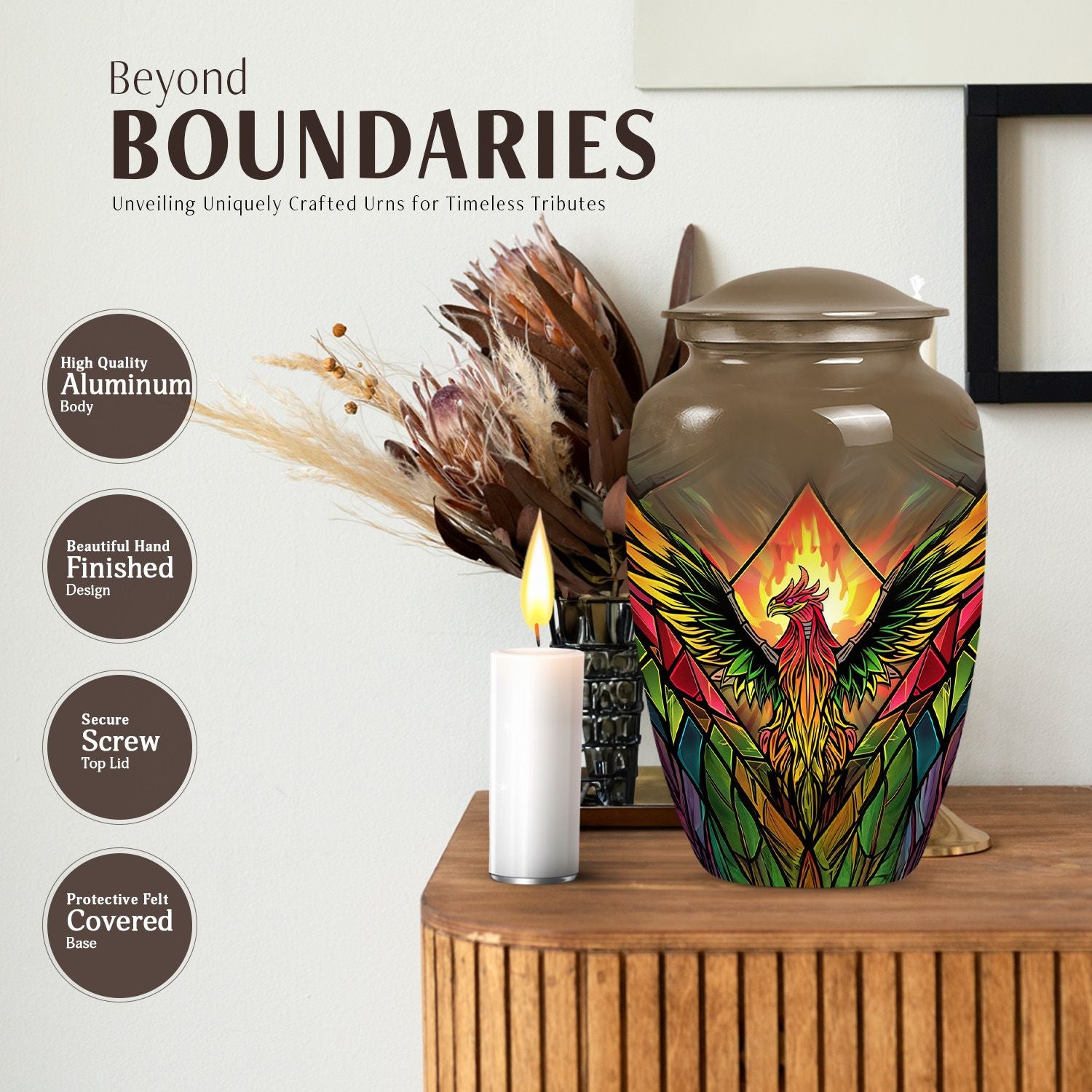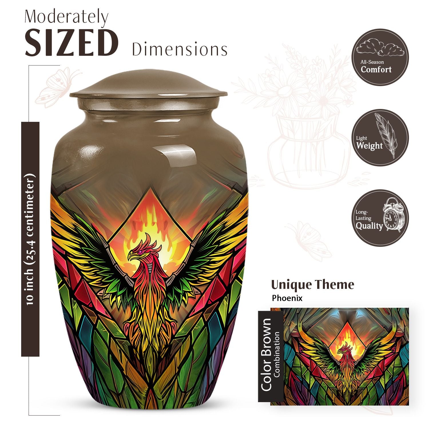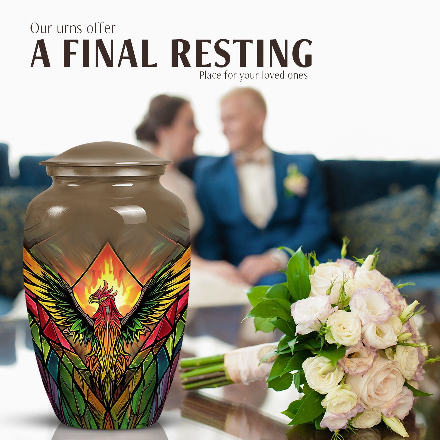 Our classic Phoenix Urn is a memorable attribute of solemn gentleness, designed to pay worthy respect to the loved ones we've lost. This Large Urn is elegantly forged from aluminium, giving it a robust weight of 3.3 pounds and a sizable dimension of 10 inches in height, making it a significant memorial element. With an alluring abstract theme, its quality, and finesse stand out in the line of funeral urns for human ashes, whether for an adult man or female. This urn can hold up to 200 cubic inches of ashes, undoubtedly providing ample space to cater to your needs. Every Phoenix Urn comes with a velvet pouch for containment of ashes, adding a layer of gentle dignity. Personalize your urn with engraved names, making it a uniquely fitting homage to the beloved departed. Uncommon in the world of urns for cremation ashes, our Phoenix Urn extends its innovative modern design into a tribute that consoles the bereaved and marks a life well lived.