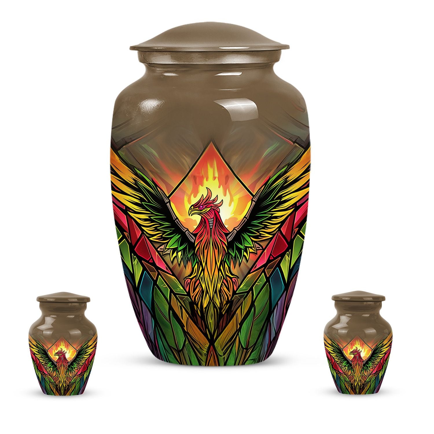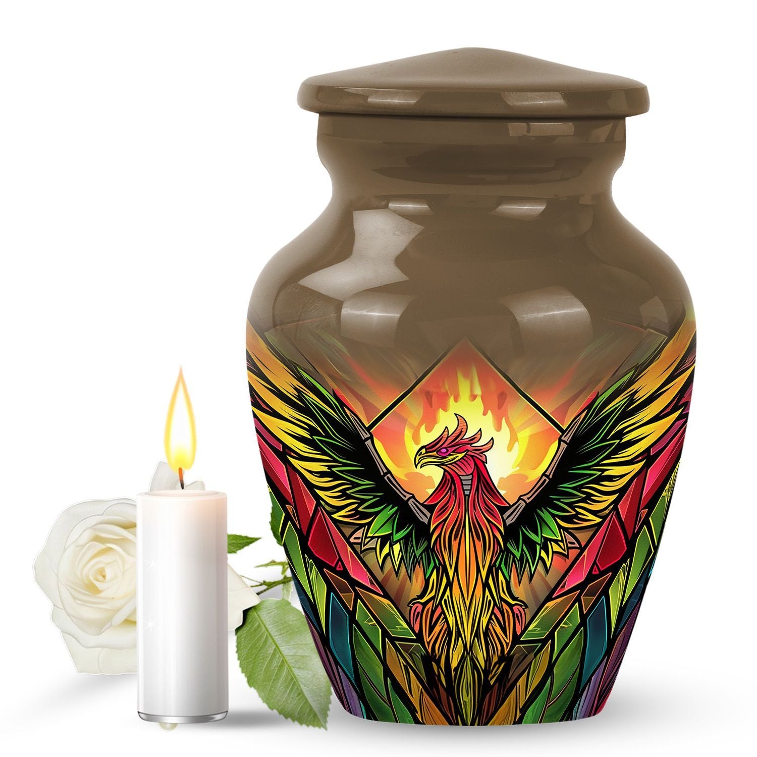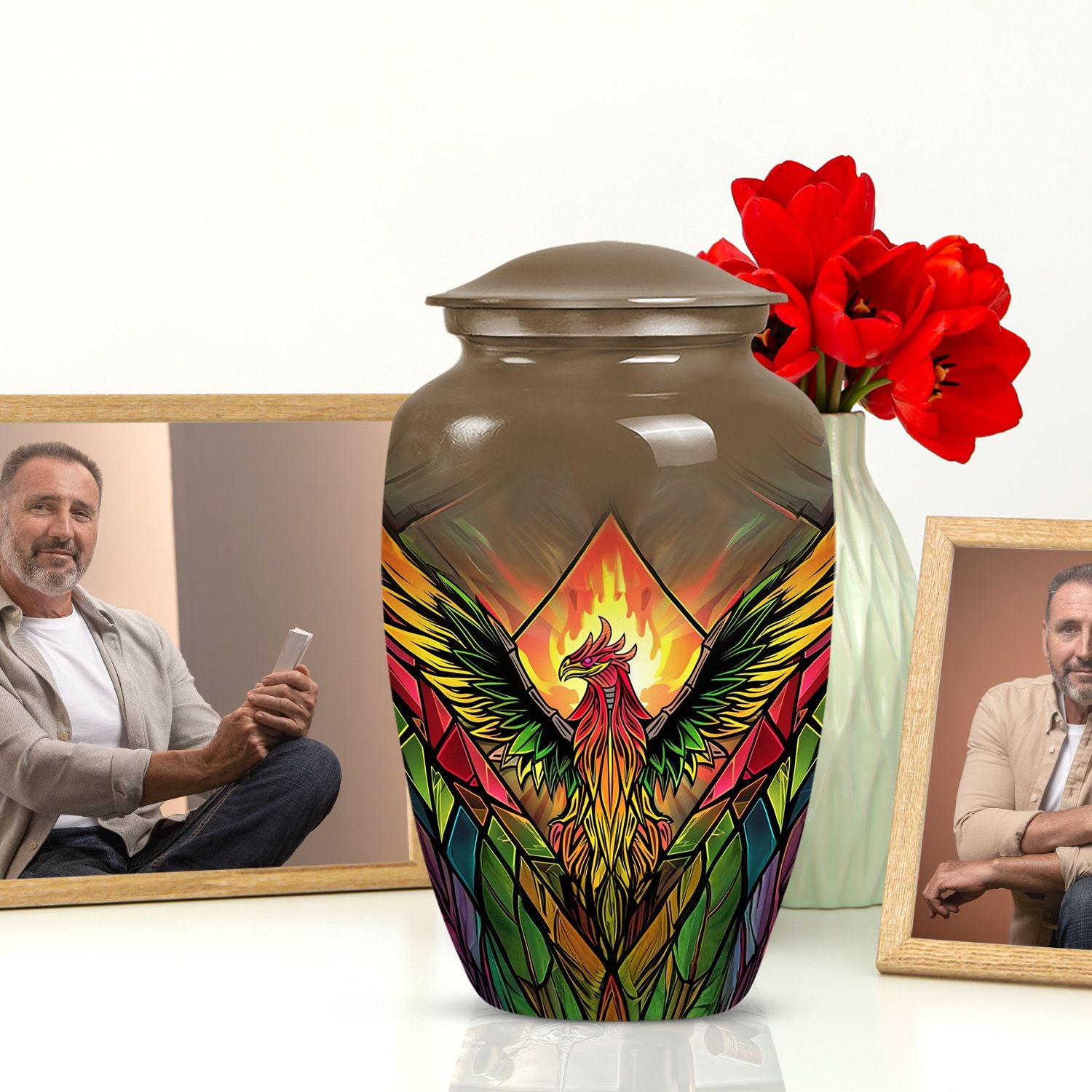 Our classic Phoenix Urn is a memorable attribute of solemn gentleness, designed to pay worthy respect to the loved ones we've lost. This Large Urn is elegantly forged from aluminium, giving it a robust weight of 3.3 pounds and a sizable dimension of 10 inches in height, making it a significant memorial element. With an alluring abstract theme, its quality, and finesse stand out in the line of funeral urns for human ashes, whether for an adult man or female. This urn can hold up to 200 cubic inches of ashes, undoubtedly providing ample space to cater to your needs. Every Phoenix Urn comes with a velvet pouch for containment of ashes, adding a layer of gentle dignity. Personalize your urn with engraved names, making it a uniquely fitting homage to the beloved departed. Uncommon in the world of urns for cremation ashes, our Phoenix Urn extends its innovative modern design into a tribute that consoles the bereaved and marks a life well lived.